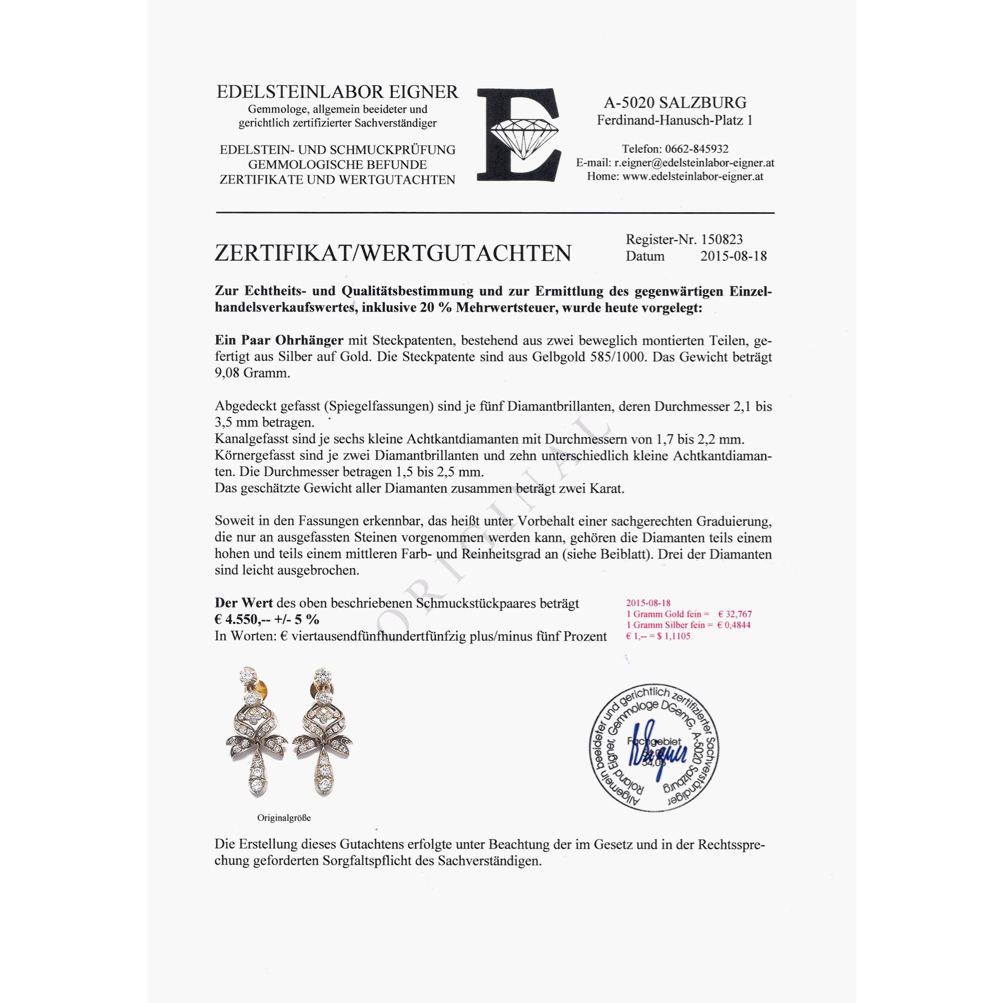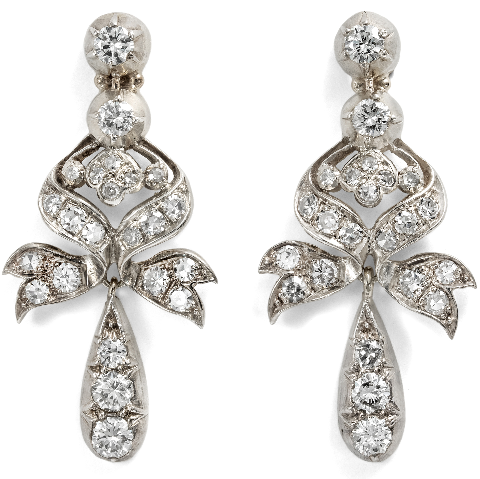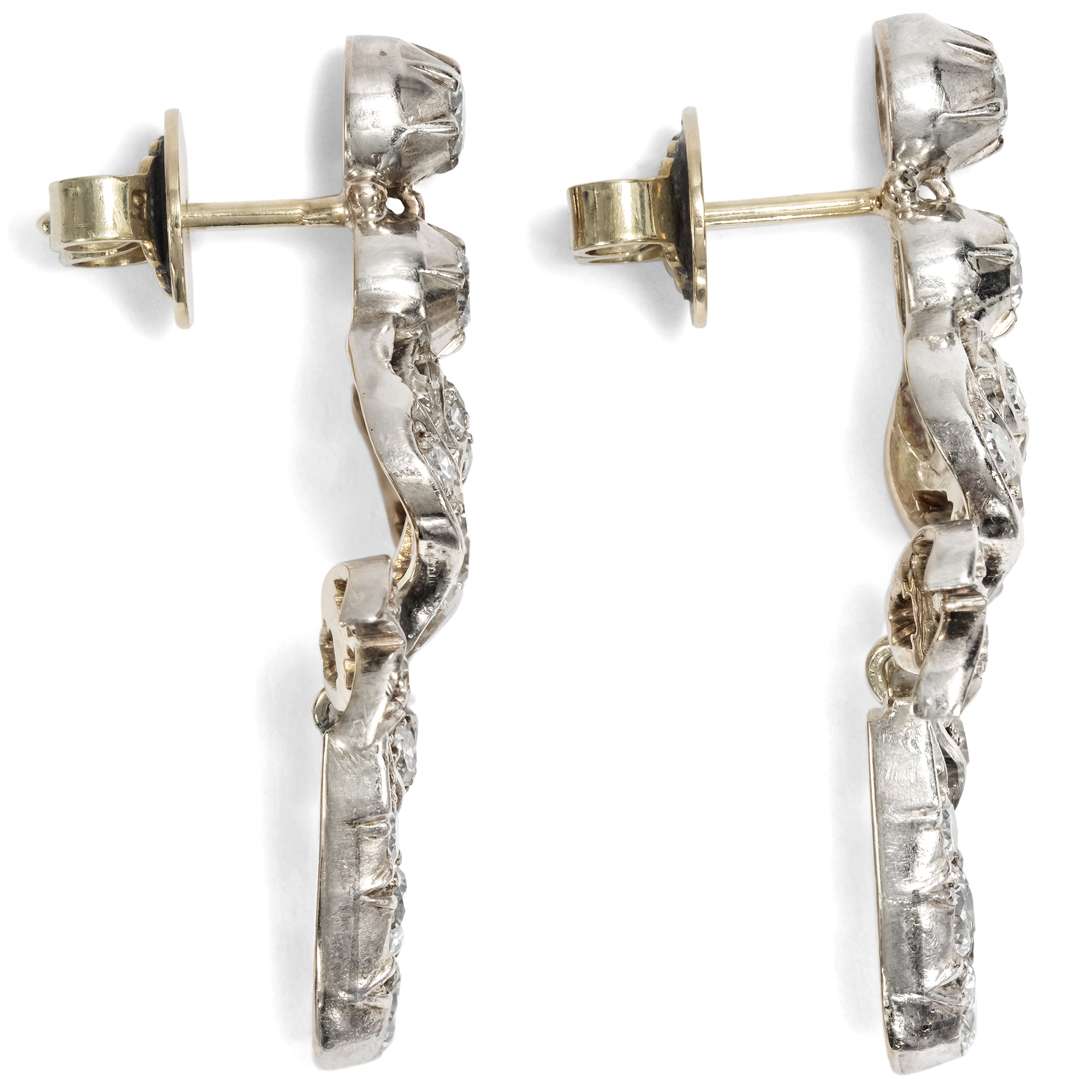 This pair of earrings corresponds to the type of pendeloque earring that first came into fashion in the 18th century. This type of earring is characterized by a stylized ribbon bow motif with a pendulum suspended below. This gallant fashion found new popularity in the c. 1900s. In the glow of electric light bulbs at the grand balls in Vienna, Paris and London, the ladies' white jewels shone brightly, their shapes often inspired by the courtly life of the previous century. These earrings are designed in this style, made of silver on a gold back. A total of around two carats of diamonds sparkle in the settings. They show modern cuts and therefore also a modern, very good brilliance. The stones are white to slightly warm-toned, which goes very well with the warm shine of the silver. The workmanship of the metals and the design language show that the earrings were created in the c. 1900s. The cuts of the diamonds, however, are cuts from the second half of the 20th century. They were therefore not set into the diamonds until later. We therefore assume that our earrings were once set with glass stones, so-called paste. The great demand for diamond jewellery and the rapidly changing fashions had made imitation diamonds such as clear paste stones socially acceptable at the turn of the century, and they were also set in silver and gold. However, glass is naturally neither as durable nor as precious as diamonds, so a previous owner probably decided to give the earrings a longer life due to their beautiful shape and design. We were able to discover the elegant pair as they are in Vienna. Even today, it tells of a legendary ball season...