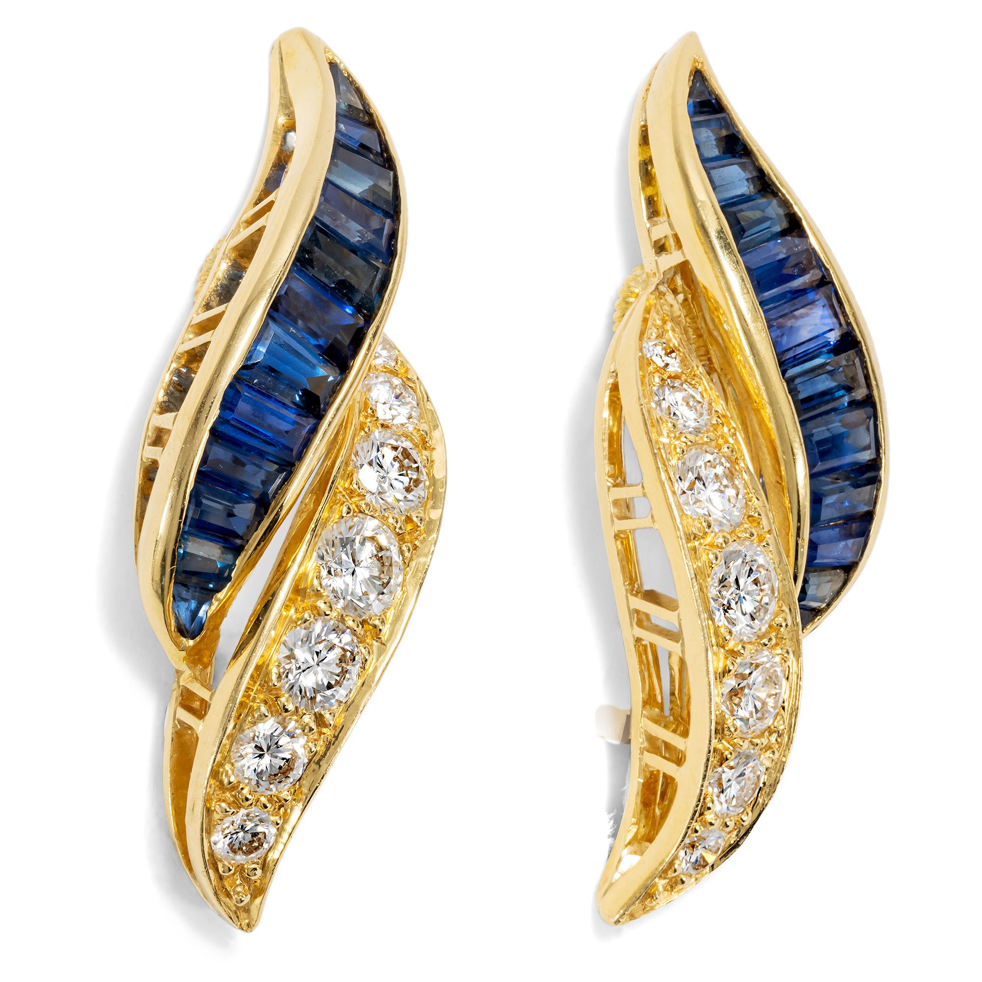 The 1980s were a decade full of energy and confidence. New opportunities opened up, shop windows shone brightly and there was a sense of abundance in the air. Women were more confident than ever before, they demanded space, took it and adorned themselves with shapes and colors that expressed courage and strength. Jewelry was allowed to be big, allowed to shine, allowed to be seen. The earrings presented here were created in this spirit. Twenty-four intense blue sapphires are set close together in high-carat gold. Their precise faceting makes the blue glow with every movement, as if light were falling through water. Fourteen brilliant-cut diamonds of the highest quality accompany the sapphires. They are gently set in a graduated pattern and bring a lively fire to the swing of the ear studs. The shape of the design is soft and harmonious. Two parallel tracks of blue and white nestle forward in a slight curve. Clear lines, luxurious materials and sparkling colors combine to create a pair of earrings that reveal the spirit of their era. Self-confident, luminous and elegant at the same time, ready to attract admiring glances again today. The earrings come with a detailed appraisal. We discovered them here in Berlin.