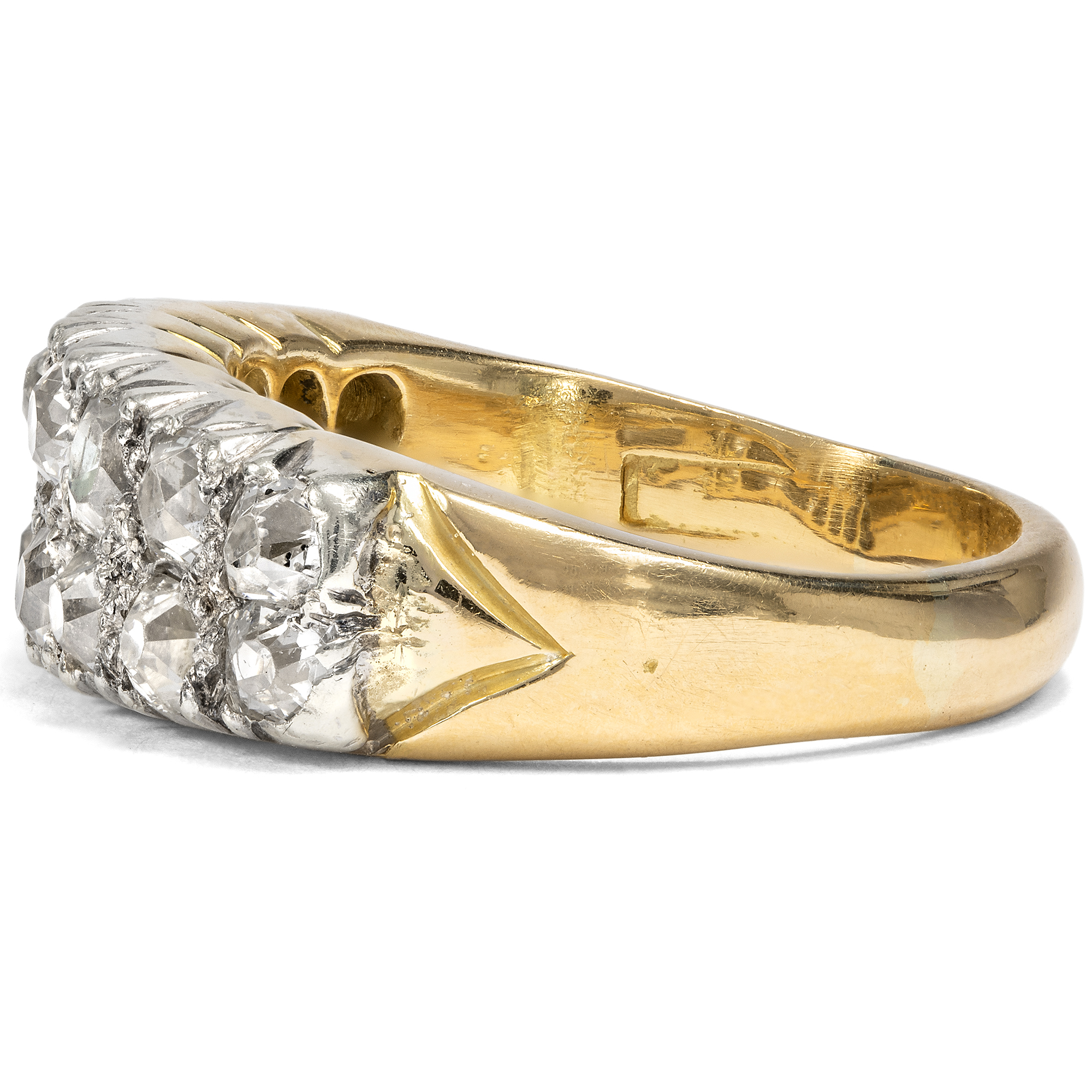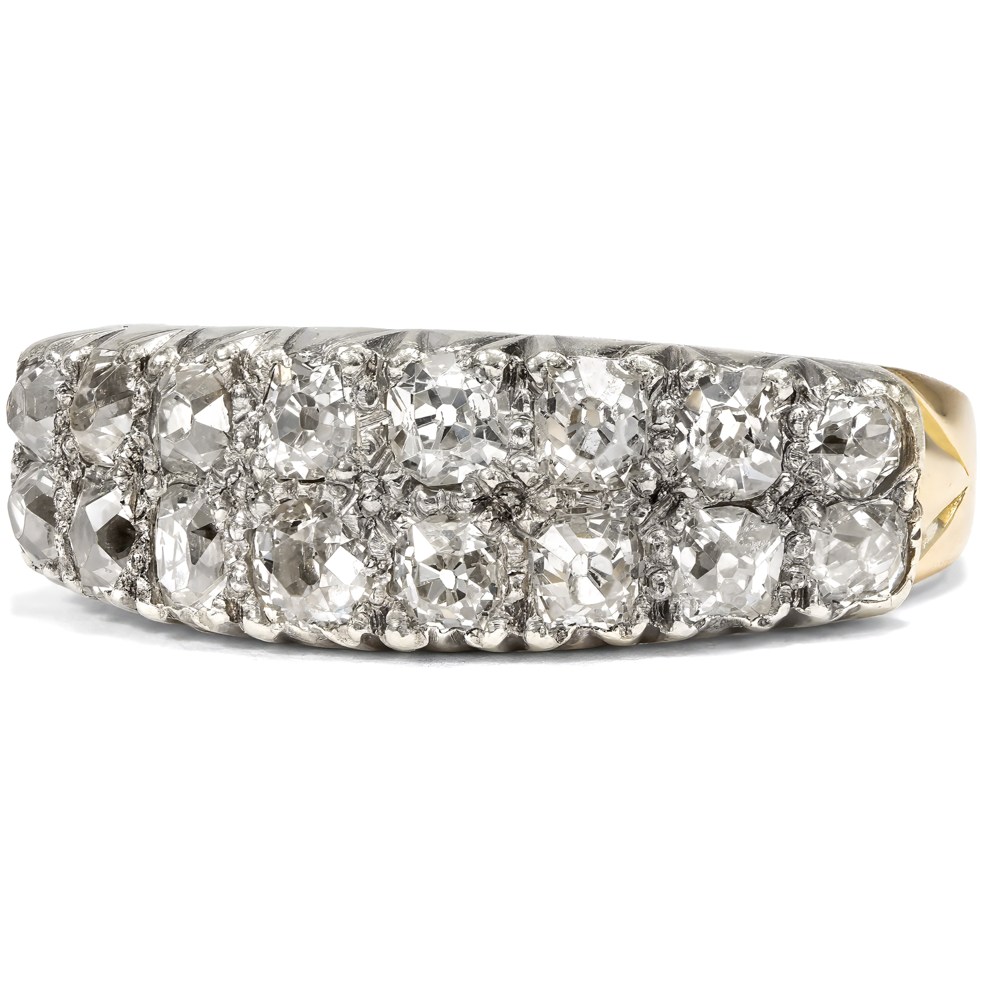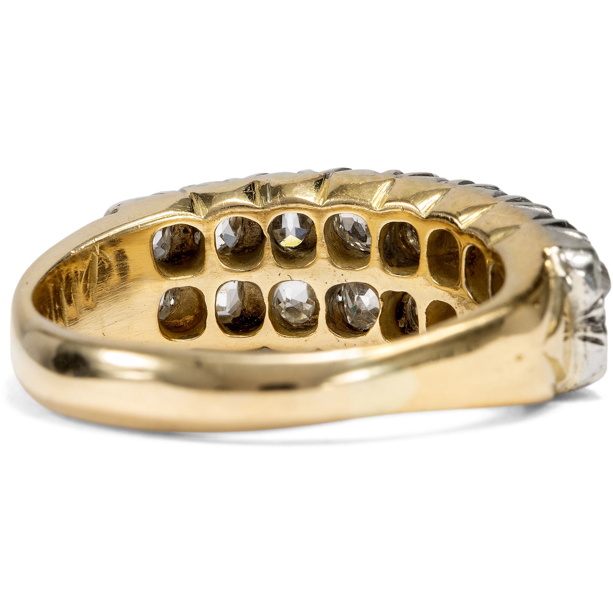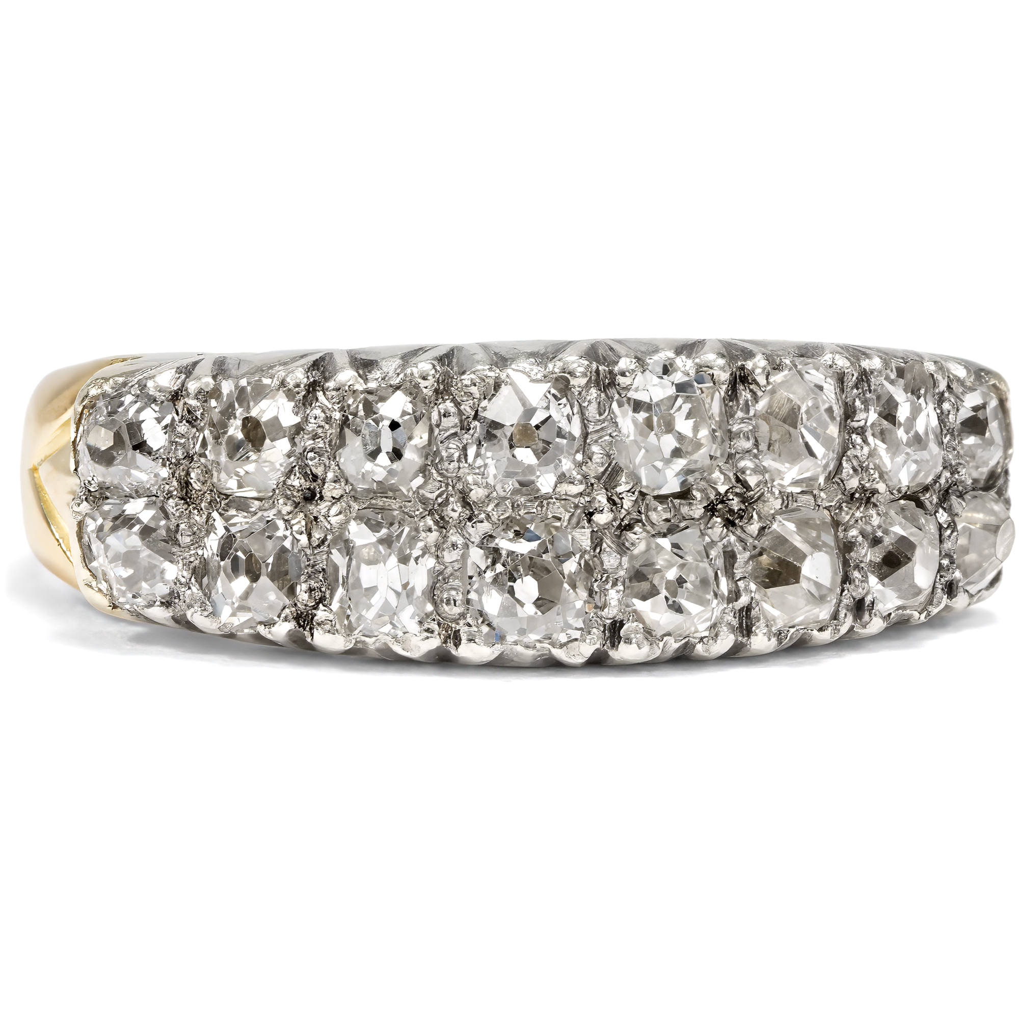 In previous generations, people who wanted to own jewellery in line with the latest fashion rarely went to a jeweller to buy a finished piece. Far more often, they went to a goldsmith to have a new piece of jewellery made according to their own ideas and in exchange with the craftsman. We can observe a typical approach of this period time and again: Instead of creating new pieces completely from scratch, existing gemstones were often incorporated and re-set. This resulted in pieces of jewellery that could continue to write the history of their own family and were as traditional as they were modern. This ring was created in just such a situation. A total of 16 historic old cut diamonds are set in two rows in a slightly graduated pattern on the ring face. The ring itself was created in the first half of the 20th century. However, the beautiful, cushion-shaped old cuts, so-called "old Mine cut" diamonds, are significantly older. They were cut as early as the middle of the 19th century or only a little later. They may have been taken from an heirloom in order to have them set in a modern setting at the time. Together they weigh around 1.28 ct. The yellow gold ring band tapers towards the bottom, allowing the showpiece to take precedence. The ring was probably created in England, but came to us here in Berlin.