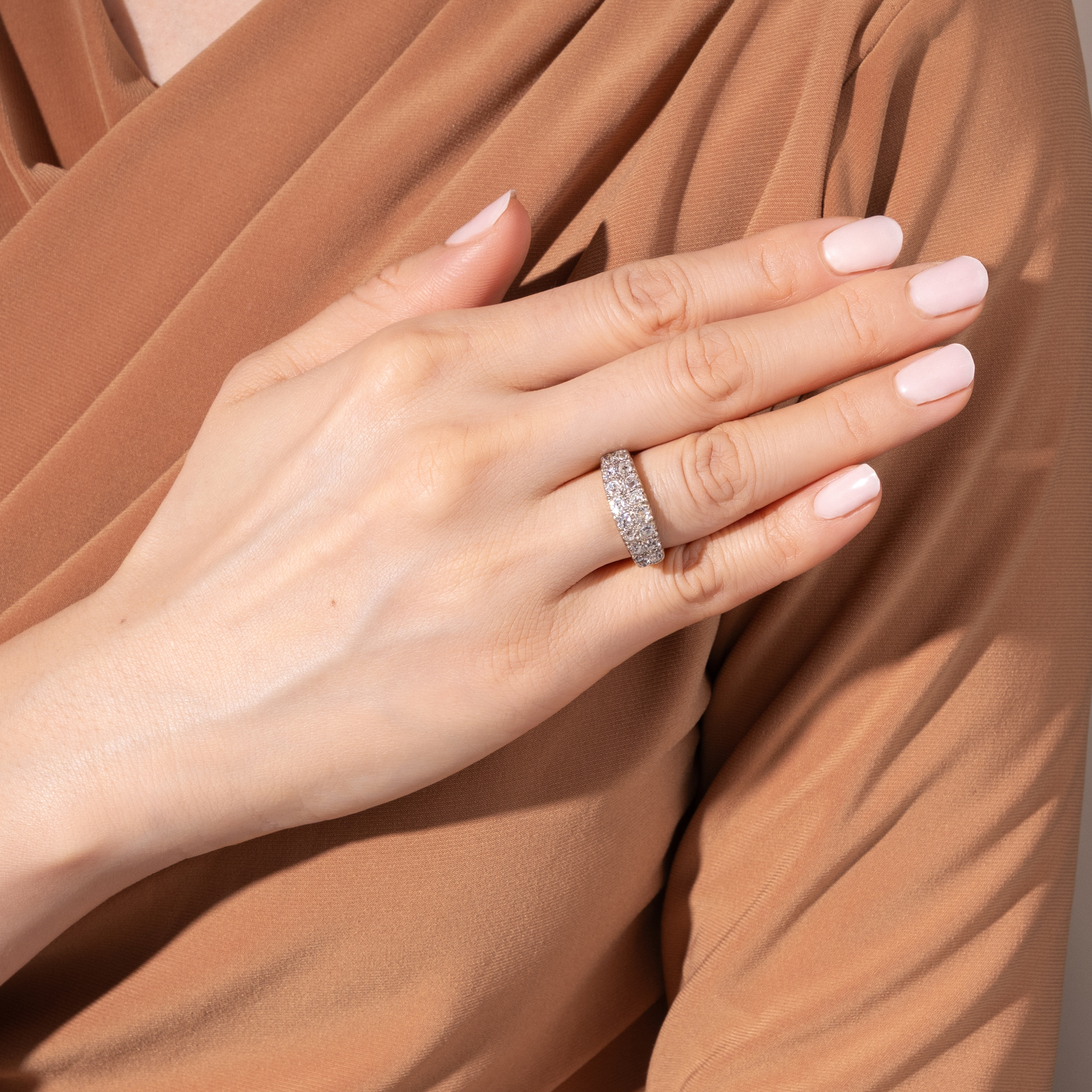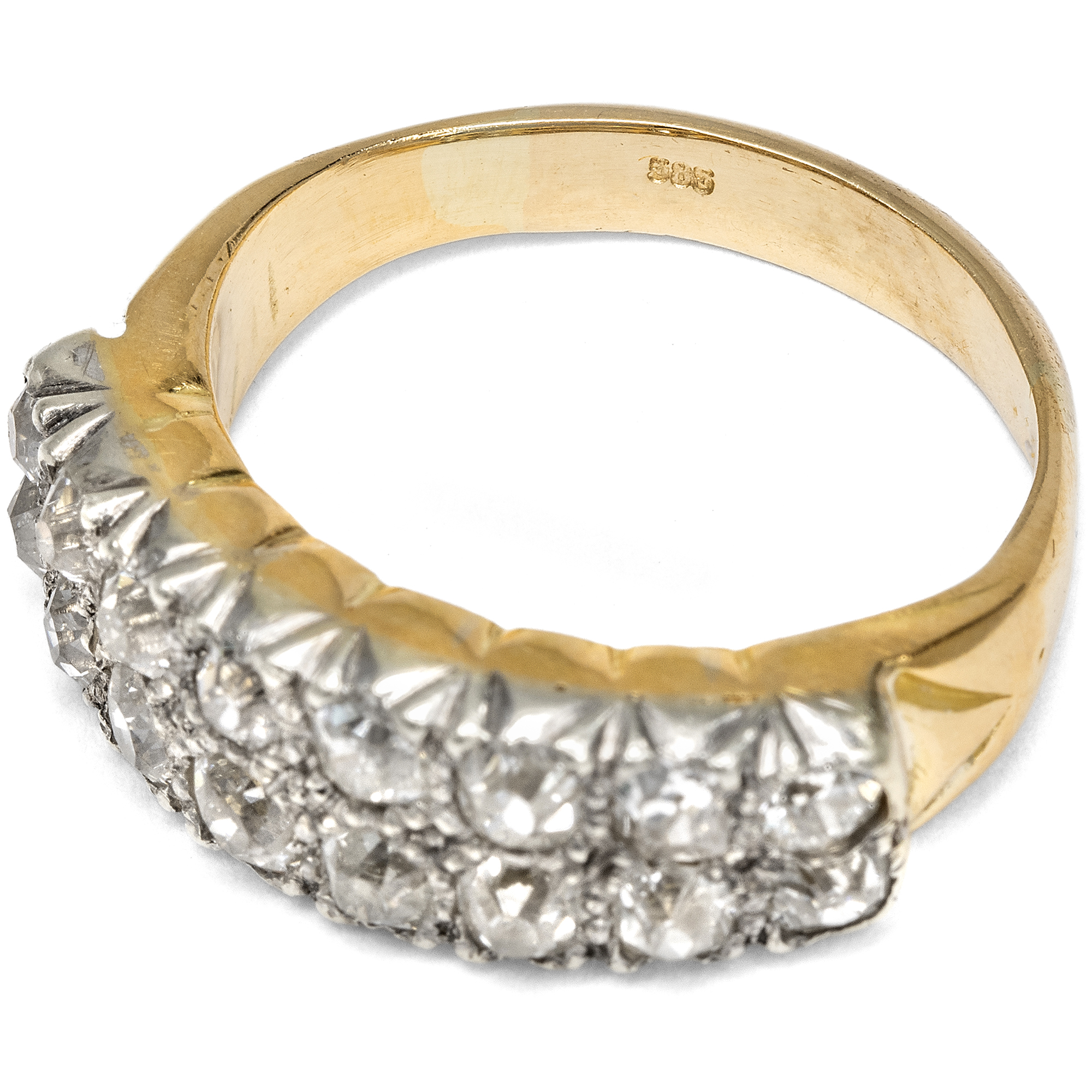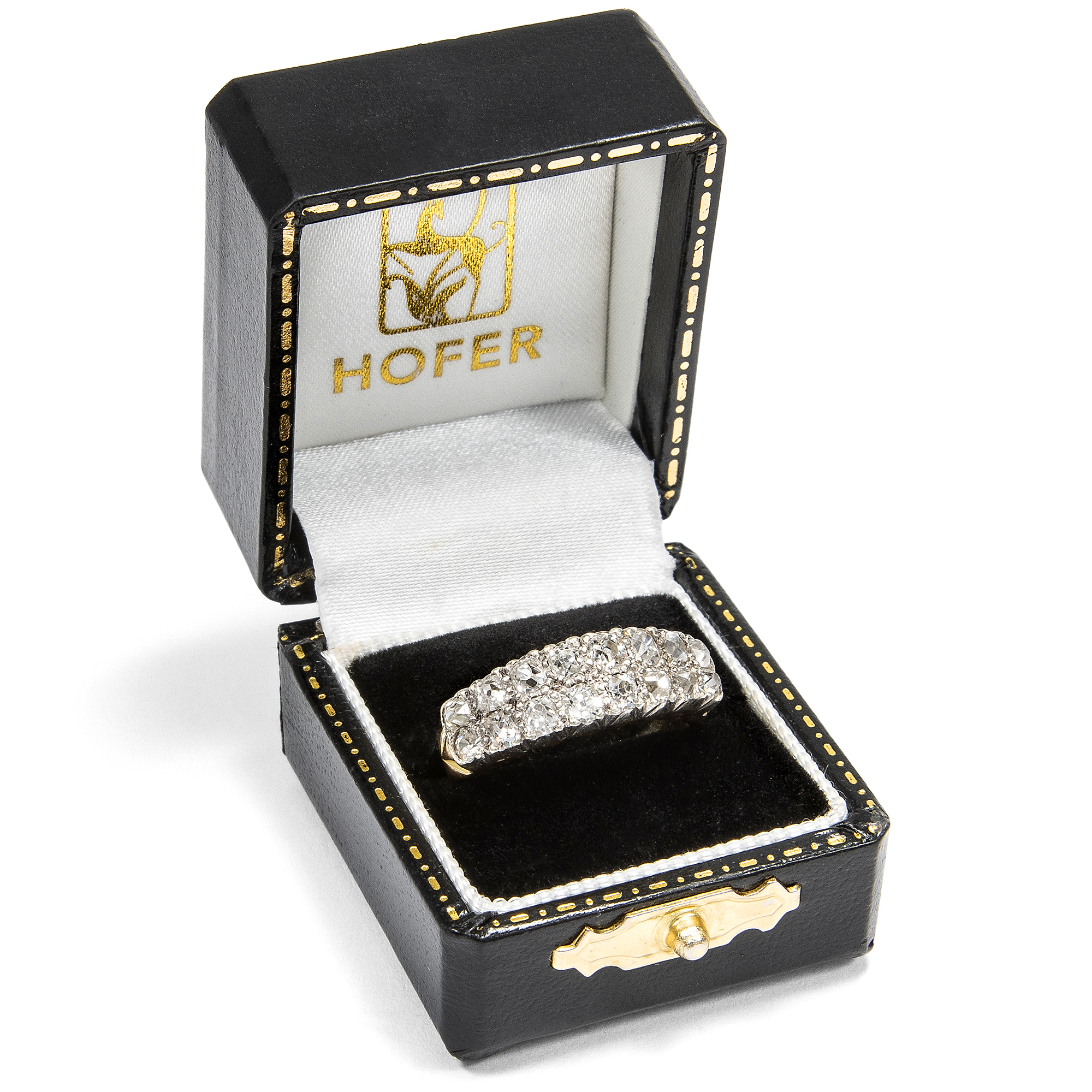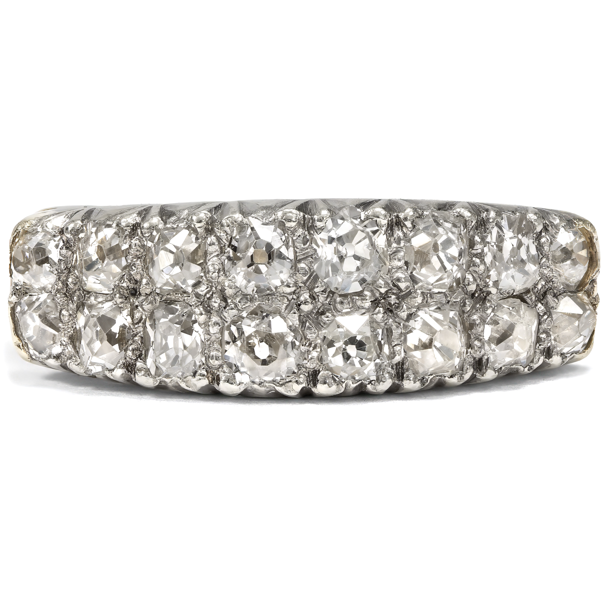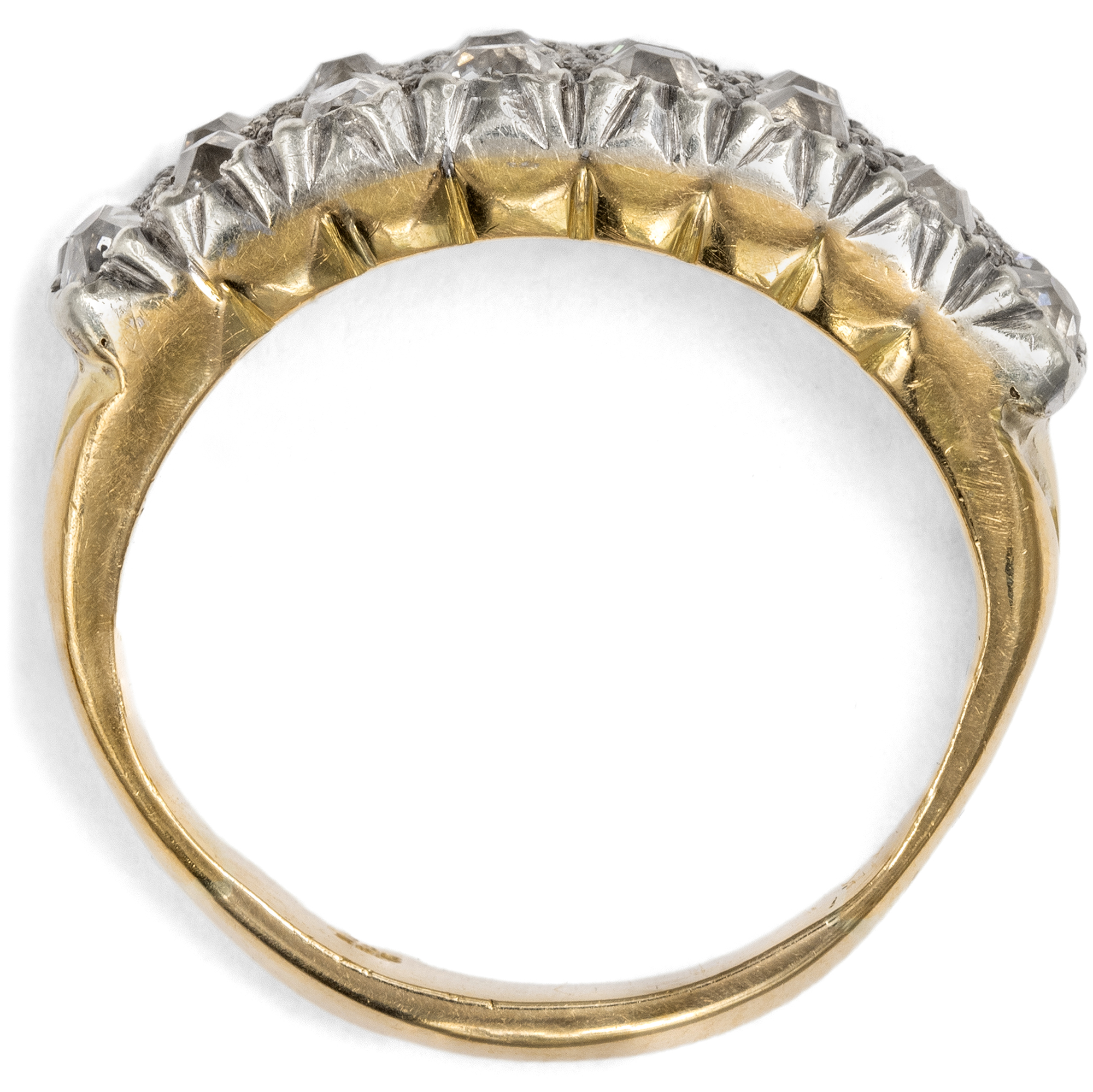 In previous generations, people who wanted to own jewellery in line with the latest fashion rarely went to a jeweller to buy a finished piece. Far more often, they went to a goldsmith to have a new piece of jewellery made according to their own ideas and in exchange with the craftsman. We can observe a typical approach of this period time and again: Instead of creating new pieces completely from scratch, existing gemstones were often incorporated and re-set. This resulted in pieces of jewellery that could continue to write the history of their own family and were as traditional as they were modern. This ring was created in just such a situation. A total of 16 historic old cut diamonds are set in two rows in a slightly graduated pattern on the ring face. The ring itself was created in the first half of the 20th century. However, the beautiful, cushion-shaped old cuts, so-called "old Mine cut" diamonds, are significantly older. They were cut as early as the middle of the 19th century or only a little later. They may have been taken from an heirloom in order to have them set in a modern setting at the time. Together they weigh around 1.28 ct. The yellow gold ring band tapers towards the bottom, allowing the showpiece to take precedence. The ring was probably created in England, but came to us here in Berlin.