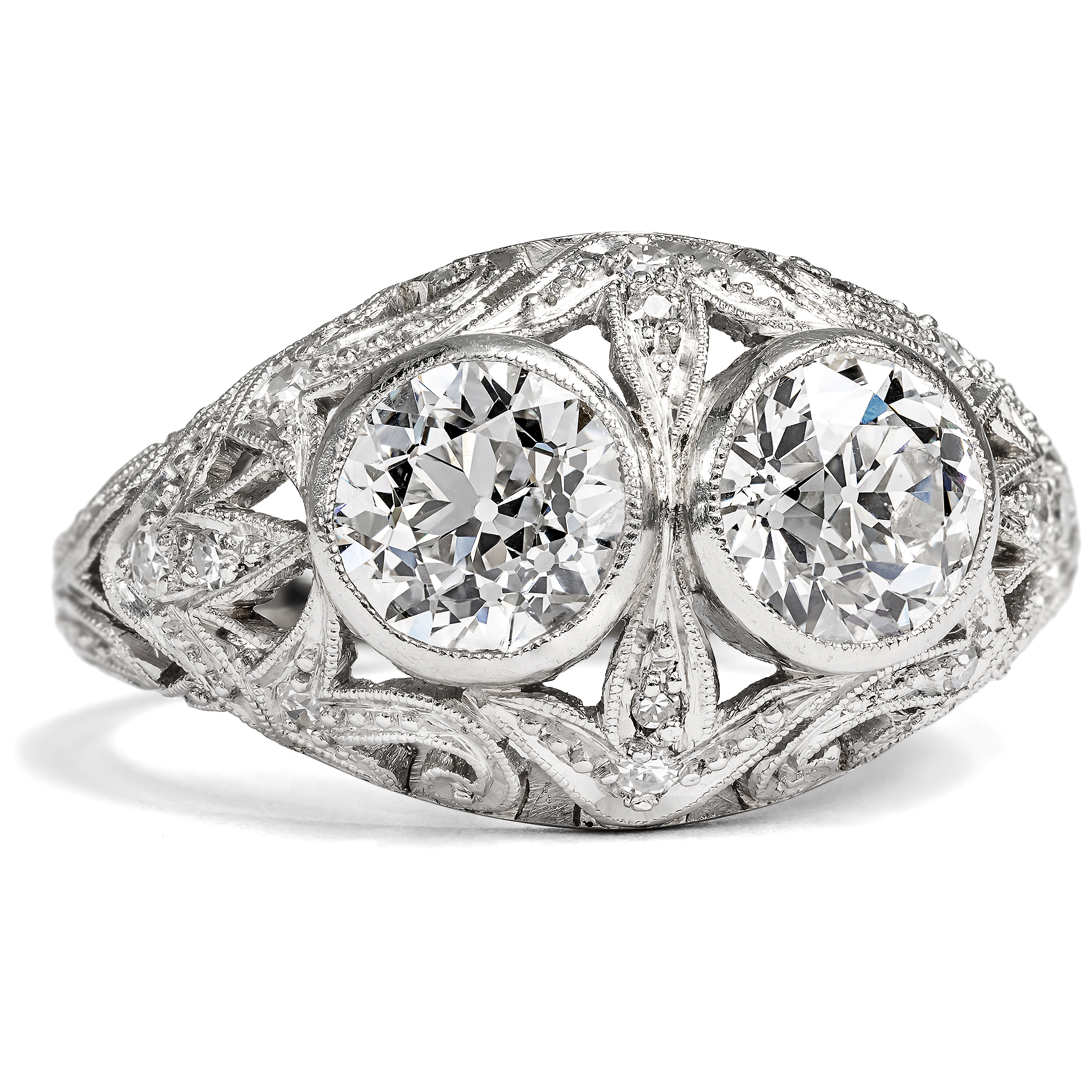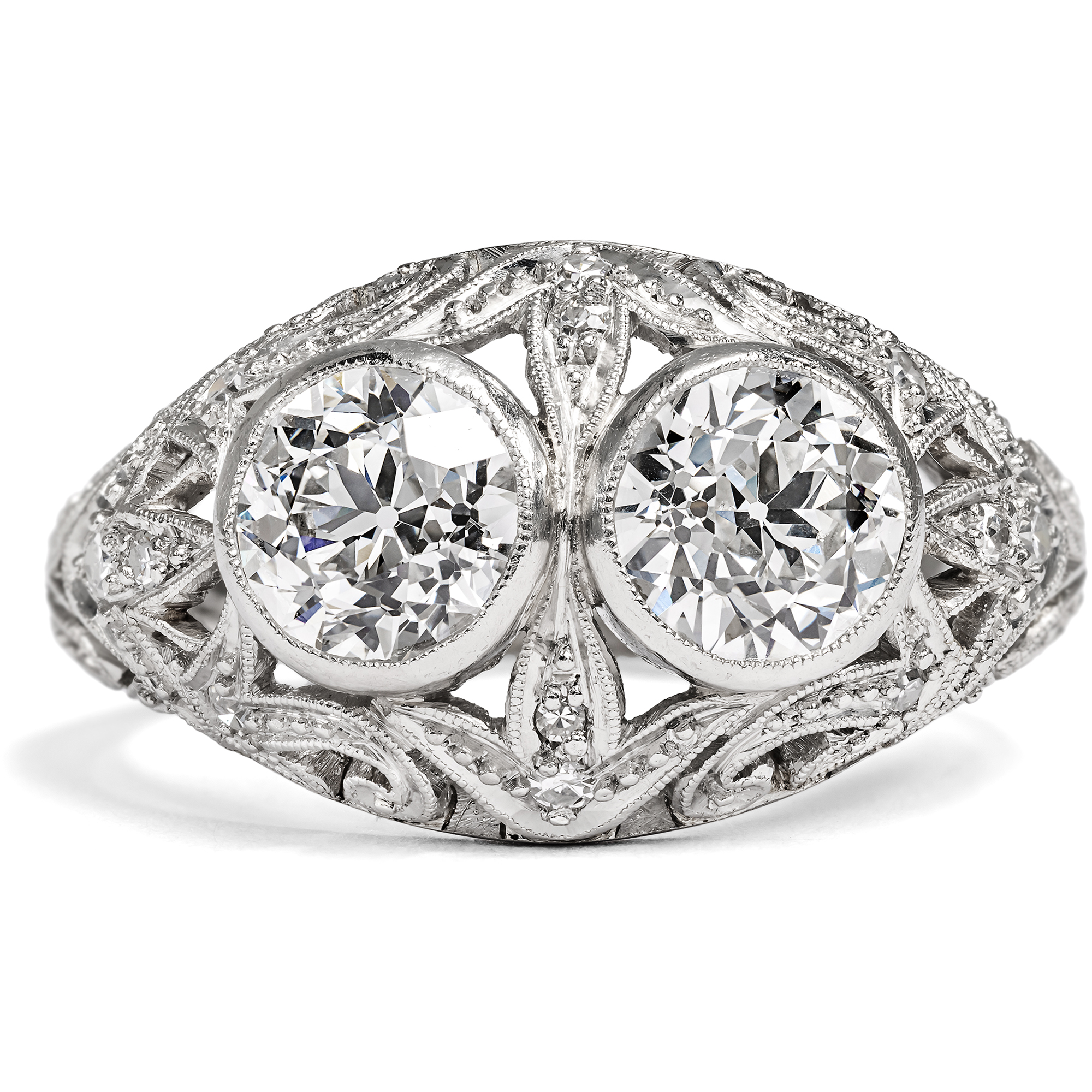 This ring from the Art Deco period tells a story of loving togetherness. It came to us from a distinguished Hamburg household and belongs to that genre of pieces of jewellery that are more than mere decoration. It is a "toi-et-moi" ring, a "you-and-me" design whose shape symbolizes the connection between two people. Two large diamonds face each other like lovers, equal and yet united in delicate tension, linked by the promise that this ring may have once sealed. Both stones are cut in the round old cut, the so-called Old European Cut, whose typical soft light is a special feature of many jewels from the 1920s. Together, the two diamonds weigh around 2.30 carats and impress with their exceptional qualities. Their sparkle is exceptional white (E) and the clarity of both stones is equally remarkable (vsi). Their fire is crystalline, pure and of a clarity that never lets go of your gaze. The ring is all white and decorated with fine, expressive tendril shapes, its shape like a small, wearable sculpture. The design is still very clearly inspired by the Expressionism of the 1910s, but at the same time already has the cool austerity of Art Deco. The central diamonds are accompanied by twelve smaller single cut diamonds that adorn the curved, slightly openwork ring face. Each individual stone is precisely set and blends into the exciting foliage of the design. Everything about this piece of jewellery is symmetrical, a reflection of the balance it seeks to express. This ring combines the clarity of Art Deco with the symbolism of a grand gesture. Two stones, two people, one promise - captured in a shared sparkle.