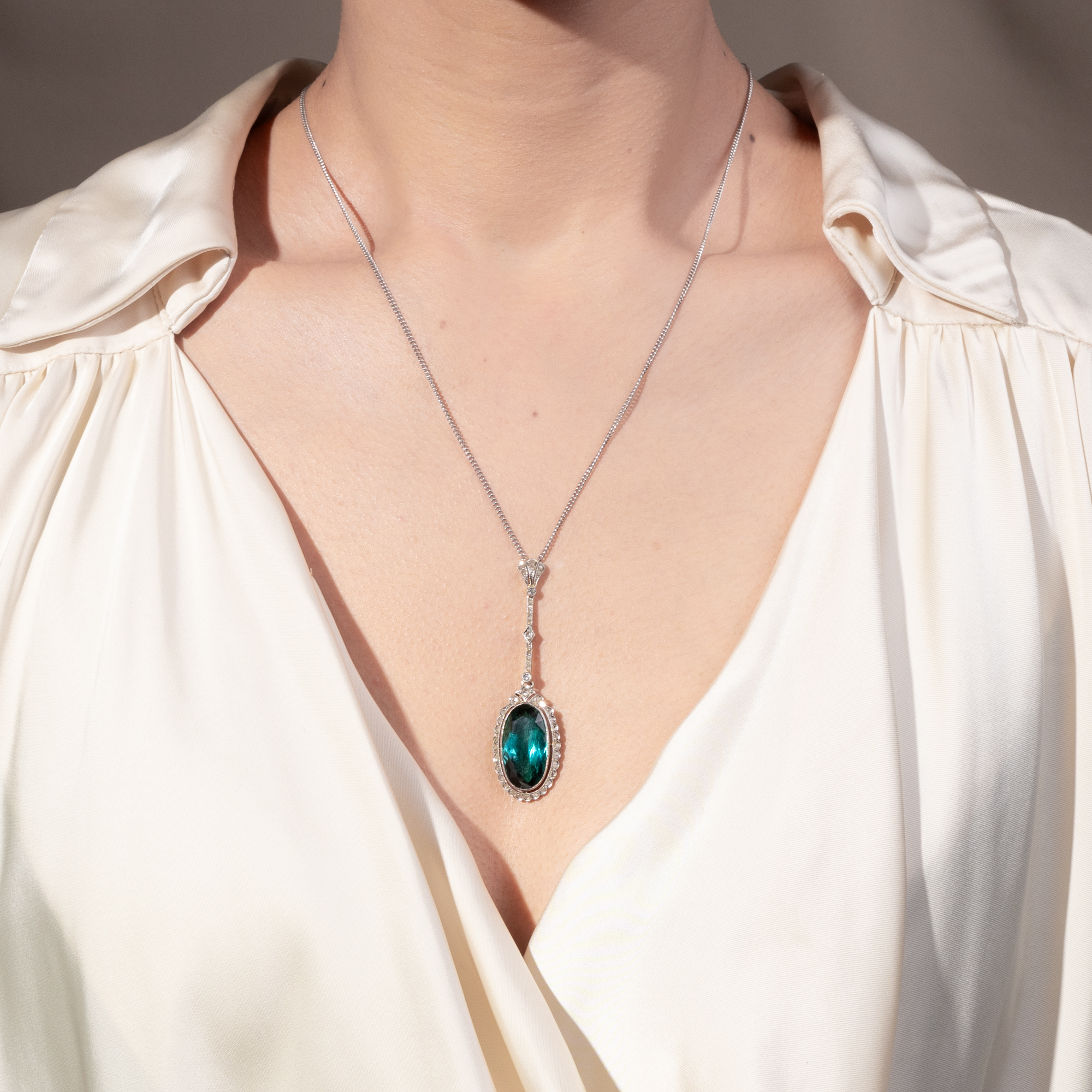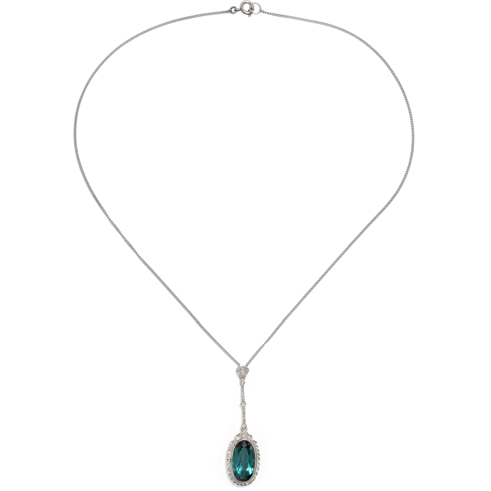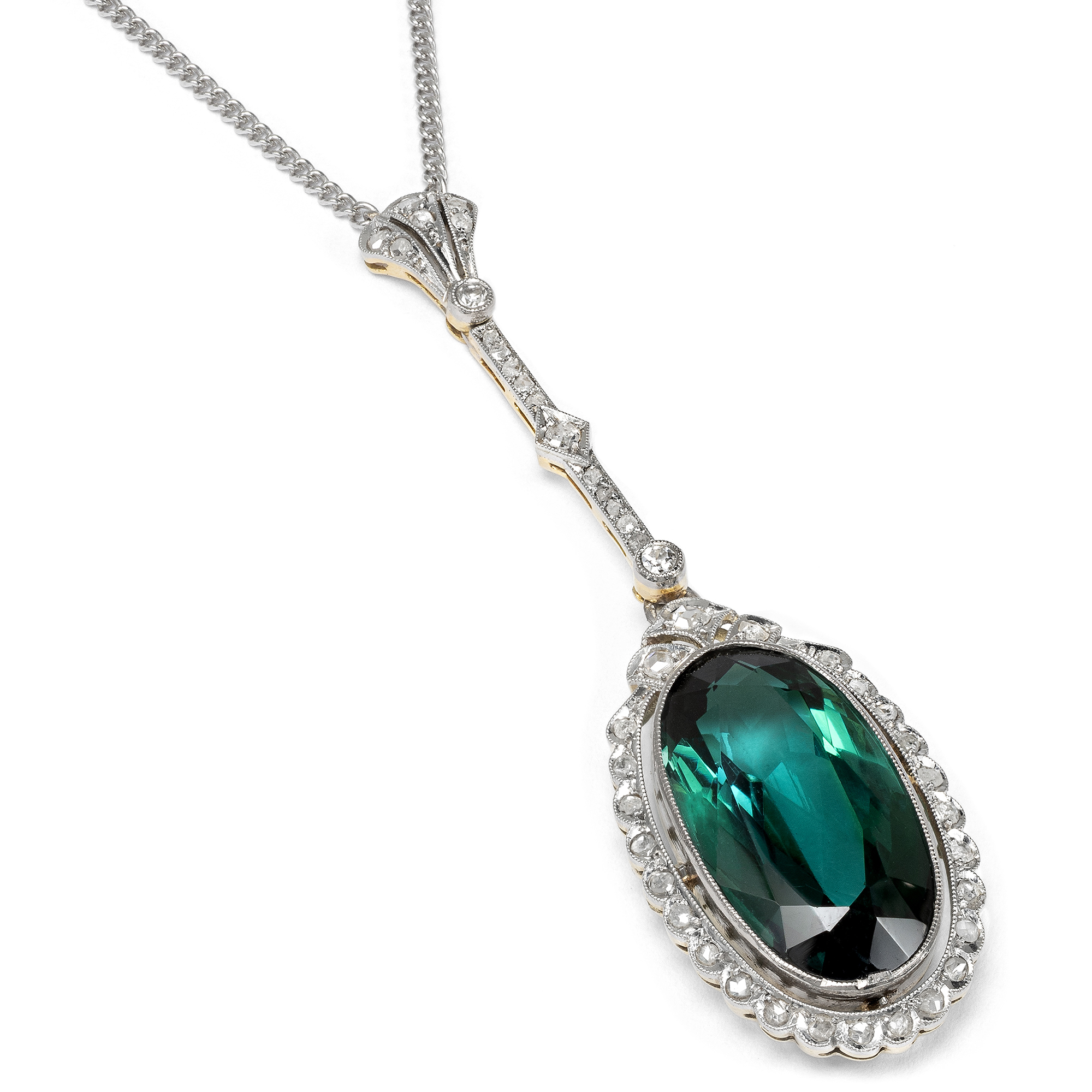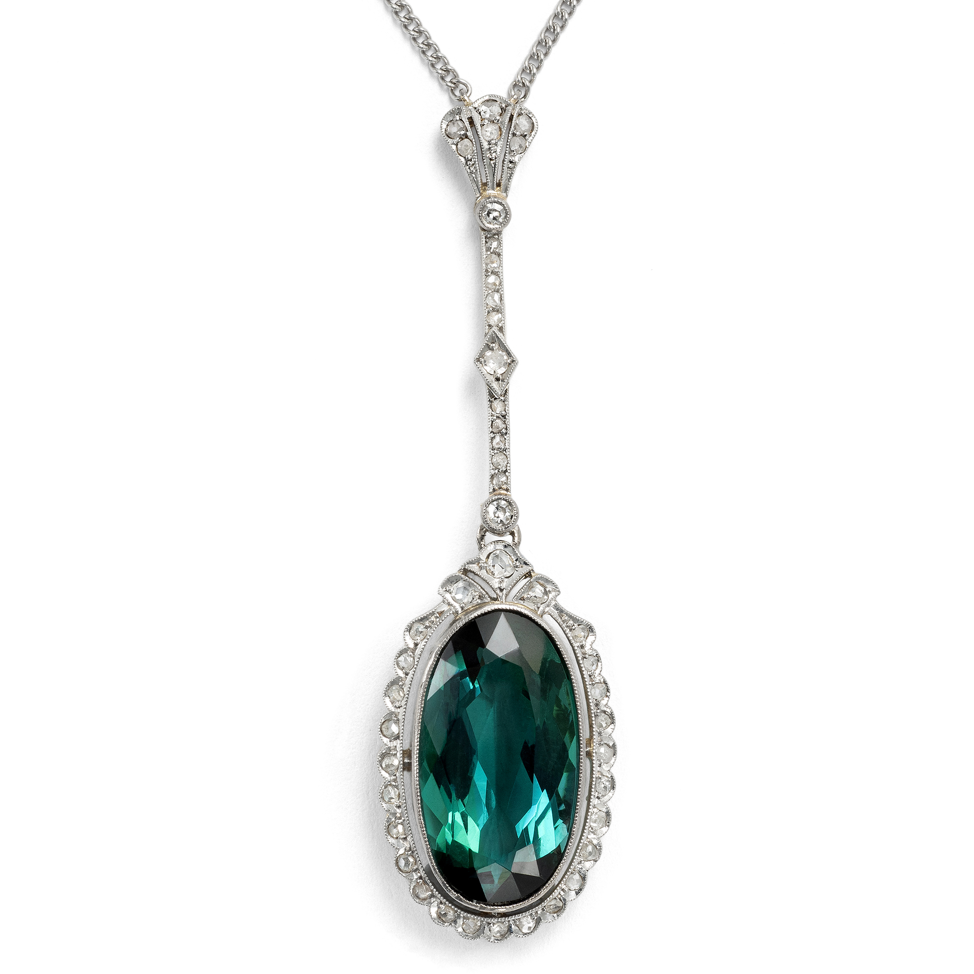 Antique jewellery can delight in very different ways. Sometimes it is the design, then the fine workmanship that amazes us. In the case of this necklace, it is the wonderful, large gemstone that immediately captivates us: It is a large, rare tourmaline set in platinum and diamonds that blossoms in the light. Compared to classic gemstones such as emeralds and sapphires, tourmalines are a rather recent discovery. They only reached Europe more regularly in the 18th century, first from Ceylon and then from Brazil. This is why their name does not come from Greek or Latin, as is usually the case, but is derived from the Sinhalese word for "colorful stone", turmali. The name already gives it away: tourmalines come in many colors. Green and red, pink and yellow tourmalines are common, often in mixed colors. A special feature of tourmaline is its strong so-called "pleochroism". This describes the fact that the tourmaline changes its color impression depending on the direction in which the stone is viewed: It is usually the same color in varying intensity, but sometimes the color of the stone also changes. Blue tourmalines are much rarer, especially in historical jewellery. This necklace is therefore all the more fortunate. The tourmaline weighs more than ten carats and is of first-class clarity and purity. Its play of colors is even more fascinating as it alternates between an intense petrol blue and a light bottle green. Both colours can usually be seen at the same time and alternate with each other with every movement of the stone. The tourmaline is therefore not green-blue in the sense of a mixed color, but actually both at the same time: it is green and it is blue. Just like the light at the blue hour in the evening: not easy to grasp, always changing, but immediately touching. The necklace frames the tourmaline in diamonds and makes it the highlight of a long, delicate pendant. A fine bezel setting with milgrains and a shadow gap showcases it entirely in the taste of the 1920s, and the execution of the goldsmith's work is as fine and high-quality as one could wish for in Art Deco jewellery. We discovered the pendant here in Berlin. An independent expert's report on the materials is enclosed with the perfectly preserved piece of jewellery.