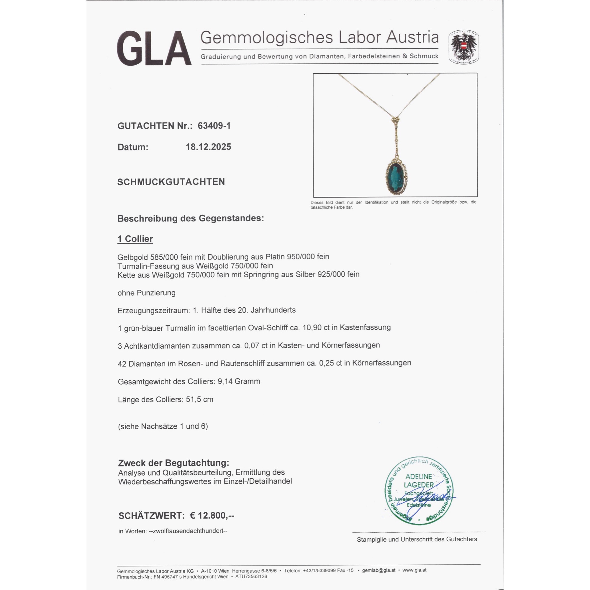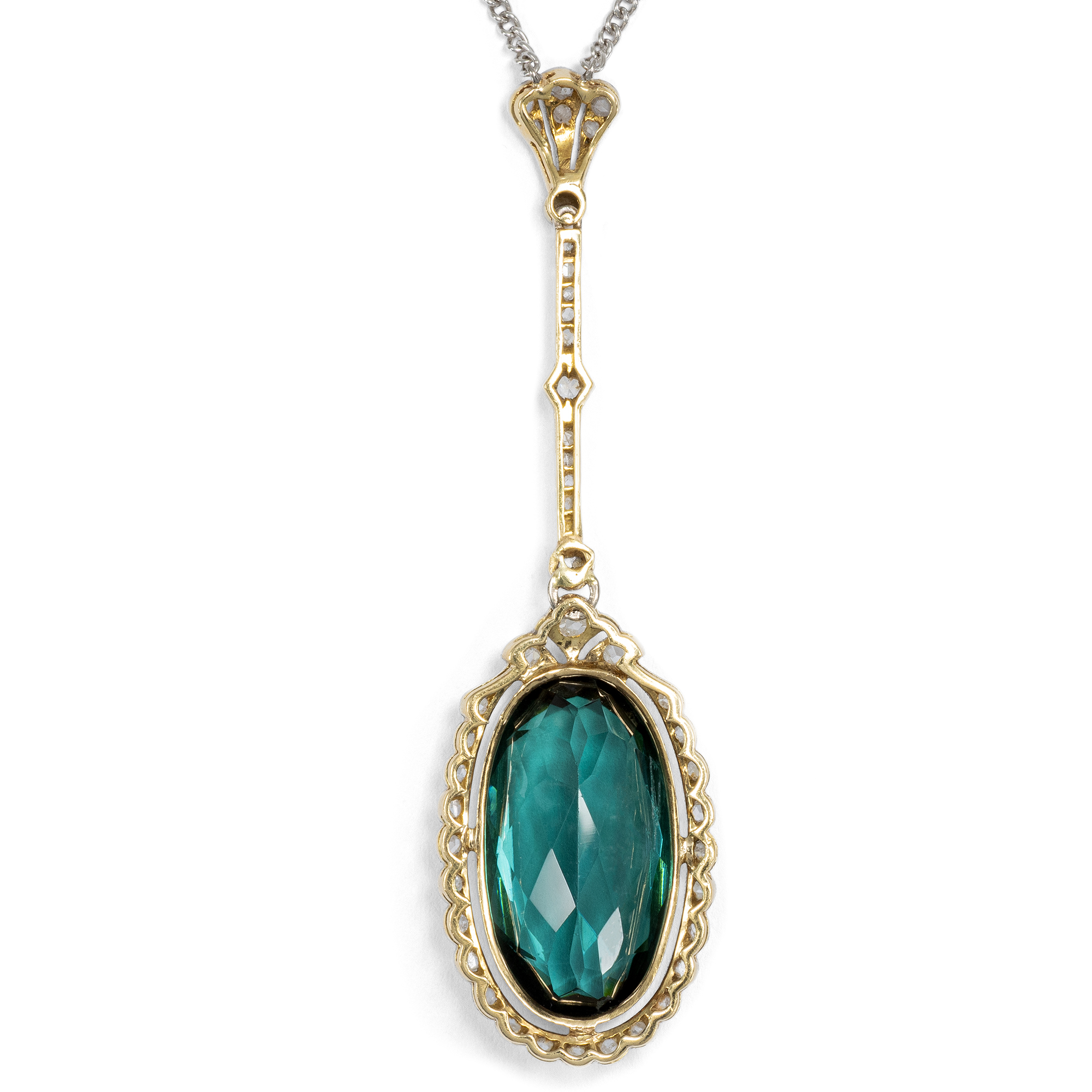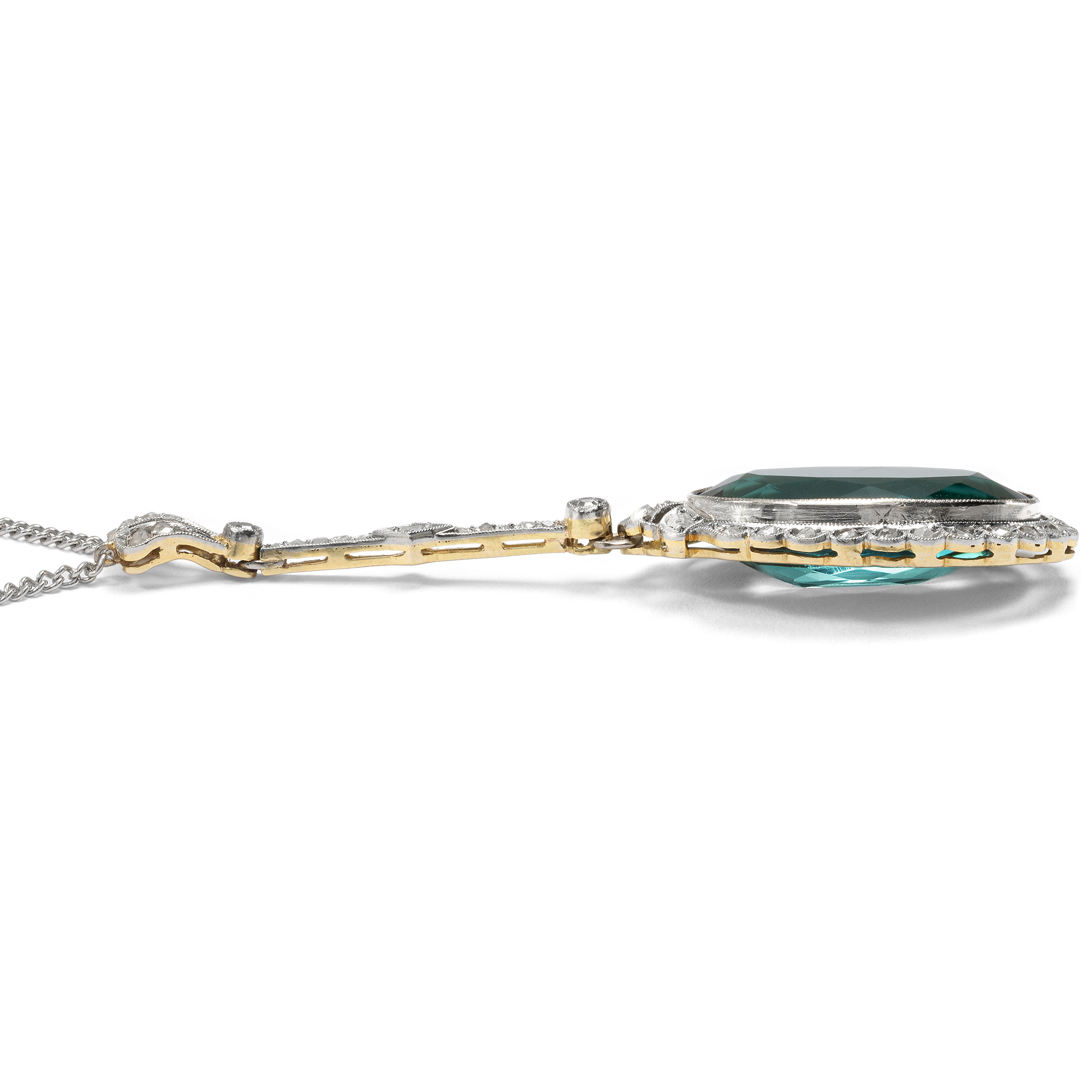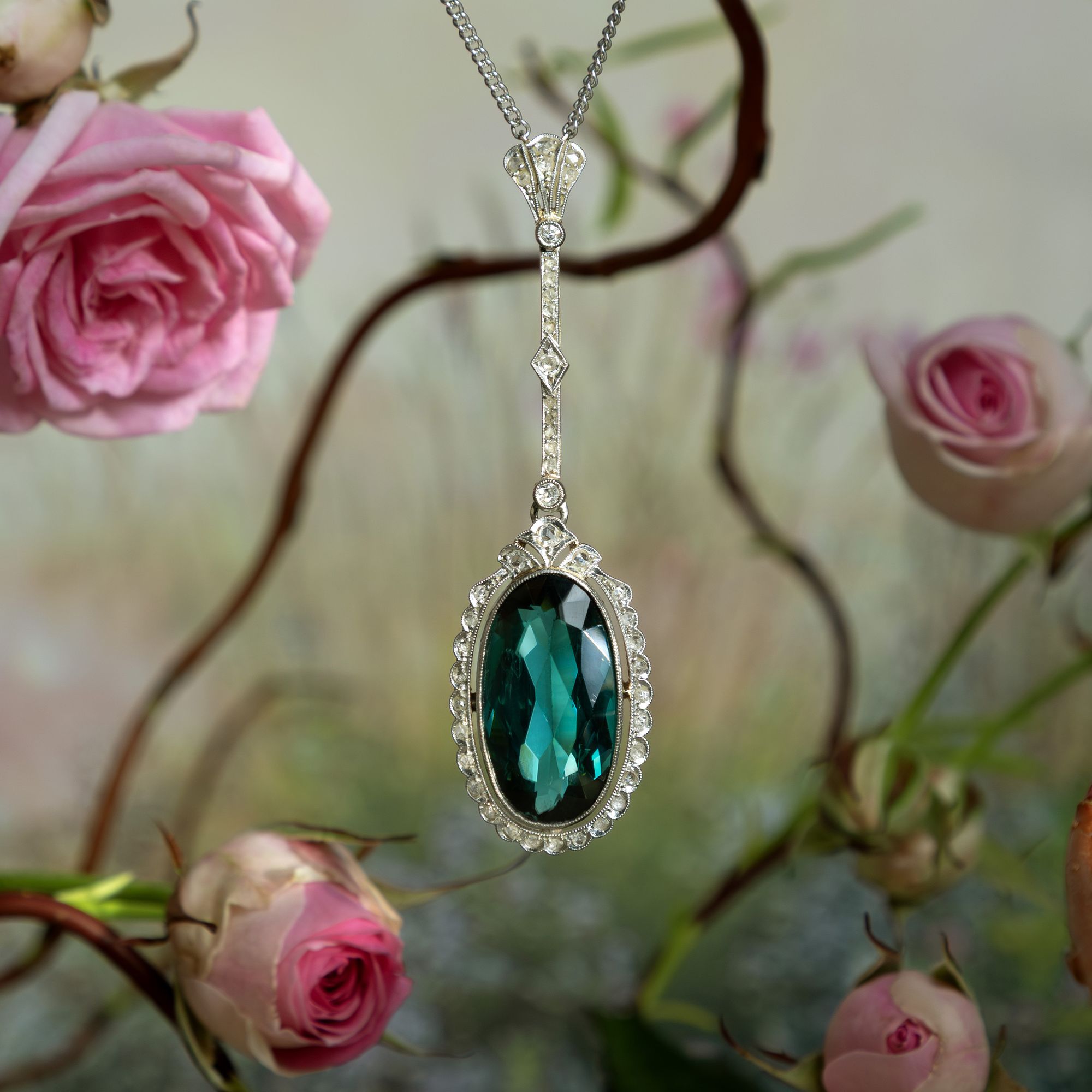 Antique jewellery can delight in very different ways. Sometimes it is the design, then the fine workmanship that amazes us. In the case of this necklace, it is the wonderful, large gemstone that immediately captivates us: It is a large, rare tourmaline set in platinum and diamonds that blossoms in the light. Compared to classic gemstones such as emeralds and sapphires, tourmalines are a rather recent discovery. They only reached Europe more regularly in the 18th century, first from Ceylon and then from Brazil. This is why their name does not come from Greek or Latin, as is usually the case, but is derived from the Sinhalese word for "colorful stone", turmali. The name already gives it away: tourmalines come in many colors. Green and red, pink and yellow tourmalines are common, often in mixed colors. A special feature of tourmaline is its strong so-called "pleochroism". This describes the fact that the tourmaline changes its color impression depending on the direction in which the stone is viewed: It is usually the same color in varying intensity, but sometimes the color of the stone also changes. Blue tourmalines are much rarer, especially in historical jewellery. This necklace is therefore all the more fortunate. The tourmaline weighs more than ten carats and is of first-class clarity and purity. Its play of colors is even more fascinating as it alternates between an intense petrol blue and a light bottle green. Both colours can usually be seen at the same time and alternate with each other with every movement of the stone. The tourmaline is therefore not green-blue in the sense of a mixed color, but actually both at the same time: it is green and it is blue. Just like the light at the blue hour in the evening: not easy to grasp, always changing, but immediately touching. The necklace frames the tourmaline in diamonds and makes it the highlight of a long, delicate pendant. A fine bezel setting with milgrains and a shadow gap showcases it entirely in the taste of the 1920s, and the execution of the goldsmith's work is as fine and high-quality as one could wish for in Art Deco jewellery. We discovered the pendant here in Berlin. An independent expert's report on the materials is enclosed with the perfectly preserved piece of jewellery.
