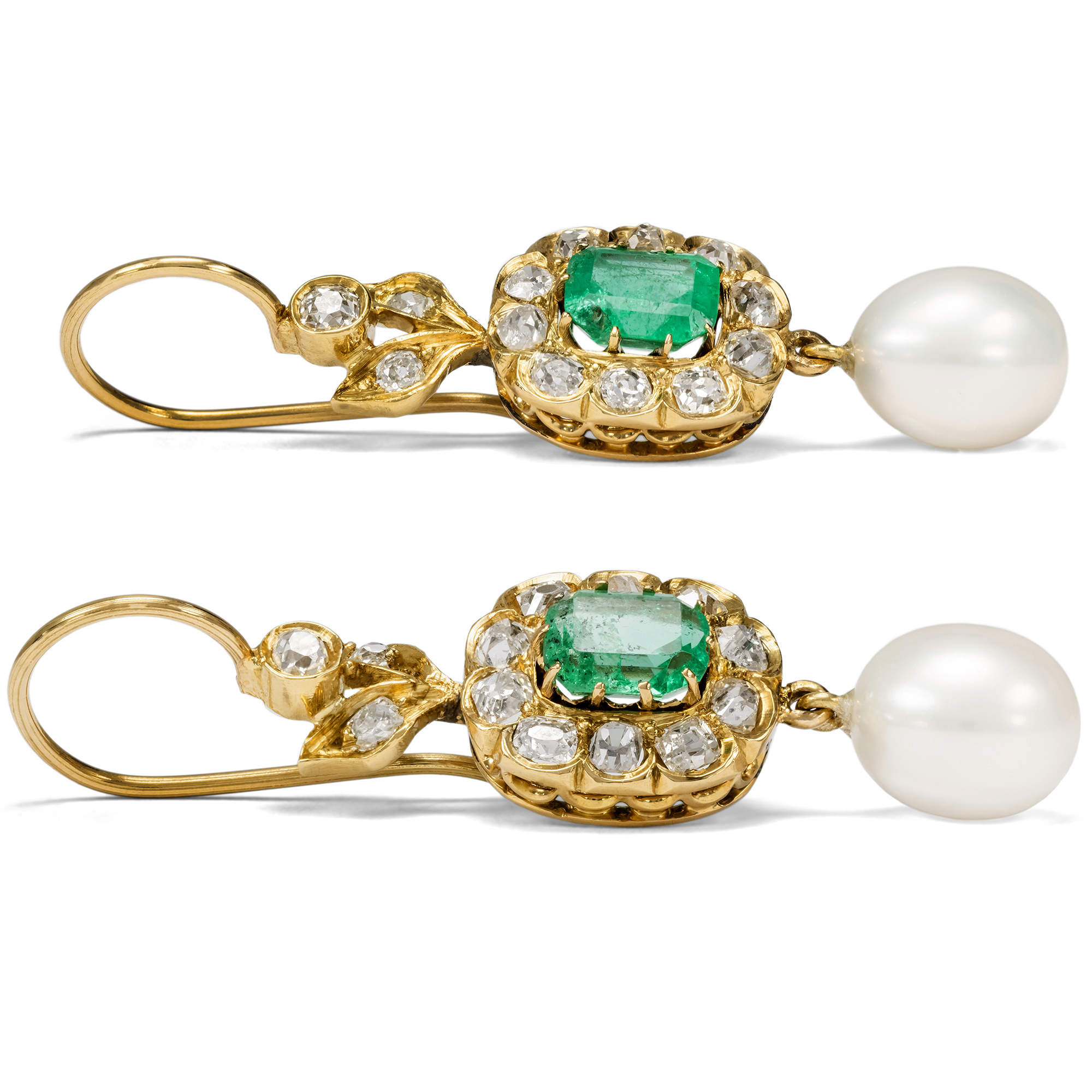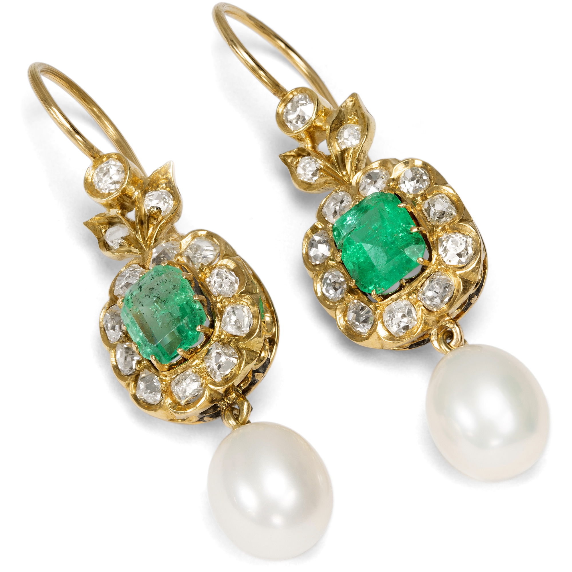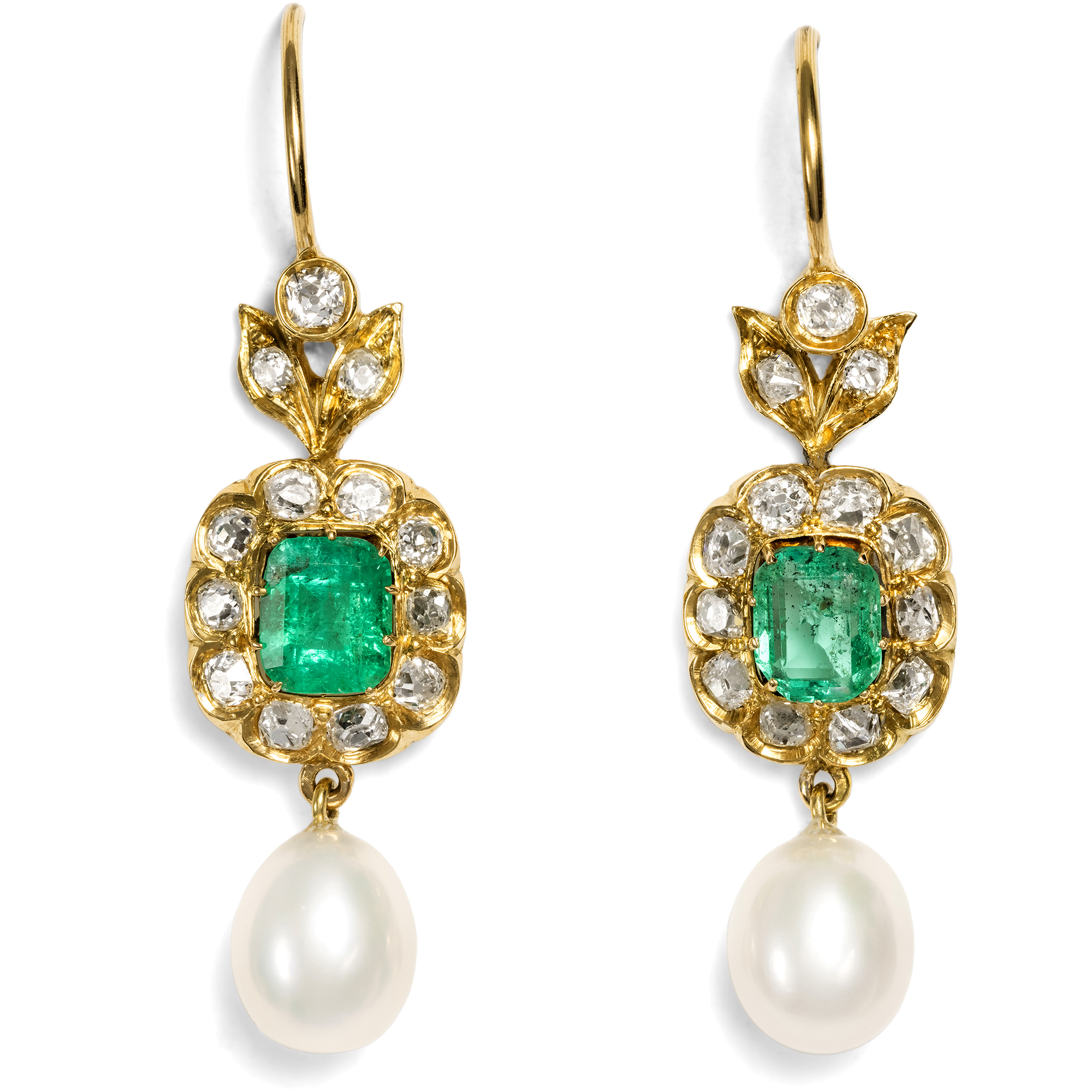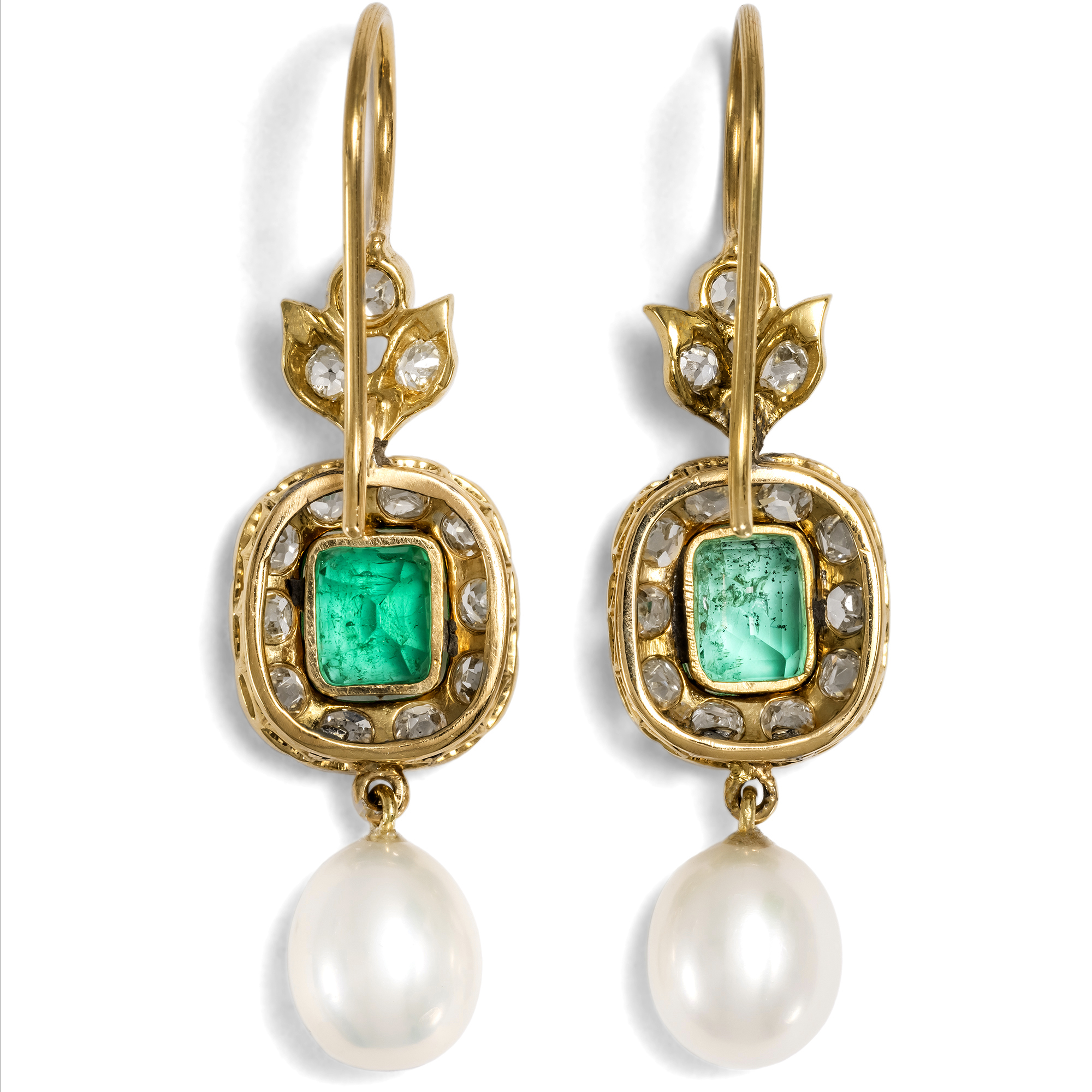Music plays, accompanied by light voices, laughter and the rustling of luxurious fabrics. Between the sounds lies the scent of time: fine perfumes, floral notes, a hint of vanilla and jasmine, mixed with the heavy aroma of cigar smoke from the gentlemen's room. Gaslight bathes the room in a warm, golden glow. Not a harsh light, but that soft glow that makes the shine of the gemstones on the ladies' necks and ears melt into a single, sparkling sea of rays. A ball in the late 19th century was a feast for all the senses, with moments in which music, movement and light merged into a display of beauty. The earrings on display here are reminiscent of those magical nights, as their centerpieces made from Brazilian emeralds and diamonds in gold were created at precisely that time, around 1880. A total of around 1.80 carats of diamonds and 1.40 carats of emeralds are used. The bails and pearls were added in our workshop to make the compositions wearable on the ear. Shining in new splendor today, the pair of earrings still transports a piece of that glamorous world that revelled in the glow of the gaslights.
