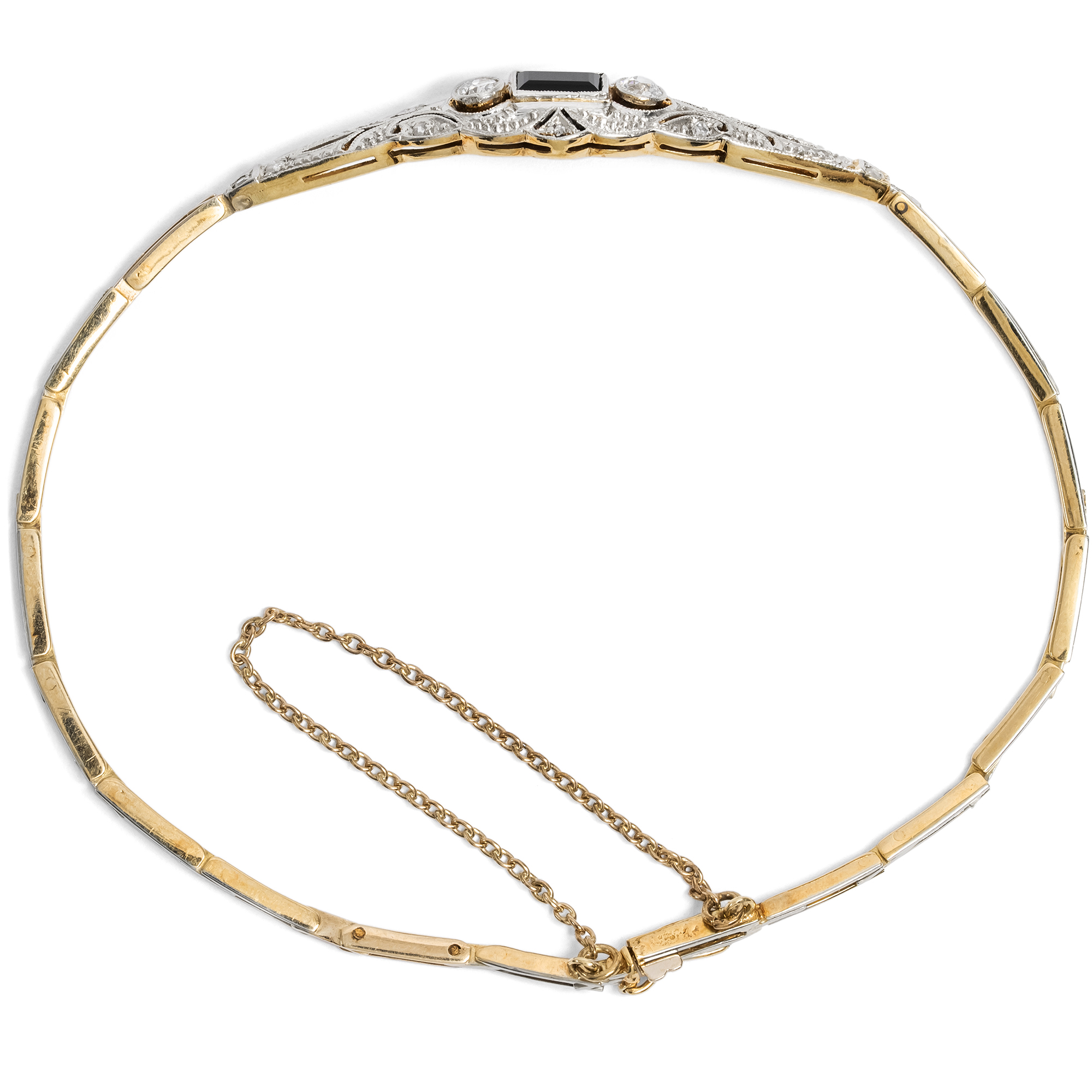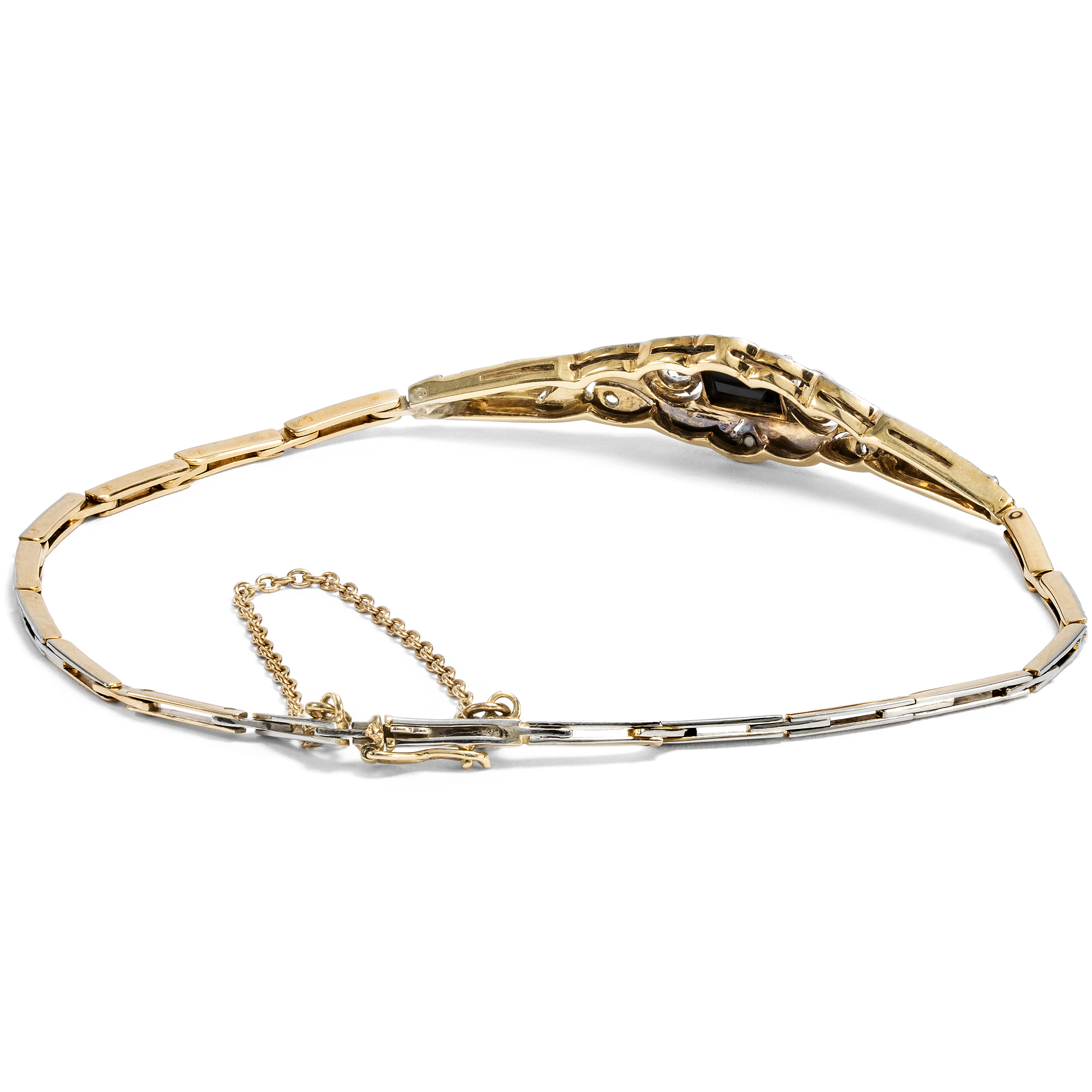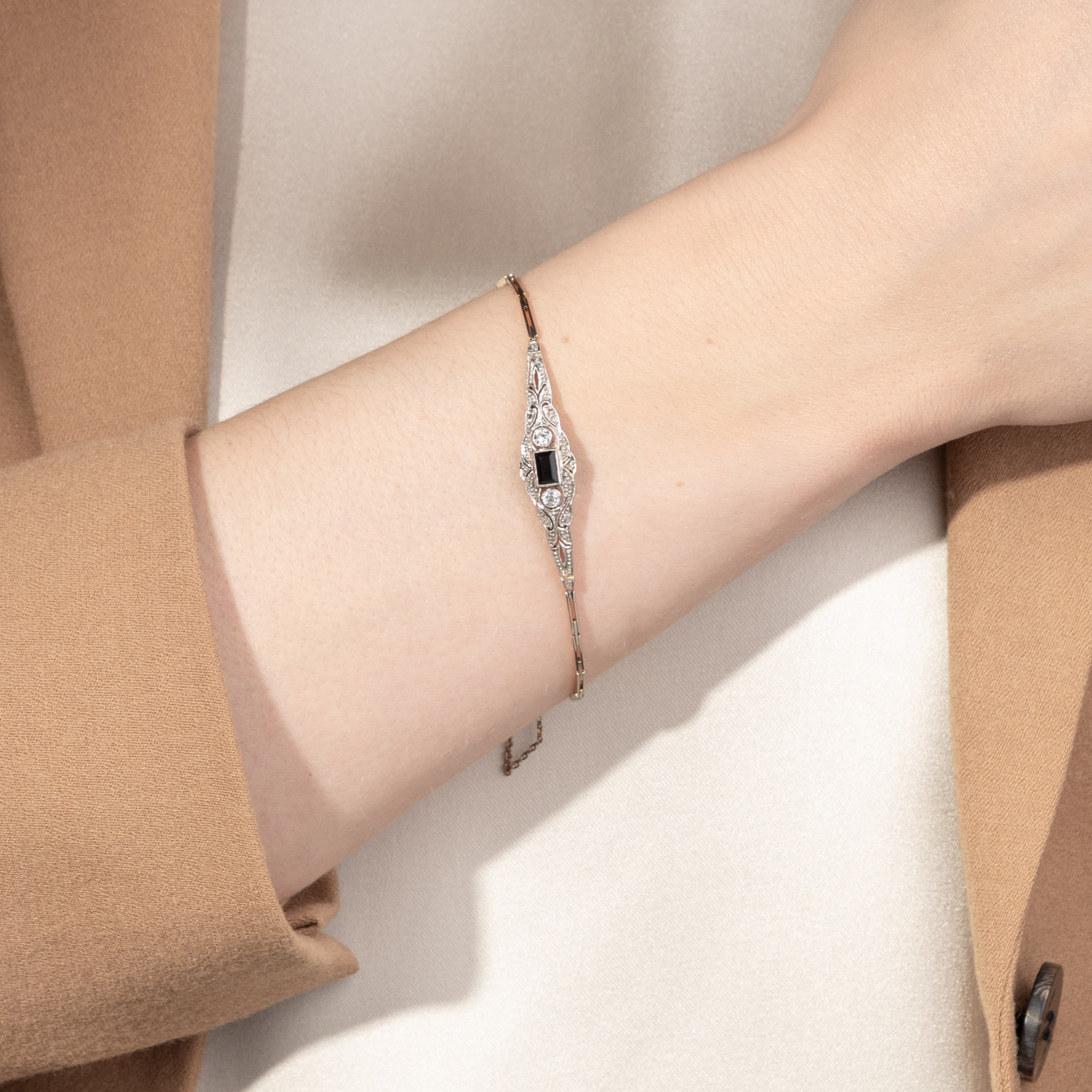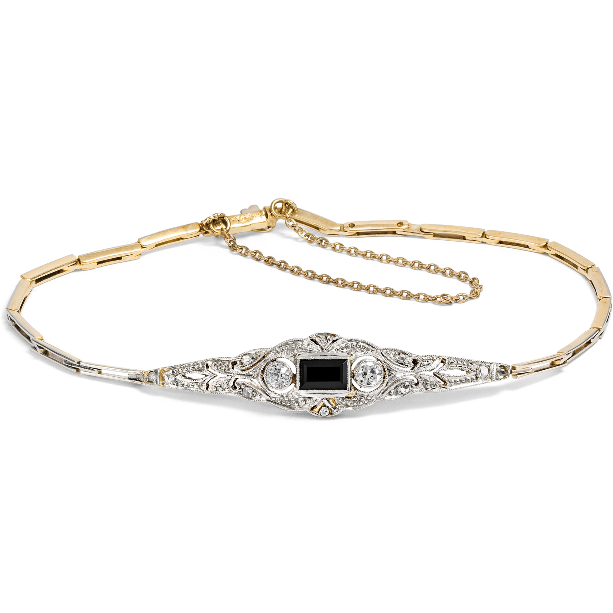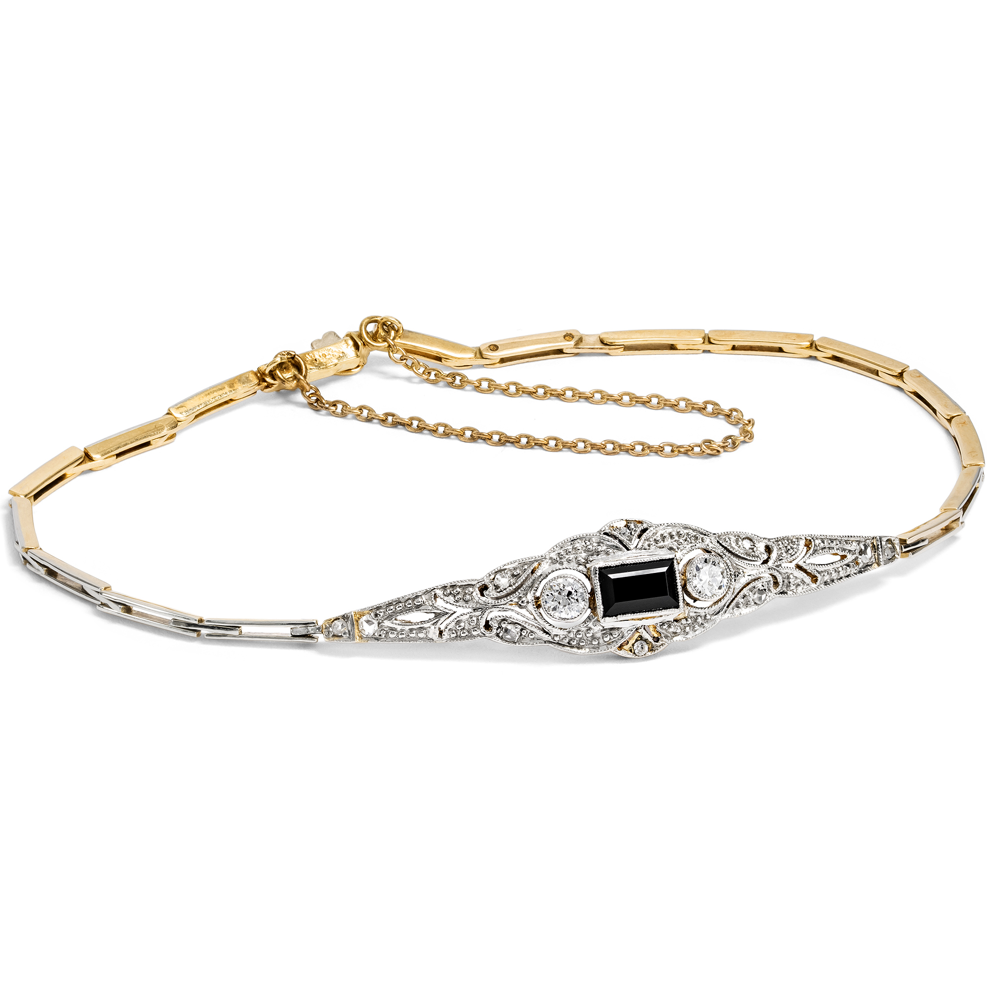 "It's often difficult for a gentleman to give a lady a gift - just think of a ring! You want to surprise her, so you can't ask about the size beforehand! Perhaps this is an important reason why such charming bracelets and necklaces are often ordered by men. There are no such difficulties here and the joy of a bracelet is certainly no less!" (From a Pforzheim jewellery catalog of the 1930s) Platinum bracelets set with sparkling white diamonds were the great passion of the 1920s. Every lady who could afford it wore such treasures - often not just individually, but combining several of them to create a radiant arrangement of pure luxury on her wrist. This is how we know the Hollywood stars of those years in old black-and-white photographs that still shape our idea of the "femme fatale" of the time today. This bracelet from this era impresses with its fine, beautiful workmanship. Made from 14-karat yellow gold and fine platinum, this piece of jewellery draws its elegant charisma from the graphic lightness of its shapes. In the middle of the link bracelet, a slightly curved centerpiece sparkles with two beautiful old-cut diamonds and a black onyx, which adorns the center of the showpiece as a dark rectangle. The black onyx was particularly popular in the 1920s as a modern contrast to white diamonds and platinum, but is unusual as a center stone: it presumably replaces a lost gemstone here, possibly a sapphire. Delicately sawn arabesques and tiny milgrains lend the design its lively lightness and exude the cool elegance of Art Deco. Whether bought as a gift from a gentleman for the lady of the heart or for yourself - it will be a wonderful eye-catcher on any wrist!