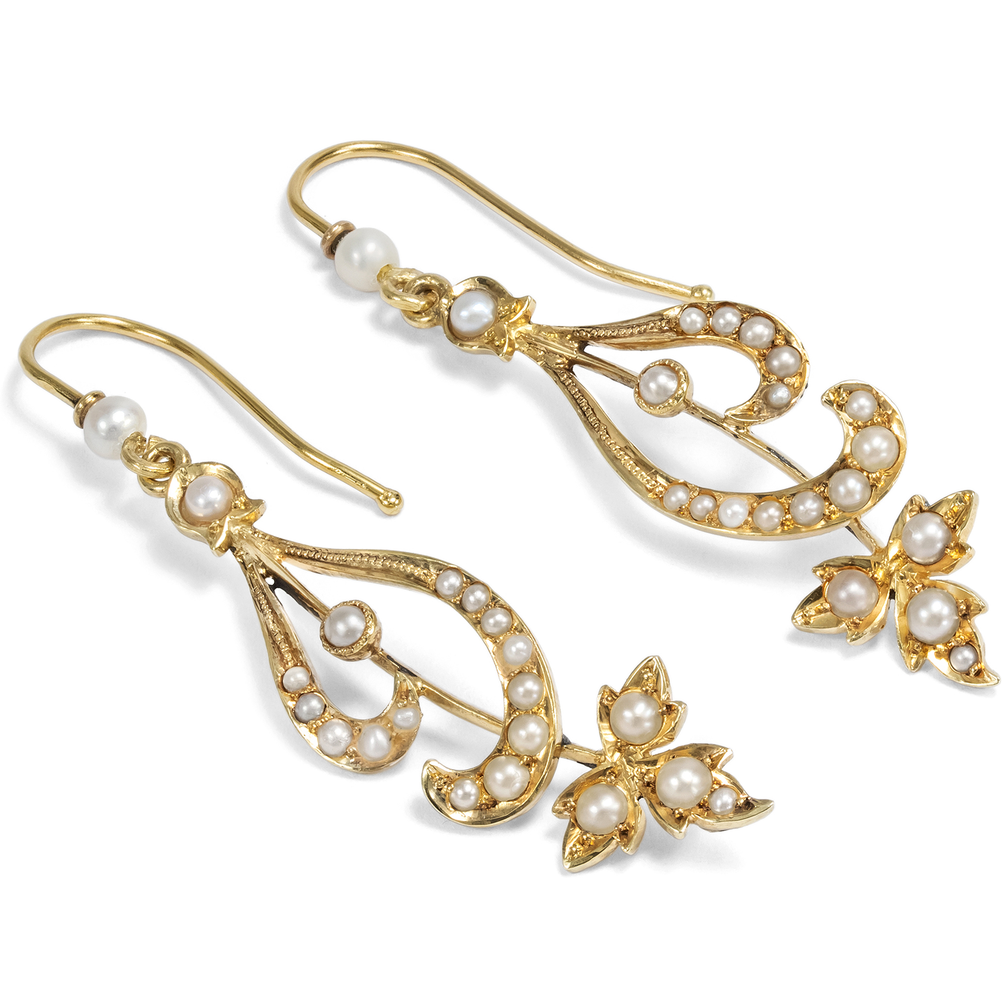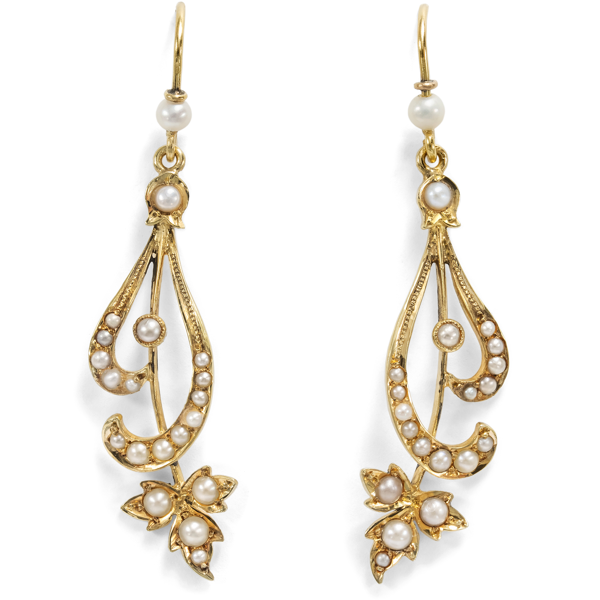 It is in the nature of beautiful objects made from luxurious materials that they are reworked over the generations. What seems indispensable to one generation may seem terribly old-fashioned to the next. As early as 1896, the German ladies' journal Der Bazar wrote: "[...] the true lady of the world in London has almost as much to do with her jeweler as with her milliner. Soon she buys a new piece, soon jewels are set differently because fashion changes, soon she needs a headdress made of luxurious stones, soon diamonds have to be set on a necklace made of velvet - in short, a visit to the jeweler is almost indispensable." The floral elements made of gold and seed pearls, which form the showpieces of these earrings, were created only a few years later. Originally, they were probably elements of a bracelet, as their slight curve suggests. They were then reworked into earrings in more recent times. The simple gold hooks end with a pearl at the top and thus blend harmoniously with the antique elements. We discovered the earrings as they are in London. The floral elements were also created there at the beginning of the 20th century. The quote from Der Bazar, 42nd year 1896, p. 144.