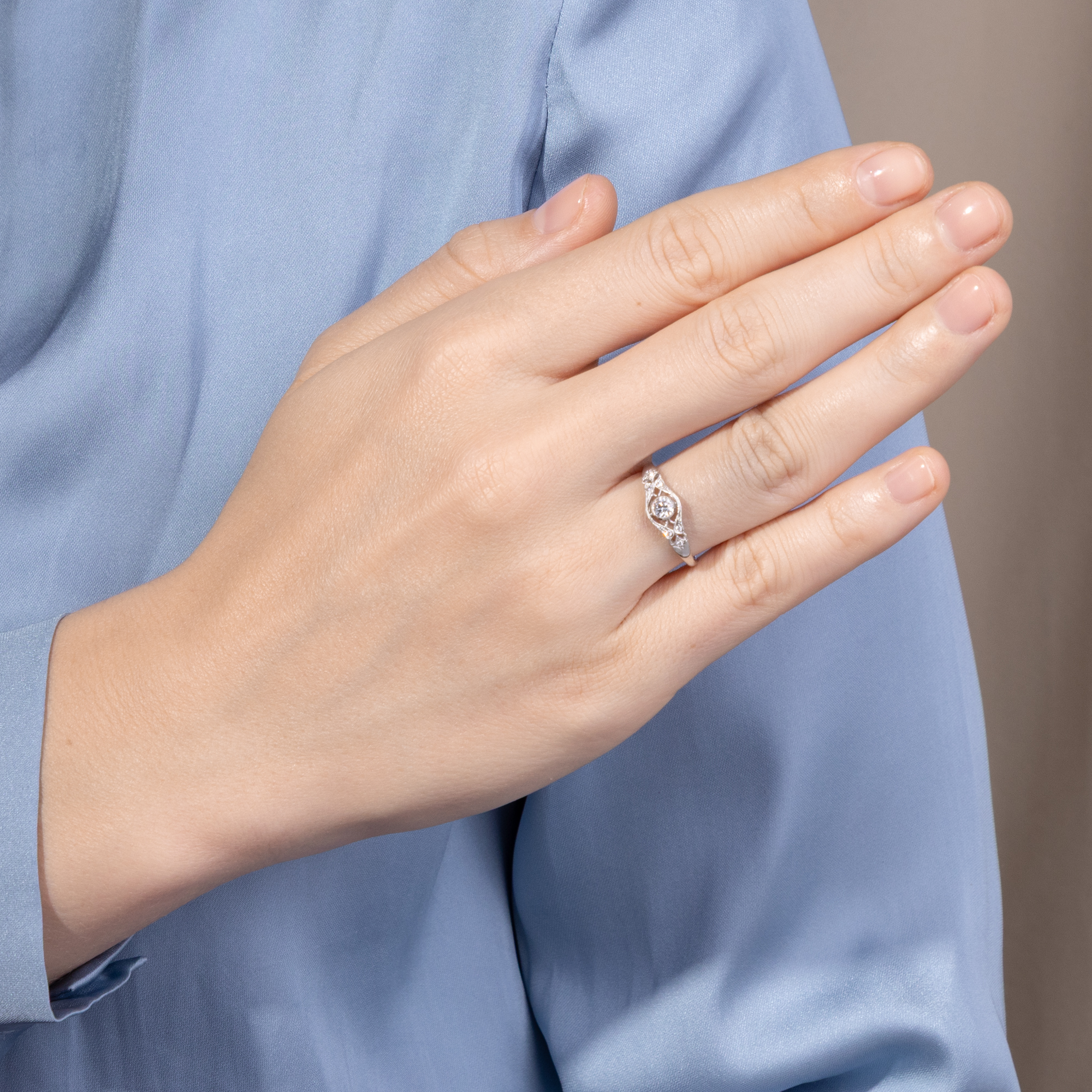 The dilemma of the antique jewellery dealer is often to let go of particularly beautiful pieces of jewellery that have come into our possession only after a long search. Because the hand-forged unique pieces usually exist only once and some jewellery, already sold years ago, sometimes you can not forget and they hang on you. Such a piece of jewellery was a diamond ring of the years around 1905, which had immediately inspired us with its delicate and at the same time elegant design. Therefore, we asked our goldsmith to forge a ring model for us, very similar to the ring we once owned and liked very much. So the ring we have here was created in our workshop. We had it made of high quality white gold, using antique material. Its center is adorned with a wonderful flawless full cut diamond, accompanied by smaller set diamonds. Fine piercing and milgrain decorations divide the surface and give the piece its light elegance. At the same time, they sparkle with every ray of light that strikes the fine surfaces. The ring can be worn every day thanks to its high-quality, insensitive materials and its flat design. It is also available in yellow gold, platinum or rose gold on request. Will the ring also soon become your favorite piece?
