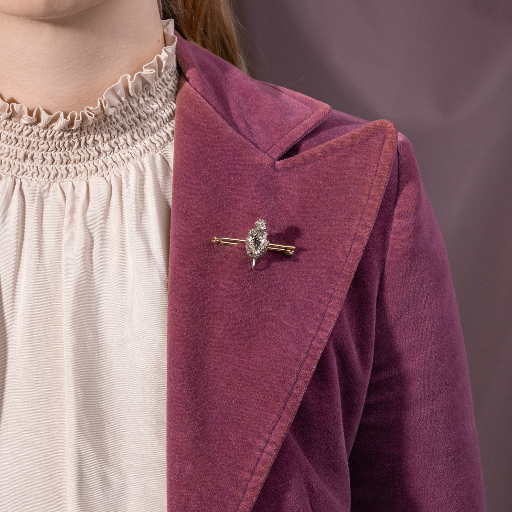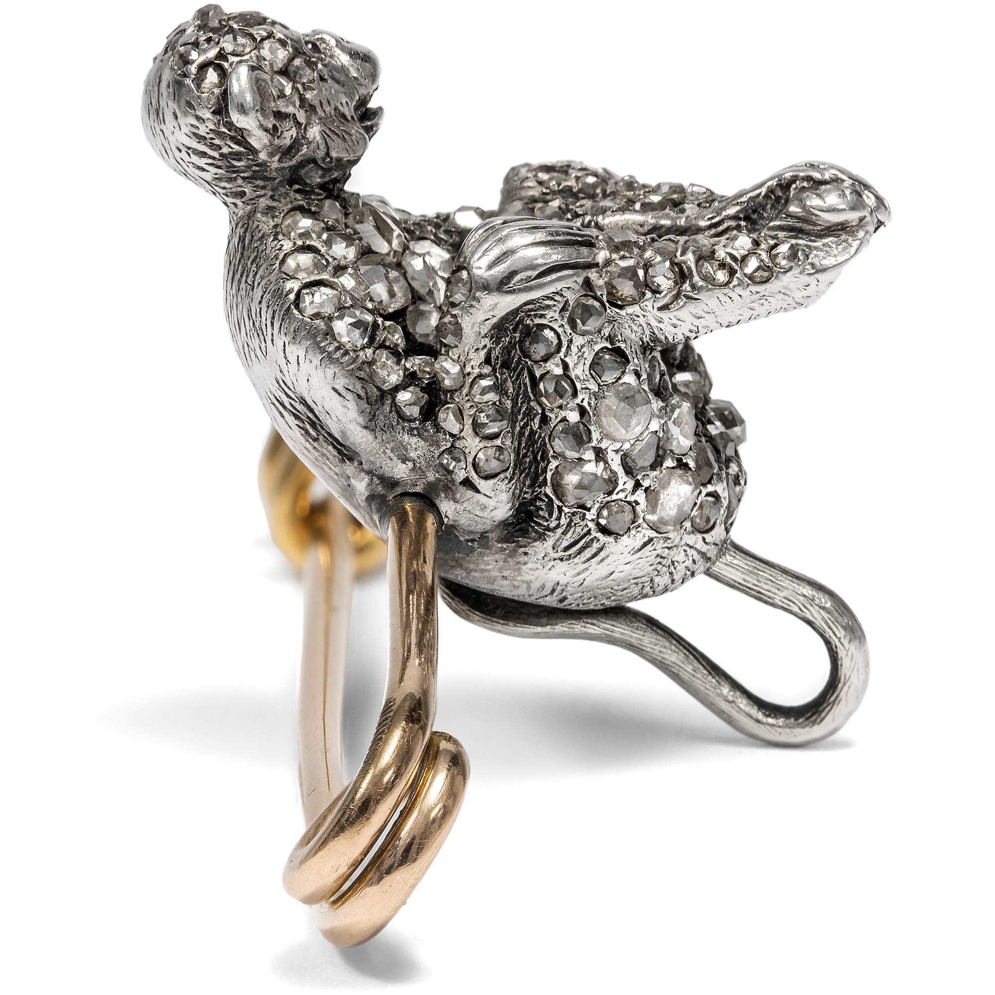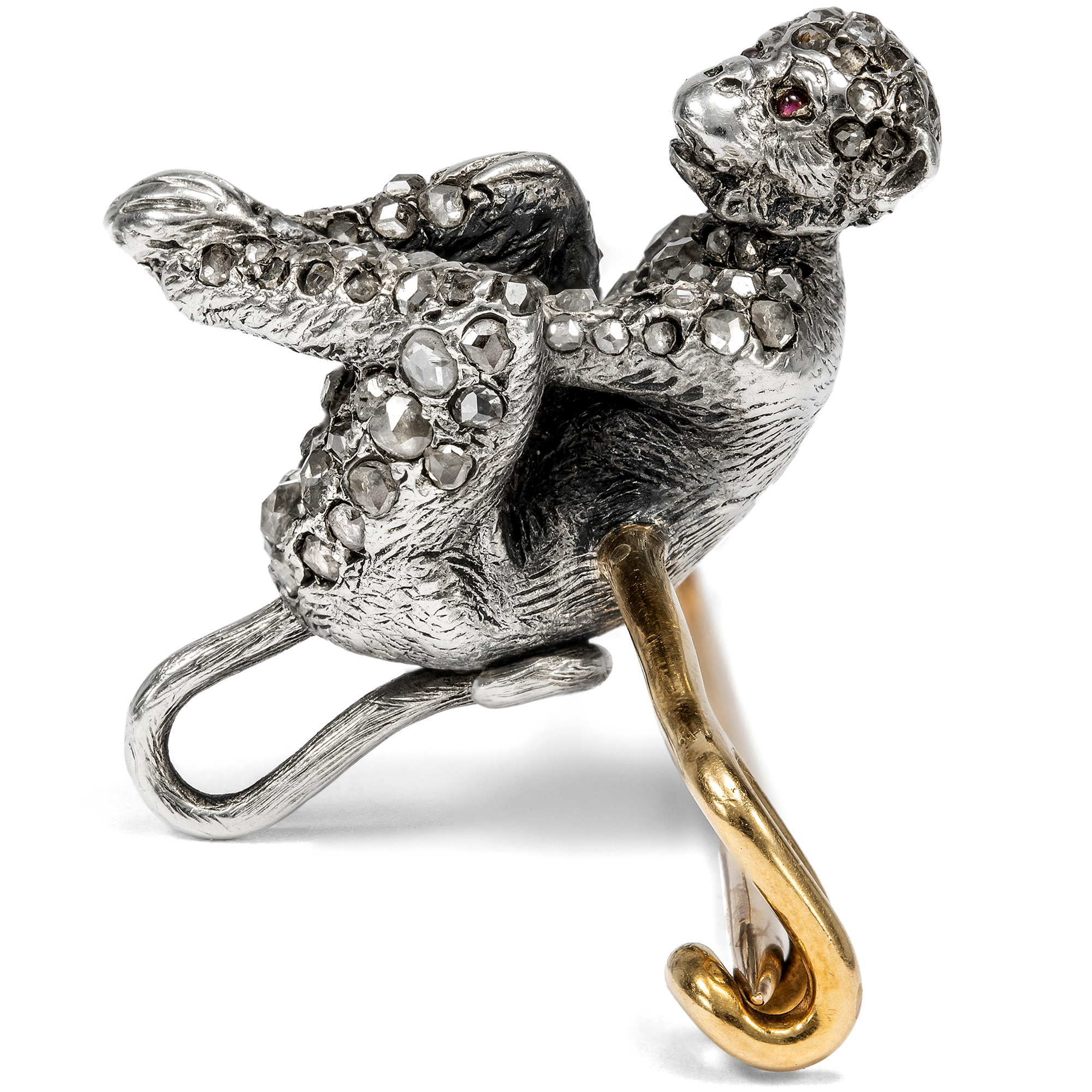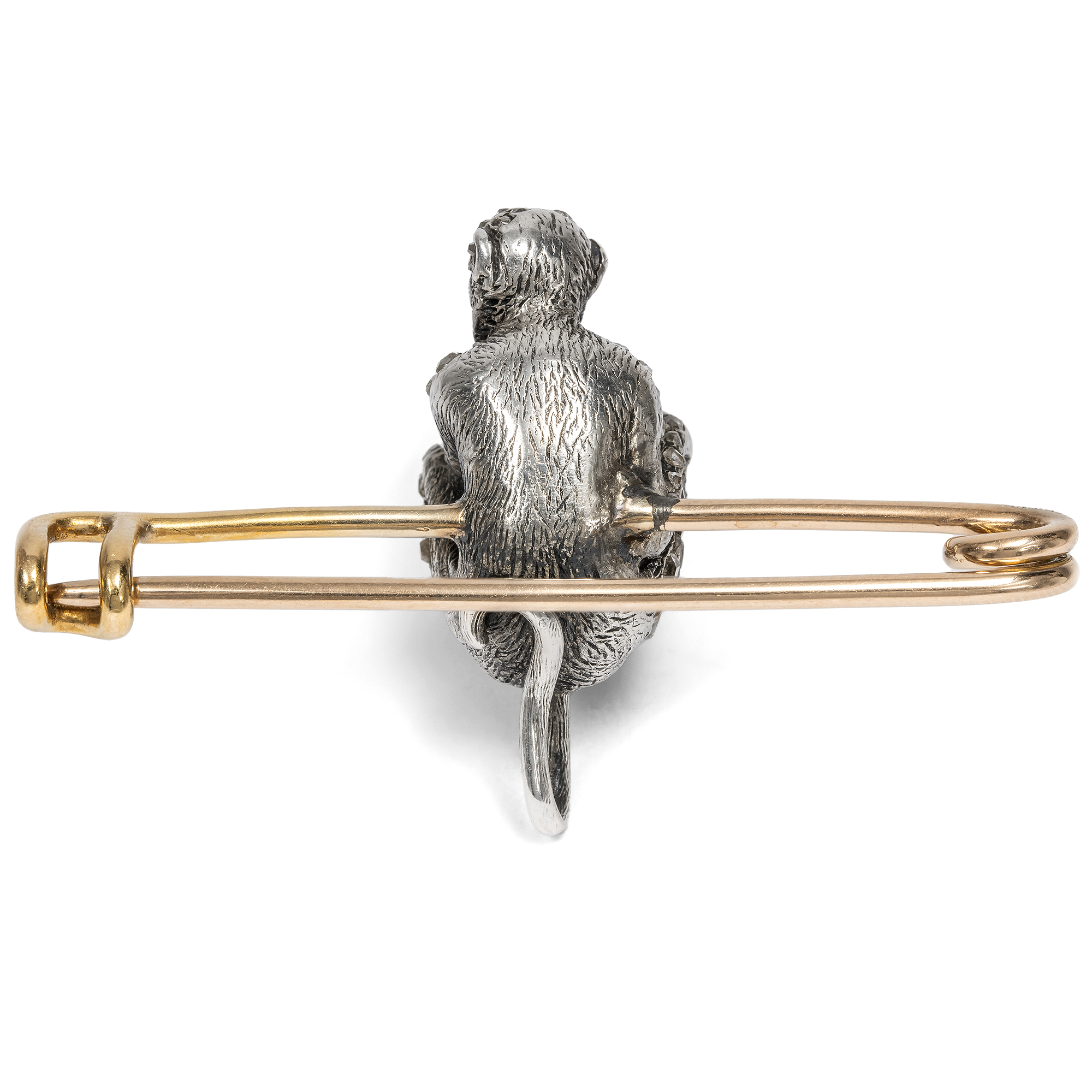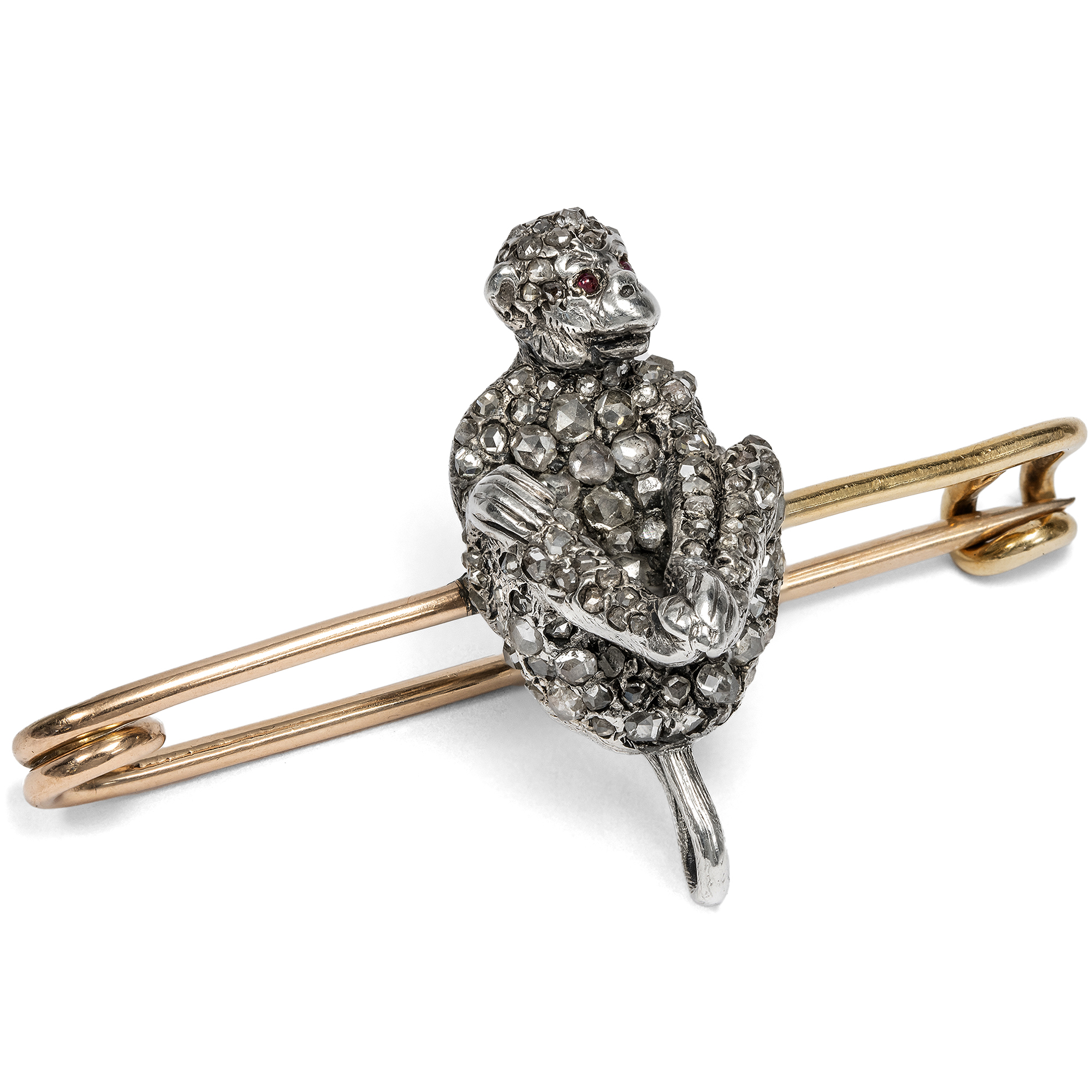 In the second half of the 19th century, a type of jewellery never seen before emerged: so-called "novelty jewellery" caused a sensation with its new, surprising and previously unthinkable shapes and material combinations. All of a sudden, birds settled on swings and became earrings. Many everyday objects found their way onto the lapels of ladies and gentlemen - such as tennis rackets, golf clubs and stamps. The technical world was also reflected in this fashion: machines, automobiles en miniature and the new telephone were surprising focal points. This gold safety pin shows a chimpanzee made of silver and diamonds as a showpiece. The goldsmith used gemstones of different sizes for his design in order to cover the monkey's fur with diamonds. Two small rubies form the animal's eyes. The purpose of brooches like this was to create points of contact for conversation in society. At birthday parties, a brooch with the year of birth of the person being celebrated could be a friendly gesture, while a fox brooch could provide a fitting backdrop for a joint hunting trip. Even skulls with batteries glowing from their eyes were offered to add a macabre yet cheerful accent to a dinner party. You can find out more about this fascinating topic in Charlotte Gere/Judy Rudoe: Jewellery in the Age of Queen Victoria, London 2010, pp. 190-247.