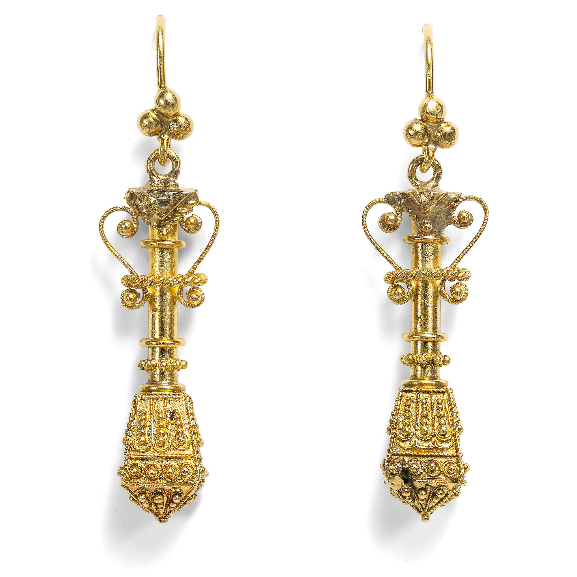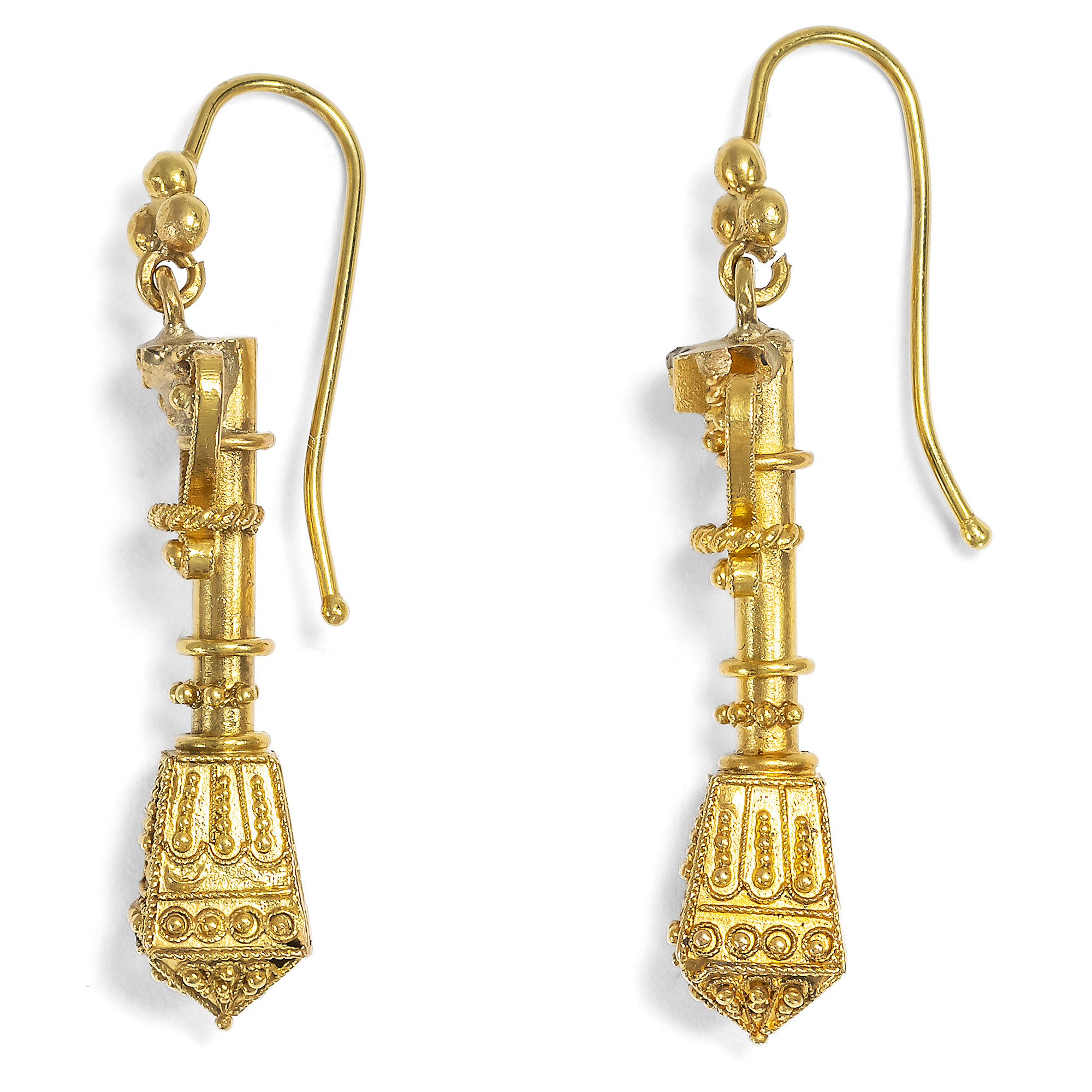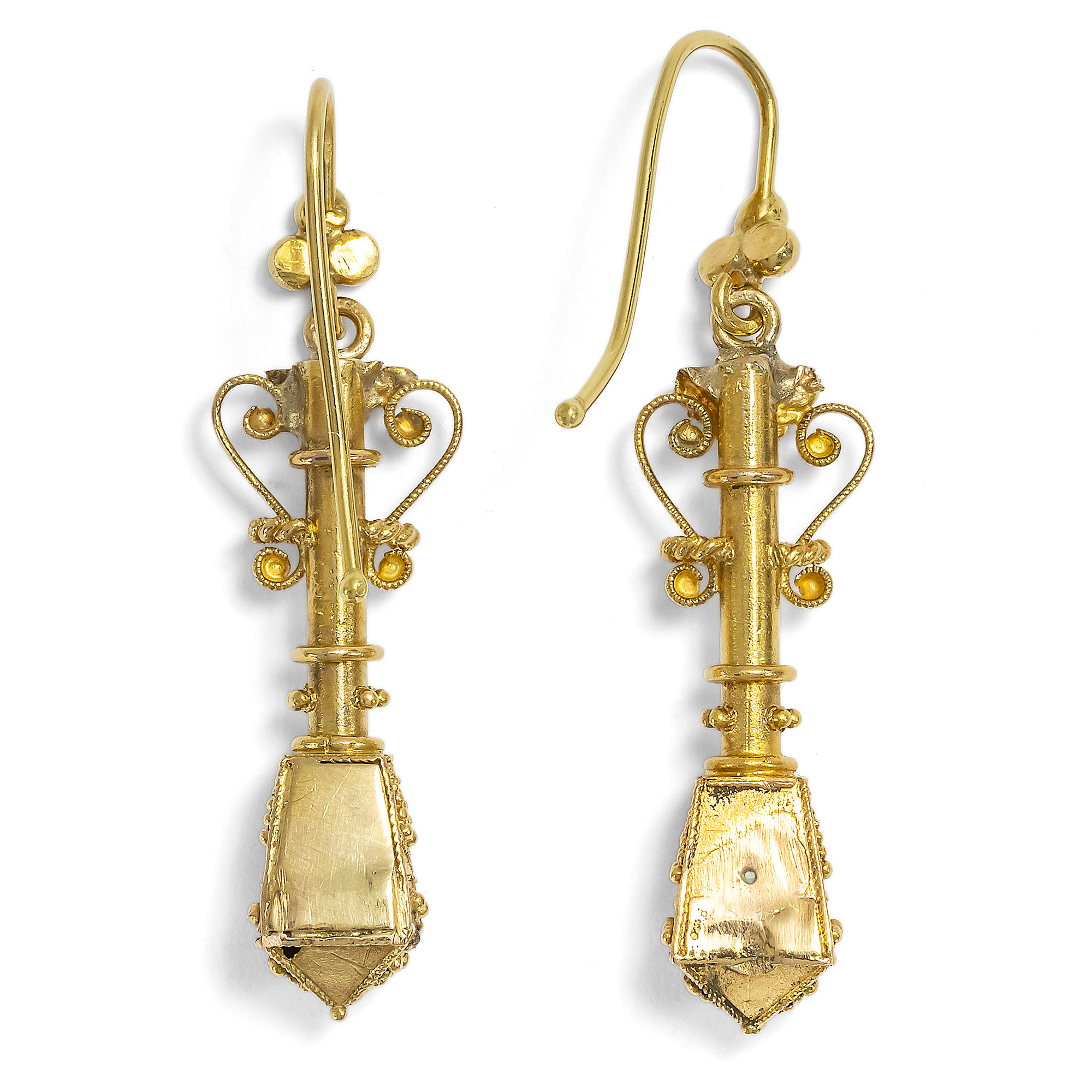 In earlier centuries, jewellery fashions changed very slowly. In the 19th century, however, the pace of change accelerated as the financially stronger bourgeoisie became an important new group of buyers with a hunger for variety. While people at court often wore rather conservative pieces of jewellery, it was the wealthy bourgeoisie and bohemians who wore the latest, sometimes daring creations. In the period around 1870, for example, the jewellery of the ancient Etruscans became fashionable. Some ladies owned antique originals, but the displays of jewelers were also characterized by antique-inspired creations. Characteristics of this style are strong symmetries, soldered small balls of gold, so-called granulations and twisted cords that form ornaments. A contemporary catalog from the London company Streeter from 1870 shows the variety of forms in which such pieces were created at the time, see also online here. We have included the corresponding page in the picture gallery above. This pair of earrings shows all of these stylistic features: Under a simple ear hoop, we find long pendulums that end at the bottom in a kind of lantern with rich trimming of granulations. The earrings shimmer in a warm yellow gold tone. Details of the workmanship on the back reveal that the pendulums were originally part of a larger piece of jewellery, perhaps a necklace with fringes, which were also very fashionable around 1870. Not so long ago, they became the earrings presented here. The ear hoops have been newly added.