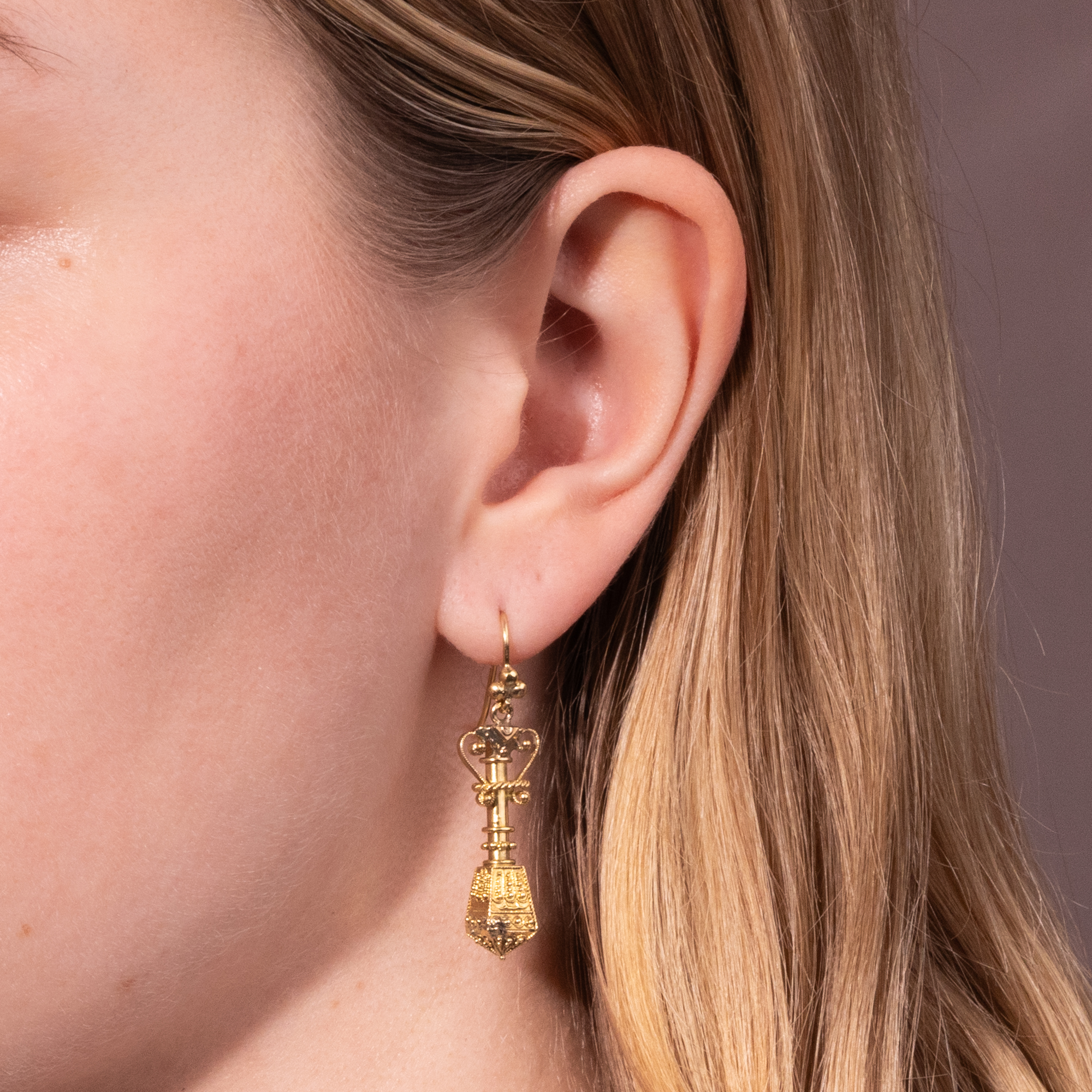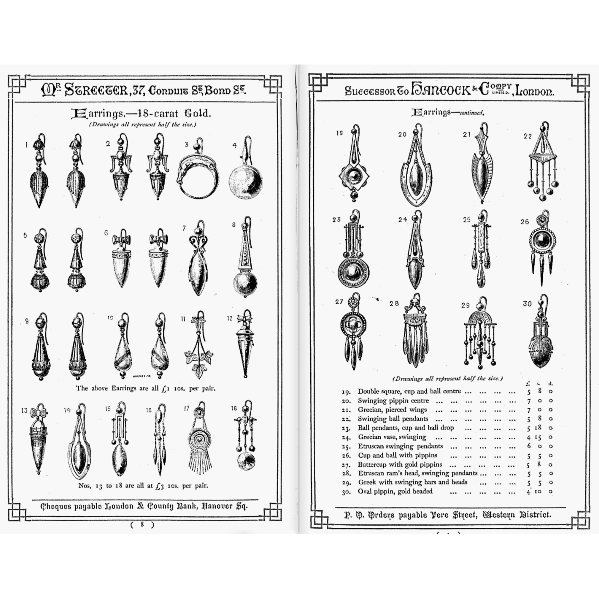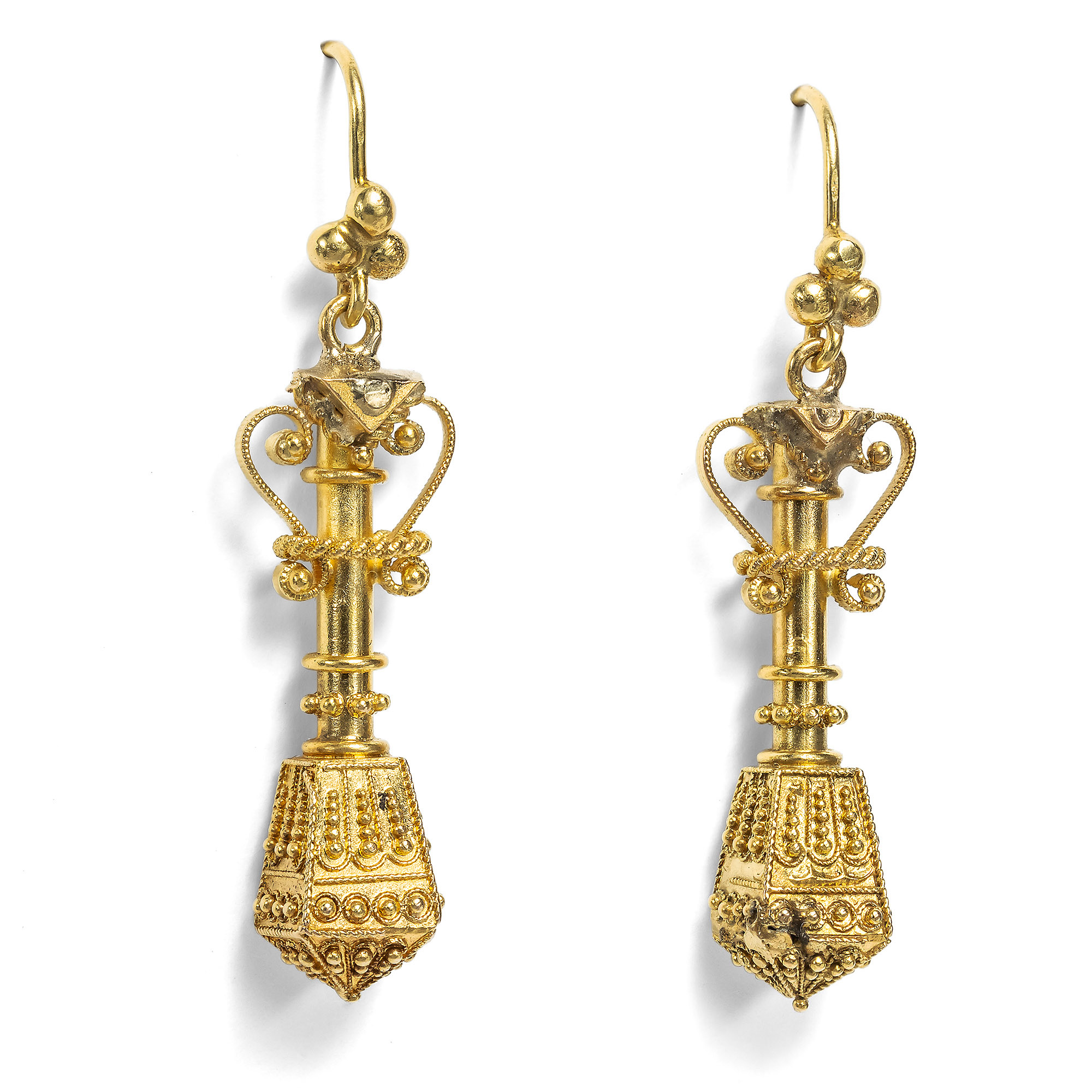 In earlier centuries, jewellery fashions changed very slowly. In the 19th century, however, the pace of change accelerated as the financially stronger bourgeoisie became an important new group of buyers with a hunger for variety. While people at court often wore rather conservative pieces of jewellery, it was the wealthy bourgeoisie and bohemians who wore the latest, sometimes daring creations. In the period around 1870, for example, the jewellery of the ancient Etruscans became fashionable. Some ladies owned antique originals, but the displays of jewelers were also characterized by antique-inspired creations. Characteristics of this style are strong symmetries, soldered small balls of gold, so-called granulations and twisted cords that form ornaments. A contemporary catalog from the London company Streeter from 1870 shows the variety of forms in which such pieces were created at the time, see also online here. We have included the corresponding page in the picture gallery above. This pair of earrings shows all of these stylistic features: Under a simple ear hoop, we find long pendulums that end at the bottom in a kind of lantern with rich trimming of granulations. The earrings shimmer in a warm yellow gold tone. Details of the workmanship on the back reveal that the pendulums were originally part of a larger piece of jewellery, perhaps a necklace with fringes, which were also very fashionable around 1870. Not so long ago, they became the earrings presented here. The ear hoops have been newly added.
