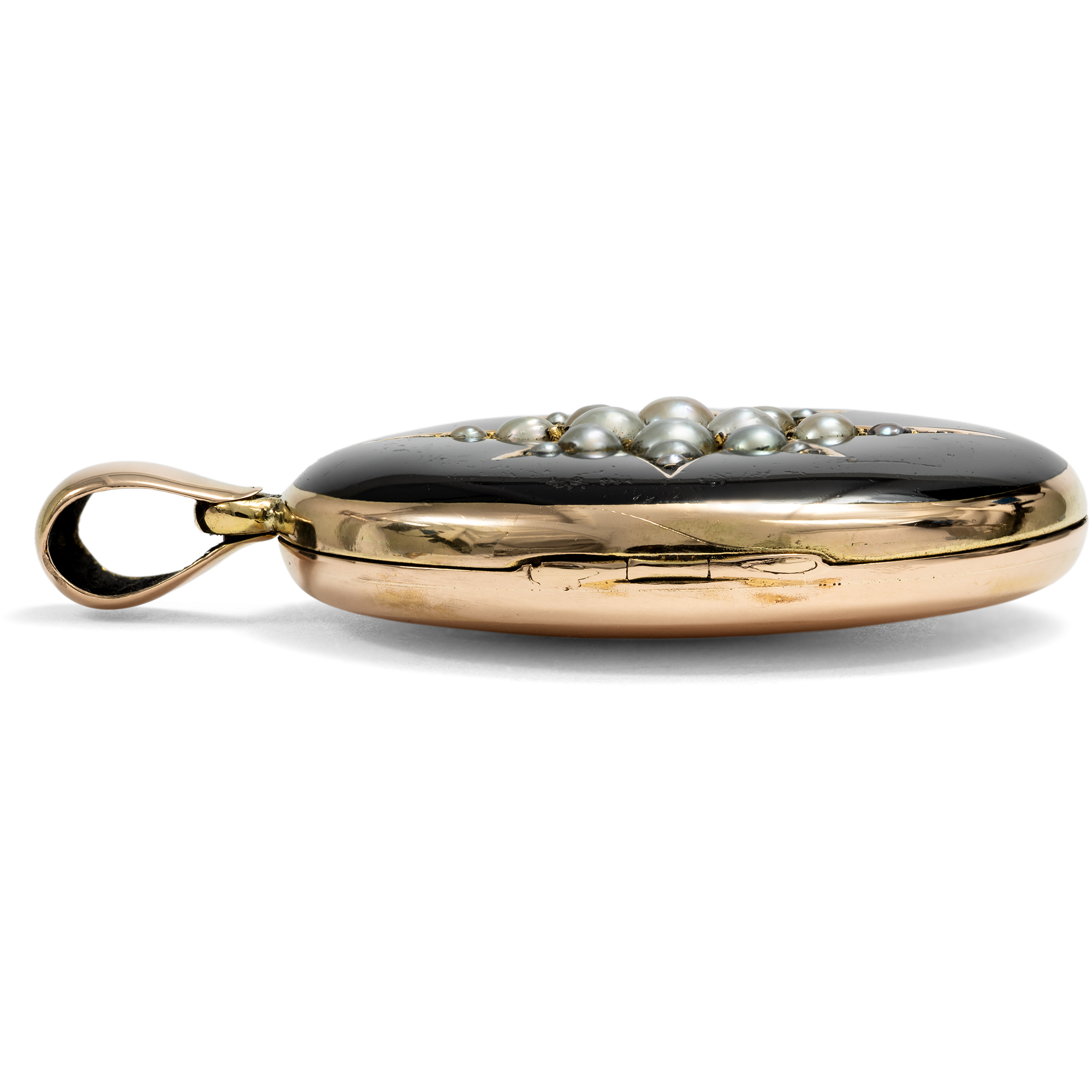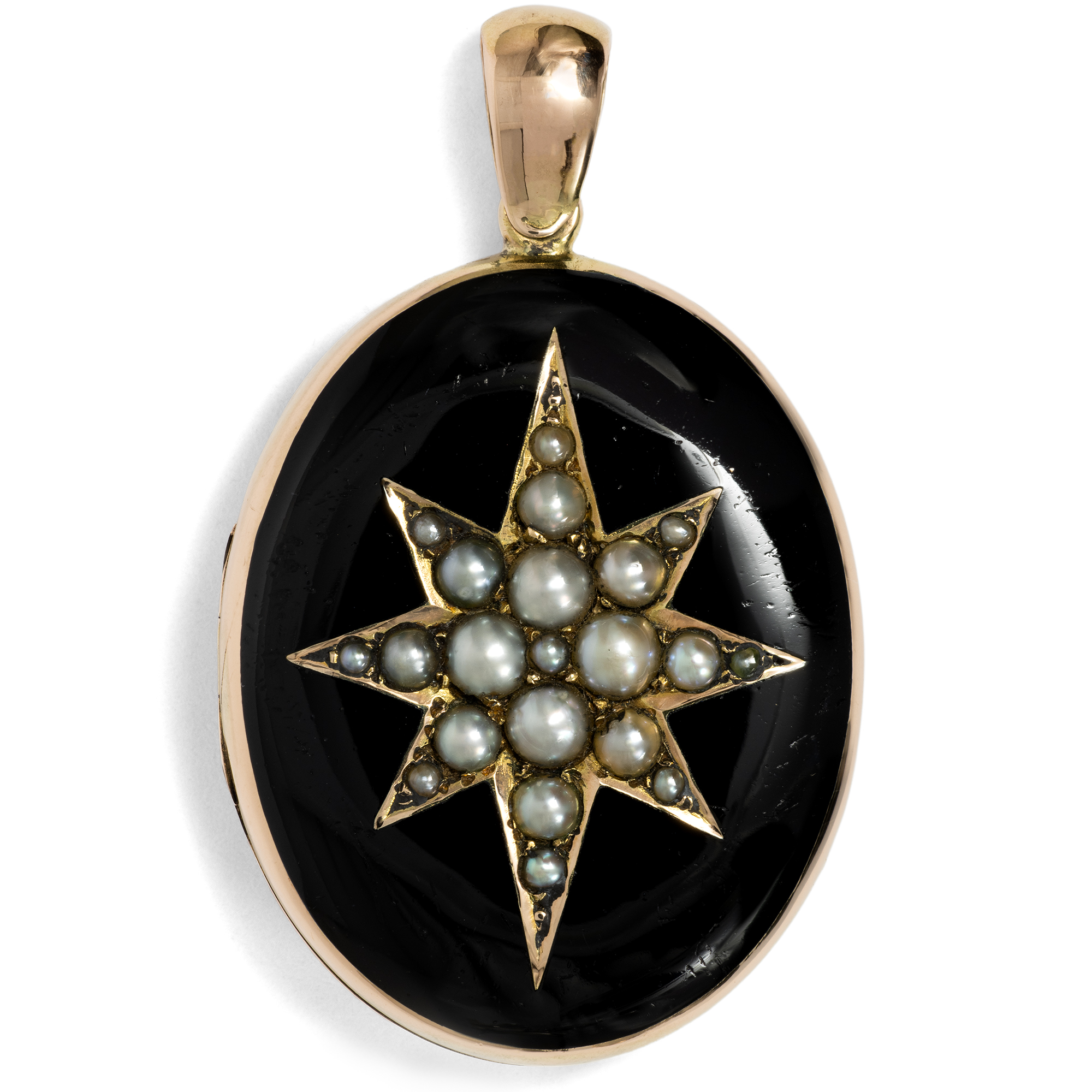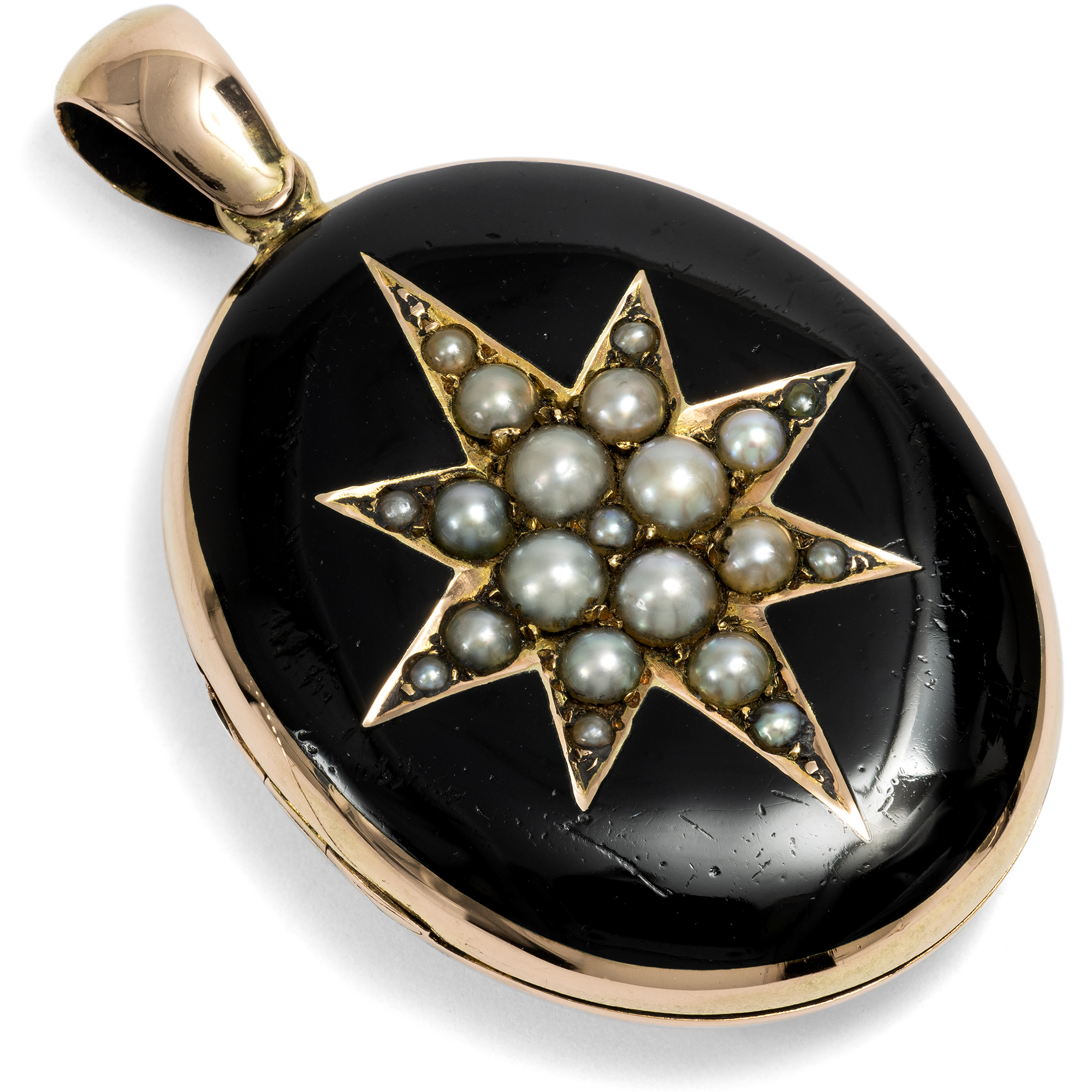 This antique locket pendant came to us from London and is a typical piece of jewellery from the Victorian era. The surface of the oval pendant is enameled in high-gloss black. In the center, a star made of gold and fine natural pearls creates a shimmering accent. The gold and light-coloured pearls stand out wonderfully against the dark background with their velvety-soft luster and shine like a glimmer of hope in the dark night. With its simple design and black colour, the locket is typical mourning jewellery, which was particularly widespread in the second half of the 19th century. In earlier times, pearls were regarded as symbols of mourning; they were seen as frozen tears, but also as signs of everlasting love. In this spirit, the pendant can be opened, and two glazed frames inside it allow mementos of a loved one to be kept safe. The locket is beautifully preserved. Today, detached from convention and regulations, the pendant can also be used as a decorative accessory without sadness. For the dating, see Brigitte Marquardt: Schm Schmuck. Realism and Historicism (1850-1895), Munich/Berlin 1998, p. 231ff, with corresponding lockets of the period.