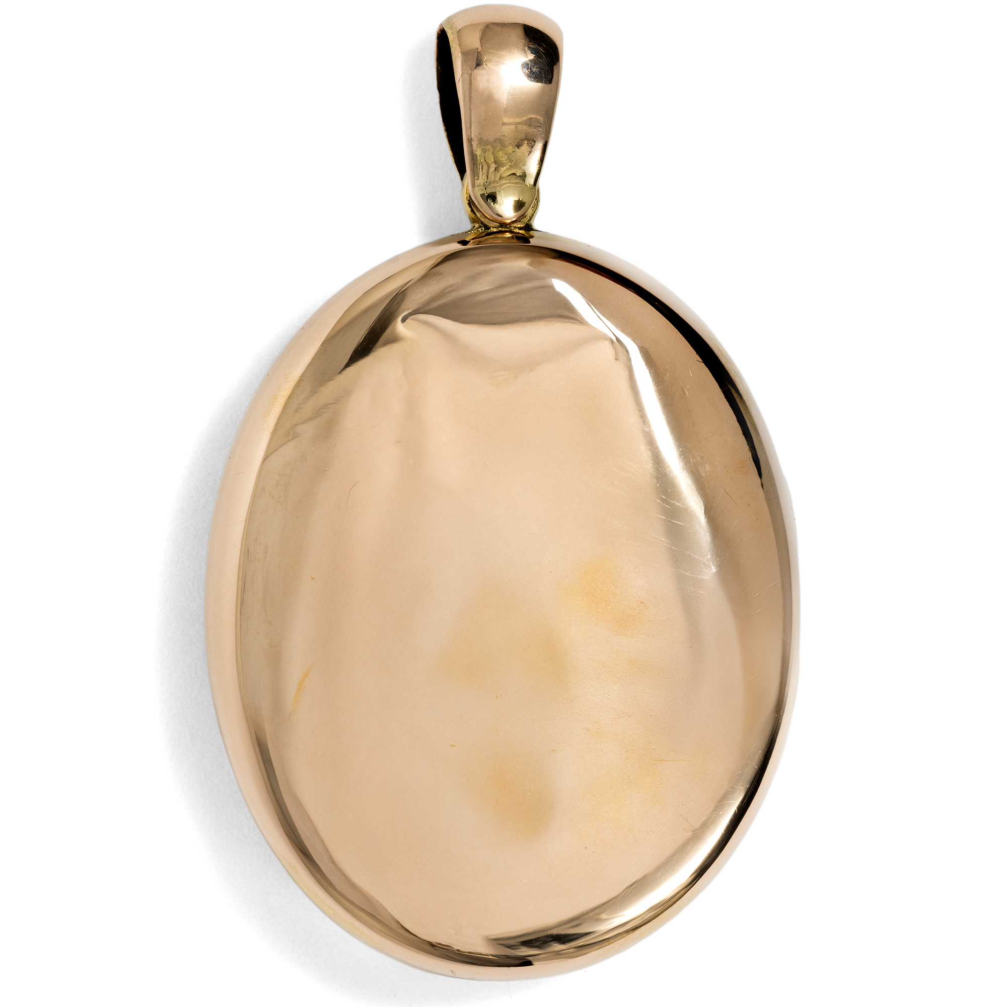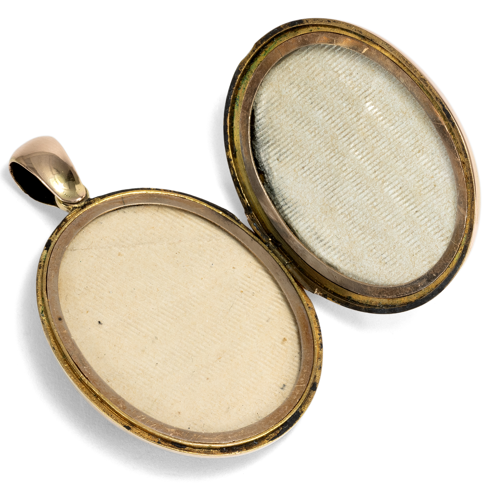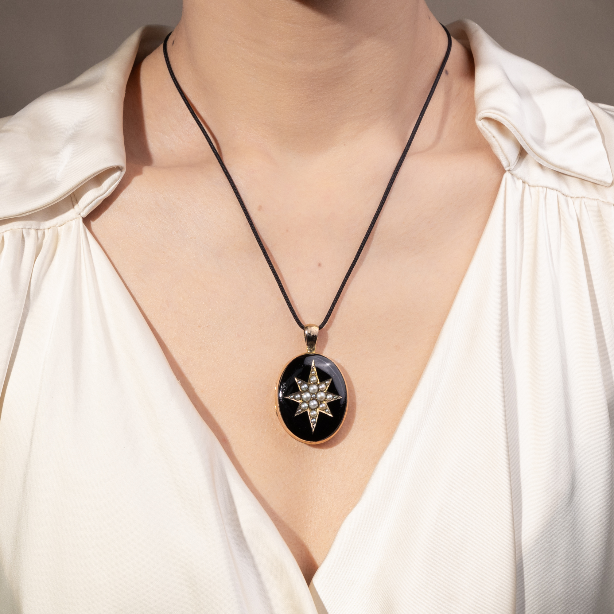 This antique locket pendant came to us from London and is a typical piece of jewellery from the Victorian era. The surface of the oval pendant is enameled in high-gloss black. In the center, a star made of gold and fine natural pearls creates a shimmering accent. The gold and light-coloured pearls stand out wonderfully against the dark background with their velvety-soft luster and shine like a glimmer of hope in the dark night. With its simple design and black colour, the locket is typical mourning jewellery, which was particularly widespread in the second half of the 19th century. In earlier times, pearls were regarded as symbols of mourning; they were seen as frozen tears, but also as signs of everlasting love. In this spirit, the pendant can be opened, and two glazed frames inside it allow mementos of a loved one to be kept safe. The locket is beautifully preserved. Today, detached from convention and regulations, the pendant can also be used as a decorative accessory without sadness. For the dating, see Brigitte Marquardt: Schm Schmuck. Realism and Historicism (1850-1895), Munich/Berlin 1998, p. 231ff, with corresponding lockets of the period.
