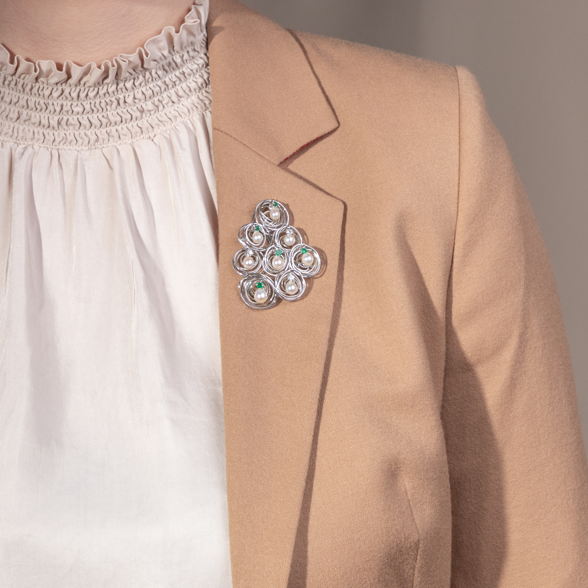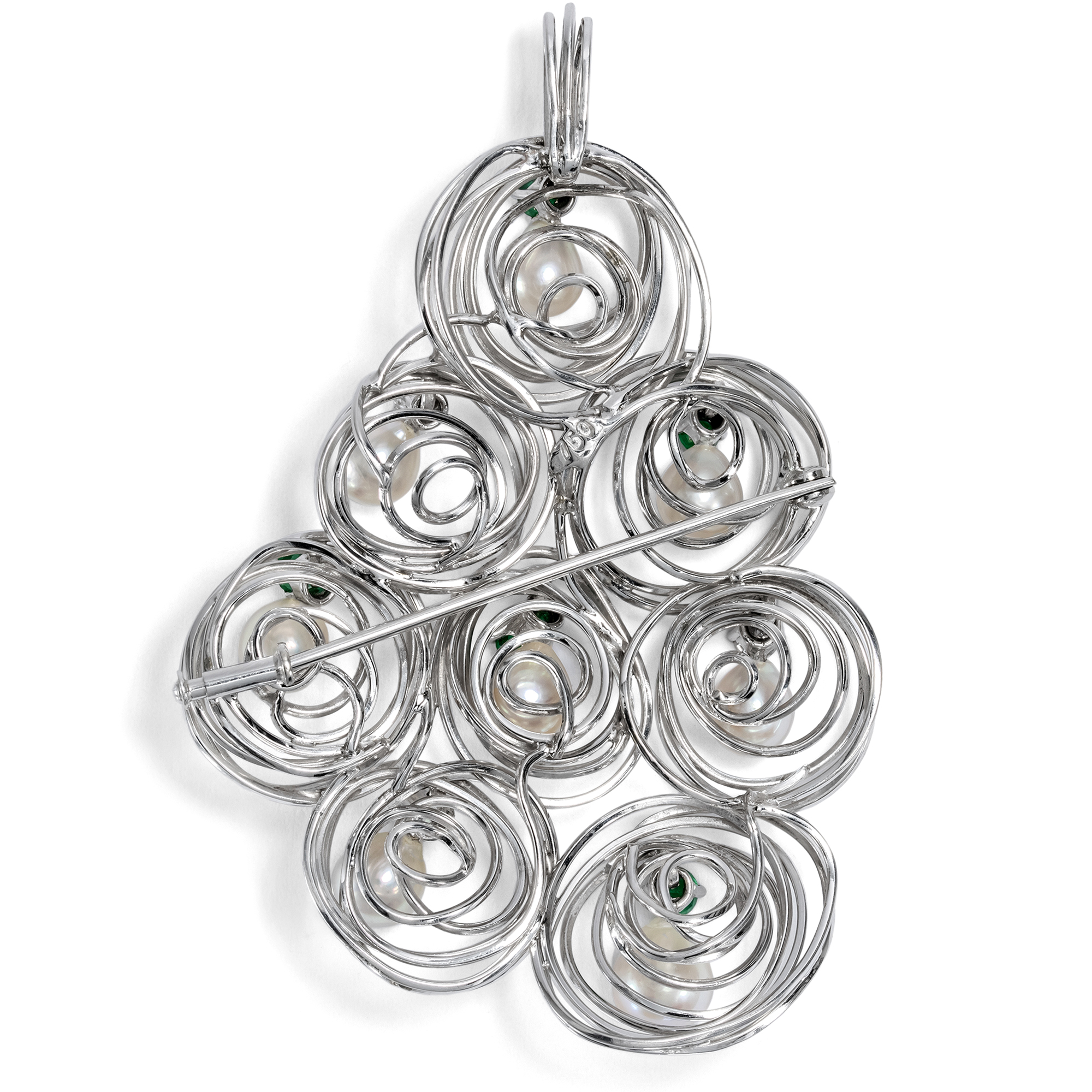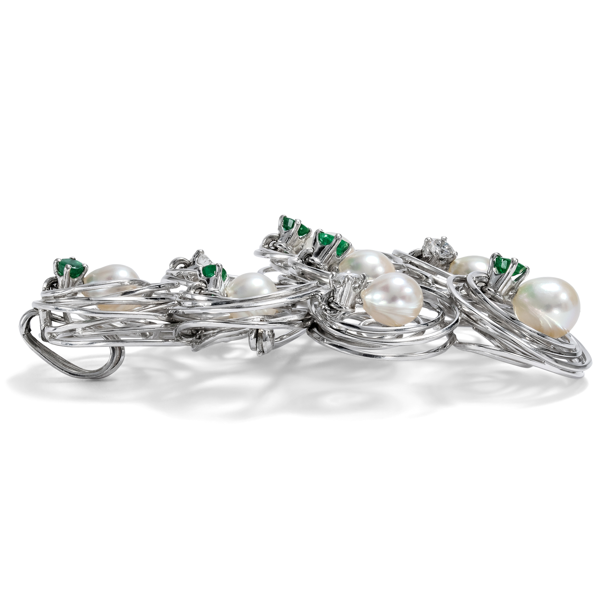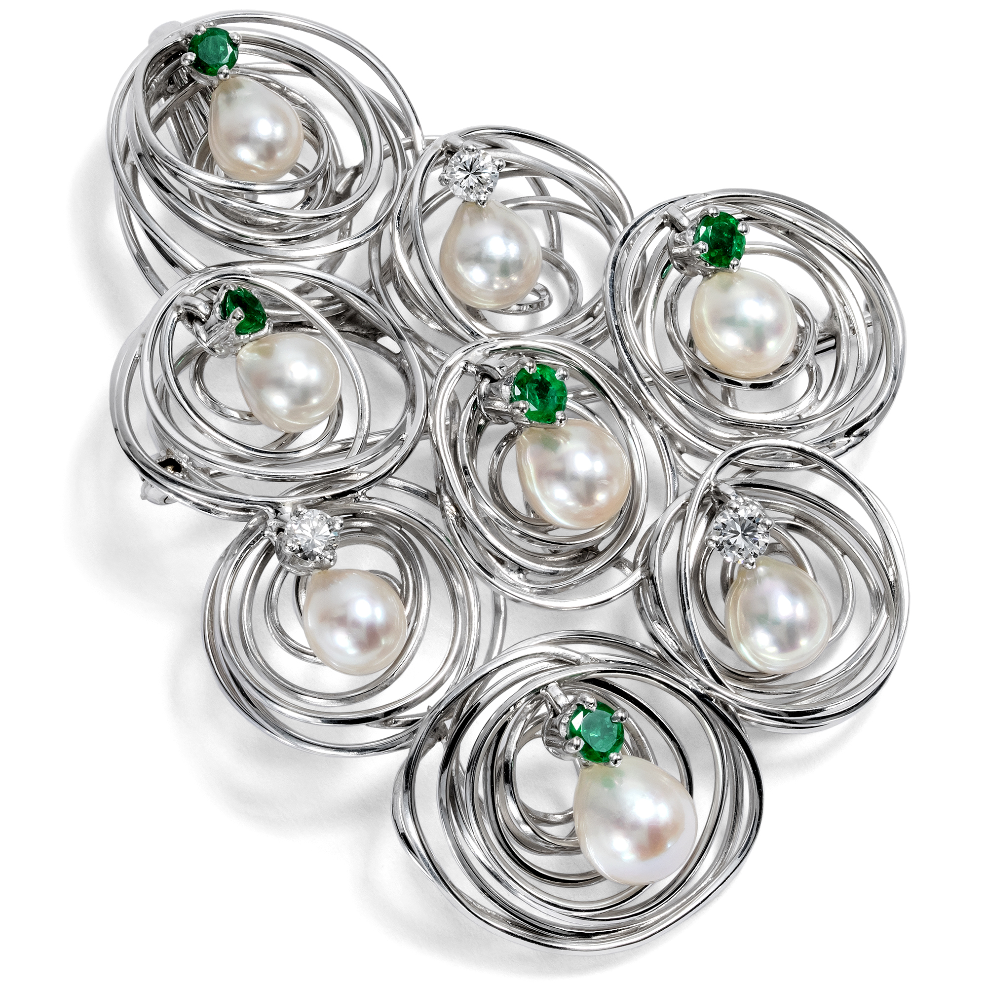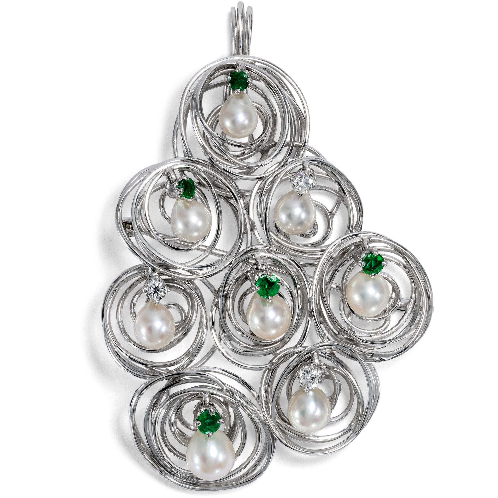 This large jewellery shimmers cool and elegant. Its shape is asymmetrical and is made up of eight individual shapes placed next to each other. The center of each element is a shimmering pearl. Each of the pearls is held by an emerald or a brilliant-cut diamond. Individually hand-bent wires made from high-carat white gold form small nests in and in front of which the pearls have found their place. However, the real special feature, the highlight and the most surprising peculiarity of this piece of jewellery is not revealed in the photograph and even the description can only offer a glimpse: Because each of the beads is mounted to move and with every movement the beads sway slightly back and forth, the whole piece of jewellery virtually vibrates with dynamism. And so the pendant, which can also be worn as a brooch, always remains the same and yet never looks the same as it did just a moment ago. In the years shortly after 1900, jewellery with movable beads regularly appeared in the form of large, round "plaque" pendants. The design idea then disappeared again in the 1920s and only returned in the 1960s in the wake of kinetic art. It was a time of new beginnings in society and art, of joy for the future and progress in all areas. This piece of jewellery clearly breathes this zeitgeist: it is light, cheerful, elegant and clearly modern. Another beautiful detail is that the piece of jewelry can be worn both as a brooch and as a pendant. Judging by its hallmarks, the piece of jewellery was most likely made in Germany. Its design language and workmanship, its first-class preservation and its charming idea of bringing movement into the piece of jewellery allow us to date it to around 1970.