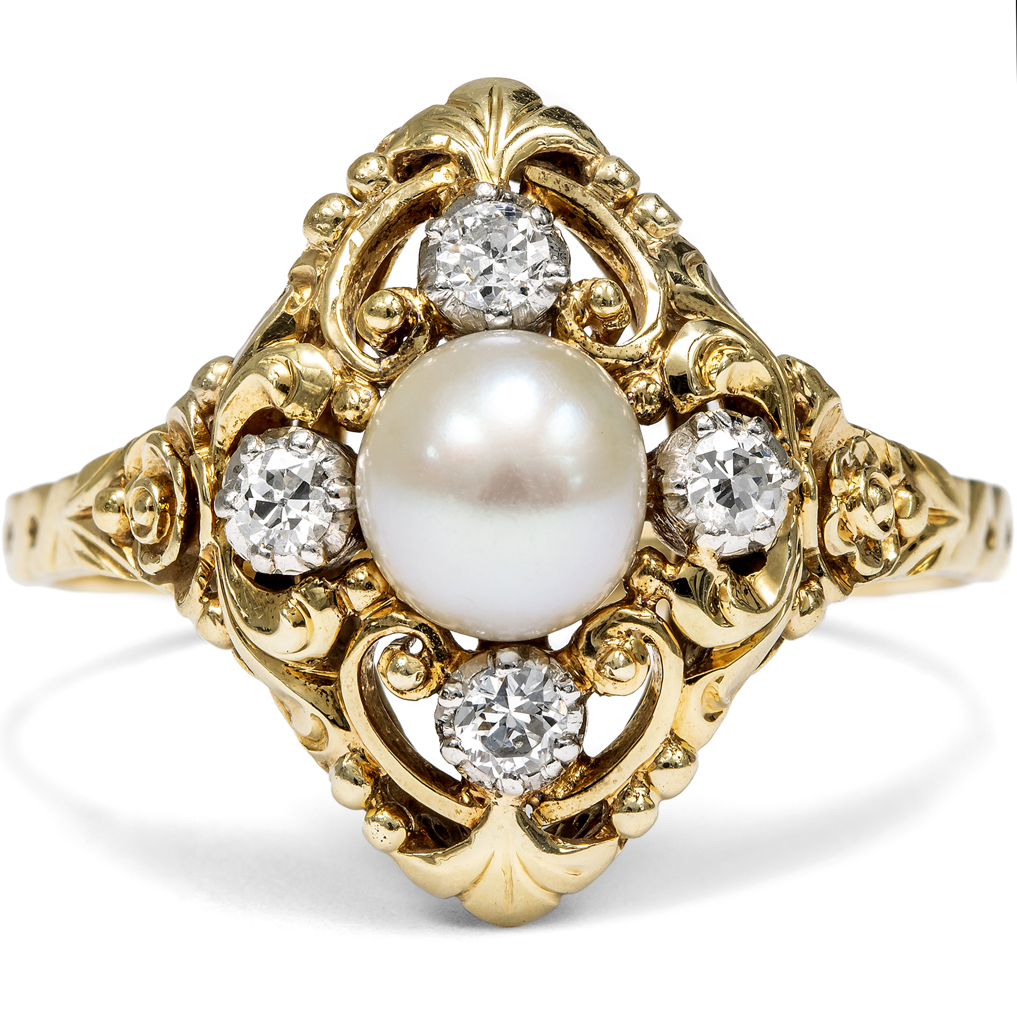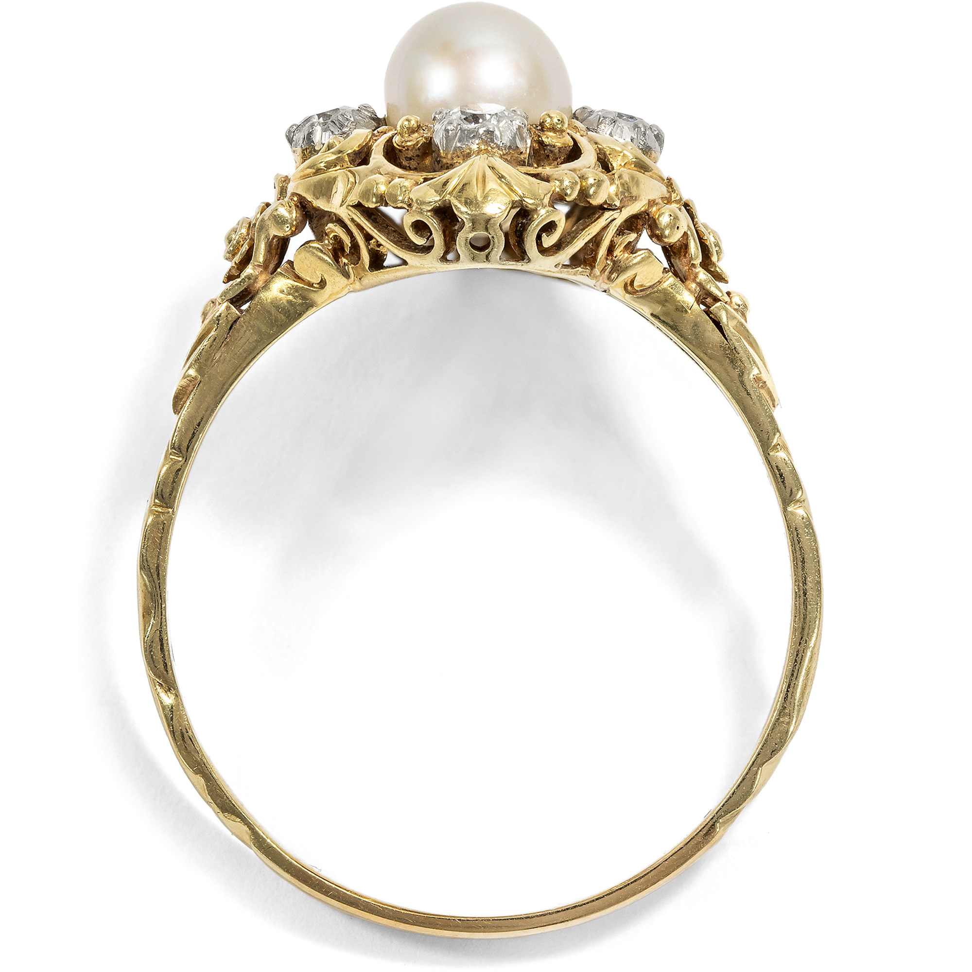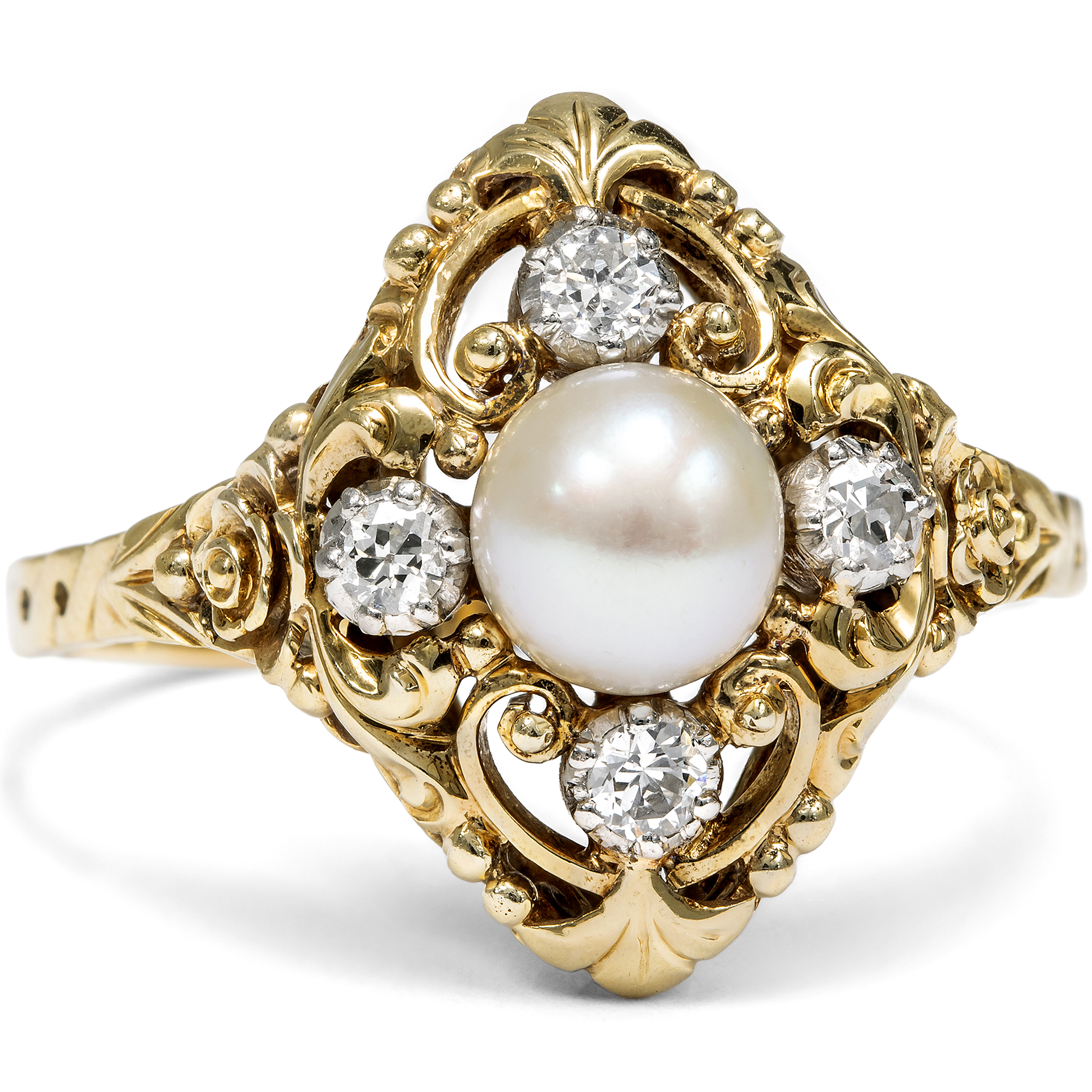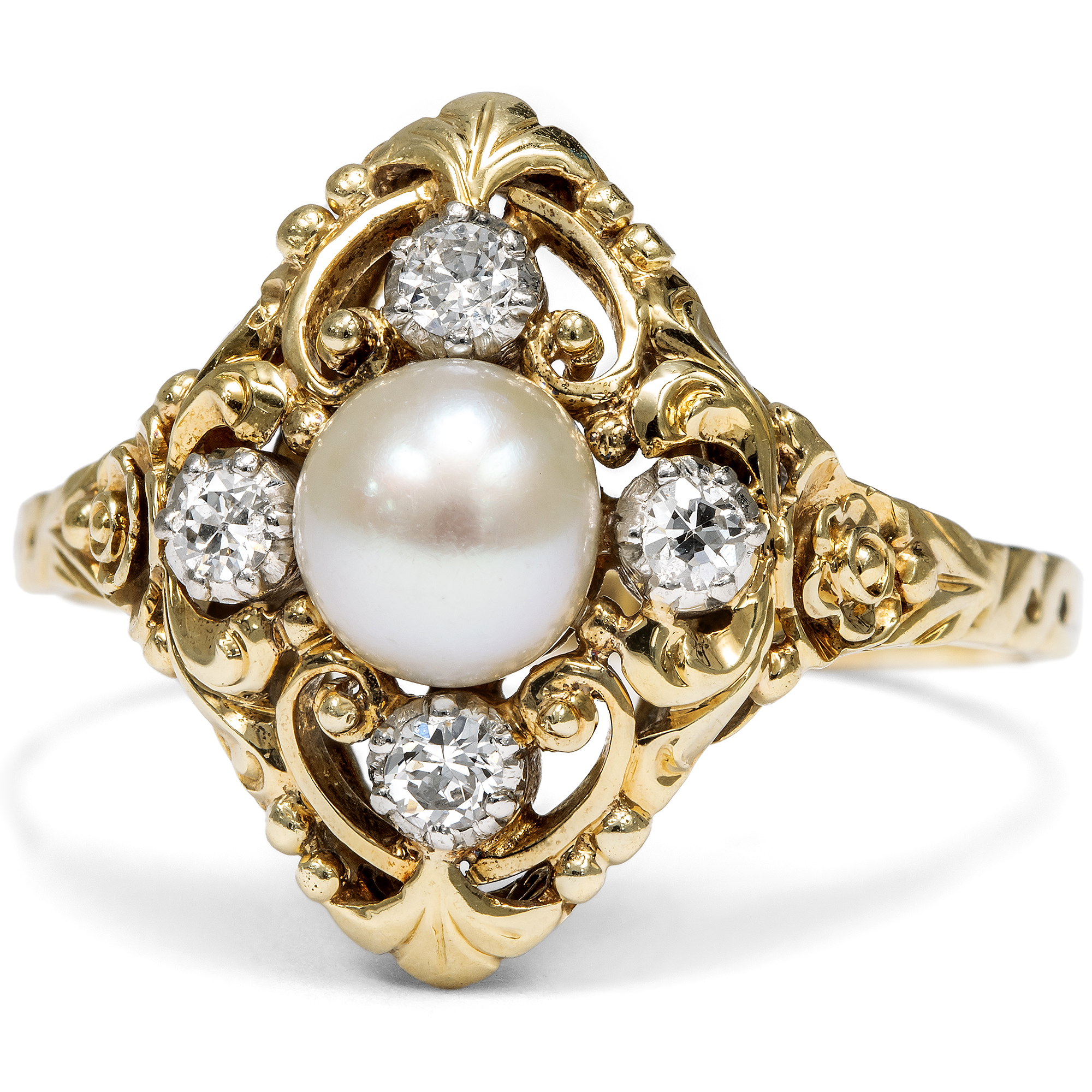 A creamy white pearl shimmers in the center of this ring. It is accompanied by four sparkling old-cut diamonds and elegantly curved arches of gold. Together, they create a charming interplay of warmth and cool brilliance. But it is not just the gemstones and metal that create the impression: small shadow spaces are created in the openworked sections of the ring, which enhance the brilliance of the stones and turn the design into a lively composition of light and dark. The ring was created in the 1930s, a time when aesthetic sensibilities were undergoing major changes. While early Art Deco still had a preference for strict white gold and cool geometry, the need for warmth and fullness was now growing. Yellow gold returned to jewelry design, and with it a new delight in ornament and detail. In Germany, there was also a sentimental memory of the Biedermeier period, which experienced a real renaissance in detailed forms. These trends are also reflected in this piece of jewellery. The goldsmith's work is richly decorated, but at the same time light and flexible in its expression. Finely curved rocailles and forms reminiscent of floral motifs draw on historical styles such as Rococo and Biedermeier, but not in the sense of mere imitation; rather, they are reinterpreted in a way that combines tradition and modernity. This ring is a fascinating companion that still surprises every time you look at it. It found its way to us here in Berlin and has a large ring width, which we are happy to adjust.