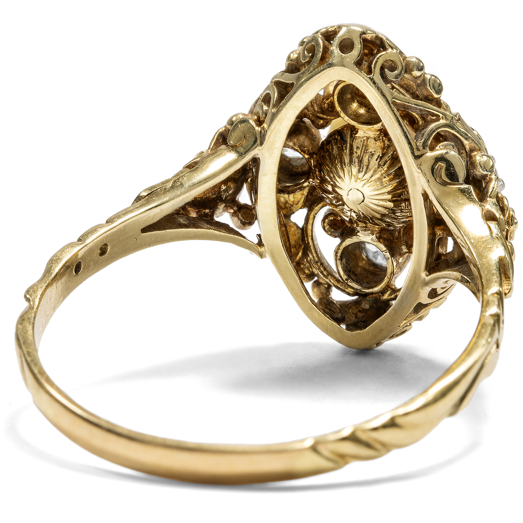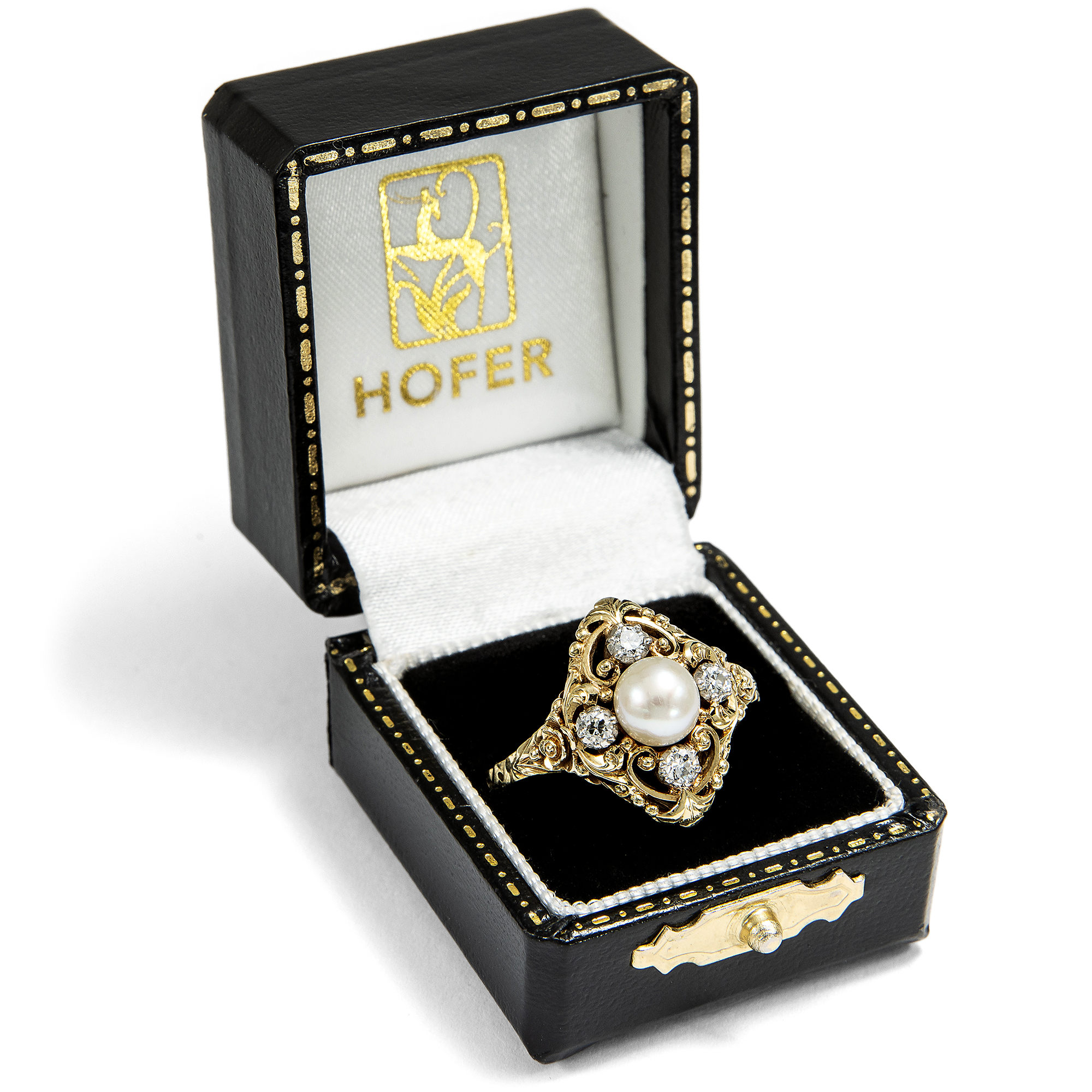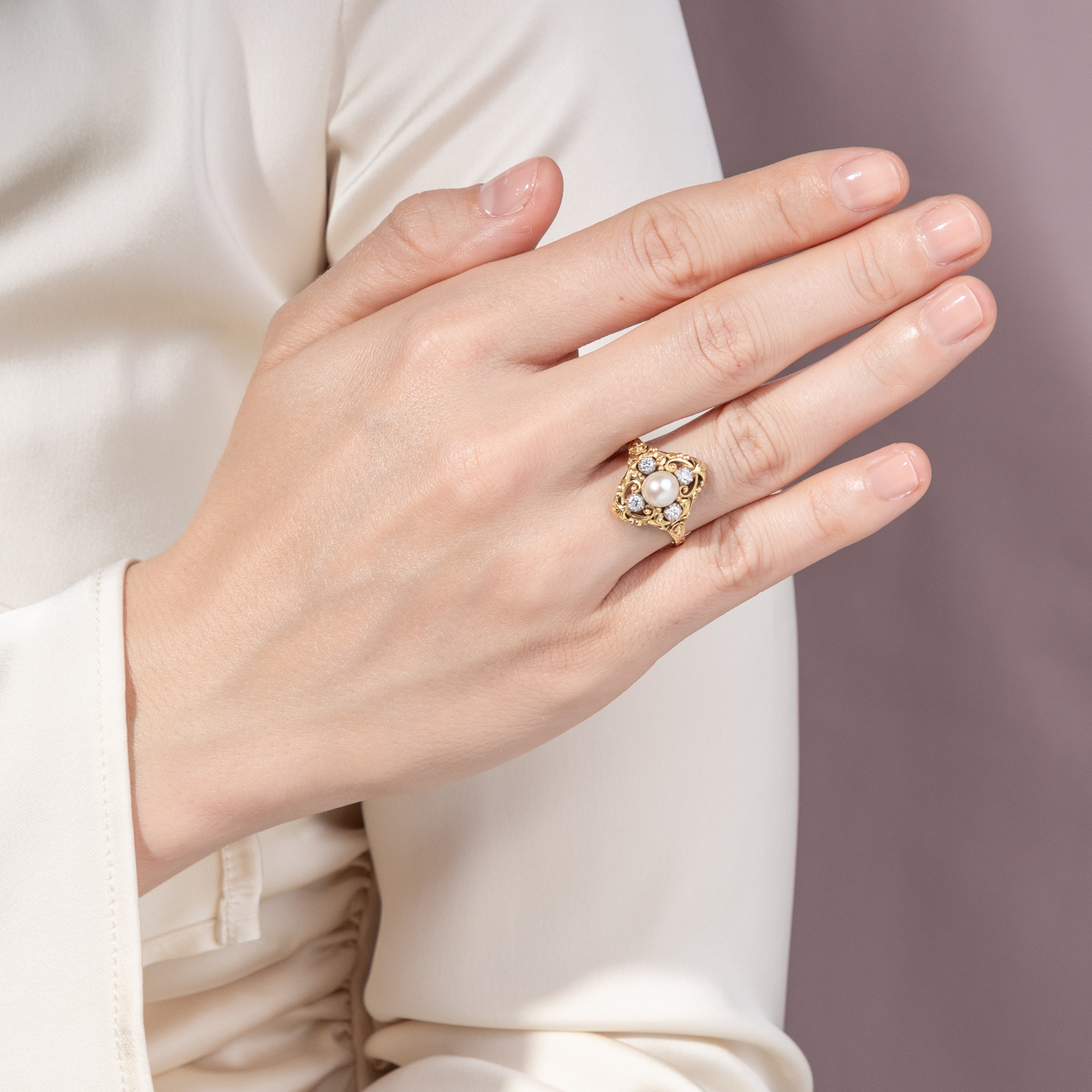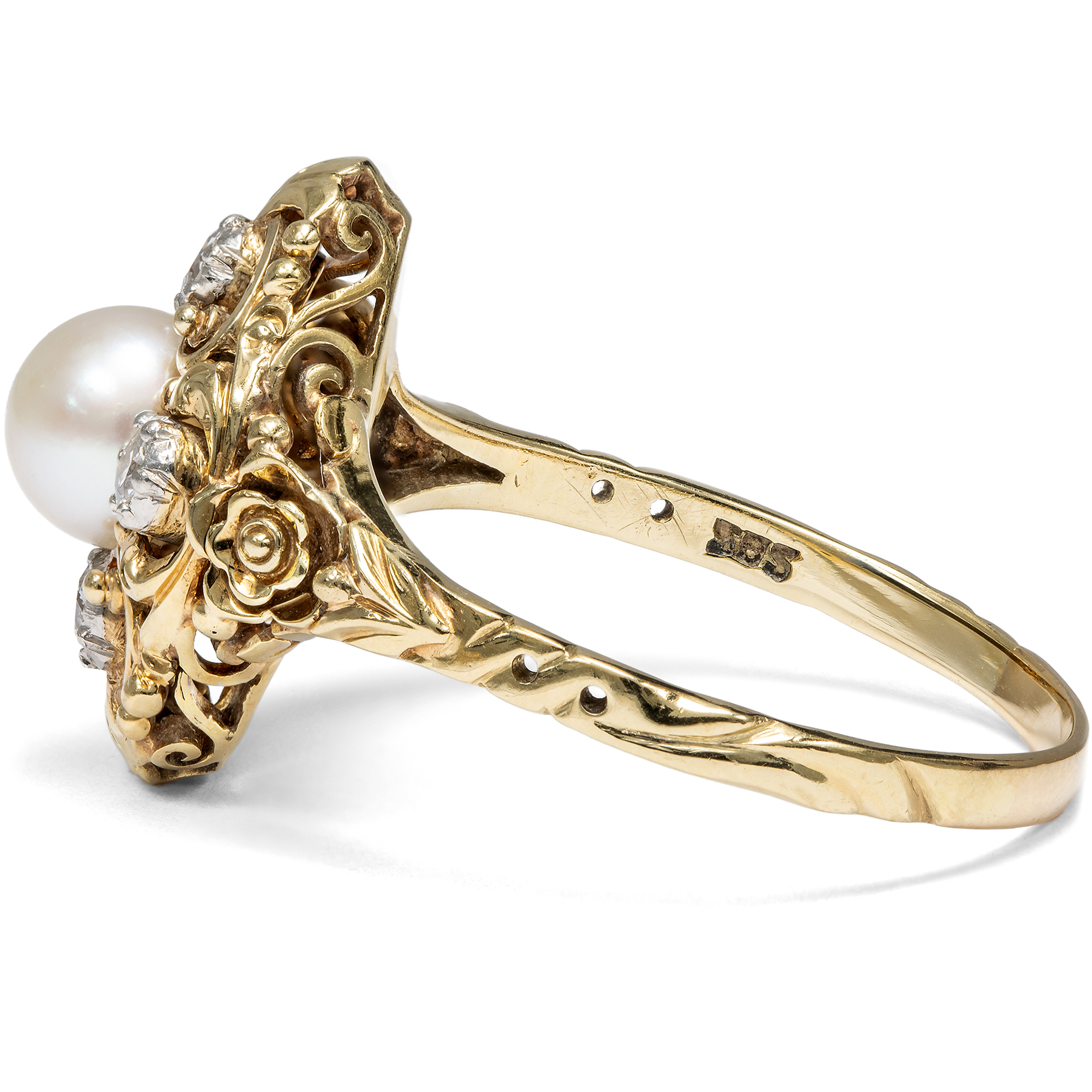 A creamy white pearl shimmers in the center of this ring. It is accompanied by four sparkling old-cut diamonds and elegantly curved arches of gold. Together, they create a charming interplay of warmth and cool brilliance. But it is not just the gemstones and metal that create the impression: small shadow spaces are created in the openworked sections of the ring, which enhance the brilliance of the stones and turn the design into a lively composition of light and dark. The ring was created in the 1930s, a time when aesthetic sensibilities were undergoing major changes. While early Art Deco still had a preference for strict white gold and cool geometry, the need for warmth and fullness was now growing. Yellow gold returned to jewelry design, and with it a new delight in ornament and detail. In Germany, there was also a sentimental memory of the Biedermeier period, which experienced a real renaissance in detailed forms. These trends are also reflected in this piece of jewellery. The goldsmith's work is richly decorated, but at the same time light and flexible in its expression. Finely curved rocailles and forms reminiscent of floral motifs draw on historical styles such as Rococo and Biedermeier, but not in the sense of mere imitation; rather, they are reinterpreted in a way that combines tradition and modernity. This ring is a fascinating companion that still surprises every time you look at it. It found its way to us here in Berlin and has a large ring width, which we are happy to adjust.