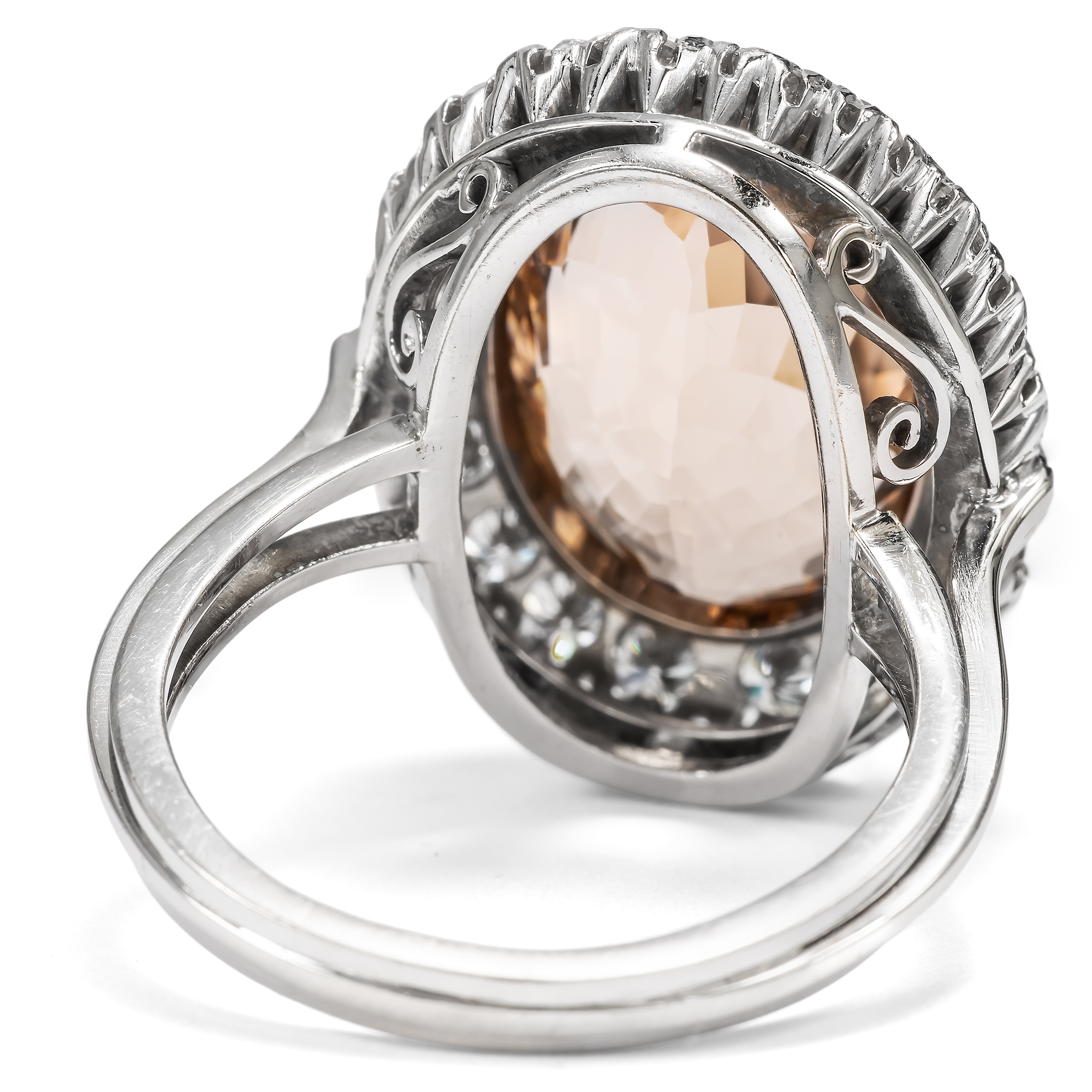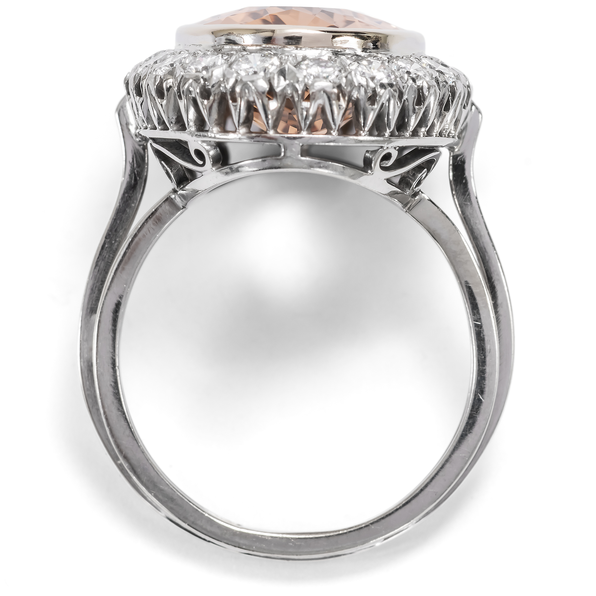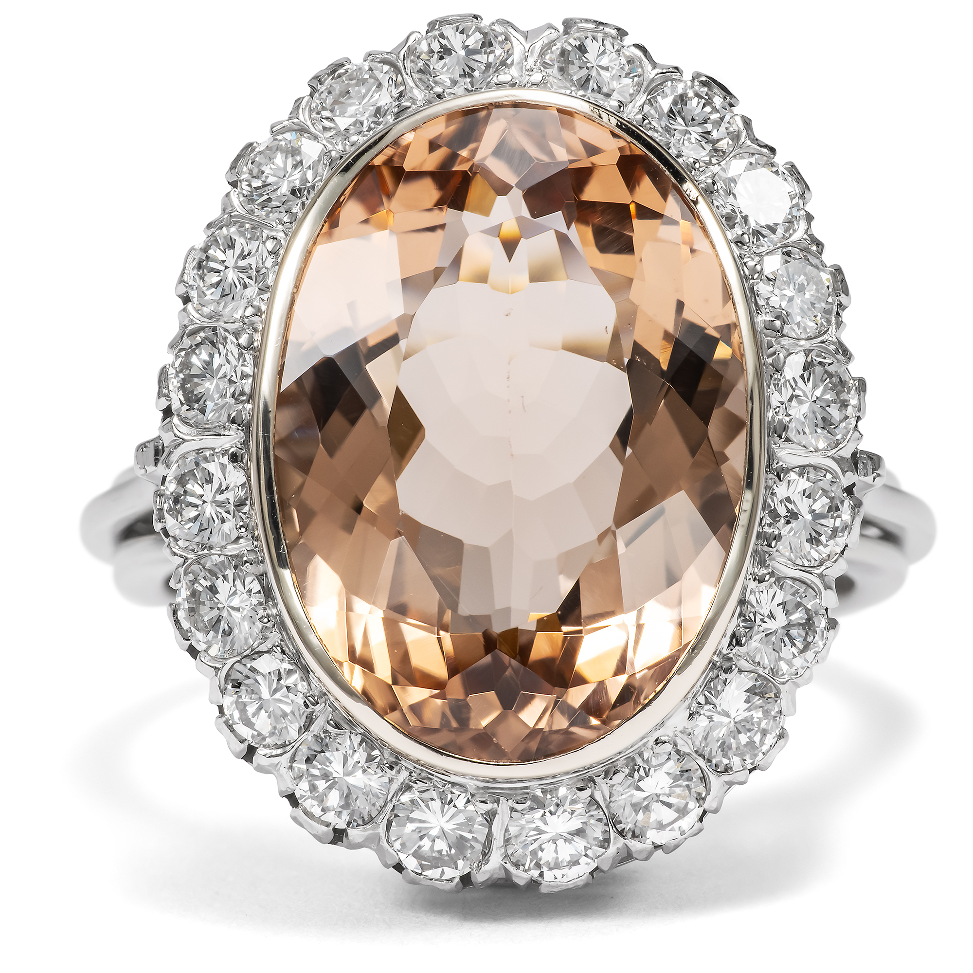 Seductive, in a fine peach color - this is how the beautiful gemstone shines in this glamorous vintage ring. It is a morganite of more than ten carats. The gemstone has an oval facet cut and is set in a restrained frame. Its shape is fascinating, as the central panel reveals the facets on the back and harmonizes wonderfully with the cool colour of the stone. Morganite, also known as rose beryl or pink emerald, was discovered in Madagascar in 1910. The chief gemologist of the Tiffany & Co. jewelry house, George Kunz, named the new gemstone after the New York banker and gemstone collector John Pierpont Morgan to honor his philanthropic commitment: Indeed, just three years later, Pierpont Morgan bequeathed his extensive collection of precious gemstones to the Museum of Modern History in New York. Morganite quickly became a true fashion stone, as its pale pink color went wonderfully with the fashion of the early 20th century. A frame of twenty white diamonds surrounds the center stone, making the piece of jewellery a classic entourage ring (from the French "entourage": companion, entourage). The undercutting, which is broken up into delicate prongs and spirals, and the simple ring band are made of white gold. The ring was created around 1980. When we discovered it here in Berlin, it had lost its center stone. We therefore had the morganite set into the ring in our workshop.