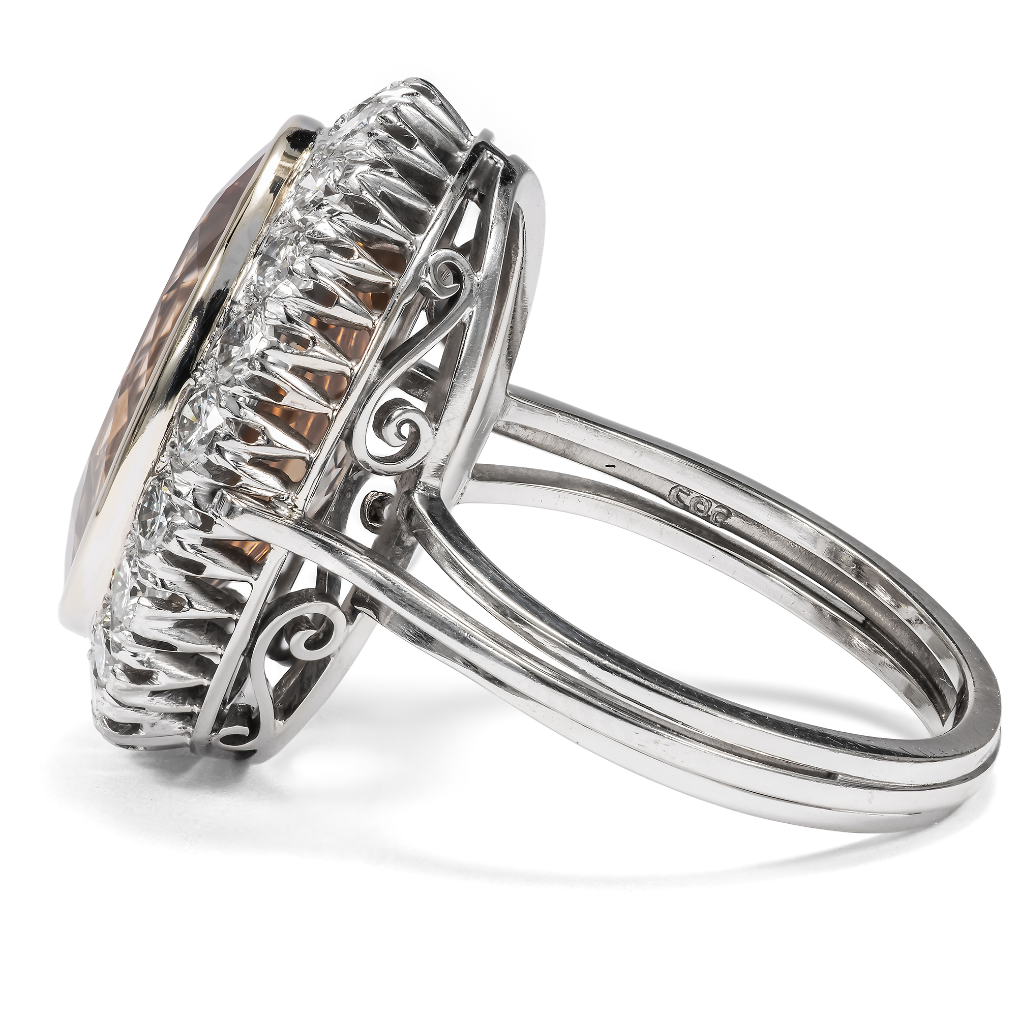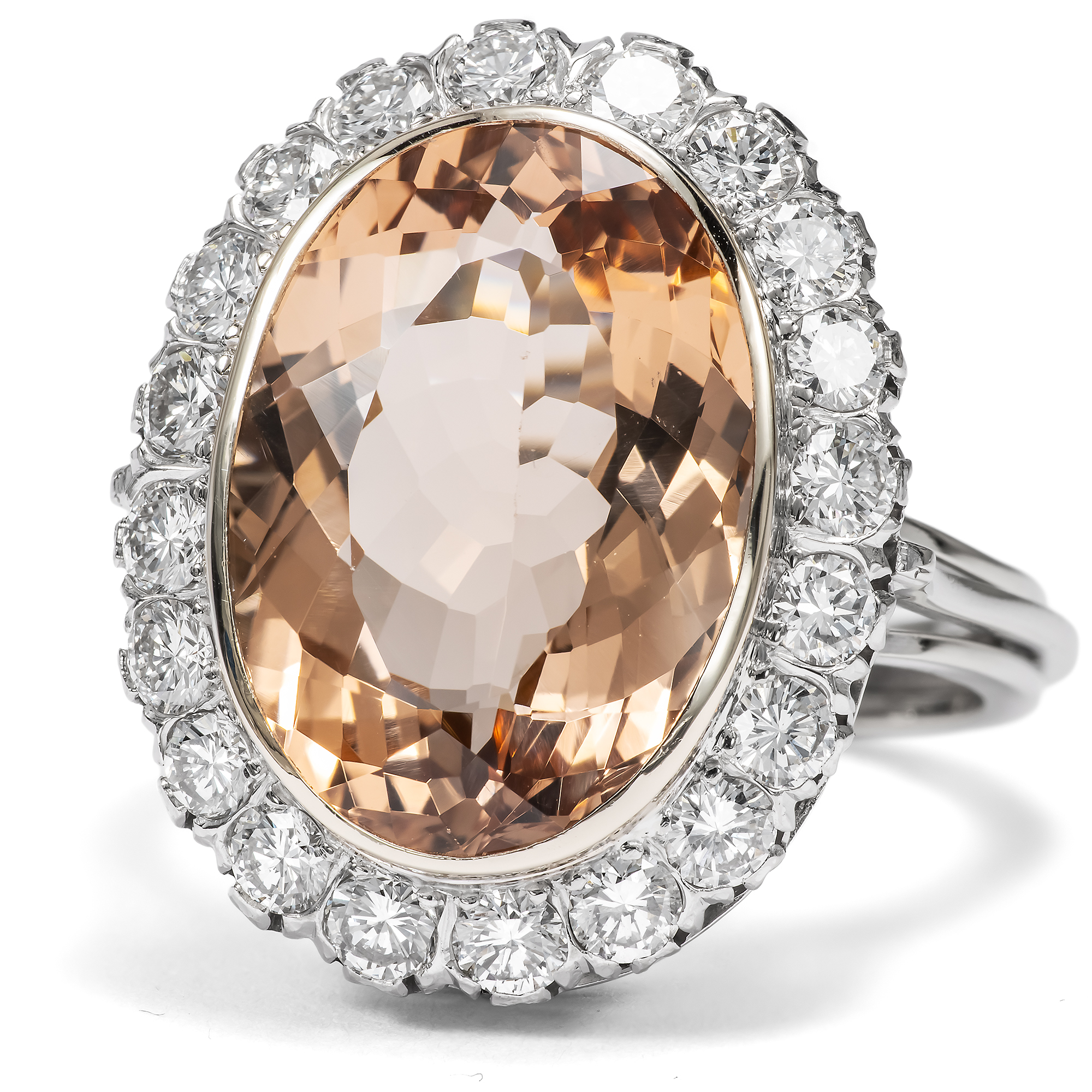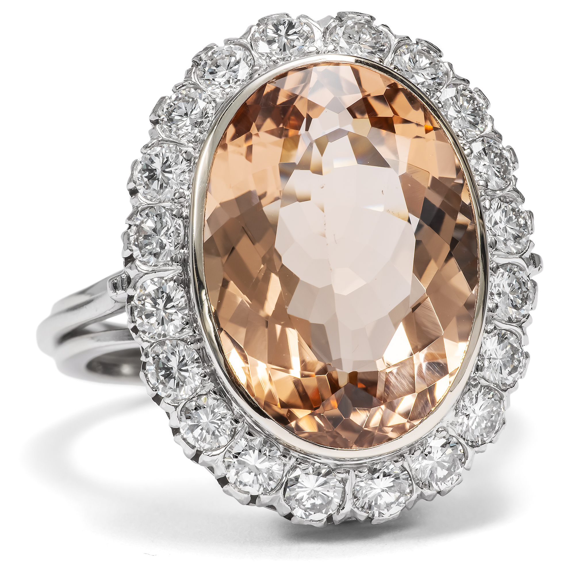 Seductive, in a fine peach color - this is how the beautiful gemstone shines in this glamorous vintage ring. It is a morganite of more than ten carats. The gemstone has an oval facet cut and is set in a restrained frame. Its shape is fascinating, as the central panel reveals the facets on the back and harmonizes wonderfully with the cool colour of the stone. Morganite, also known as rose beryl or pink emerald, was discovered in Madagascar in 1910. The chief gemologist of the Tiffany & Co. jewelry house, George Kunz, named the new gemstone after the New York banker and gemstone collector John Pierpont Morgan to honor his philanthropic commitment: Indeed, just three years later, Pierpont Morgan bequeathed his extensive collection of precious gemstones to the Museum of Modern History in New York. Morganite quickly became a true fashion stone, as its pale pink color went wonderfully with the fashion of the early 20th century. A frame of twenty white diamonds surrounds the center stone, making the piece of jewellery a classic entourage ring (from the French "entourage": companion, entourage). The undercutting, which is broken up into delicate prongs and spirals, and the simple ring band are made of white gold. The ring was created around 1980. When we discovered it here in Berlin, it had lost its center stone. We therefore had the morganite set into the ring in our workshop.