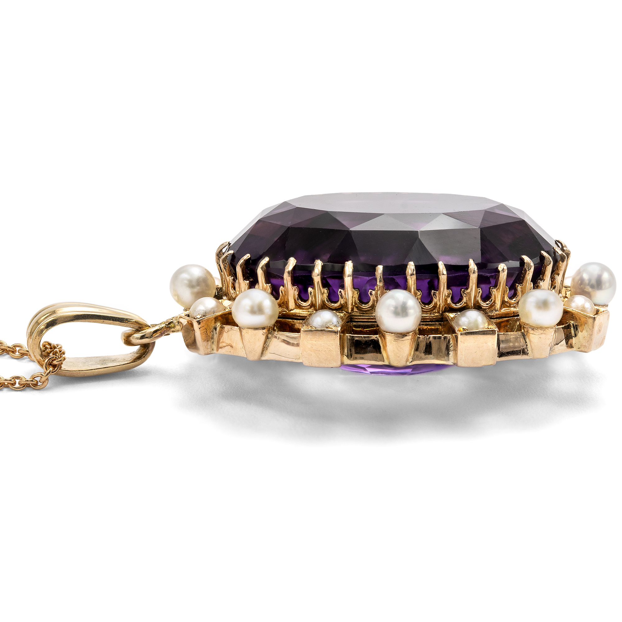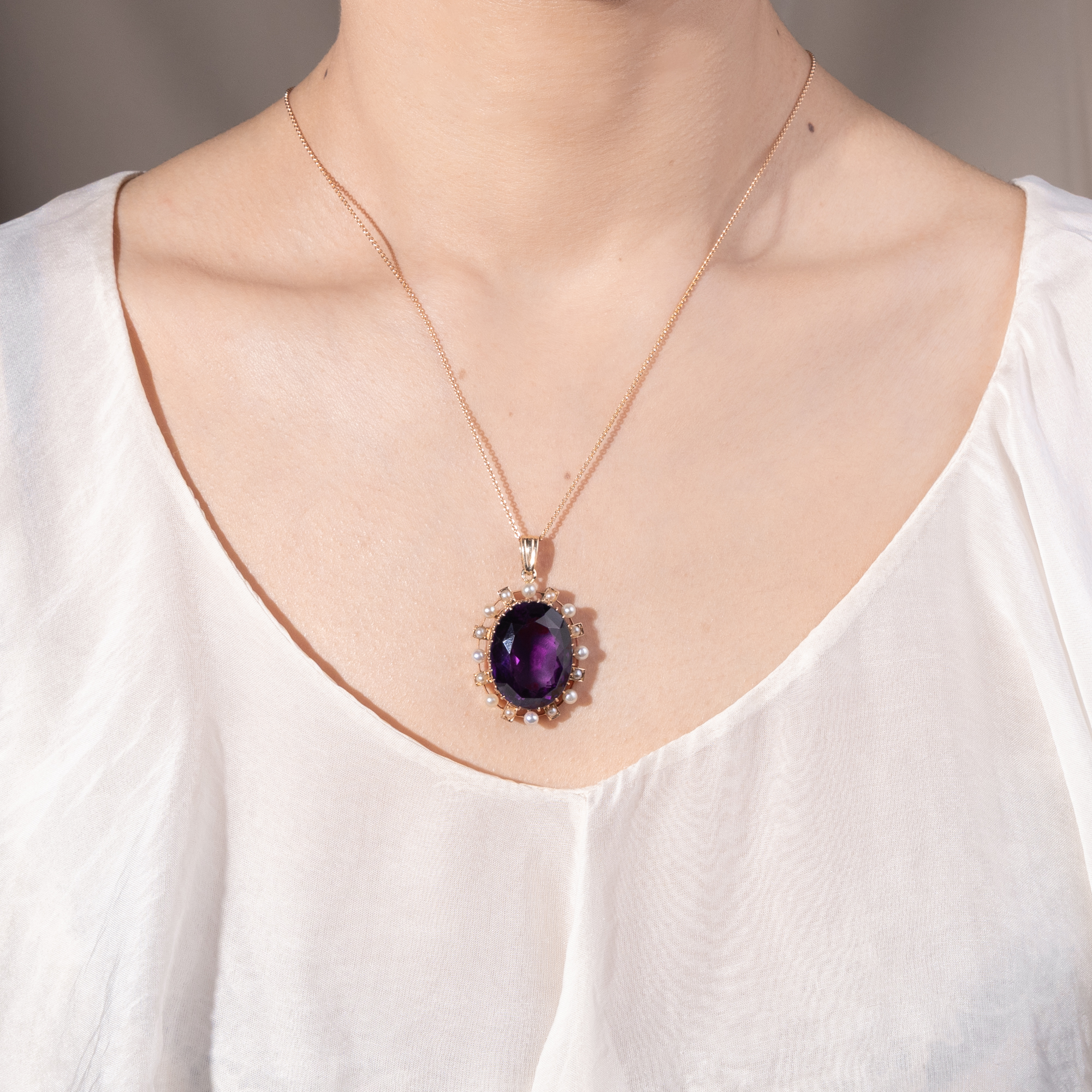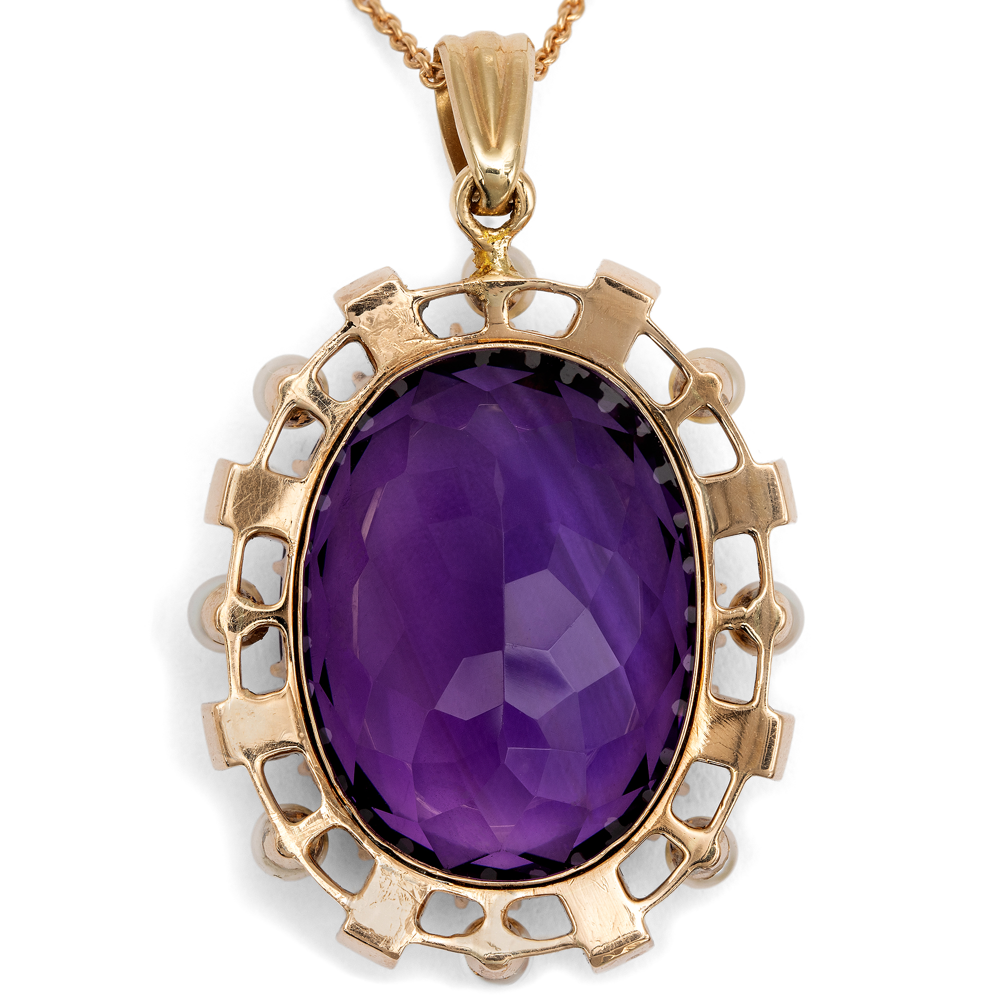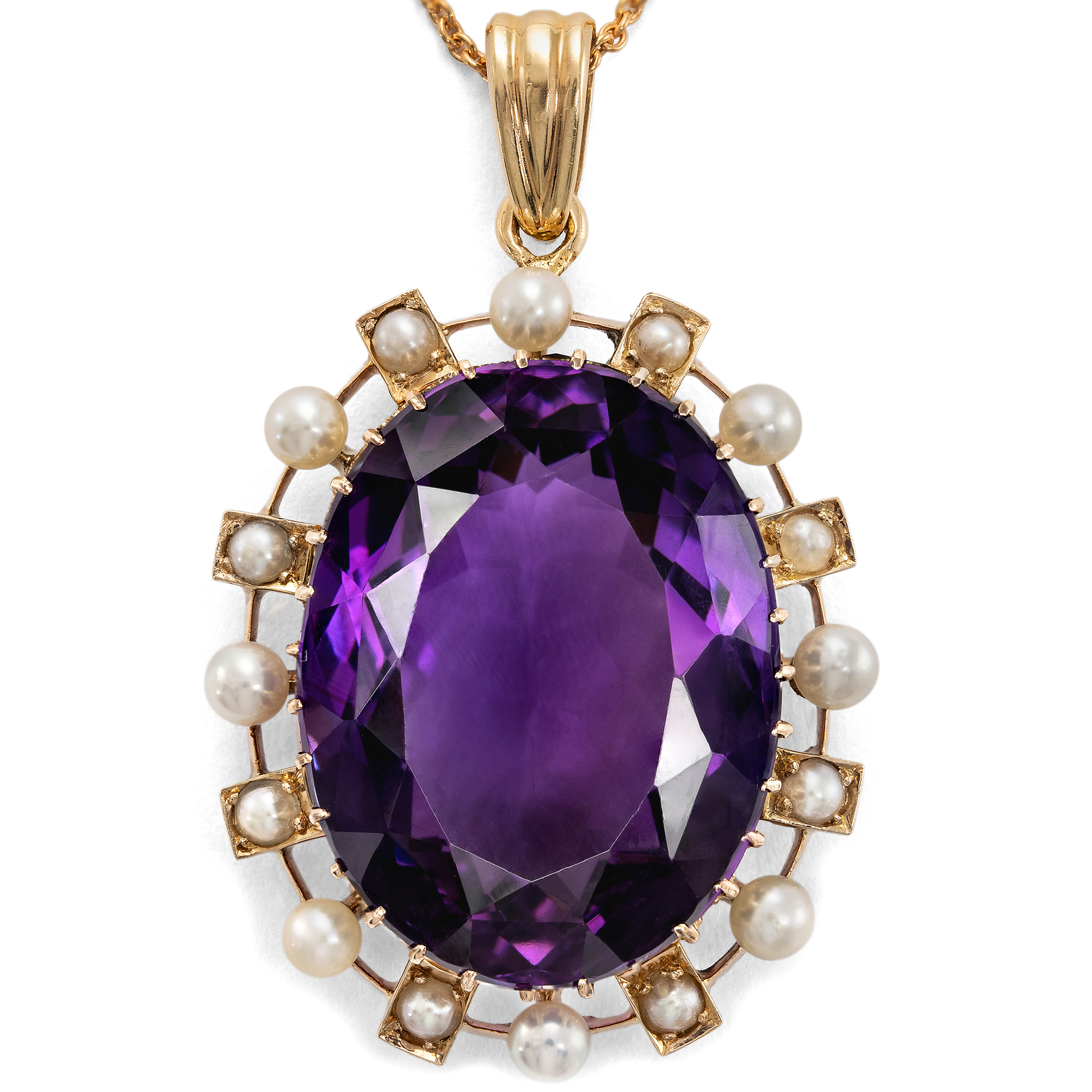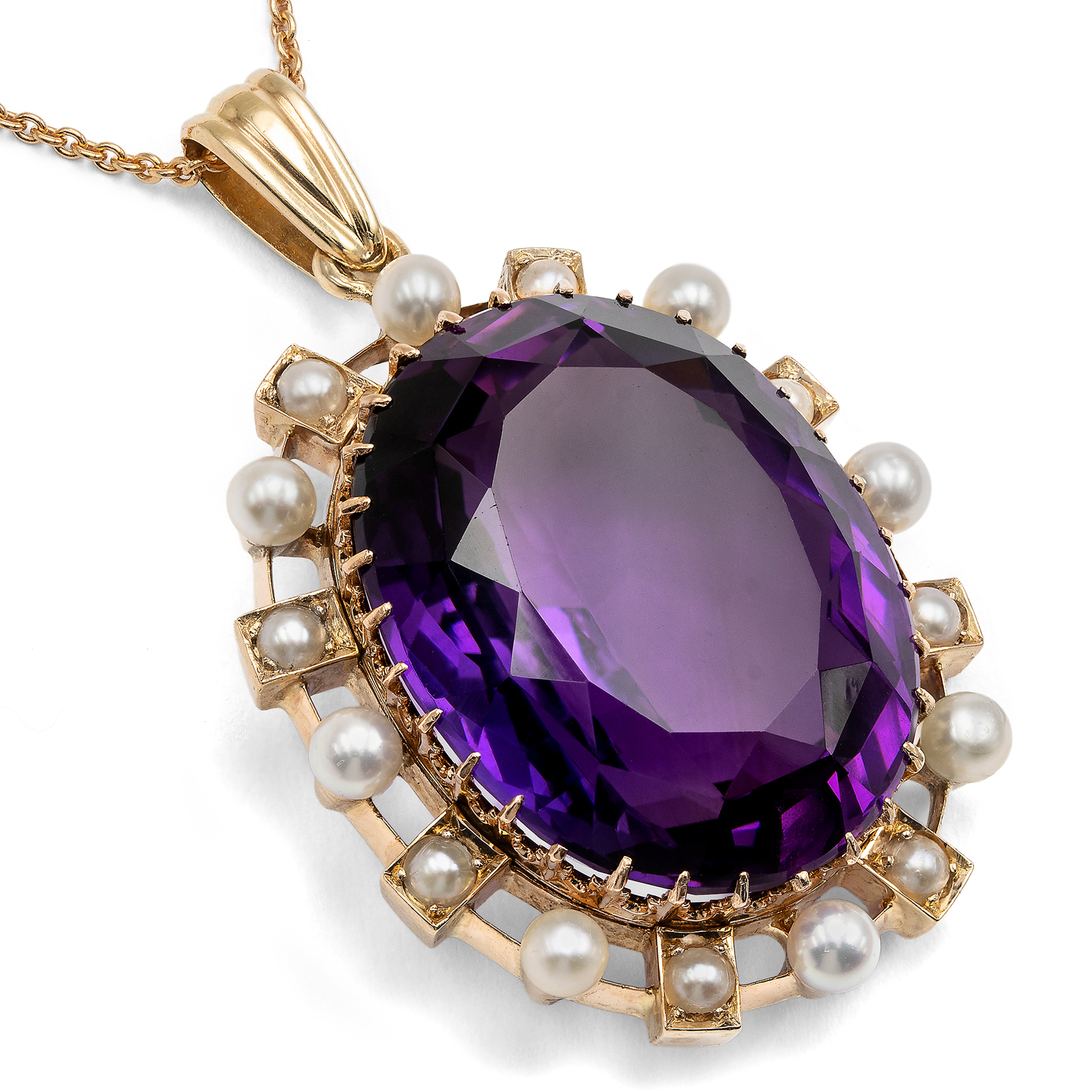 The large family of quartz stones delights us with many beautiful "sons": Amethyst, agate, jasper, citrine and onyx - for the chemist, all these gemstones are quite uniformly silica. But how different are the shapes and colors that nature offers us! Amethyst is the violet variety of quartz. The origin of its name from the Greek - "ἀμέθυστος" (amethystos), "counteracting intoxication" - expresses the ancient belief that the wearer of an amethyst is immune to the intoxicating effects of wine. We have not yet been able to confirm that this is actually the case, despite a number of self-experiments. One thing is certain, however: this stone - perhaps not the rarest of gemstones - is undoubtedly one of nature's most beautiful gifts. Its colour is unique: the spectrum ranges from a delicate purple to a deep, rich violet. Even in antiquity and the Middle Ages, amethyst was used to make artistic objects such as vases and drinking cups. However, this stone was mainly used in jewelry. This Victorian pendant, which originally began its life as a brooch, is a particularly beautiful example of this special variety of quartz. The amethyst weighs around 23.20 carats and has only a few natural inclusions. It is held by a wide rose gold setting set with shimmering, natural pearls. A simple loop and a delicate gold chain make the pendant wearable. The piece is in very good condition and a great joy for any friend of its appealing, vibrant colours.