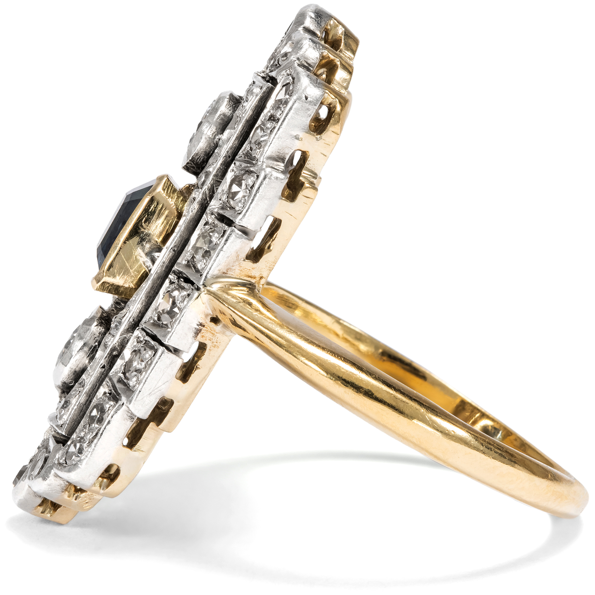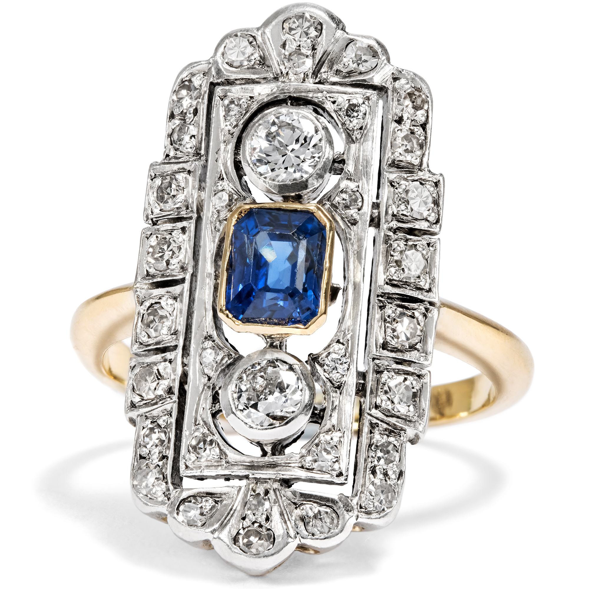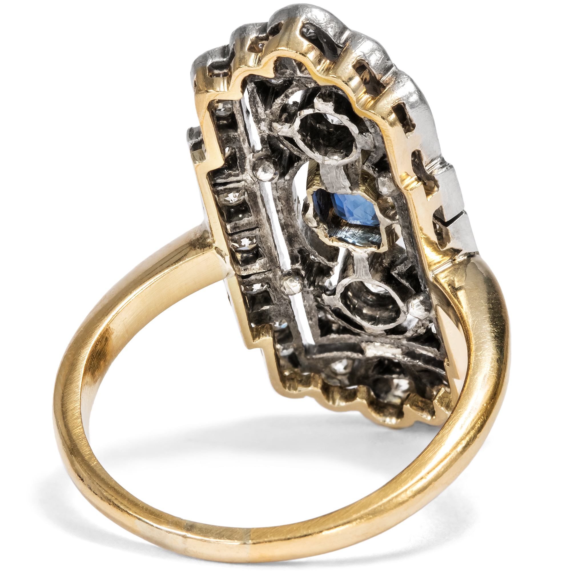The elegant lady of the 1920s chose her precious evening jewelry not only according to mood and occasion, but also according to the colour of her dress. In 1929, one could read in Harper's Bazaar: "It is no longer seen that two or three rings are worn on each finger. Elegant society wears a diamond band as a wedding ring and a large solitaire ring, usually a diamond, as an engagement ring, and then perhaps another dress ring to enhance the effect of the dress." What might a Mondaine of the golden 1920s have worn this ring for - with Madame Paquin's midnight blue dress, or with the Callot Soeurs' silver lamé pattern? Today we can only speculate, because like almost all pieces of jewellery, this ring came to us without a confirmed provenance. But one thing is certain: it belonged to a wealthy lady who wanted to make a grand entrance. This beautiful ring is strikingly large and also has precious features. A total of 34 diamonds weighing around 0.80 ct adorn the entire surface of the ring. The ring face is also structured with fine sawing work so that it does not appear heavy despite its imposing size. A deep blue sapphire is set in its center. Together with the silver and the radiance of the diamonds, this creates a wonderful contrast. An elegant jewel that has lost none of its beauty even after a century.