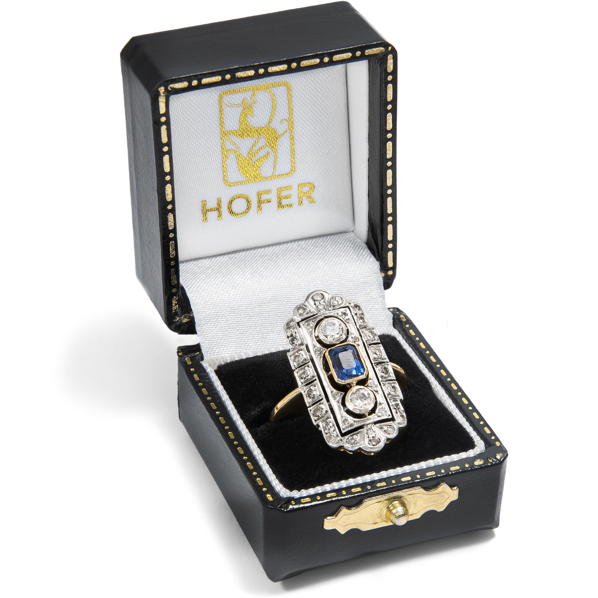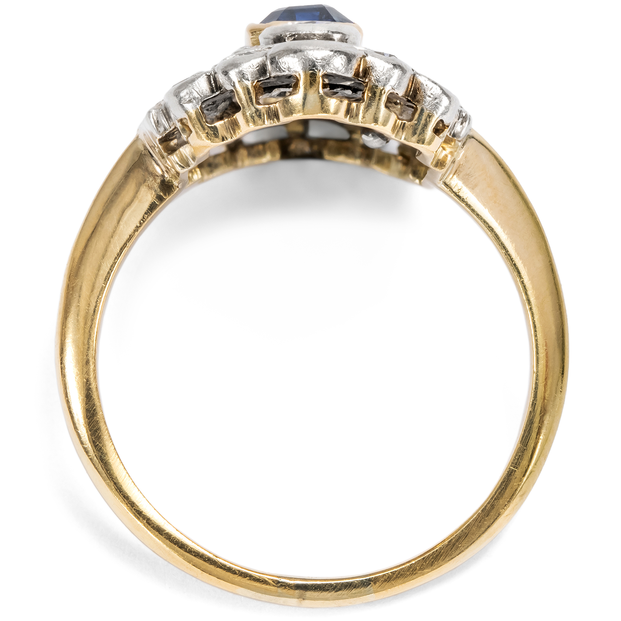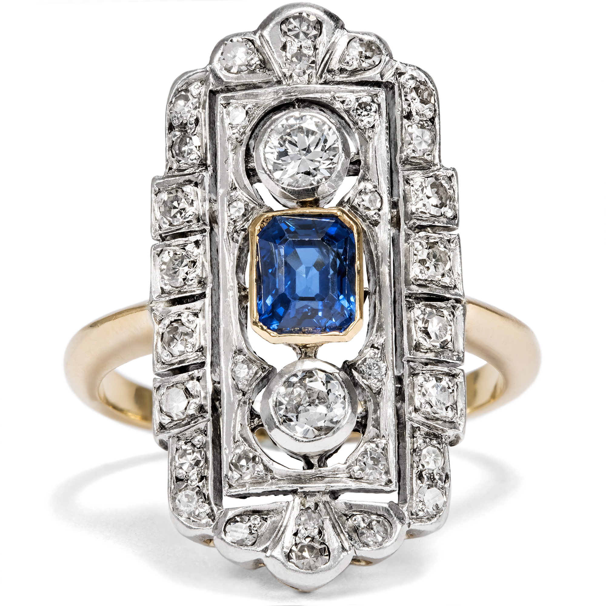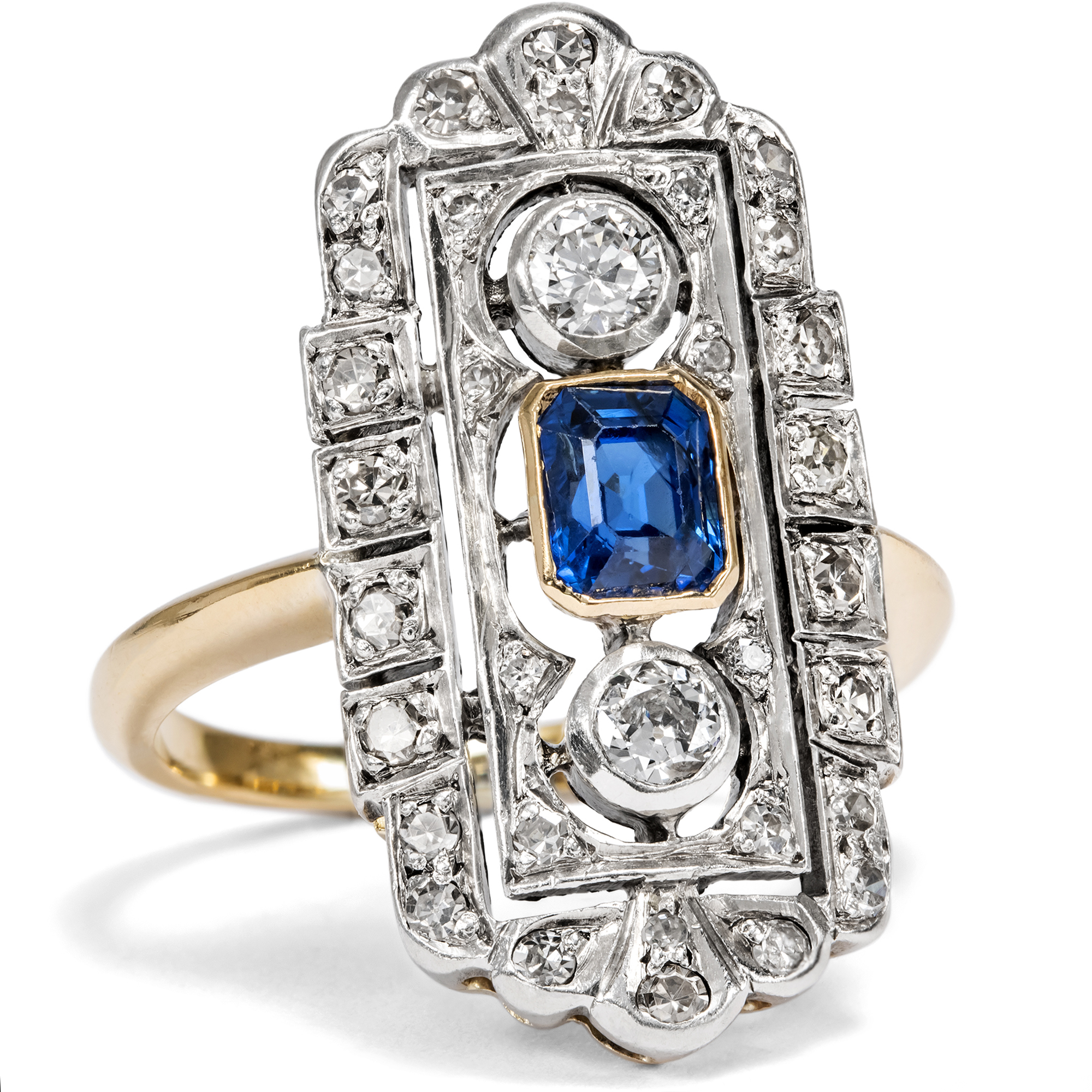 The elegant lady of the 1920s chose her precious evening jewelry not only according to mood and occasion, but also according to the colour of her dress. In 1929, one could read in Harper's Bazaar: "It is no longer seen that two or three rings are worn on each finger. Elegant society wears a diamond band as a wedding ring and a large solitaire ring, usually a diamond, as an engagement ring, and then perhaps another dress ring to enhance the effect of the dress." What might a Mondaine of the golden 1920s have worn this ring for - with Madame Paquin's midnight blue dress, or with the Callot Soeurs' silver lamé pattern? Today we can only speculate, because like almost all pieces of jewellery, this ring came to us without a confirmed provenance. But one thing is certain: it belonged to a wealthy lady who wanted to make a grand entrance. This beautiful ring is strikingly large and also has precious features. A total of 34 diamonds weighing around 0.80 ct adorn the entire surface of the ring. The ring face is also structured with fine sawing work so that it does not appear heavy despite its imposing size. A deep blue sapphire is set in its center. Together with the silver and the radiance of the diamonds, this creates a wonderful contrast. An elegant jewel that has lost none of its beauty even after a century.