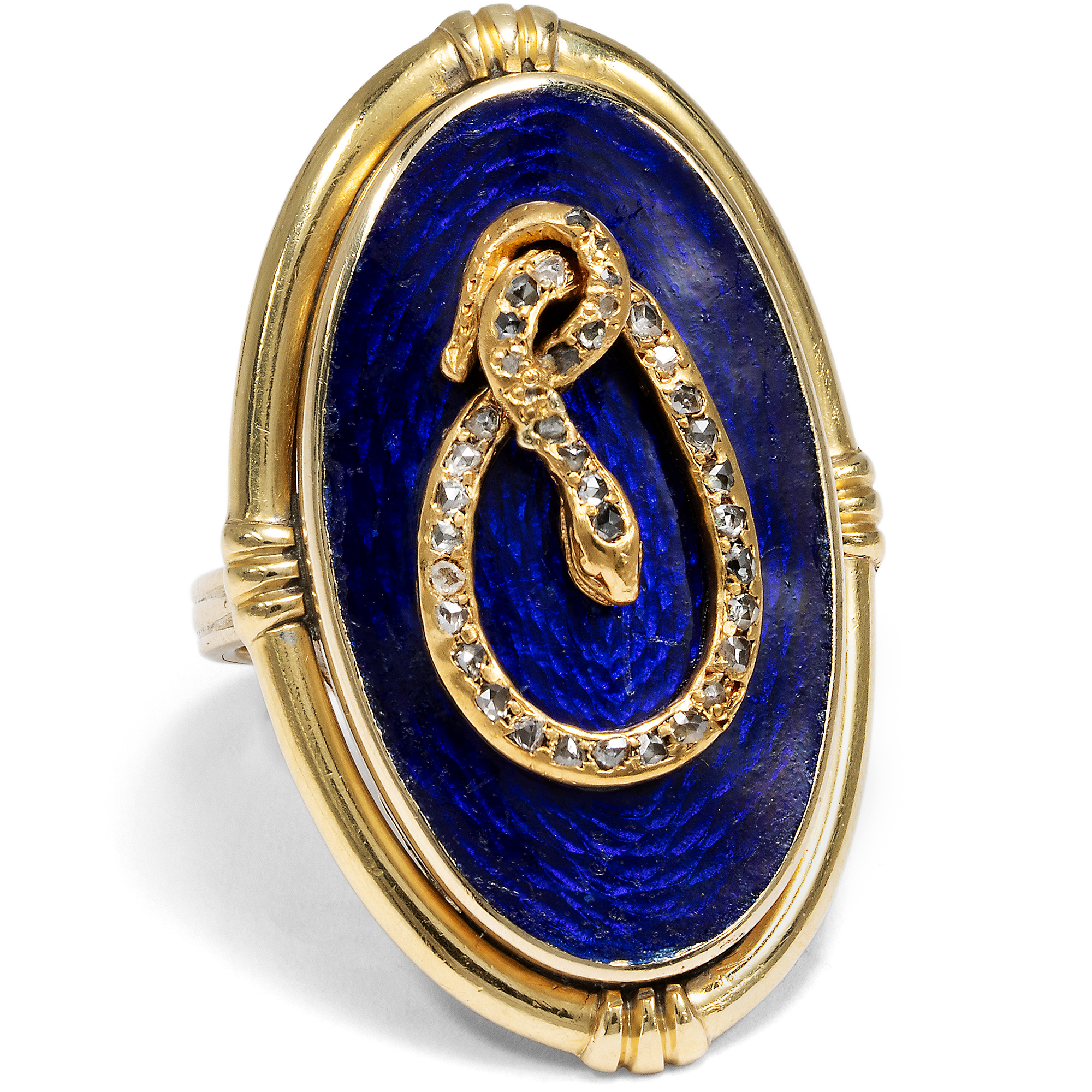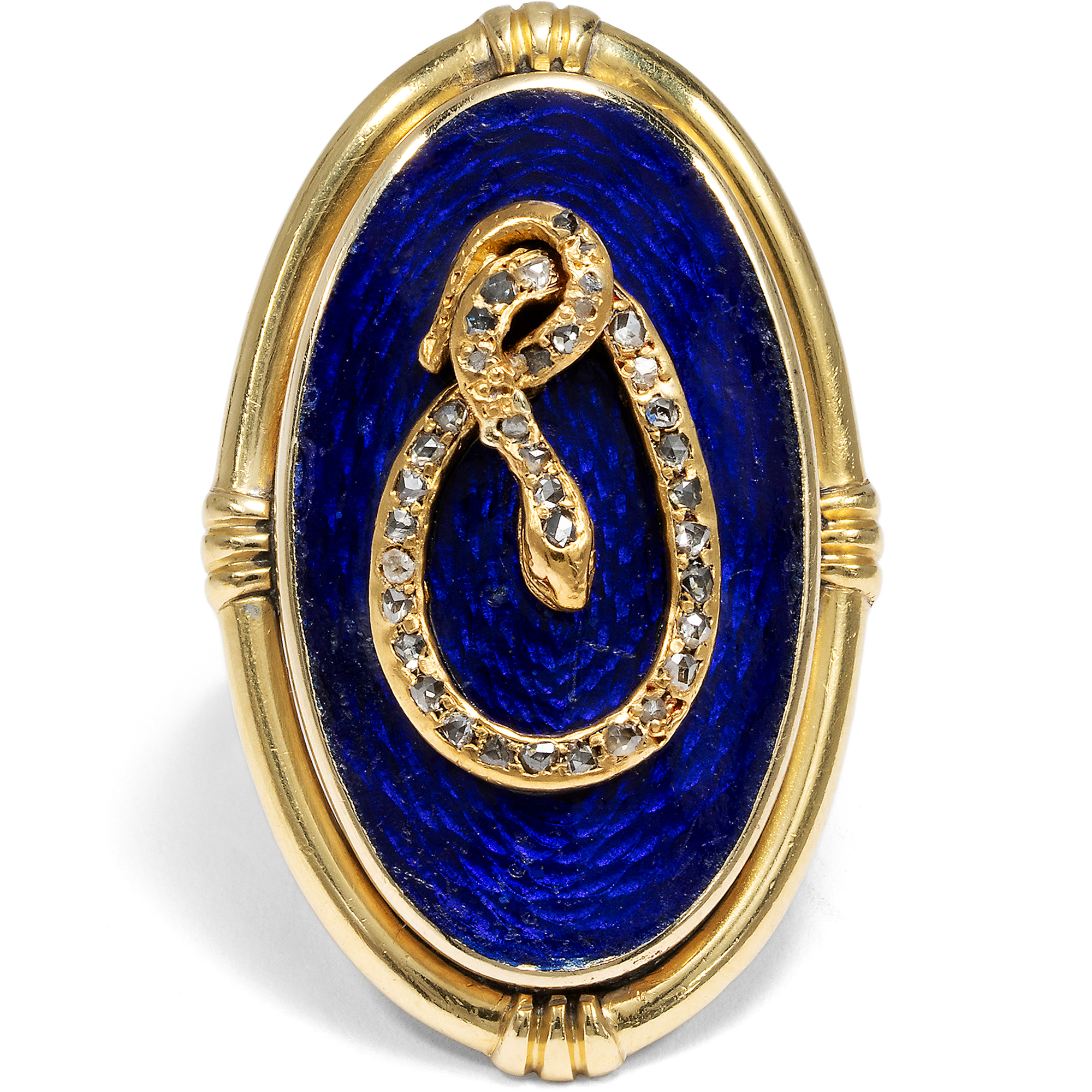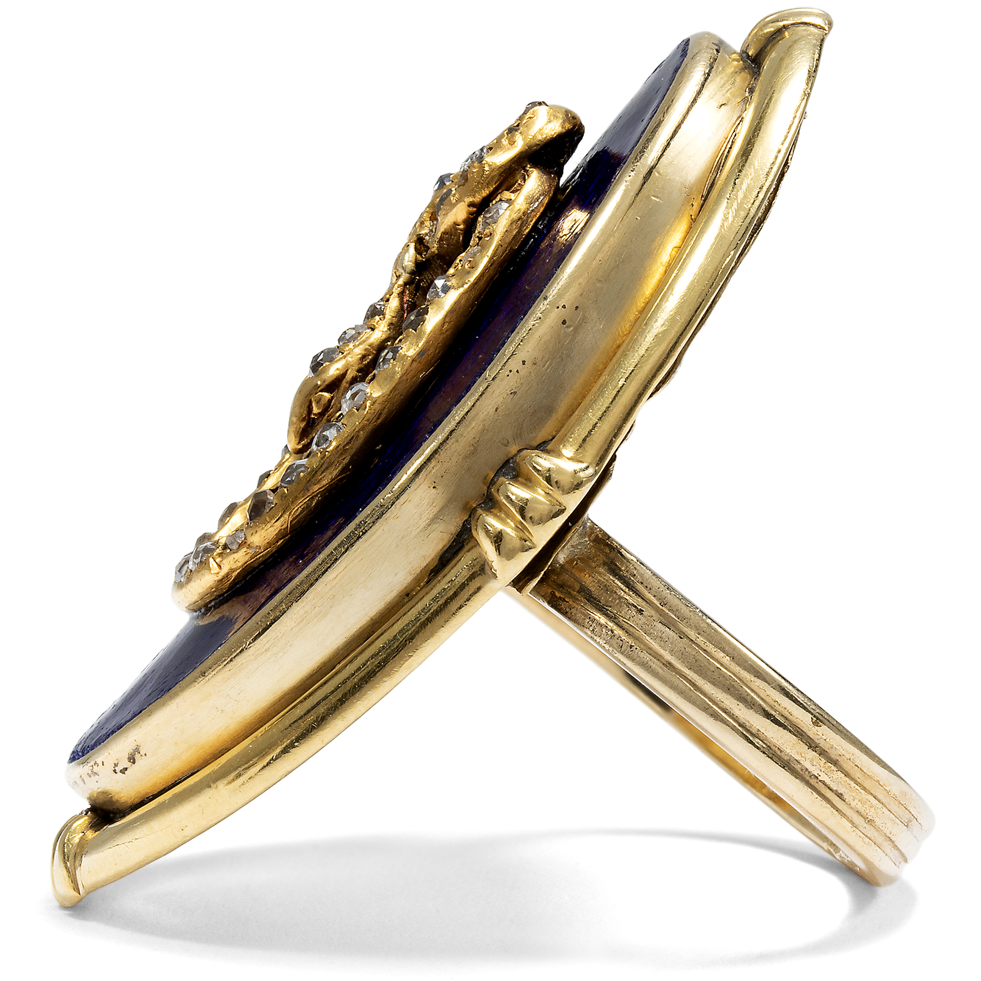 Some pieces of jewellery are said to carry the charisma of the people they once accompanied. This unusual snake ring has a good chance of being such an object, as it belonged to the actress Maria Schell (1926-2005). The ring is of an impressive size; it easily covers an entire finger. On a gold-framed, deep dark blue enamel background, we see a snake that determines the design of the ring as a sculpturally applied motif. Its body is set with small rose cut diamonds and draws itself across the dark blue surface in a sinuous movement, appearing to knot into itself. The composition appears opulent and yet concentrated. Dark blue and gold define the impression of this unusual piece of jewellery. The snake has been one of the most ambiguous symbols in art history for centuries, and we encounter it relatively frequently in old pieces of jewellery. Since biblical times, it has been the cunning temptress of Eve, but at the same time - as Ouroboros - a symbol of infinity. Even the ancient Romans wore snake-shaped jewellery; the reptile was considered to promise health due to its connection to the god Asclepius. The allusion to the fall of man was no longer the central element, even in the 19th century. From the middle of the century in particular, jewellery with snakes was more of a promise of good luck. The large showpiece of this ring was created in the years shortly after the middle of the century. In the 1850s, blue enamel became very fashionable again and was often combined with snake motifs. In the 1860s, large oval shapes became fashionable. The oval showpiece with the blue enameled surface was therefore probably created around 1860. Originally, however, it was not a ring: we think it was the showpiece of a bracelet. The ring band and the polished gold plate on the back, which turns the snake with its oval frame into a ring, were added later, probably in the 20th century. The fact that Maria Schell wore this ring gives it an additional dimension. Hardly a photo of her is known in which she is not wearing this piece of jewellery. Whether on film sets, at public appearances or in private moments, the ring has been her constant companion since at least 1974, see for example here or here. Schell, who gained international recognition with films such as The Last Bridge or Gervaise, was appreciated for her great emotional intensity and her ability to give characters extraordinary depth. Her warm and approachable nature has touched generations of audiences, and her ring reflects these qualities in its own way. Despite its size, it is calm, it is present and at the same time symbolically charged. You can tell from the pieces of jewellery that it has been worn over many decades. Scratches, scuffs, dents and clear signs of wear bear witness to a life lived and give the ring an authenticity that cannot be artificially created. We have carefully restored it to a wearable condition, but have not completely restored it because we did not want to polish away the traces of its lived history. The ring came into the possession of Maria Schell's daughter, Marie Theres Relin, through inheritance and from her into the Munich art trade. It is part of an artist's life and conveys the memory of a great actress of the 20th century.