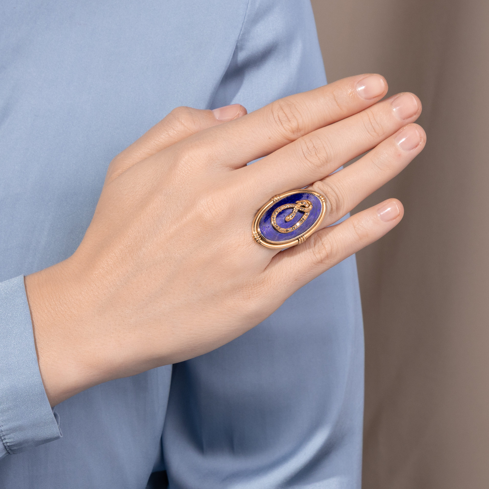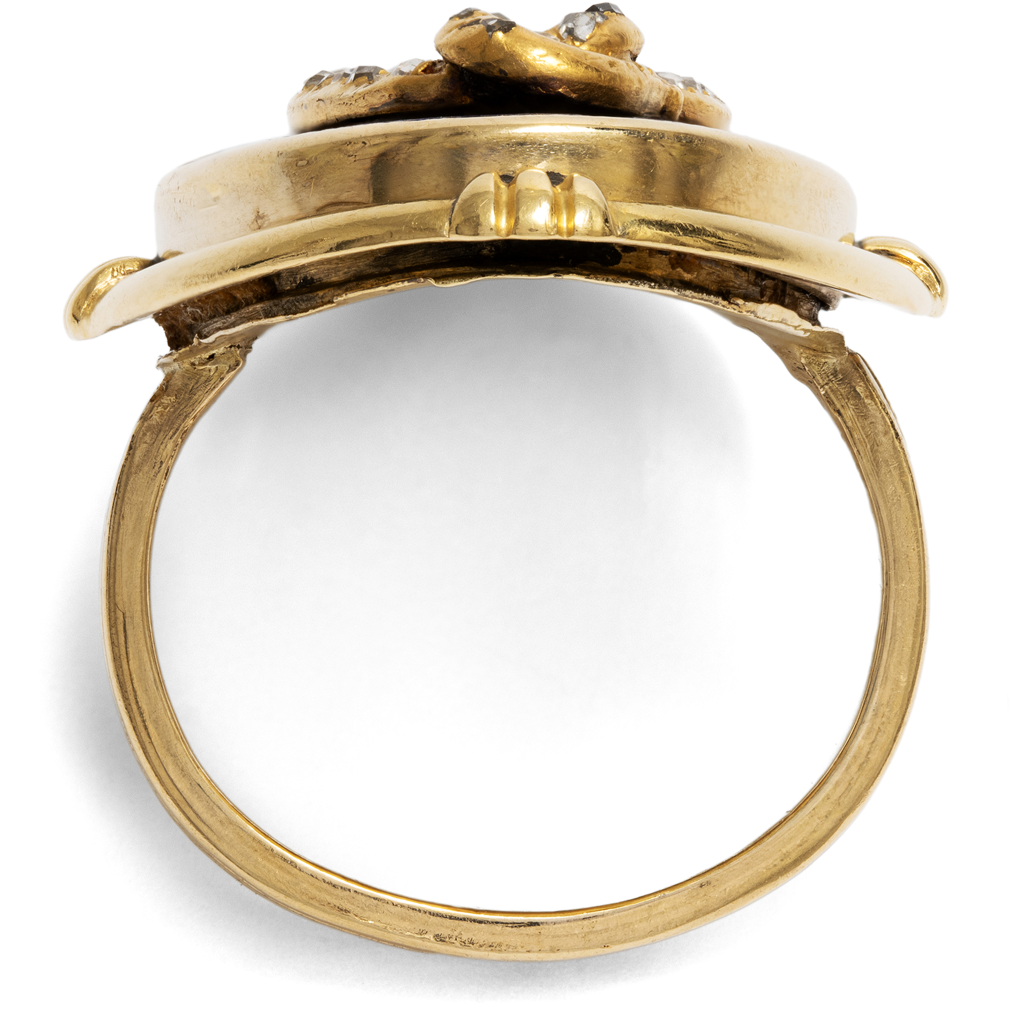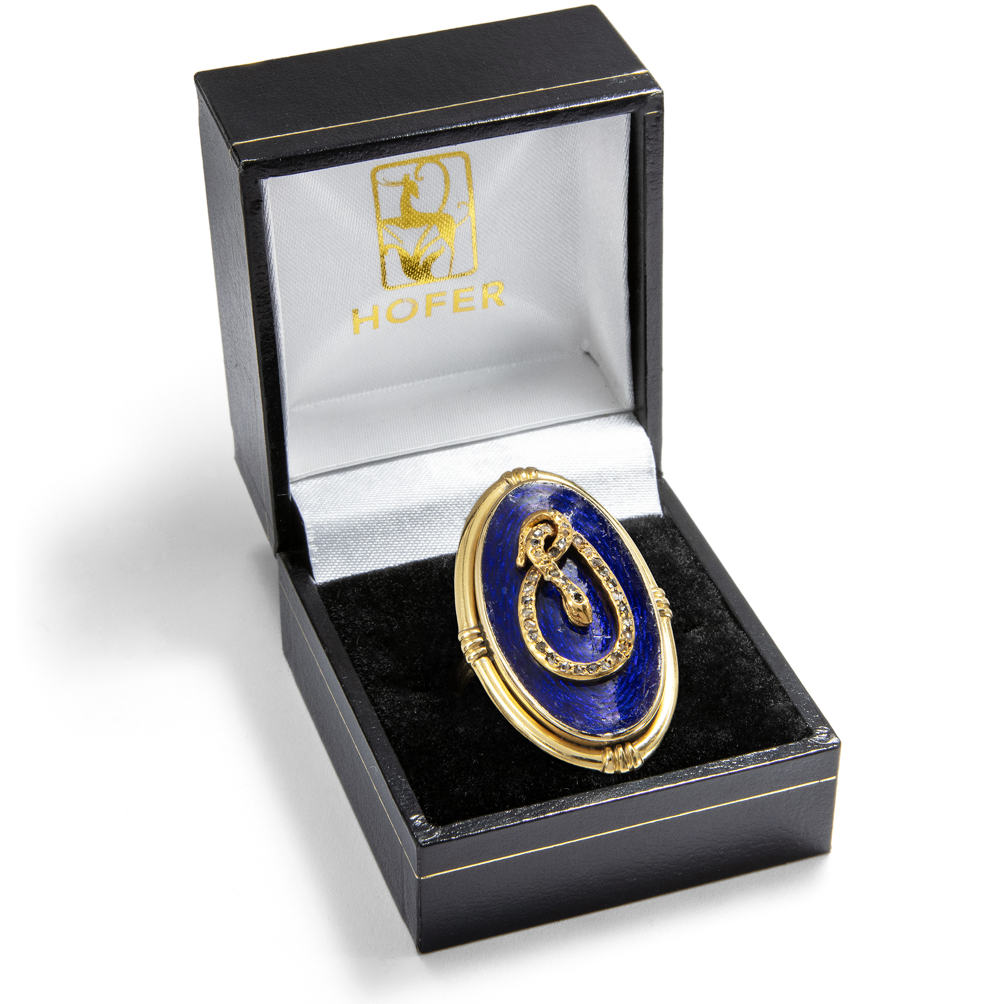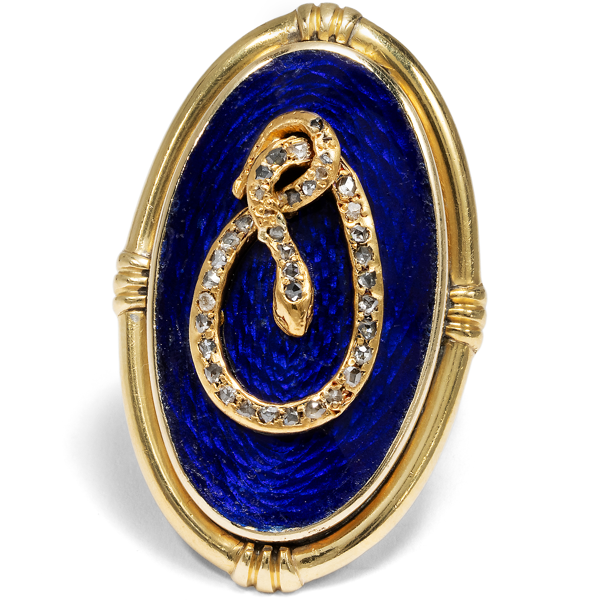 Some pieces of jewellery are said to carry the charisma of the people they once accompanied. This unusual snake ring has a good chance of being such an object, as it belonged to the actress Maria Schell (1926-2005). The ring is of an impressive size; it easily covers an entire finger. On a gold-framed, deep dark blue enamel background, we see a snake that determines the design of the ring as a sculpturally applied motif. Its body is set with small rose cut diamonds and draws itself across the dark blue surface in a sinuous movement, appearing to knot into itself. The composition appears opulent and yet concentrated. Dark blue and gold define the impression of this unusual piece of jewellery. The snake has been one of the most ambiguous symbols in art history for centuries, and we encounter it relatively frequently in old pieces of jewellery. Since biblical times, it has been the cunning temptress of Eve, but at the same time - as Ouroboros - a symbol of infinity. Even the ancient Romans wore snake-shaped jewellery; the reptile was considered to promise health due to its connection to the god Asclepius. The allusion to the fall of man was no longer the central element, even in the 19th century. From the middle of the century in particular, jewellery with snakes was more of a promise of good luck. The large showpiece of this ring was created in the years shortly after the middle of the century. In the 1850s, blue enamel became very fashionable again and was often combined with snake motifs. In the 1860s, large oval shapes became fashionable. The oval showpiece with the blue enameled surface was therefore probably created around 1860. Originally, however, it was not a ring: we think it was the showpiece of a bracelet. The ring band and the polished gold plate on the back, which turns the snake with its oval frame into a ring, were added later, probably in the 20th century. The fact that Maria Schell wore this ring gives it an additional dimension. Hardly a photo of her is known in which she is not wearing this piece of jewellery. Whether on film sets, at public appearances or in private moments, the ring has been her constant companion since at least 1974, see for example here or here. Schell, who gained international recognition with films such as The Last Bridge or Gervaise, was appreciated for her great emotional intensity and her ability to give characters extraordinary depth. Her warm and approachable nature has touched generations of audiences, and her ring reflects these qualities in its own way. Despite its size, it is calm, it is present and at the same time symbolically charged. You can tell from the pieces of jewellery that it has been worn over many decades. Scratches, scuffs, dents and clear signs of wear bear witness to a life lived and give the ring an authenticity that cannot be artificially created. We have carefully restored it to a wearable condition, but have not completely restored it because we did not want to polish away the traces of its lived history. The ring came into the possession of Maria Schell's daughter, Marie Theres Relin, through inheritance and from her into the Munich art trade. It is part of an artist's life and conveys the memory of a great actress of the 20th century.