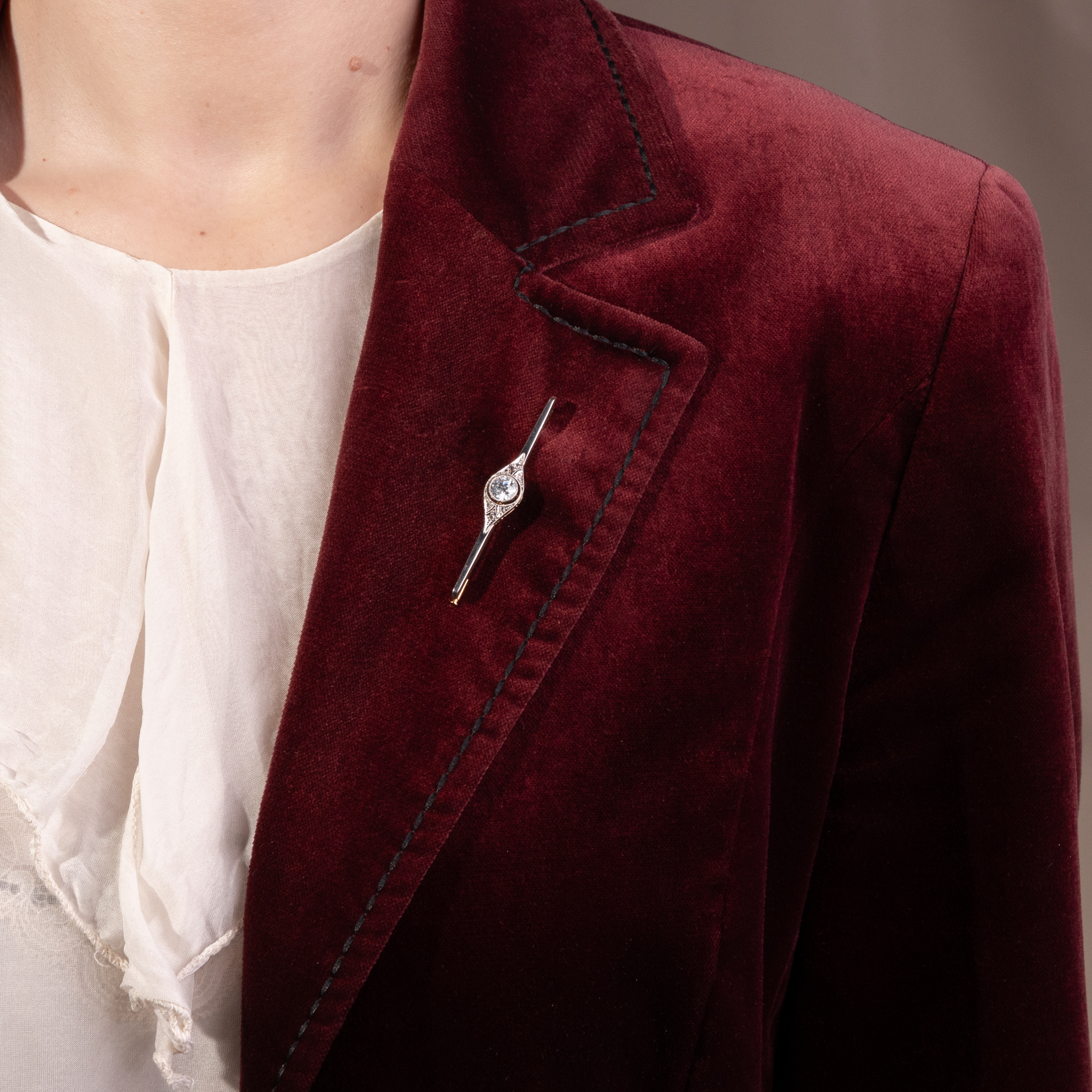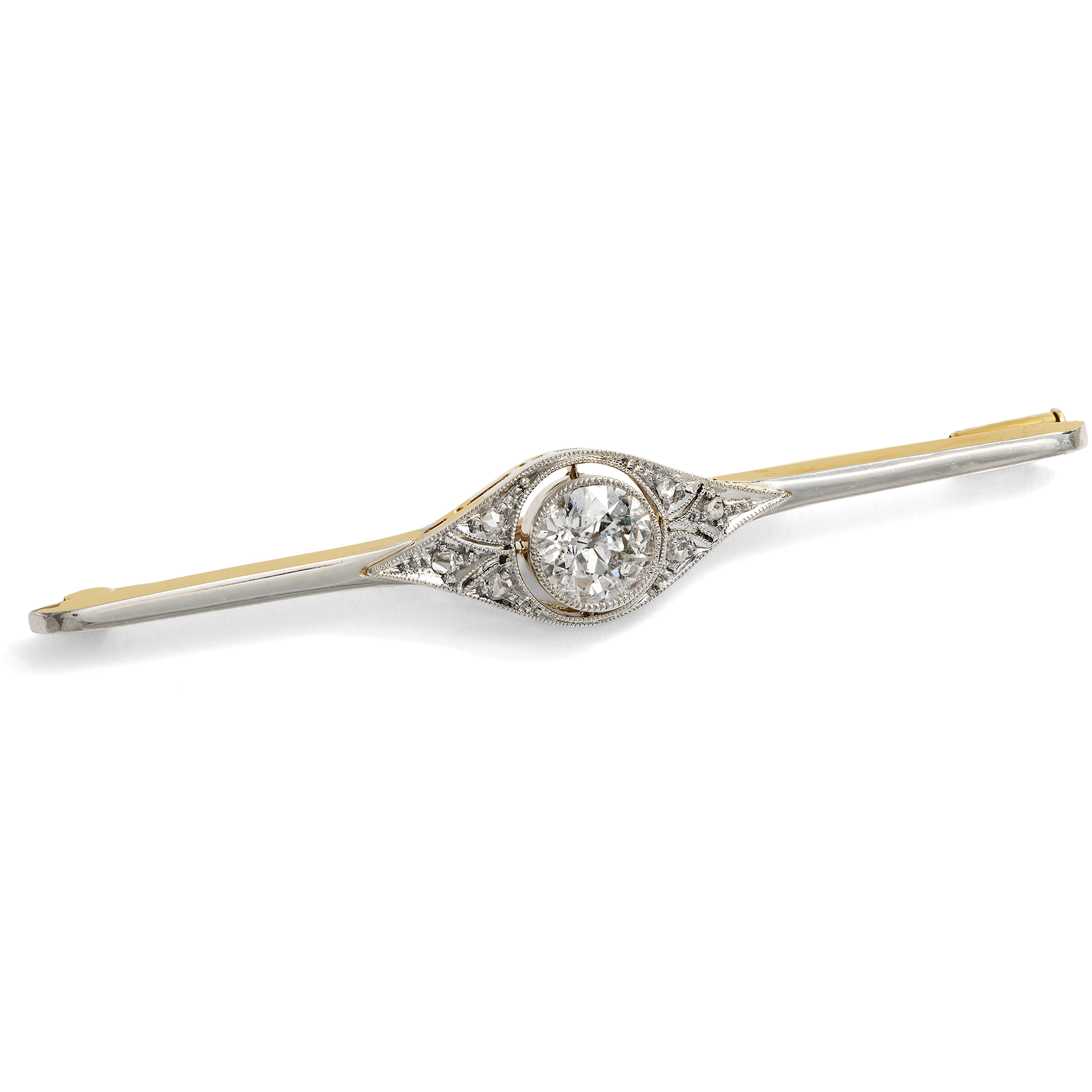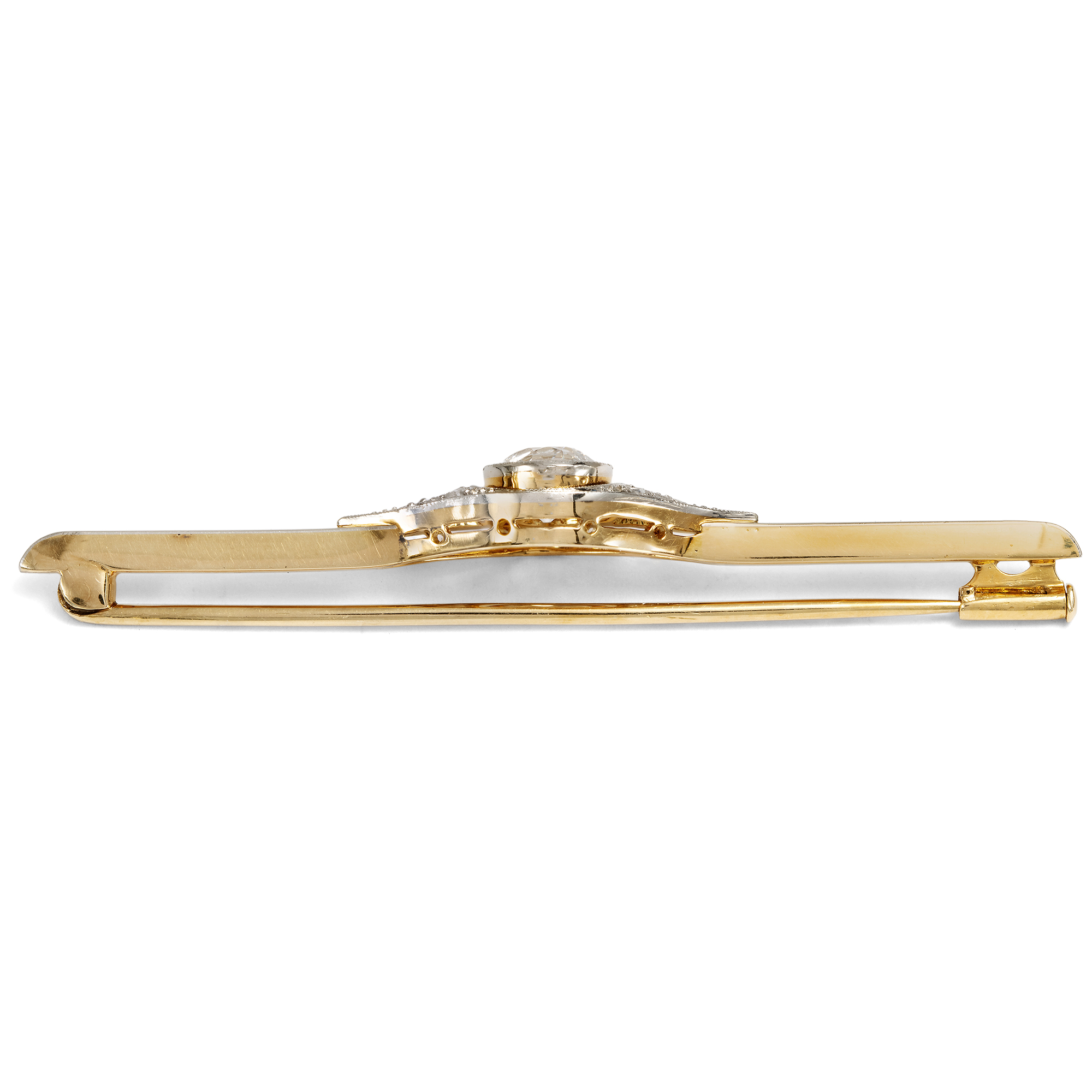 Bar brooches enjoyed great popularity in the first decades of the 20th century. They were worn in many different ways and were particularly creative in the Art Deco period. The German fashion journal "Die Dame", for example, stated in its fashion notes of 1925 that people now wore "rather voluminous pins, which always look best at the front of the waist as a fastener or to finish off an insert." But they could also be seen as the end of a blouse collar, or even pinned over the ties of garçonnes. This brooch has a delicate format and is therefore particularly versatile. Its front is platinum-plated so that it shines white, in keeping with the style of the time. The almond-shaped centerpiece is interspersed with fine sawing work that ornamentally structures the surface of the brooch. A wonderful old-cut diamond is set in the center as the focal point. The large solitaire weighs just under one carat. A circumferential shadow gap further enlarges the stone visually. This piece of jewellery is a typical example of an Art Deco jewel. Since the turbulent years around 1930, it has survived as if not a day has passed since.