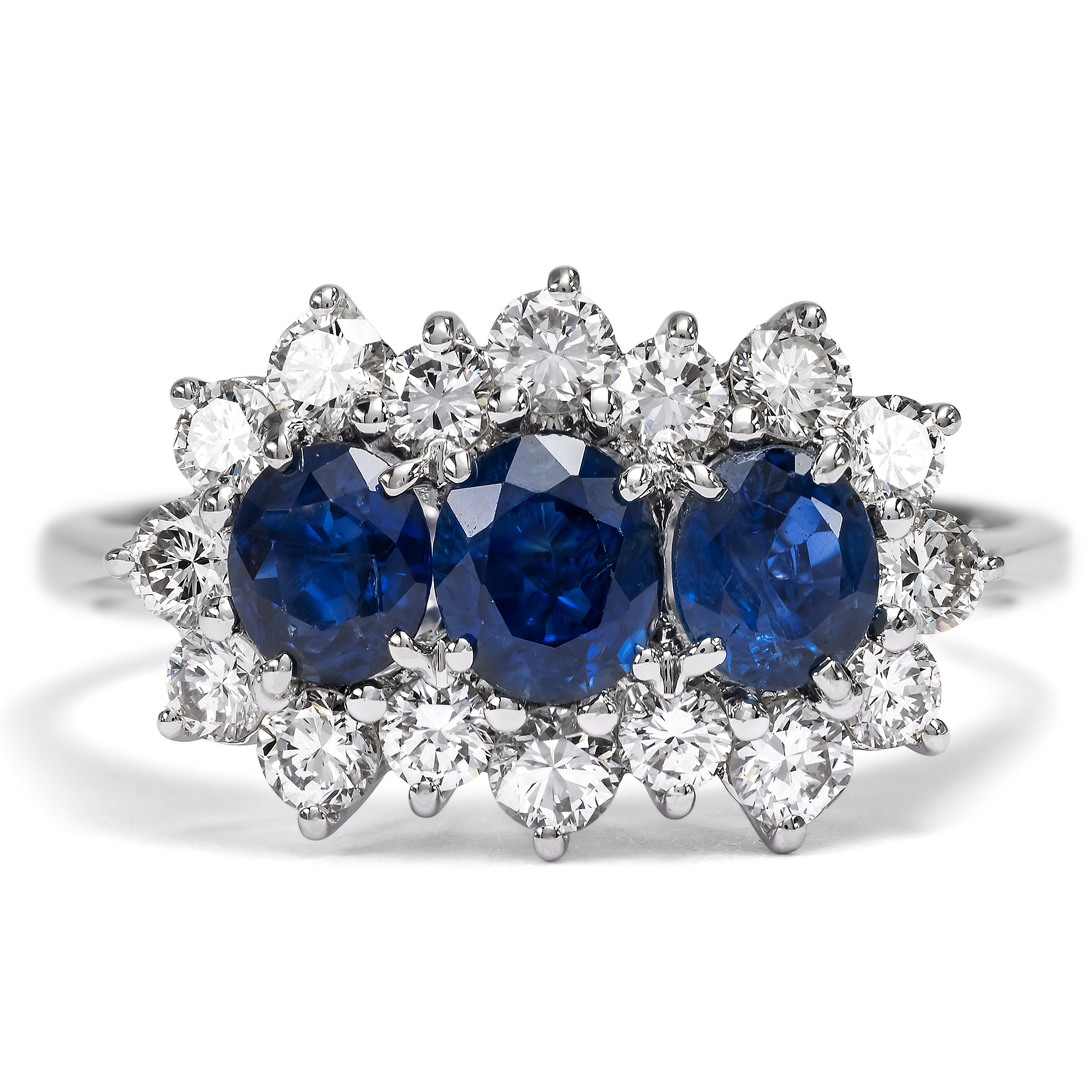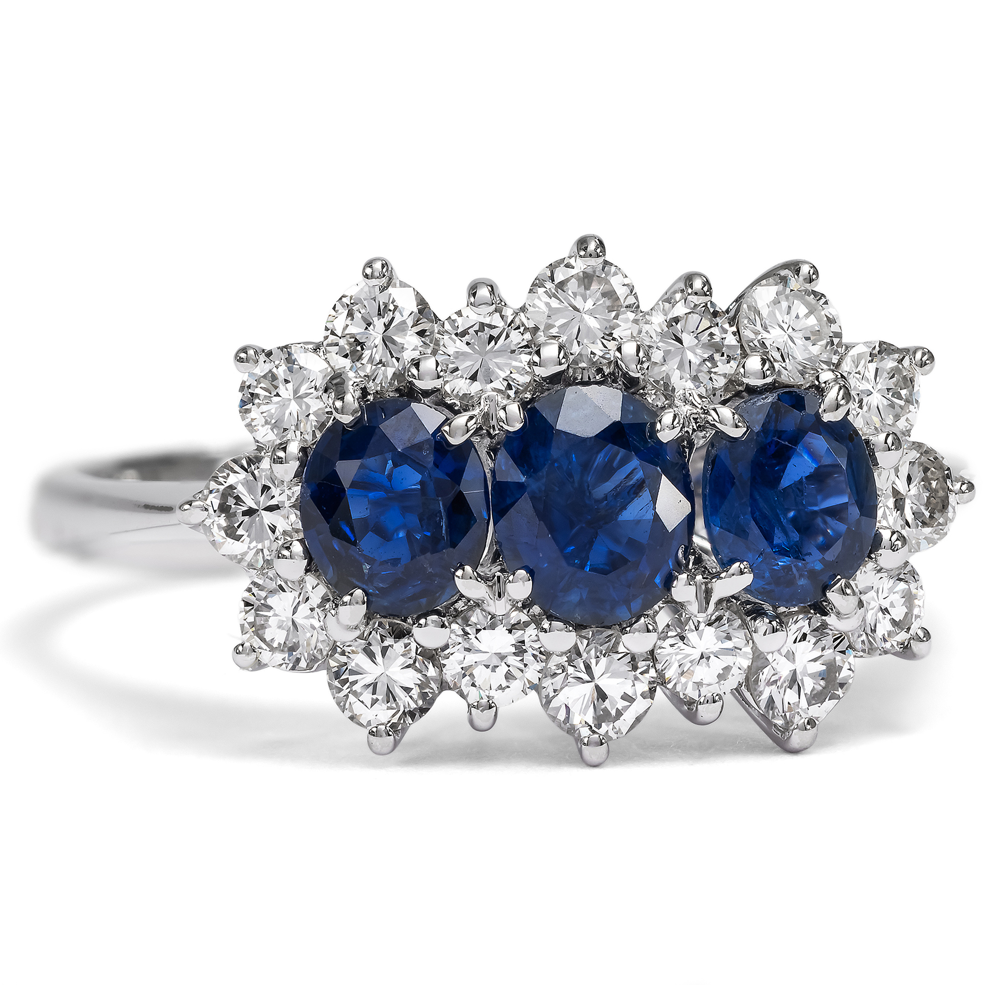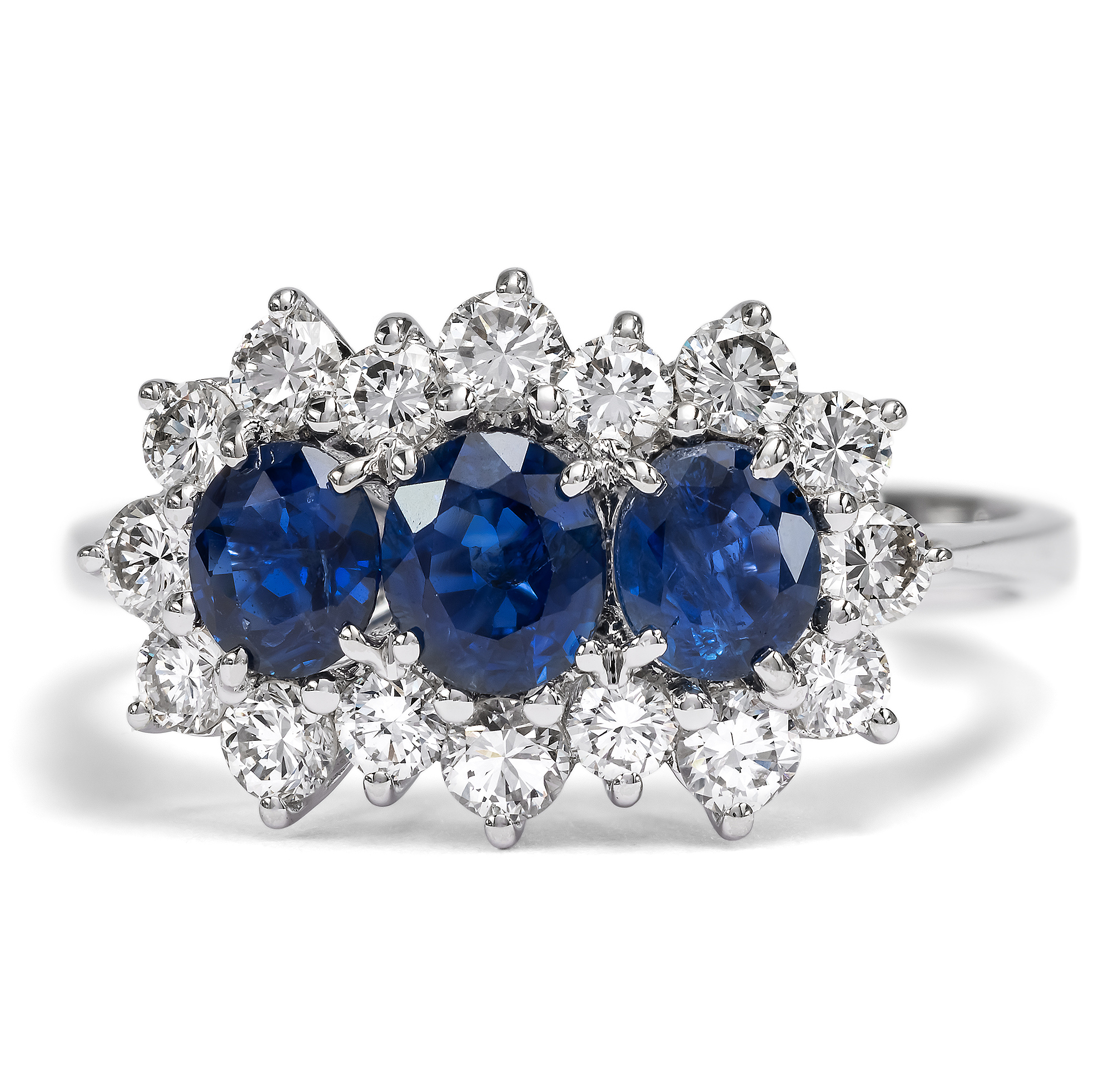 This ring is a typical piece of jewellery from the 1970s. The special feature of many designs from this period is the ever new and often unusual shapes: As a variation on the classic "trilogy ring", this piece also features a clear, modern design that clearly stands out from the jewelry creations of the previous decades. Three deep blue sapphires form the radiant centerpiece. They symbolize the past, present and future - the shared path of two people. They are surrounded by sixteen fine white diamonds. The gemstones are set in high-carat white gold; an undercut of fine bars allows plenty of light to reach the stones and gives the ring a light, elegant appearance. Sapphire has always been attributed with special qualities. In the Middle Ages, it was considered a stone of sincerity and protection, while Giacinto Gimma associated it with Venus and the stars in his Storia naturale delle cameo in 1730. This ring, with its bright blue sapphires and the white sparkle of the diamonds, is also reminiscent of a clear, nocturnal celestial landscape. The beautifully preserved ring combines classic symbolism with the clear design language of the 1970s. An elegant piece of jewellery that can be worn day and night.