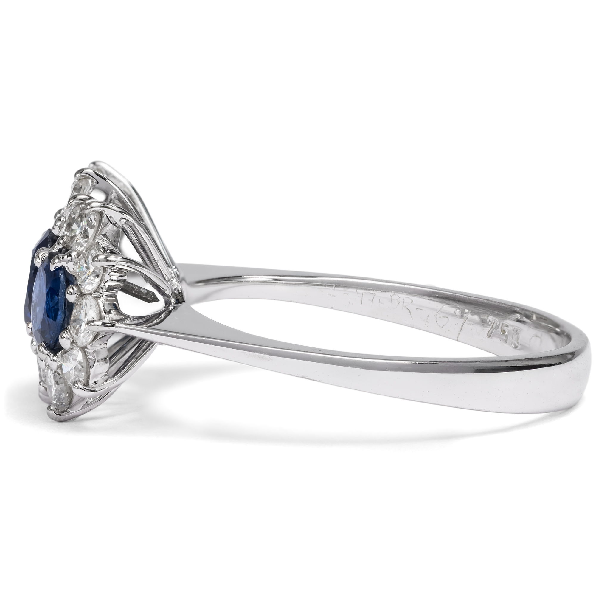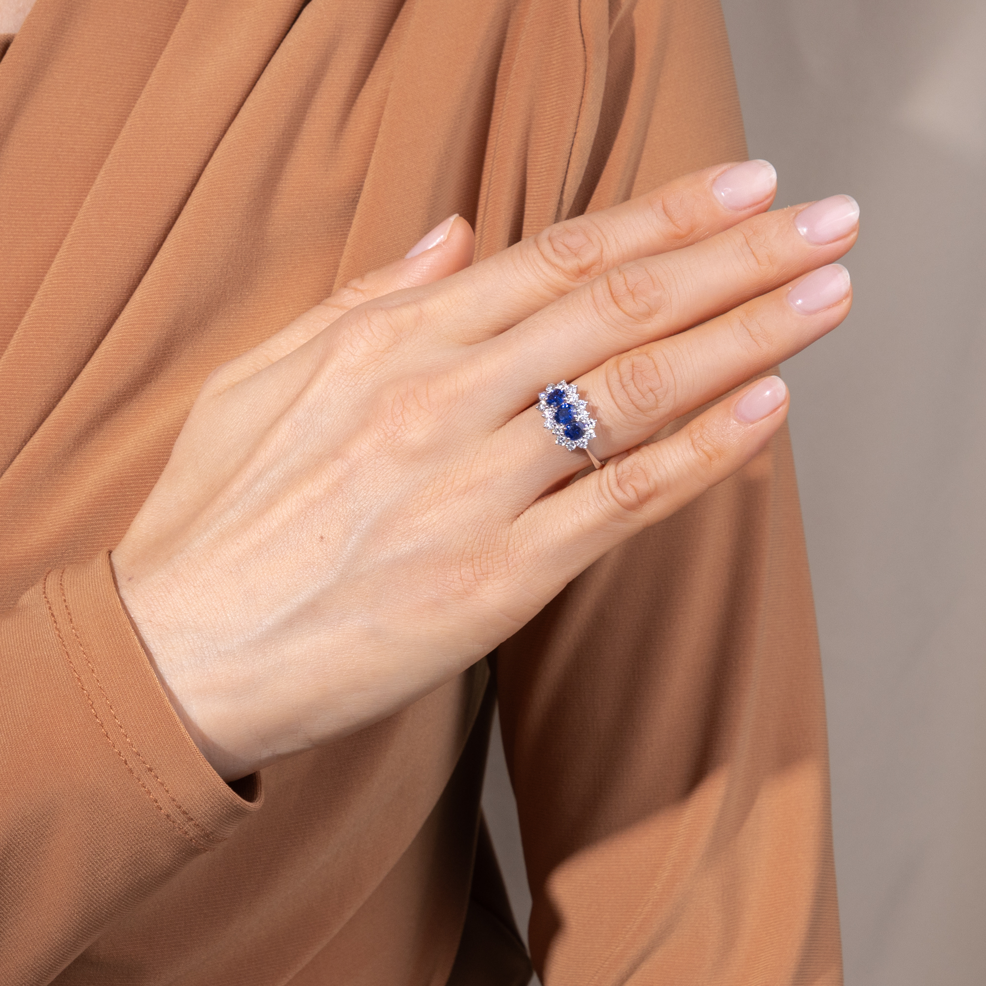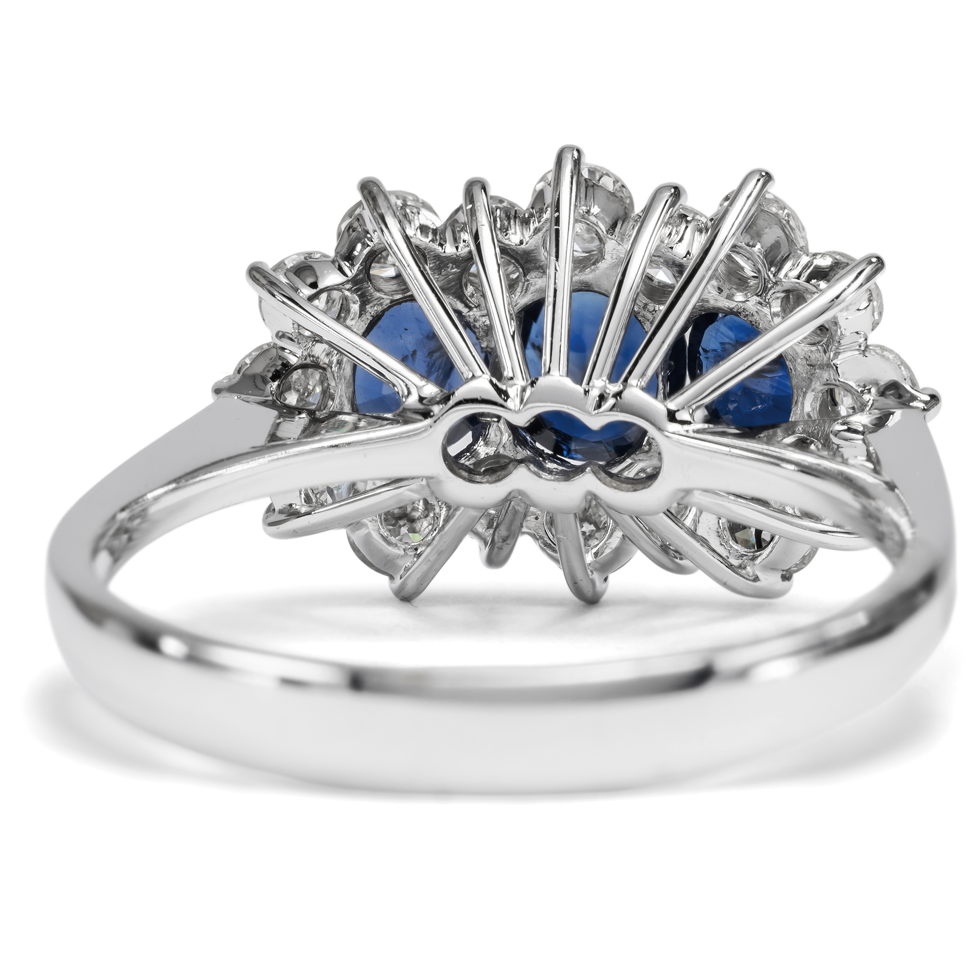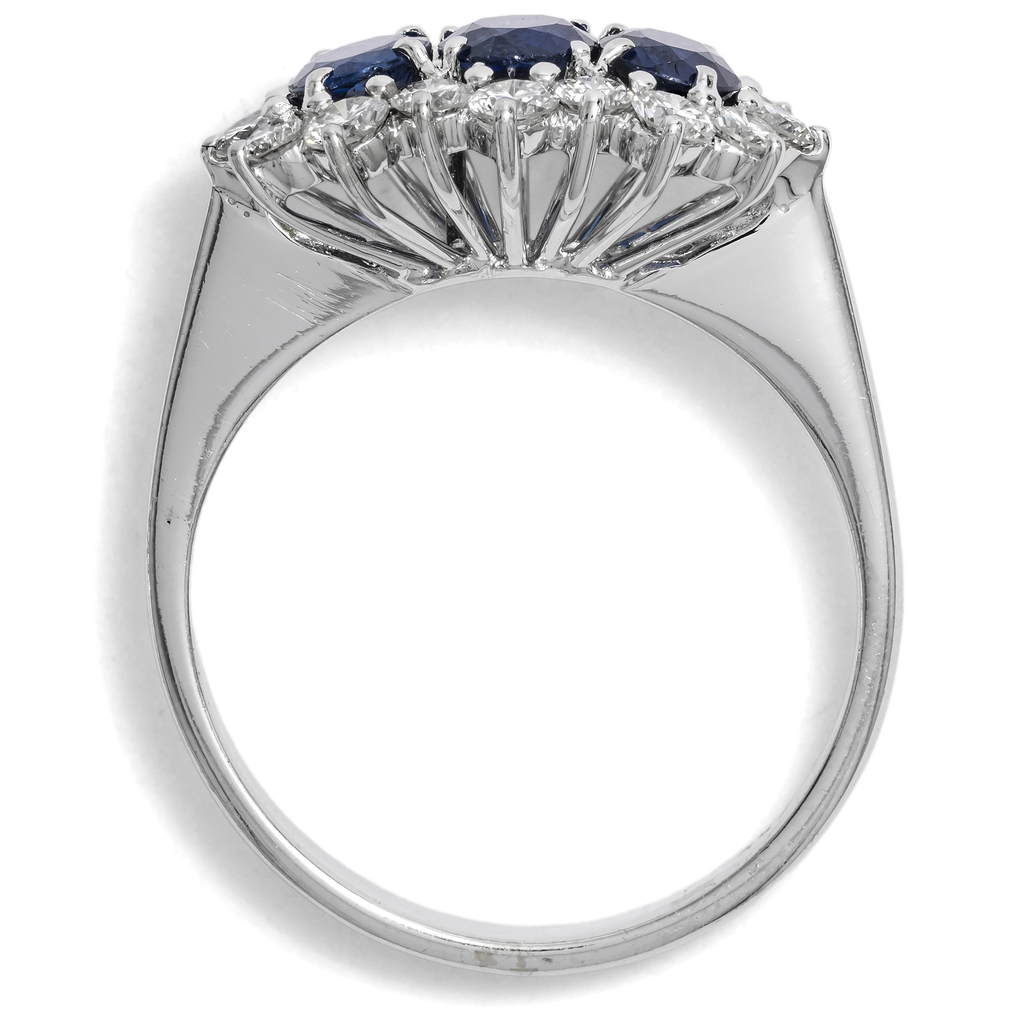 This ring is a typical piece of jewellery from the 1970s. The special feature of many designs from this period is the ever new and often unusual shapes: As a variation on the classic "trilogy ring", this piece also features a clear, modern design that clearly stands out from the jewelry creations of the previous decades. Three deep blue sapphires form the radiant centerpiece. They symbolize the past, present and future - the shared path of two people. They are surrounded by sixteen fine white diamonds. The gemstones are set in high-carat white gold; an undercut of fine bars allows plenty of light to reach the stones and gives the ring a light, elegant appearance. Sapphire has always been attributed with special qualities. In the Middle Ages, it was considered a stone of sincerity and protection, while Giacinto Gimma associated it with Venus and the stars in his Storia naturale delle cameo in 1730. This ring, with its bright blue sapphires and the white sparkle of the diamonds, is also reminiscent of a clear, nocturnal celestial landscape. The beautifully preserved ring combines classic symbolism with the clear design language of the 1970s. An elegant piece of jewellery that can be worn day and night.