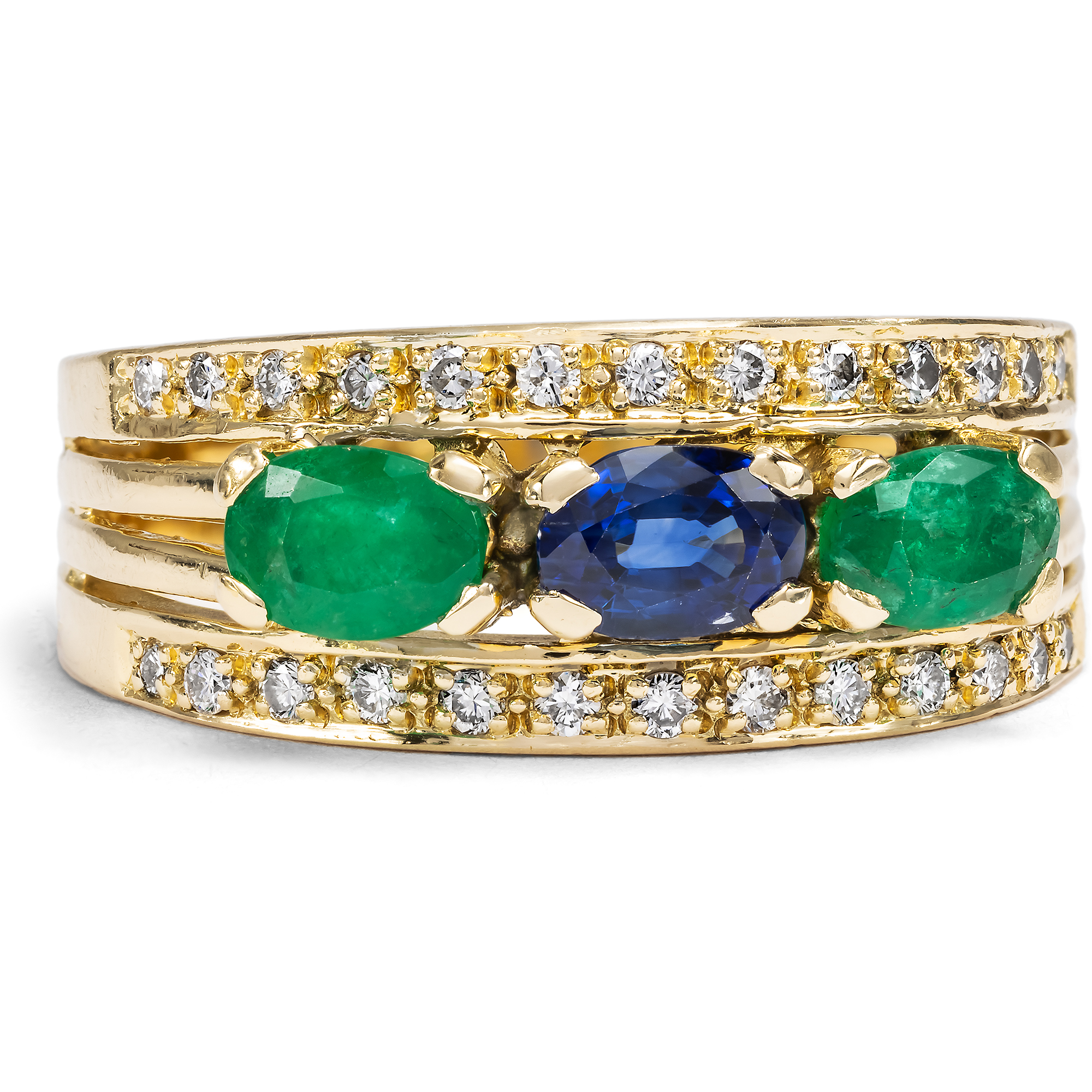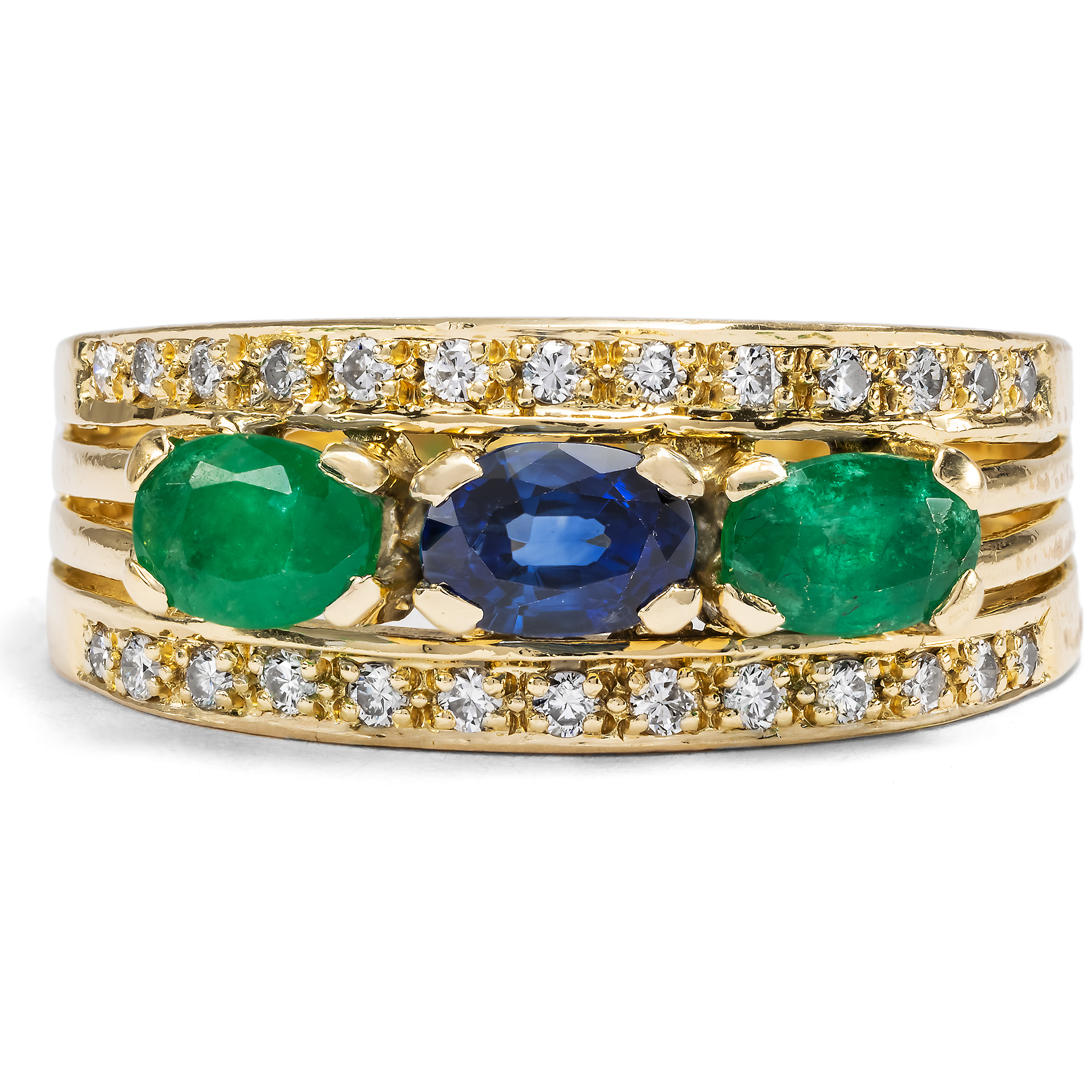 This luxurious ring from around 1985 combines color and precision craftsmanship in perfect harmony. Forged from solid 18-karat yellow gold, it bears three precious gemstones on its wide shank, which come together in radiant beauty: a deep blue sapphire takes center stage, accompanied by two intense green emeralds. Their interplay is accompanied by sparkling diamonds, whose clear light enhances the brilliance of the colored stones. The colored stones are set in fine chatons, while the diamonds are set in the gold with small grains. The powerful design language, the joy of color and the compact appearance make the ring a piece of jewellery typical of the 1980s. The ring was made in the renowned Pforzheim jewelry manufactory Georg Leicht, which is known for its outstanding workmanship and selection of the finest materials. The result is a piece of jewellery with lasting elegance that is both powerful and luxurious. A colorful companion that combines quality and beauty.