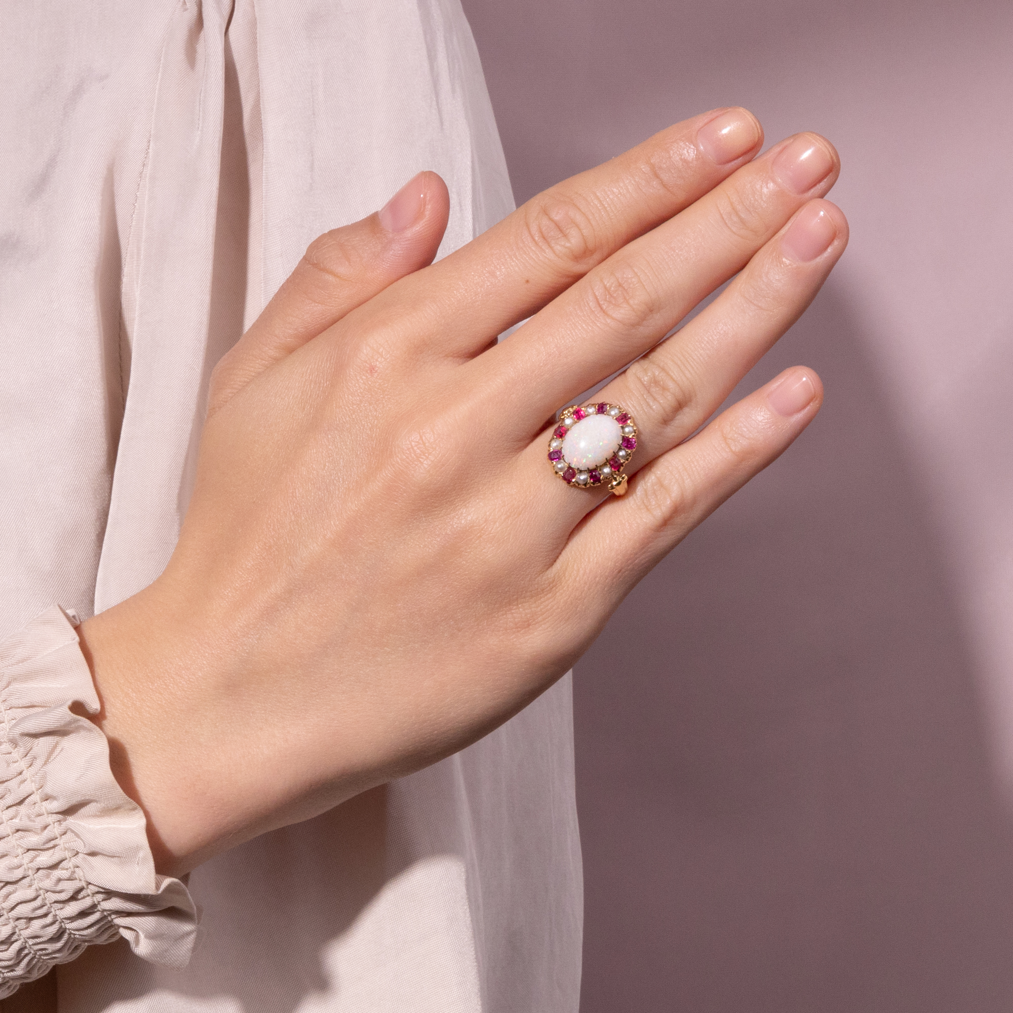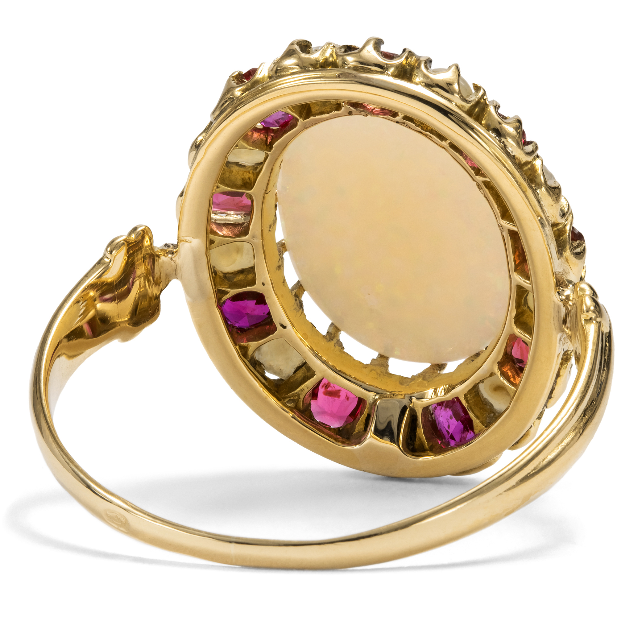 The opal experienced a surge in popularity towards the end of the 19th century: every lady who could afford it wanted to come into possession of such a dazzling stone. The displays in jewelry stores now featured rings, necklaces and brooches that showcased this stone in a wonderful way. However, as each opal is unique due to its play of colors, different ways of highlighting it were invented. A popular variant in the 1890s and early 1900s was to highlight the dominant color reflections by surrounding them with colored gemstones: "A pretty way of setting an opal which has strong green lights is the surrounding of It with a circle of tiny emeralds ... The colored stones appear to reflect their own colors in the opal", reported one in 1903. The opal in this late 19th century ring has wonderful pink reflections that play on the milky background with every movement. Iridescent shades of green flash between them. In order to emphasize the pink on a milky background, it was decided to highlight the opal with an entourage of raspberry-coloured rubies and pearls. The alternating sequence of the entourage is also an artifice of the 1890s that helps us to date the ring. We were able to discover this equally beautiful and unusual piece of jewellery in France. A French hallmark on the shank proves that the ring was imported to France more recently. It was probably made in Great Britain. The quotation from [Anon.], 'Something About Opals', The Rochester Post Express, February 11, 1903, p. 5.