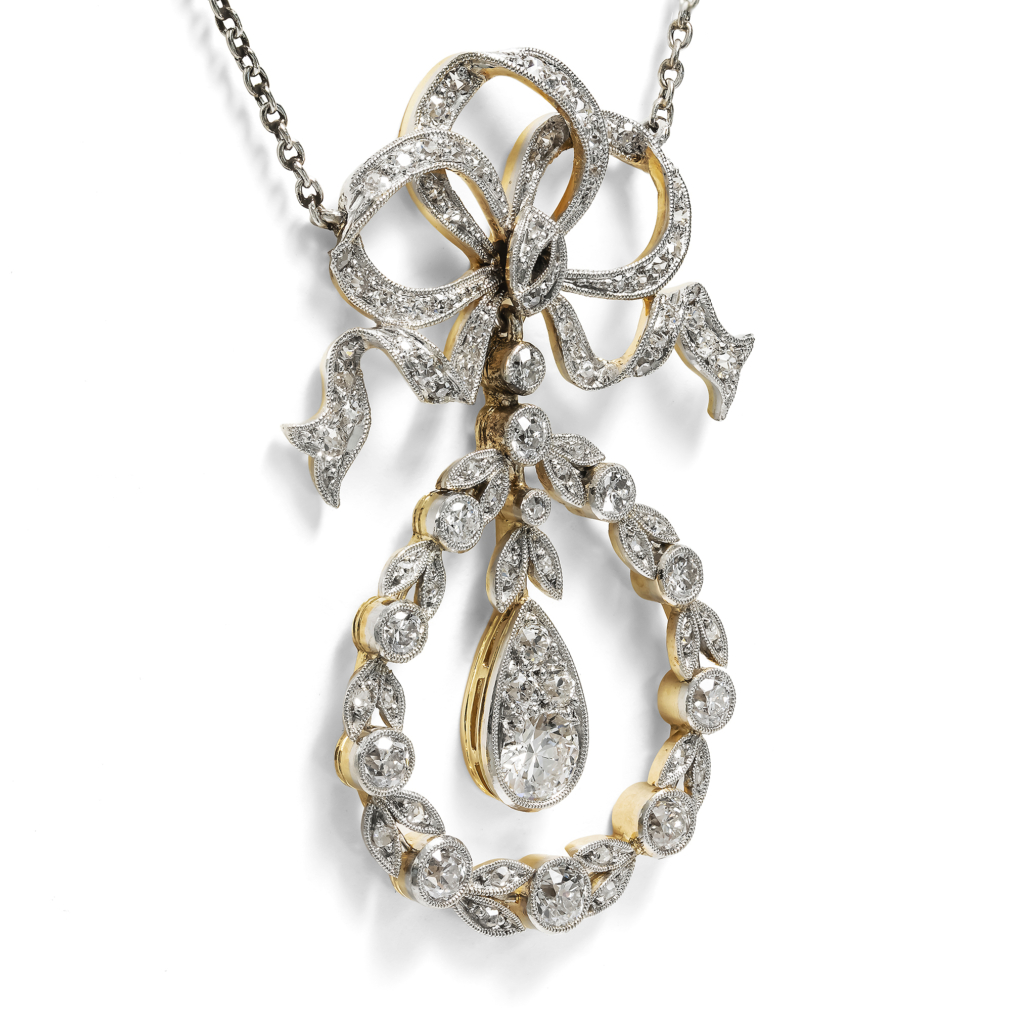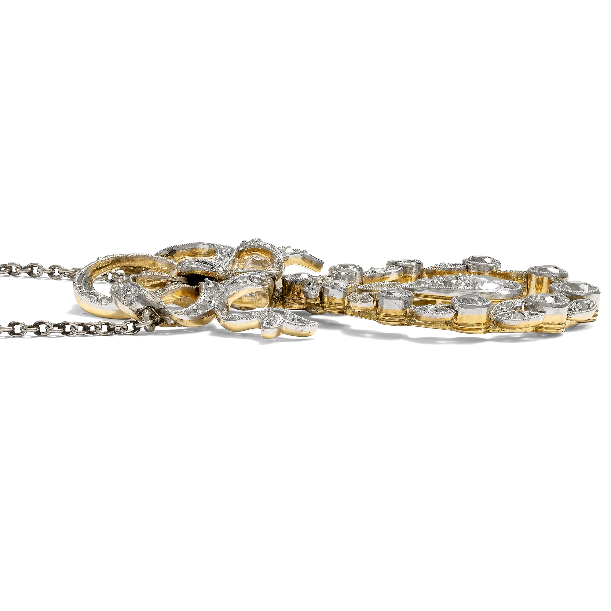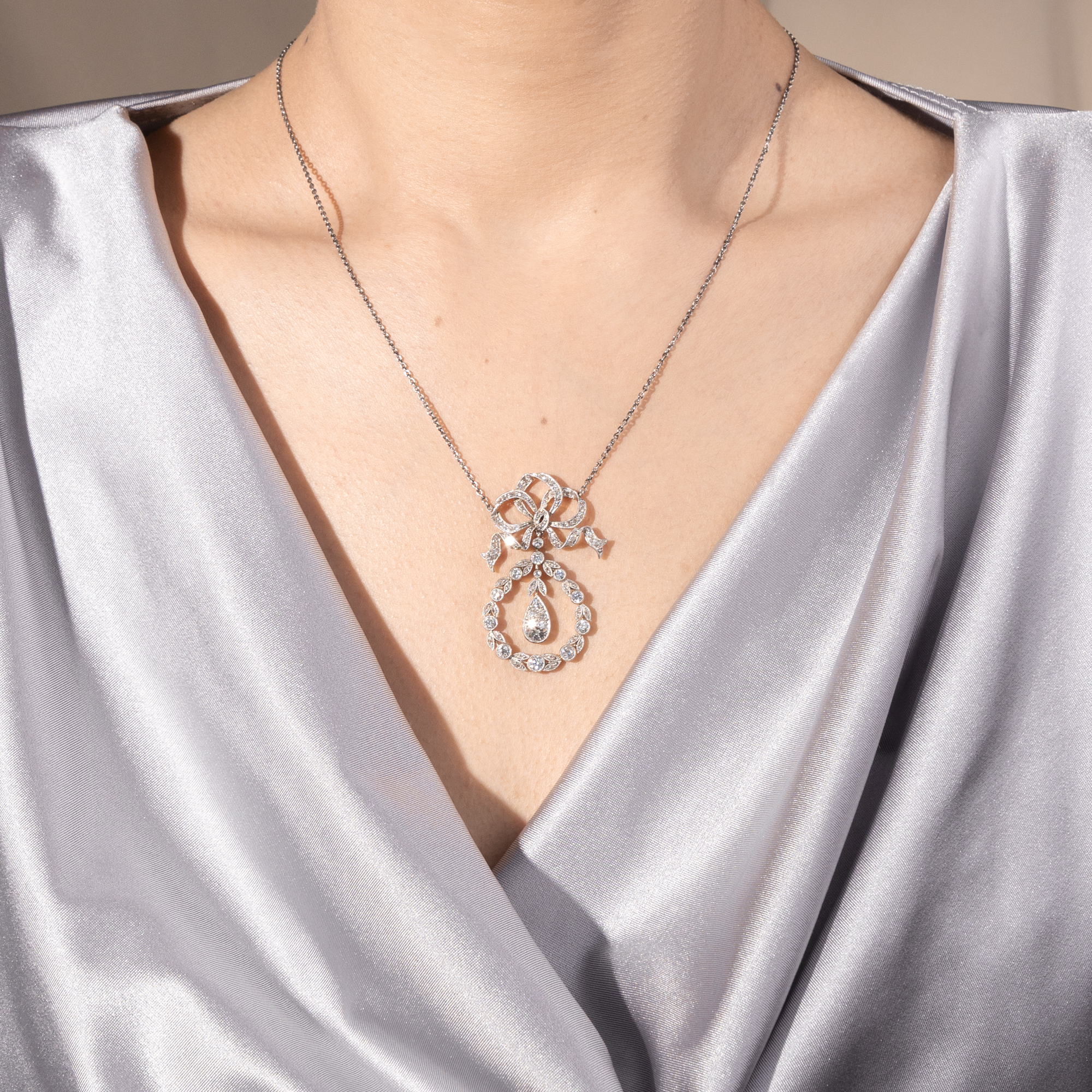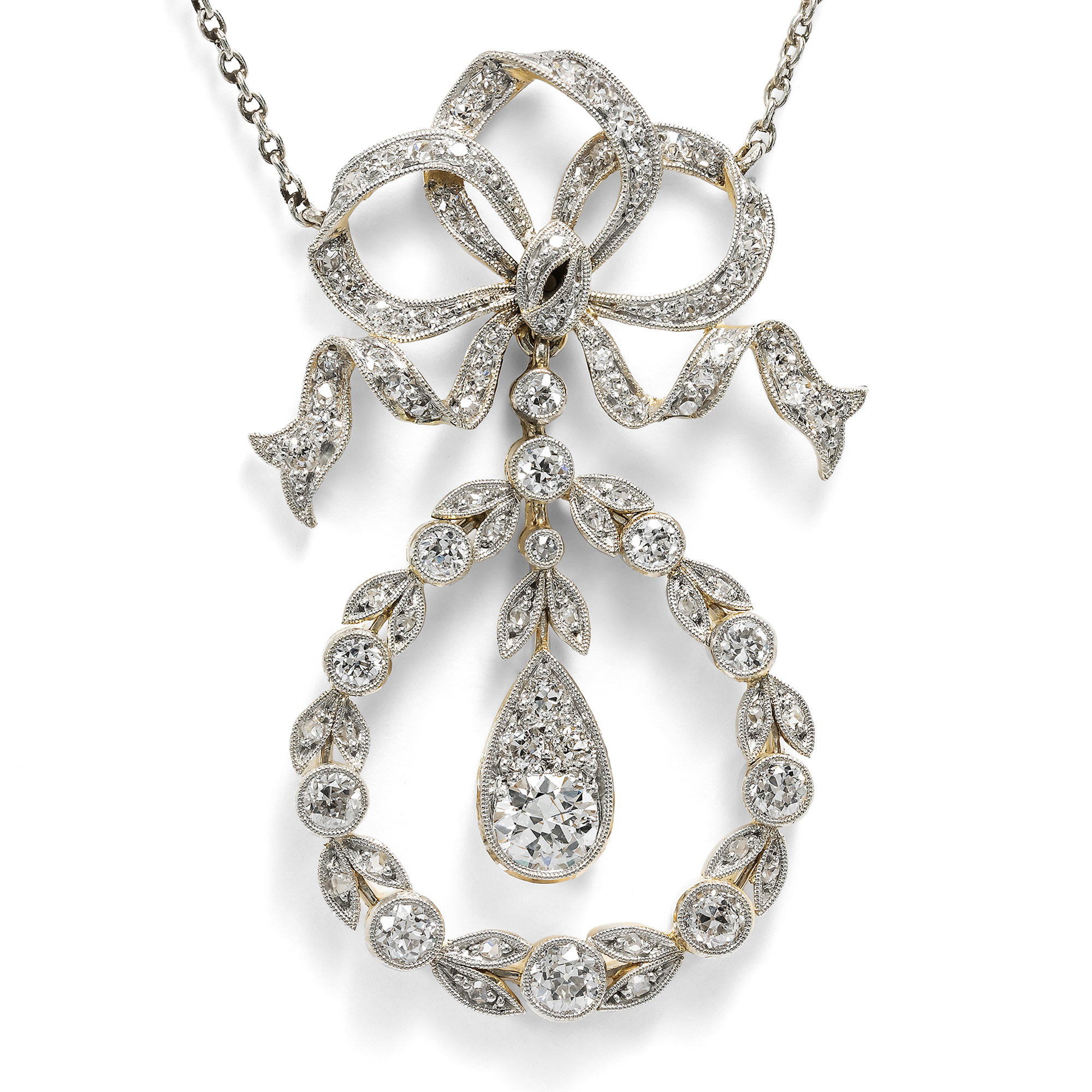The years shortly after 1900 brought a new style to the world of jewellery with the so-called "Garland Style", which contrasted Art Nouveau with a more classical, refined style. Borrowings from Louis XVI forms and fine motifs from classical antiquity enlivened a neoclassicism that valued small, delicate laurel leaves as much as meticulous festoons, large bow motifs and embellishments with tiny milgrains. The pieces of jewellery in this style are almost always characterized by a precision of execution that matches the delicacy of the designs. The precious stones are set in the finest platinum and gold settings with a master's hand; delicate movable pendulums and cleverly changeable functions still delight the connoisseur's eye today. What's more, these special jewels in white radiate an unearthly seductiveness, a little otherworldly and therefore particularly luxurious. This is a beautiful example of this style of jewelry. It consists of a finely crafted showpiece that is attached to a delicate platinum anchor chain. A large loop set all over with small old-cut diamonds, which appears to be loosely tied, holds a sparkling wreath of larger, bezel-set old-cut diamonds and rose-cut diamonds. A pendulum is movably mounted in it, presenting the largest diamond of the jewel, which is visually extended by smaller diamonds to form a drop. A total of 90 diamonds in historic cuts have been set and shine particularly brightly and brilliantly thanks to their platinum setting. The necklace exemplifies the design language of the Garland style, which dominated the early years of the 20th century. It came to us from Munich, is in very good condition and can still be worn excellently even after more than a century.