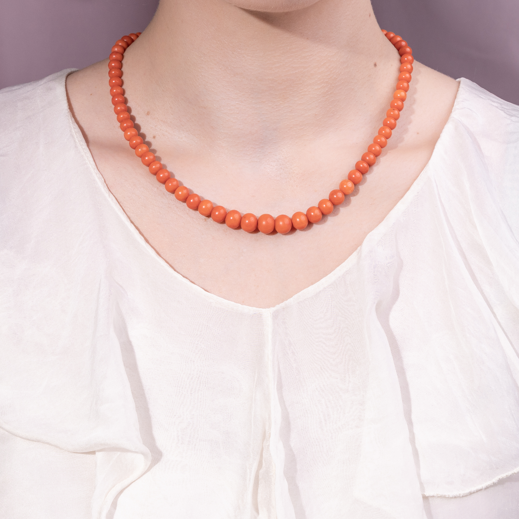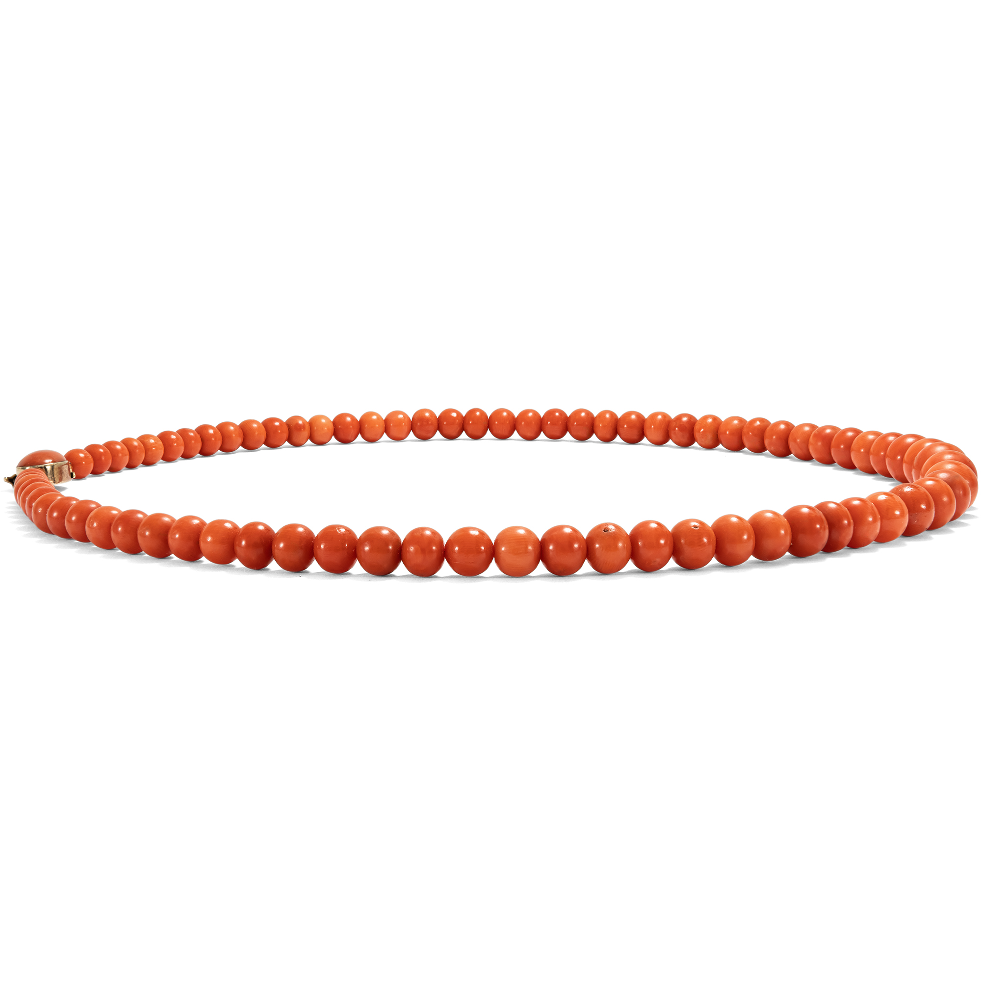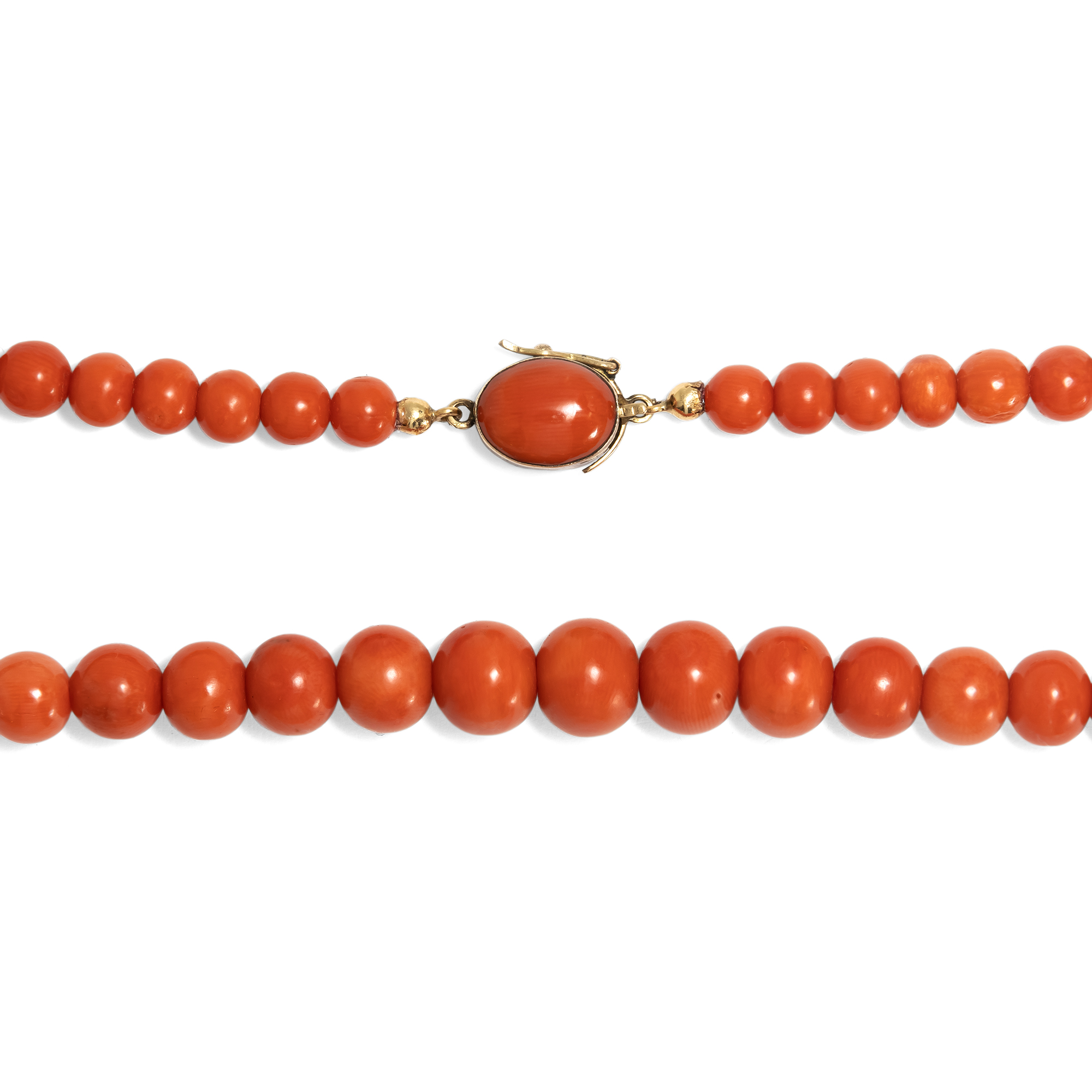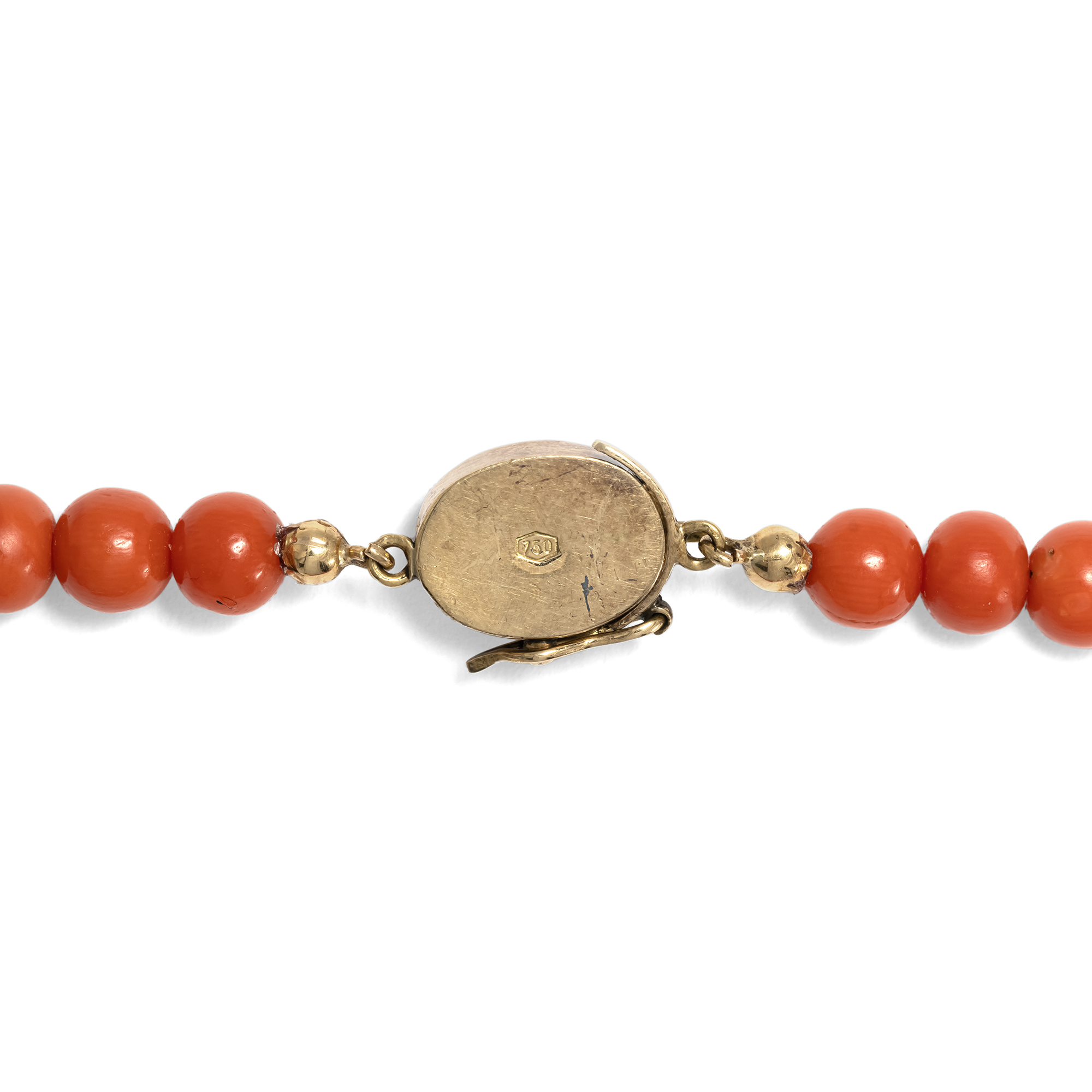 The delicious ice cream made from Italian lemons has long since been eaten, and the days of the wonderful vacation in Sorrento have been blown away by the warm wind. But these natural corals from the Mediterranean retain the memory of the sun-drenched south - of the sparkling sea, the scent of lemons and the gentle sound of the waves beneath the cliffs of Capri. The necklace is made from particularly beautiful, salmon-colored precious coral from the Mediterranean. Its 75 hand-cut pearls are threaded in a harmonious graduated pattern and end in a large coral bead measuring almost ten millimetres in diameter. The corals show a slight play of colors and sometimes very small irregularities on the surface, which identify them as a natural product and also prove that the corals have not been dyed or treated in any other way. The elegant clasp made of high-carat gold holds a coral cabochon and bears an Italian hallmark that proves it was created after 1968. A fine detail that reveals its origin and the quality of its craftsmanship. We believe that the necklace was created only a little later, in the years around or shortly after 1970. We restrung the necklace and carefully renewed the pearl silk. Now it is back in all its beauty - a piece of Mediterranean sunshine that has found a new home in Berlin.