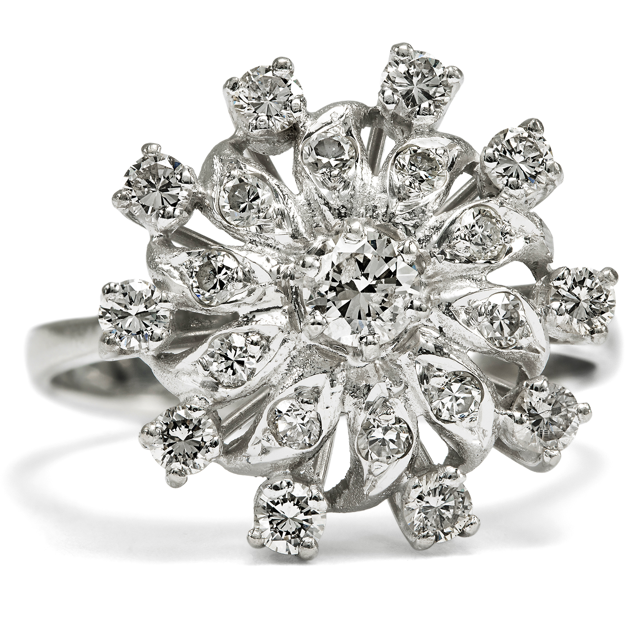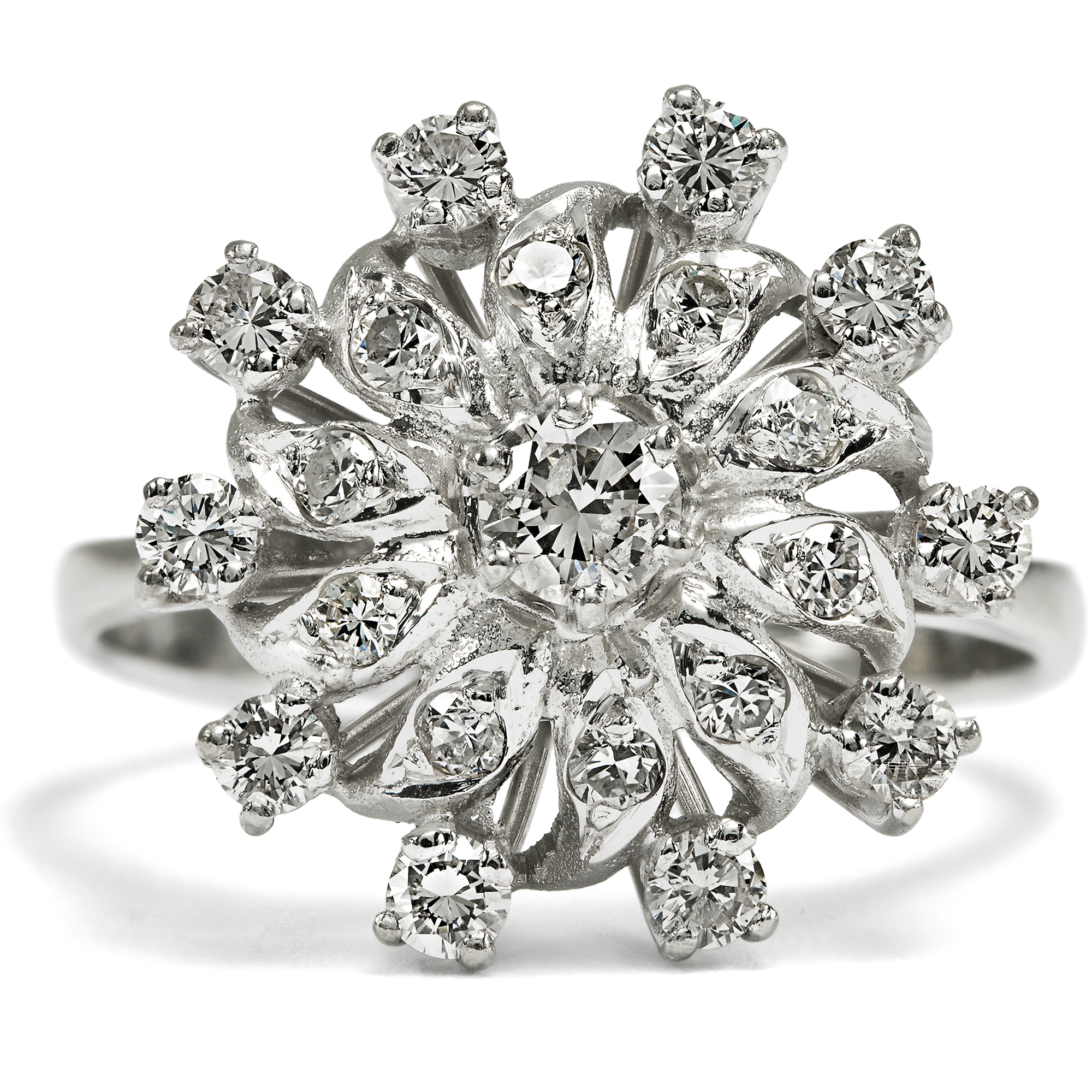 What had begun in the 1960s as a game with textured metal surfaces finally developed into a design language around 1970 that used traditional materials and left all familiar shapes and patterns behind. The age of technological progress thus also reached the field of jewellery: the "Space Age" was the inspiration behind the modern designs of the time. White metals reminiscent of the gleaming struts of satellites, futuristic abstractions and cosmic-looking diamond constellations characterized the designs of the time. This is also evident in this ring. A brilliant-cut diamond of 0.16 ct forms the center of the design as a solitaire. A double wreath of twenty further diamonds forms the end of the ring face, reminiscent of a glittering star or a frosty ice crystal. The simple rail complements the almost sculptural impression of the ring, giving the piece of jewellery a surprisingly modern look. The ring is crafted from high-carat white gold, the preferred precious metal of the time. The ring is an expressive example of the jewellery fashions of the 1970s and at the same time captures the current events of the years in which it was created. As a child of its time, it presents the diamonds in an unusual and original way.