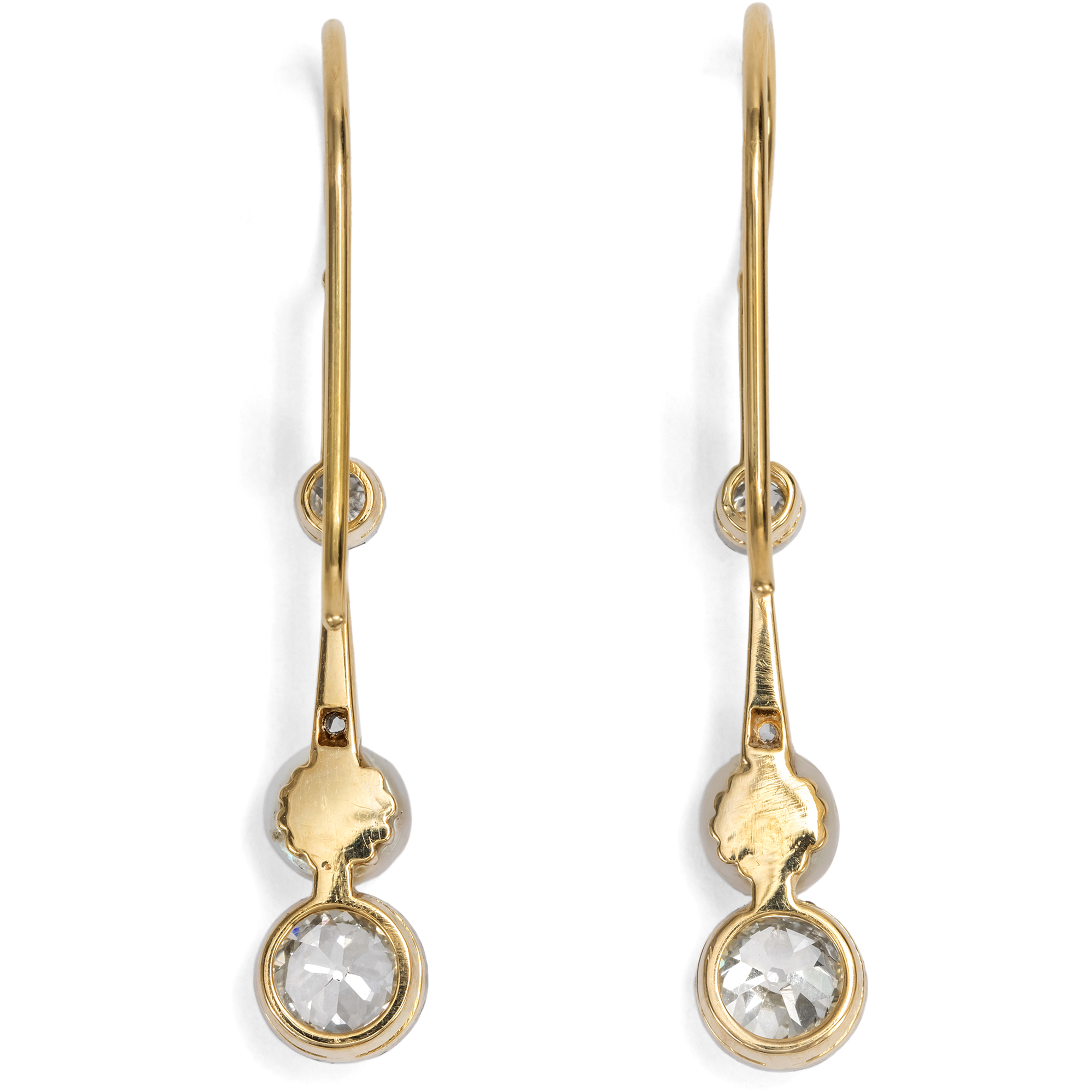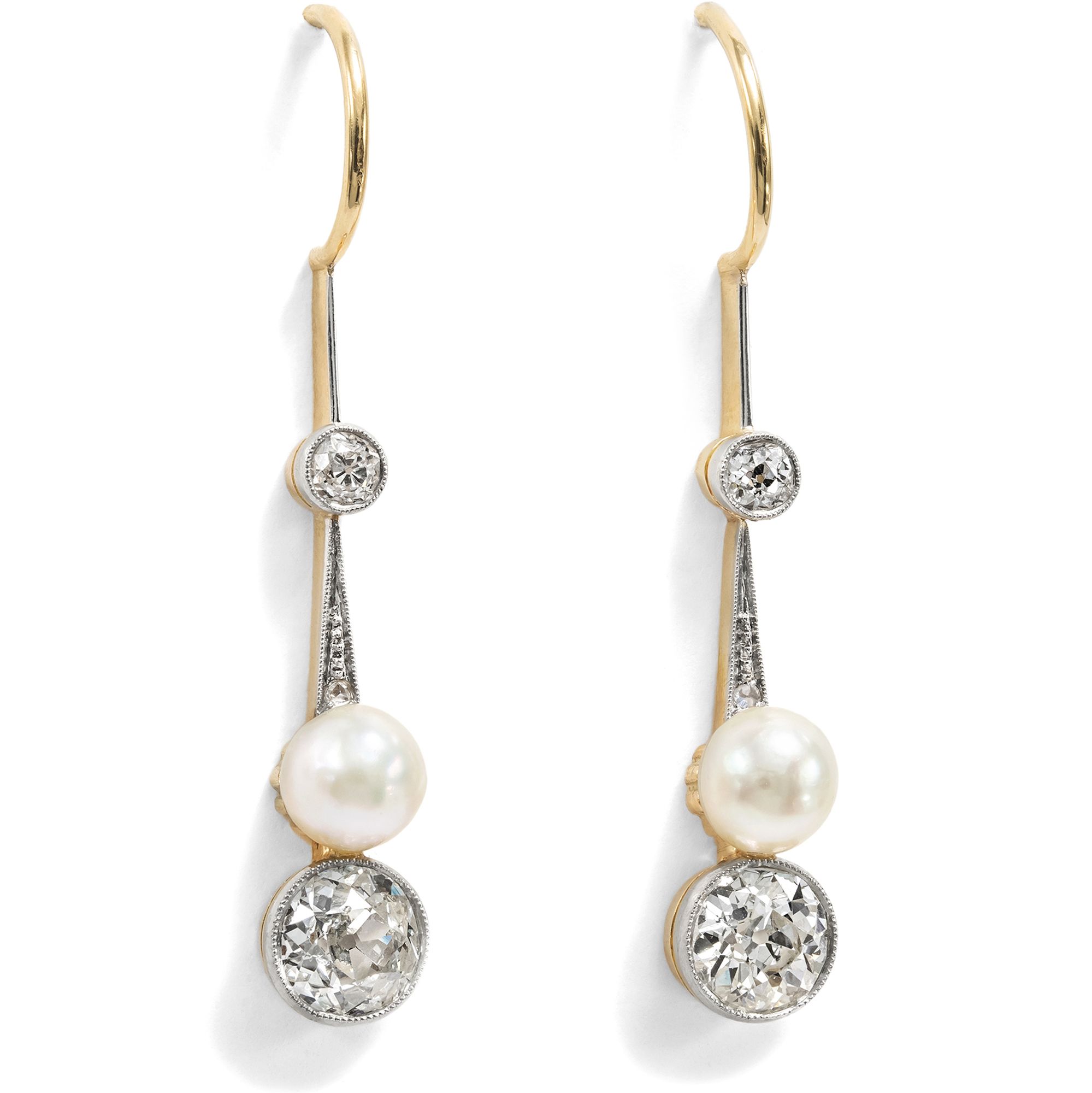 Sometimes, on our way through antique stores, auction houses and small flea markets, we come across individual pieces that are far too beautiful to go unnoticed, even if they have long since lost their original function. They are remnants of past elegance, silent witnesses of an earlier time, waiting to be worn again. We pass such finds on to our goldsmith. For him, they are small treasures that awaken his imagination and from which he creates new, vibrant pieces of jewellery. This is how this pair of earrings was created. The starting point was a fragment of an old diamond bar brooch, whose sparkle immediately enchanted us. This historical element was carefully incorporated into a new design. Two generous gold hoops support filigree bars, the front sides of which are made of platinum. Each of the small bars is set with three sparkling diamonds and a delicate oriental pearl. The two large old-cut diamonds together weigh around 1.10 carats and impress with their individual character and vibrant fire. The result is a pair of earrings that combine past and present in a particularly beautiful way. Unique pieces in classic white, full of charm and with that touch of history that makes a piece of jewellery unmistakable.