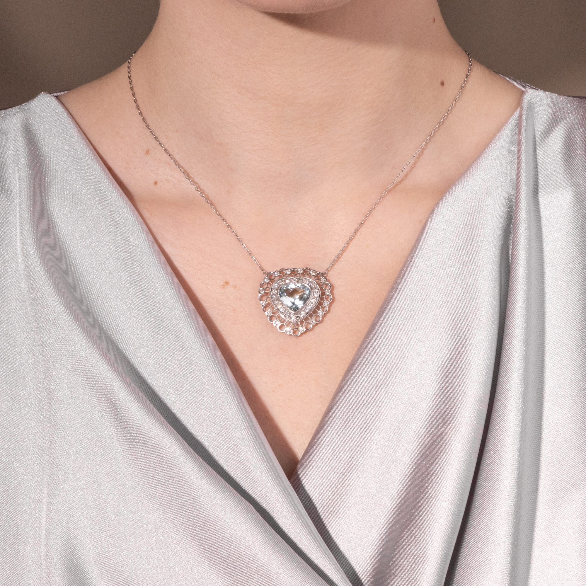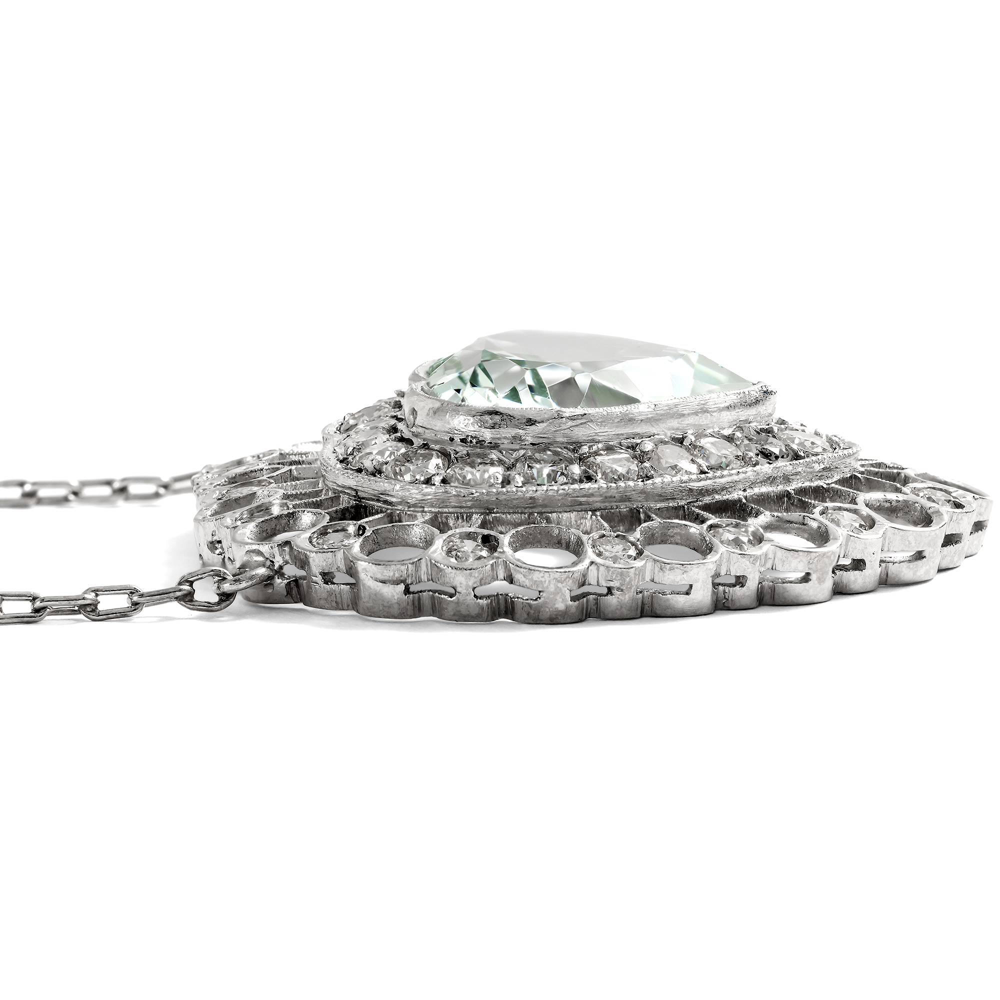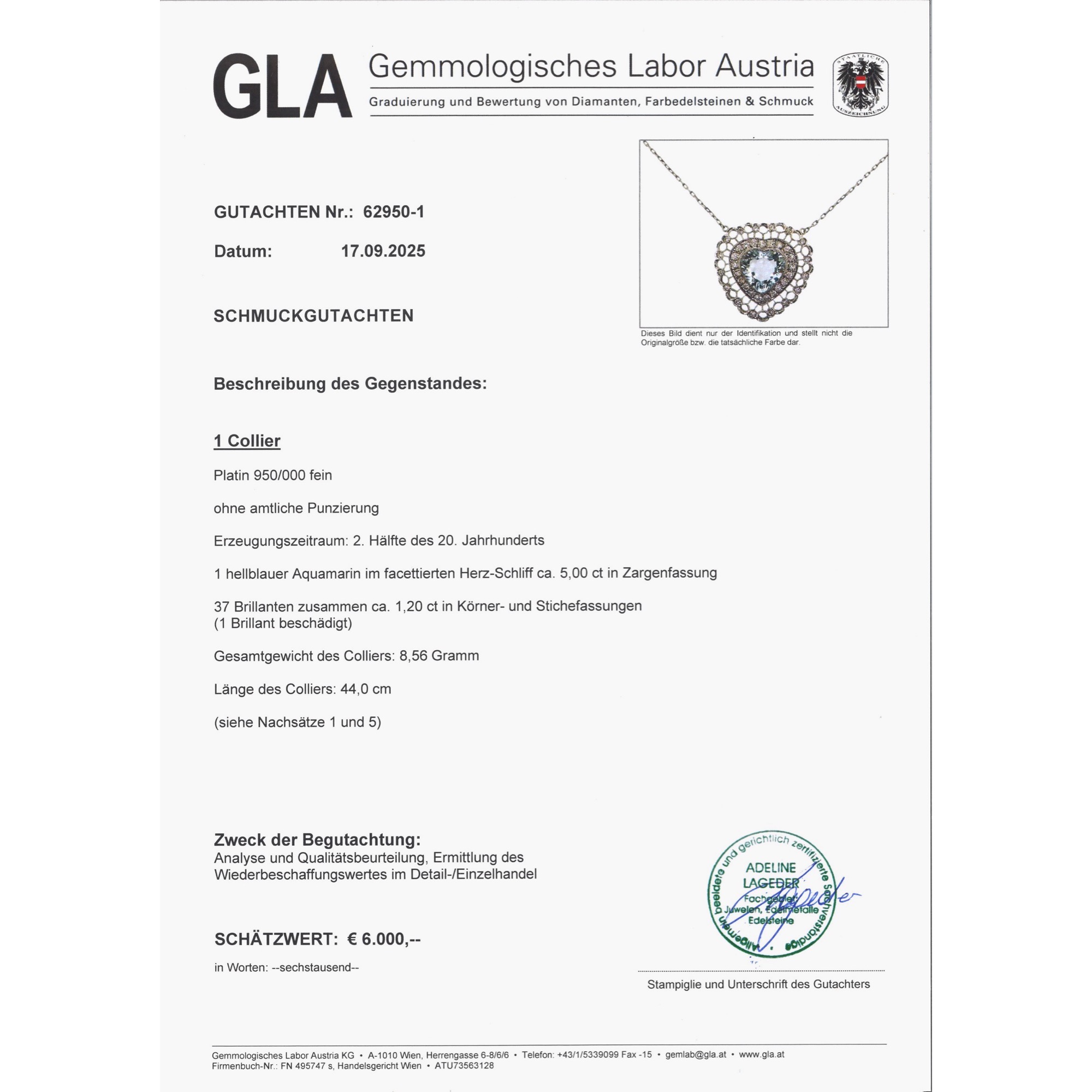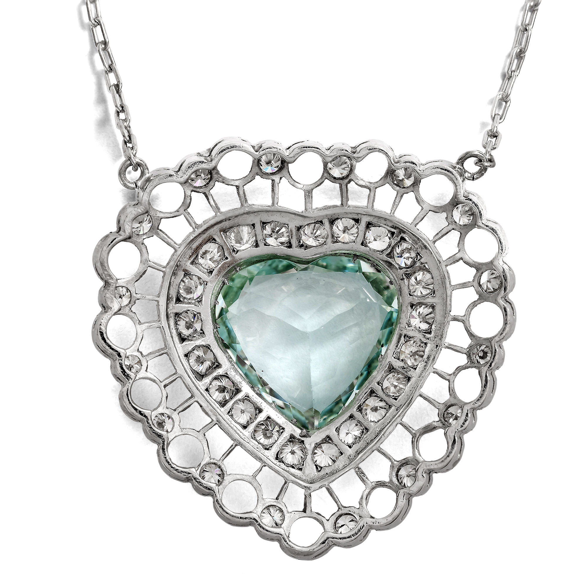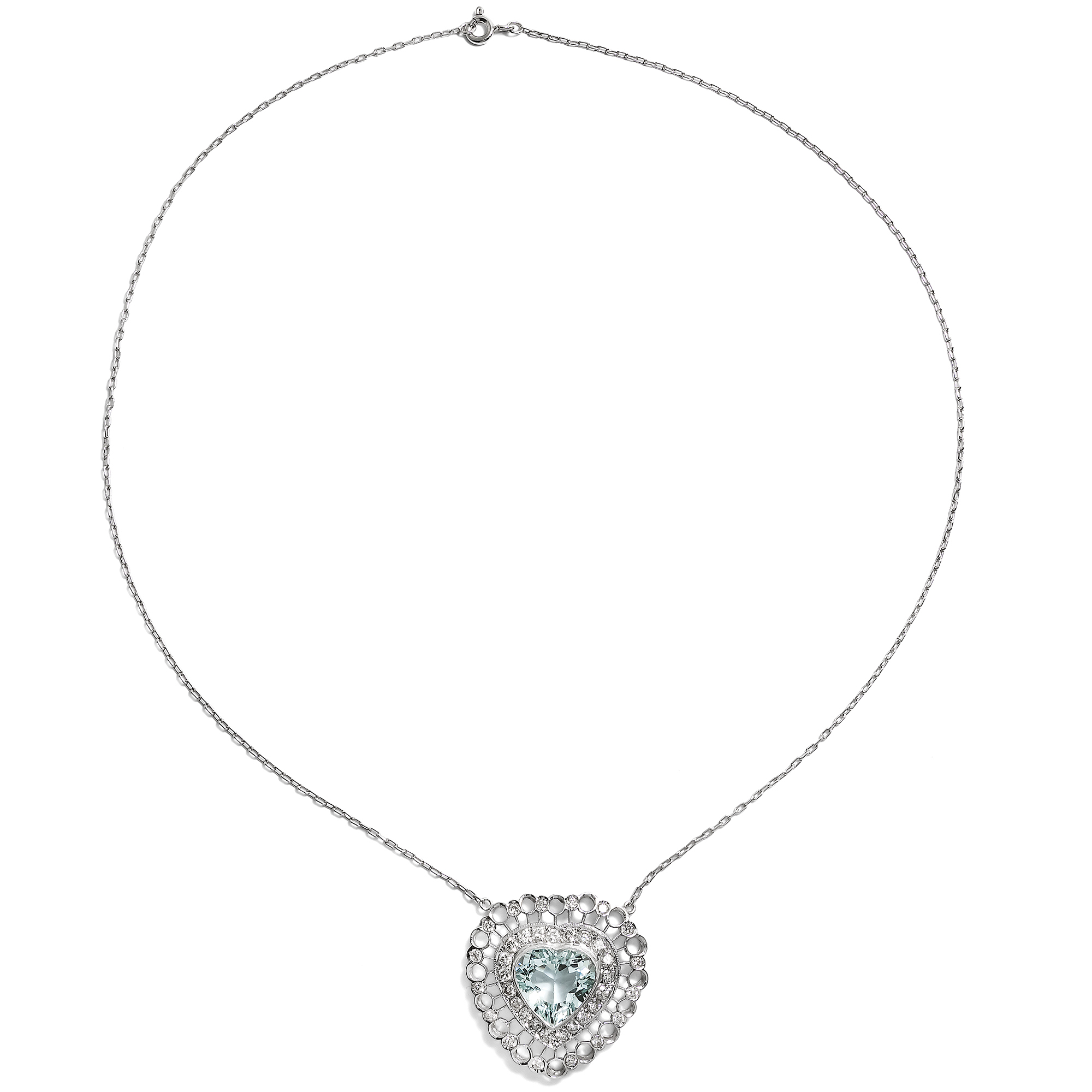 There have been compelling, beautiful and enchanting jewelry designs in every era. However, when it comes to refinement and elegant delicacy in design and implementation, no era has produced such magnificent jewelry creations as the Belle Époque, those final, brief years before the outbreak of the First World War. At the height of this "beautiful era", pieces of jewellery were created that are still unparalleled today. It is therefore no wonder that these designs have repeatedly served as a model for pieces of jewellery from subsequent eras. This necklace tells the story of an era in which lightness, romantic feelings and self-confidence went hand in hand. The firmly mounted heart pendant is artfully open-worked - light but with an impressive presence. An aquamarine of around five carats sparkles in the center, clear and light blue like the sea in sunlight. It rests in a filigree meshwork of platinum, surrounded by 37 precisely set diamonds with a total weight of around 1.20 carats. The piece of jewellery breathes the spirit of the Belle Époque, but it was created much later, in the 1980s. Its previous owner had it made in Hamburg based on historical models. It is accompanied by a detailed expertise.