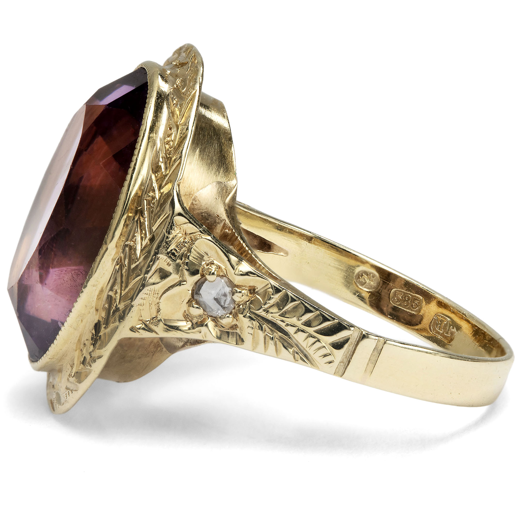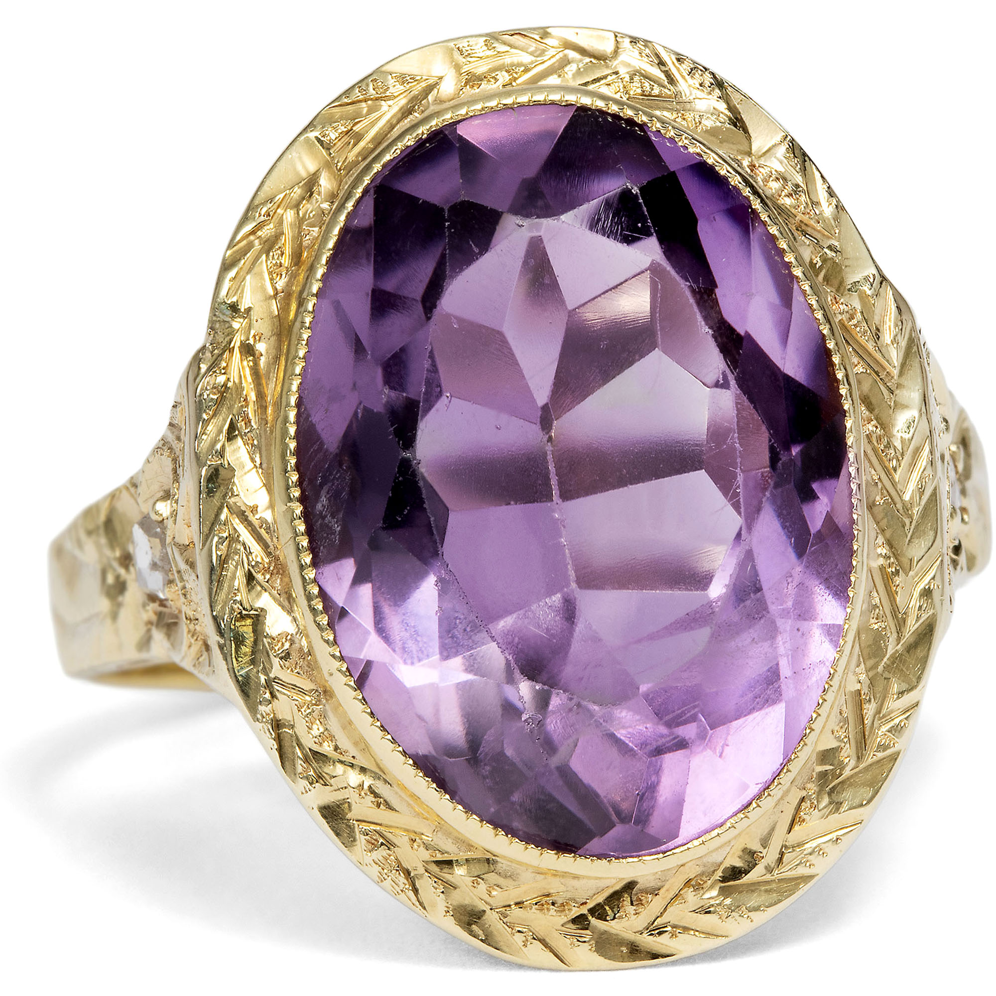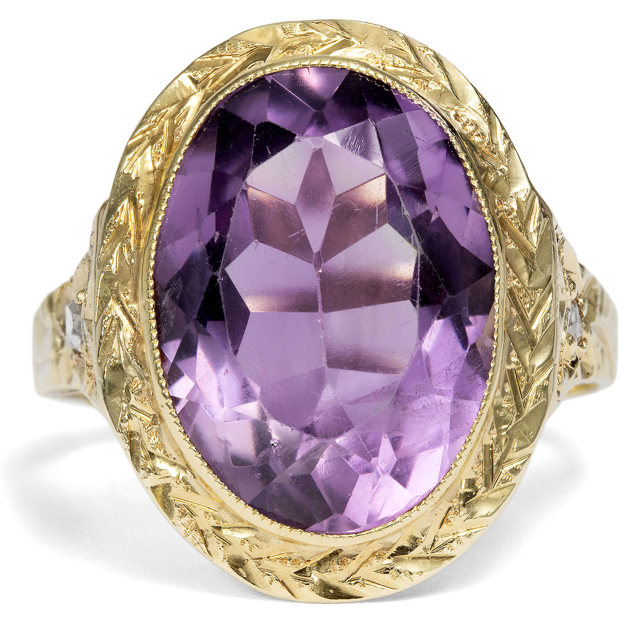 As in art and fashion, jewellery in earlier times also repeatedly returned to older, bygone eras and reinterpreted their forms in the spirit of their own time. In the 1930s, for example, the clear lines of Art Deco were accompanied by a fashion that drew on the 19th century, particularly the forms of the Biedermeier and Neo-Baroque periods. This magnificent ring is a typical representative of this trend, in which Art Déco and Biedermeier form a nostalgic synthesis. The ring face presents a large amethyst in a beautiful lilac color. Two small diamonds enrich the ring shoulders. The framing of the center stone and the yellow gold shoulders are engraved with delicate flowers and leaf motifs inspired by pieces of jewellery from the 1840s, but reinterpreted in line with contemporary tastes. All the individual shapes and the magnificent overall design of the ring are typical of the 1930s. According to the hallmark, the ring was made in what was then Czechoslovakia. An opulent eye-catcher on the finger.