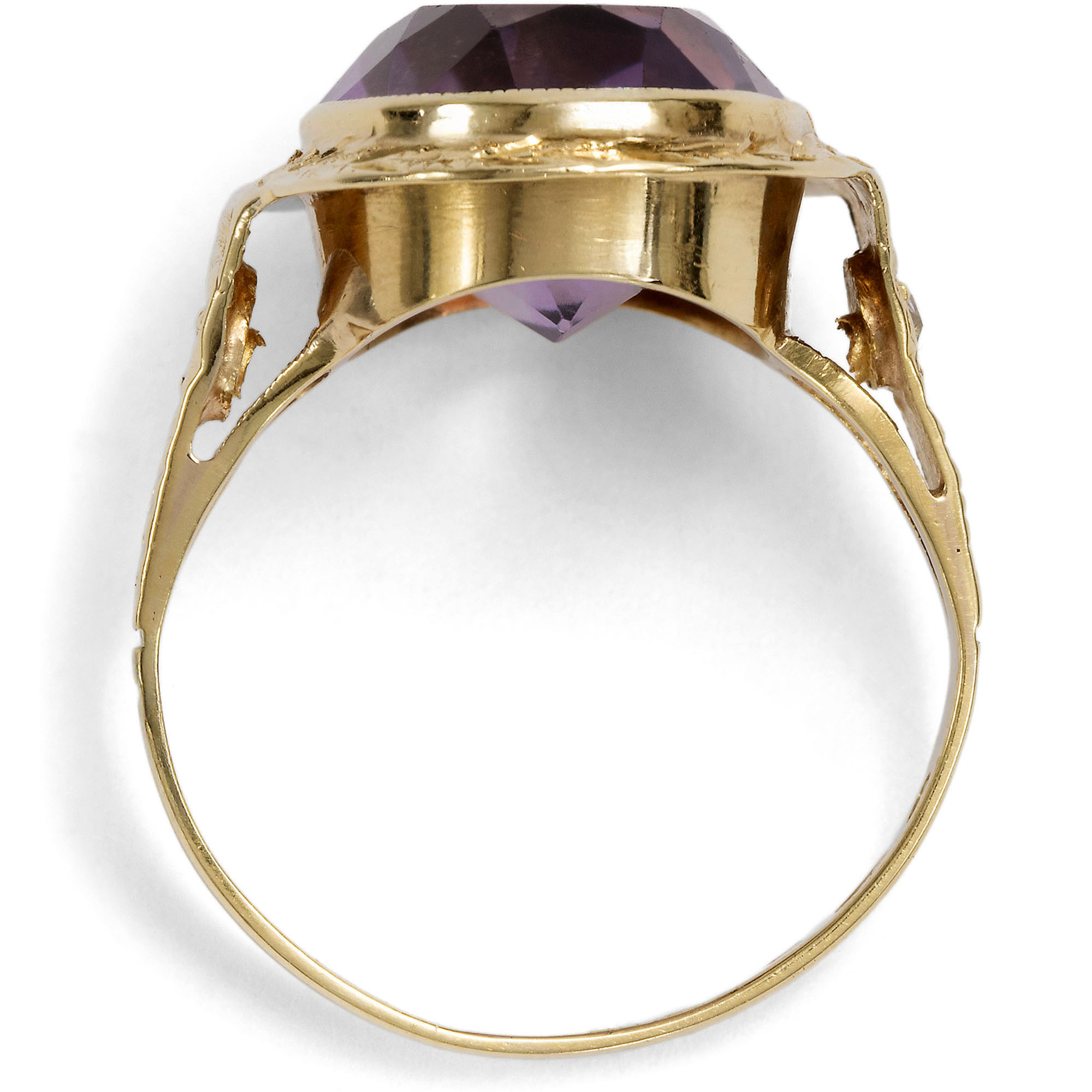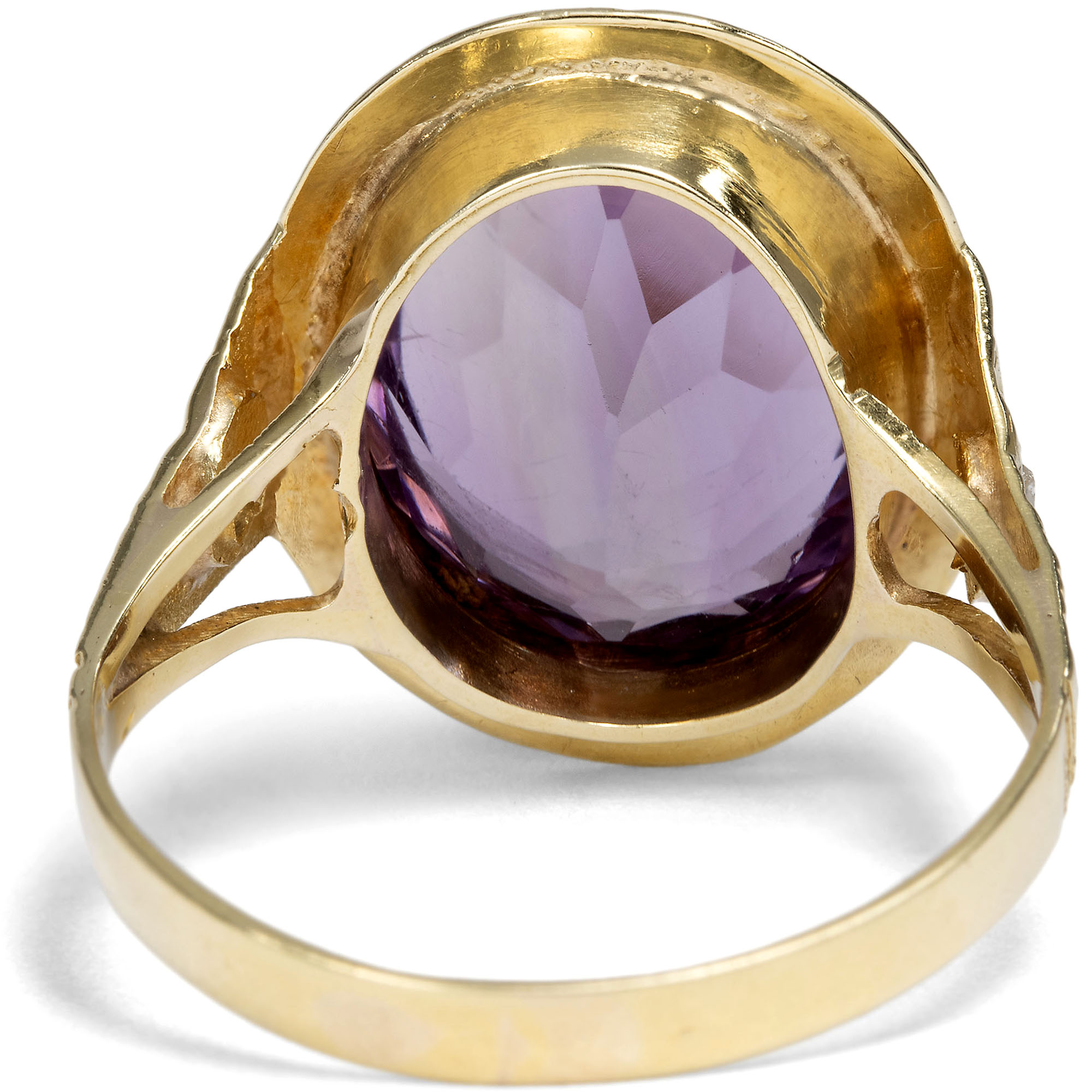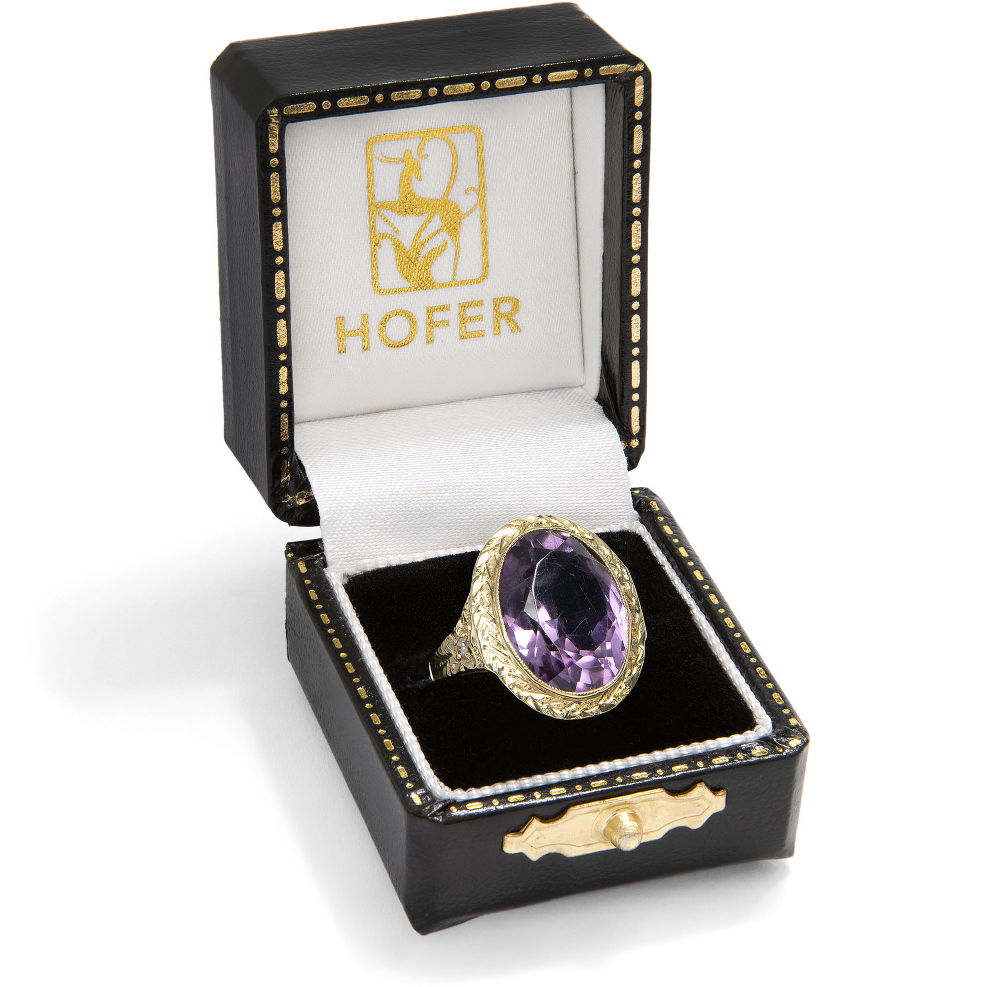 As in art and fashion, jewellery in earlier times also repeatedly returned to older, bygone eras and reinterpreted their forms in the spirit of their own time. In the 1930s, for example, the clear lines of Art Deco were accompanied by a fashion that drew on the 19th century, particularly the forms of the Biedermeier and Neo-Baroque periods. This magnificent ring is a typical representative of this trend, in which Art Déco and Biedermeier form a nostalgic synthesis. The ring face presents a large amethyst in a beautiful lilac color. Two small diamonds enrich the ring shoulders. The framing of the center stone and the yellow gold shoulders are engraved with delicate flowers and leaf motifs inspired by pieces of jewellery from the 1840s, but reinterpreted in line with contemporary tastes. All the individual shapes and the magnificent overall design of the ring are typical of the 1930s. According to the hallmark, the ring was made in what was then Czechoslovakia. An opulent eye-catcher on the finger.