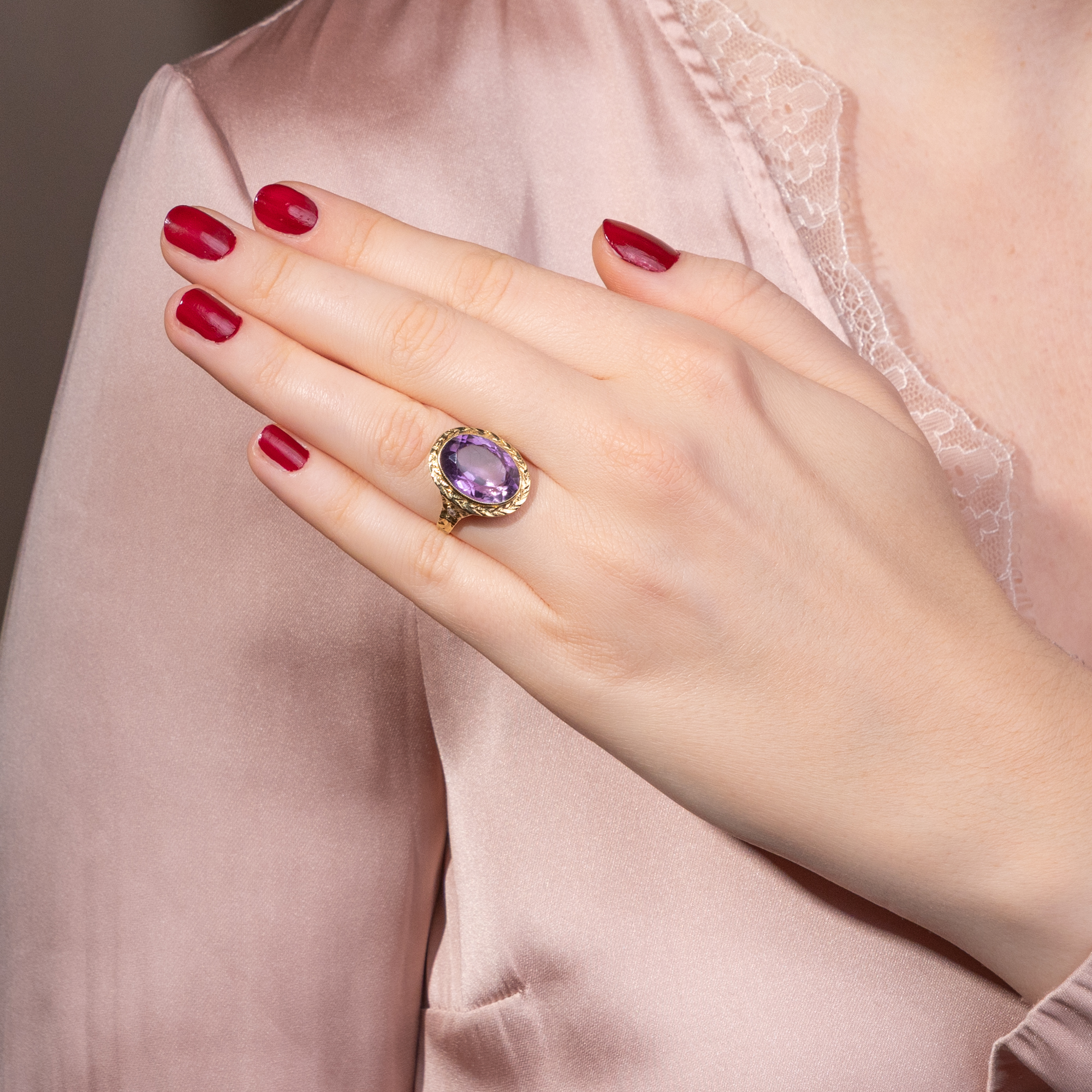 Opulent Art Déco Ring with Amethyst Set in Gold, Czechoslovakia, 1930s