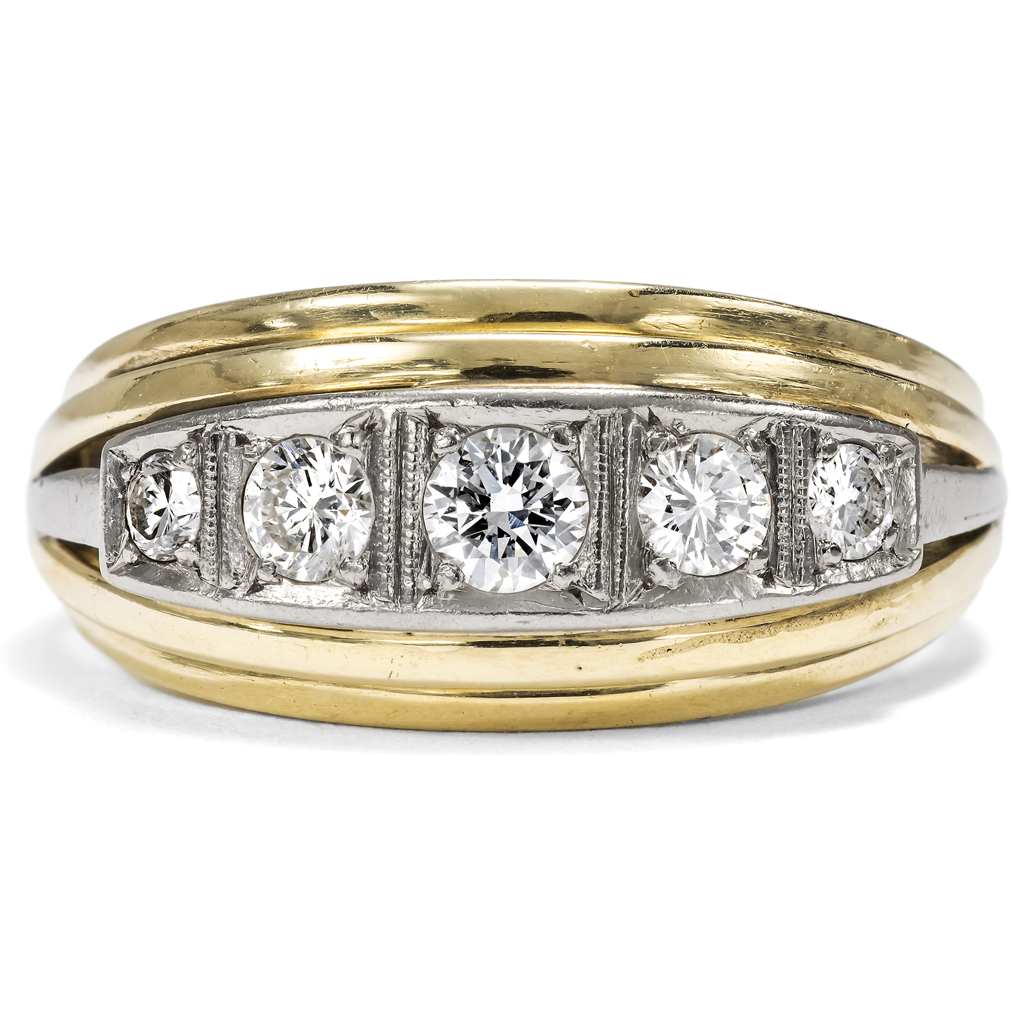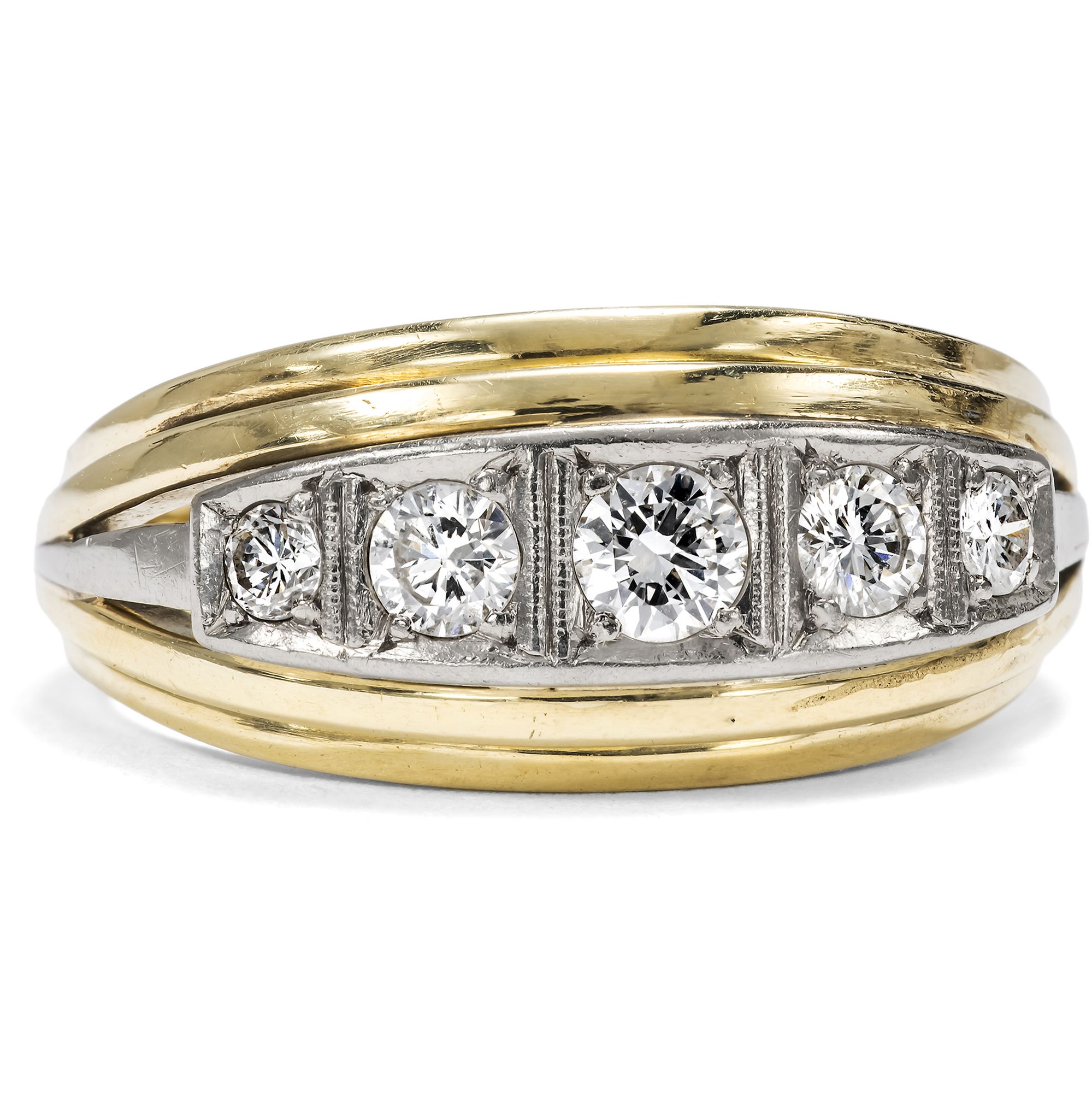 The first years of the young Federal Republic experienced a previously unseen increase in wealth and quality of life with the economic miracle. After the worries of the war, the store windows shone with a new luxury. Last but not least, jewellery and watches also served to visibly display the new joie de vivre to the outside world. The style of the jewellery of these years was often based on late Art Deco, the so-called retro style, which had dominated the designs of the major goldsmith companies since the 1930s, especially in the USA and France: rich decoration, clear geometries and an exuberant sparkle of high-quality gemstones dominated the picture. A sparkling row of five radiant diamonds of beautiful quality form the luxurious setting of this ring, which was created in the 1950s. The sparkling white stones are arranged across the finger and have a pronounced presence, which is further enhanced by the carré settings in white gold. The stones have a total weight of around 0.68 ct. On both sides of the white gold settings, the yellow gold of the ring steps down to form gentle arches. The ring is expressively crafted and perfectly combines its luxurious materials to create a successful design in the so-called retro style of the 1950s. The piece of jewellery came to us here in Berlin.