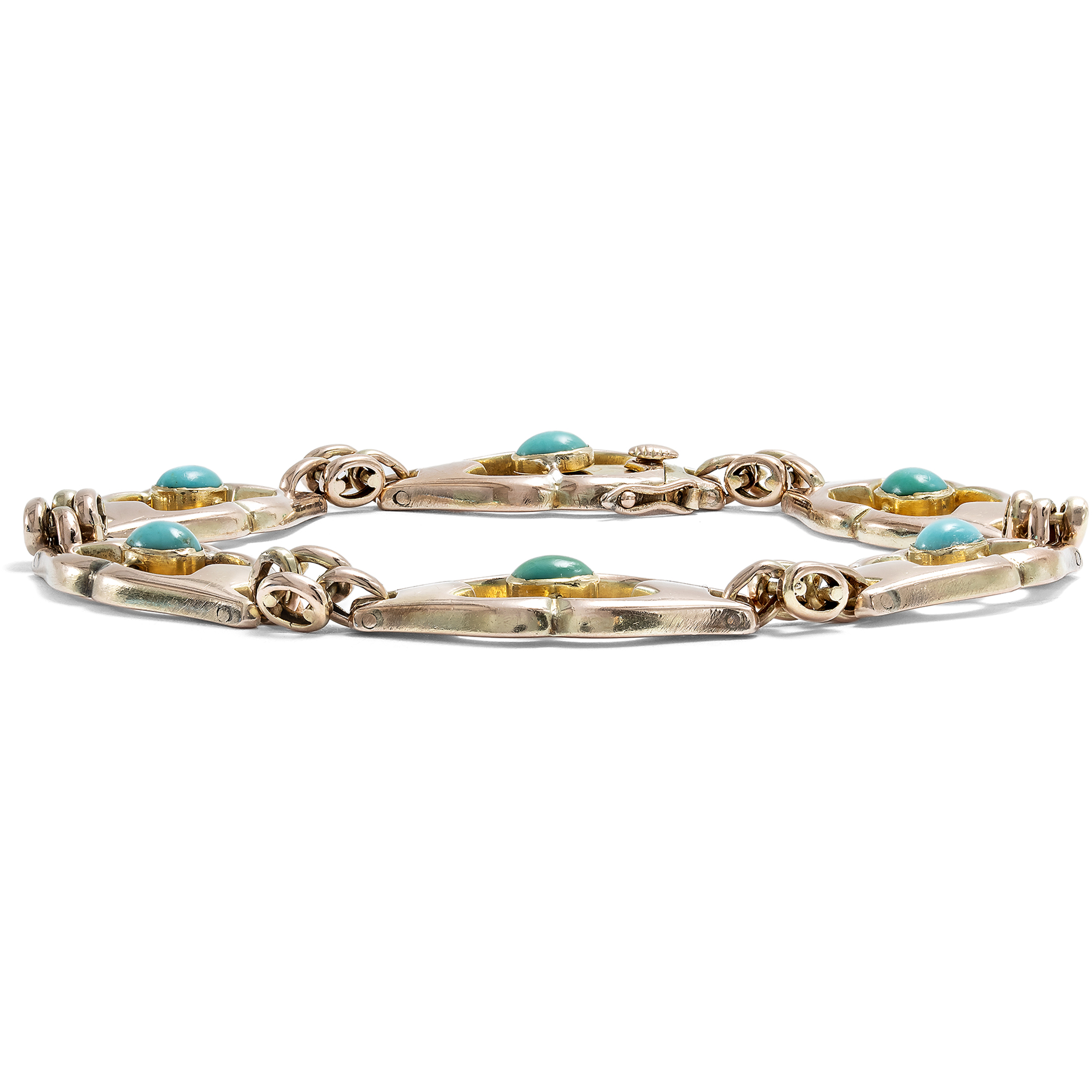 Isn't it wonderful when pieces of jewellery tell little stories and convey more than just shine and glitter through their gemstones? Since the beginning of jewelry history, gemstones have not only been regarded as precious and beautiful materials, but also as carriers of special meanings. Even in the Book of Revelation, the gates of the heavenly city of Jerusalem are made of very specific stones, and in classical antiquity, precious stones were given their place in the pantheon: the pearl naturally belonged to Venus, the goddess of love, and the shimmering opals were regarded as the tears of joy of Zeus, the father of the gods. Things became particularly romantic in the 19th century when the "gemstone language" emerged. Suddenly, colours could be used to convey feelings and every piece of jewellery became a secret messenger. Persian turquoise was an excellent way of expressing feelings. With its light blue color, it reminded people of forget-me-not flowers, which was perfect for messages of love that you didn't want to convey too subtly. It thus became a popular companion in pieces of jewellery - such as this bracelet, probably made in the United States around 1910 and discovered by us in London. Six oval cabochon-cut turquoises weighing a total of around 2.50 ct are set in sweeping links of warm, gleaming 10-karat gold. You can just imagine the first owner: in love, a little nervous, but determined to choose the right gift. It was certainly a romantic gift the first time - and who knows, maybe you will simply continue to write the story of this bracelet?