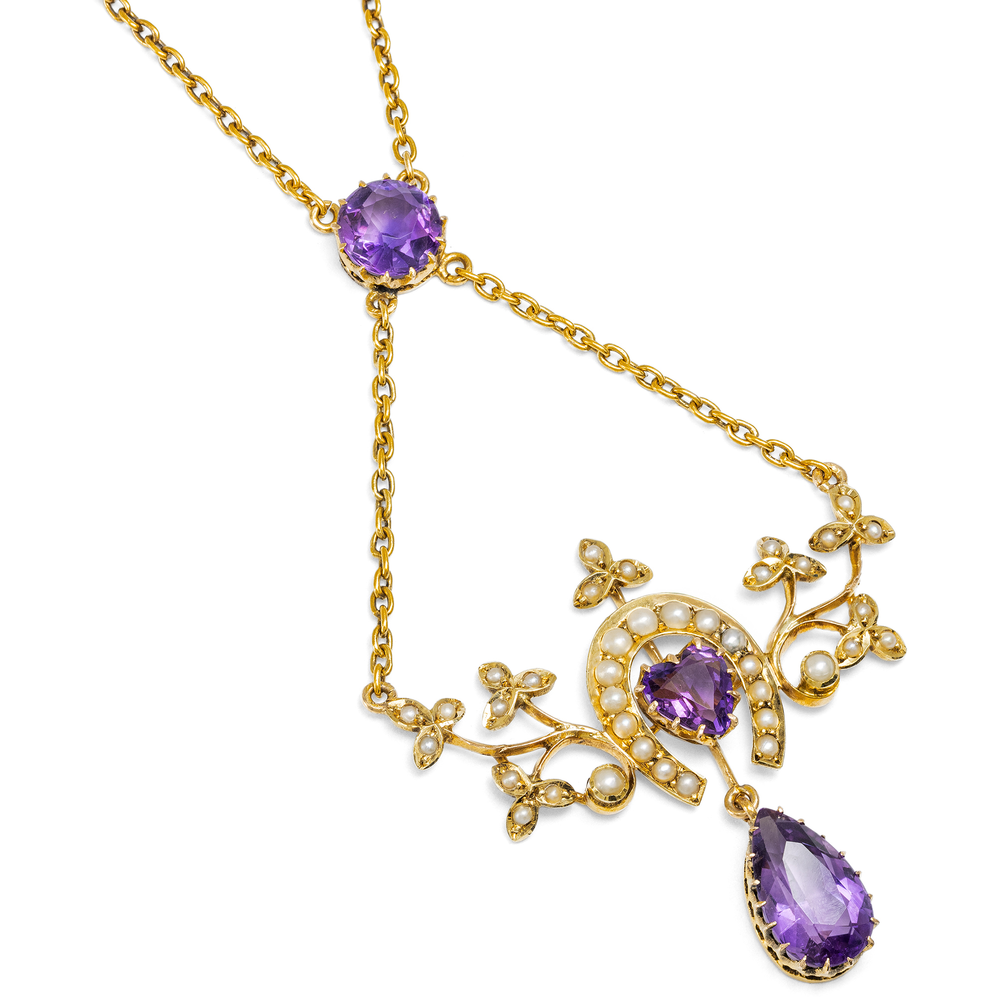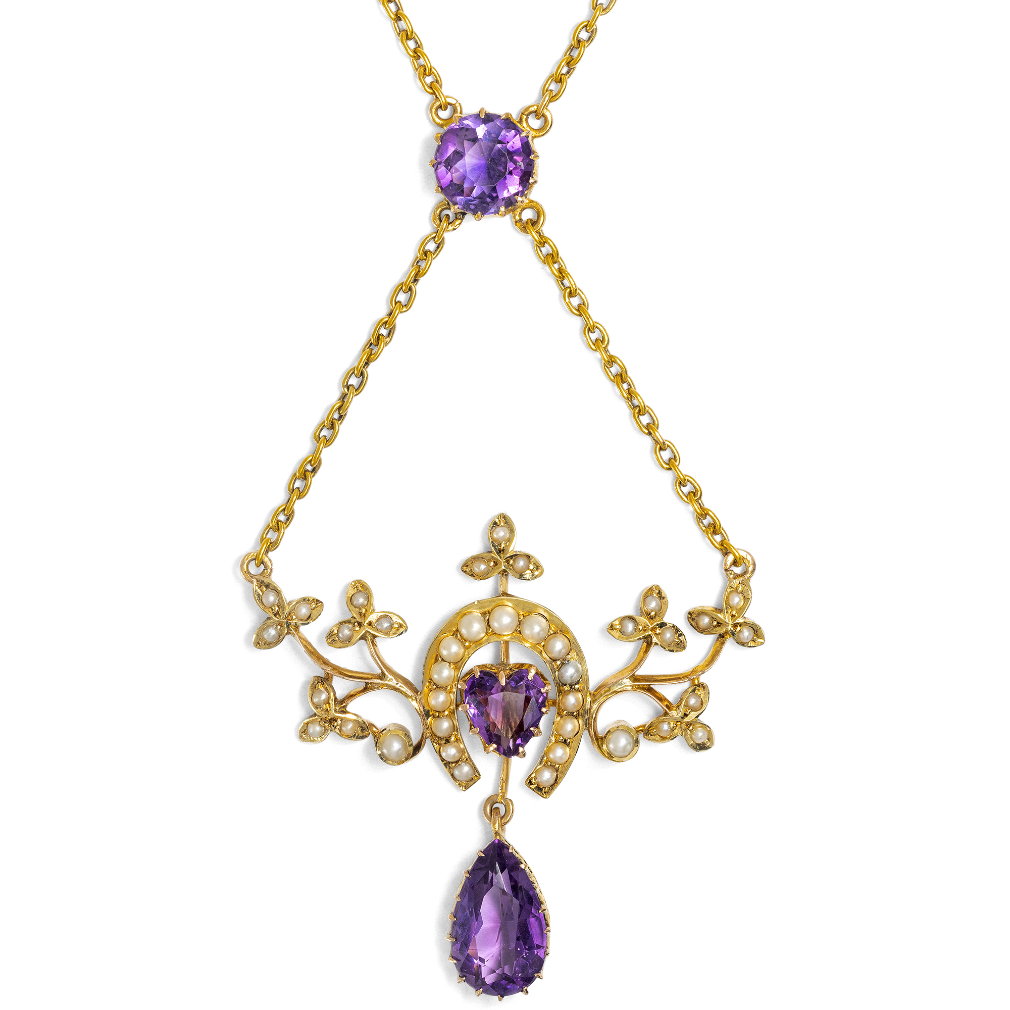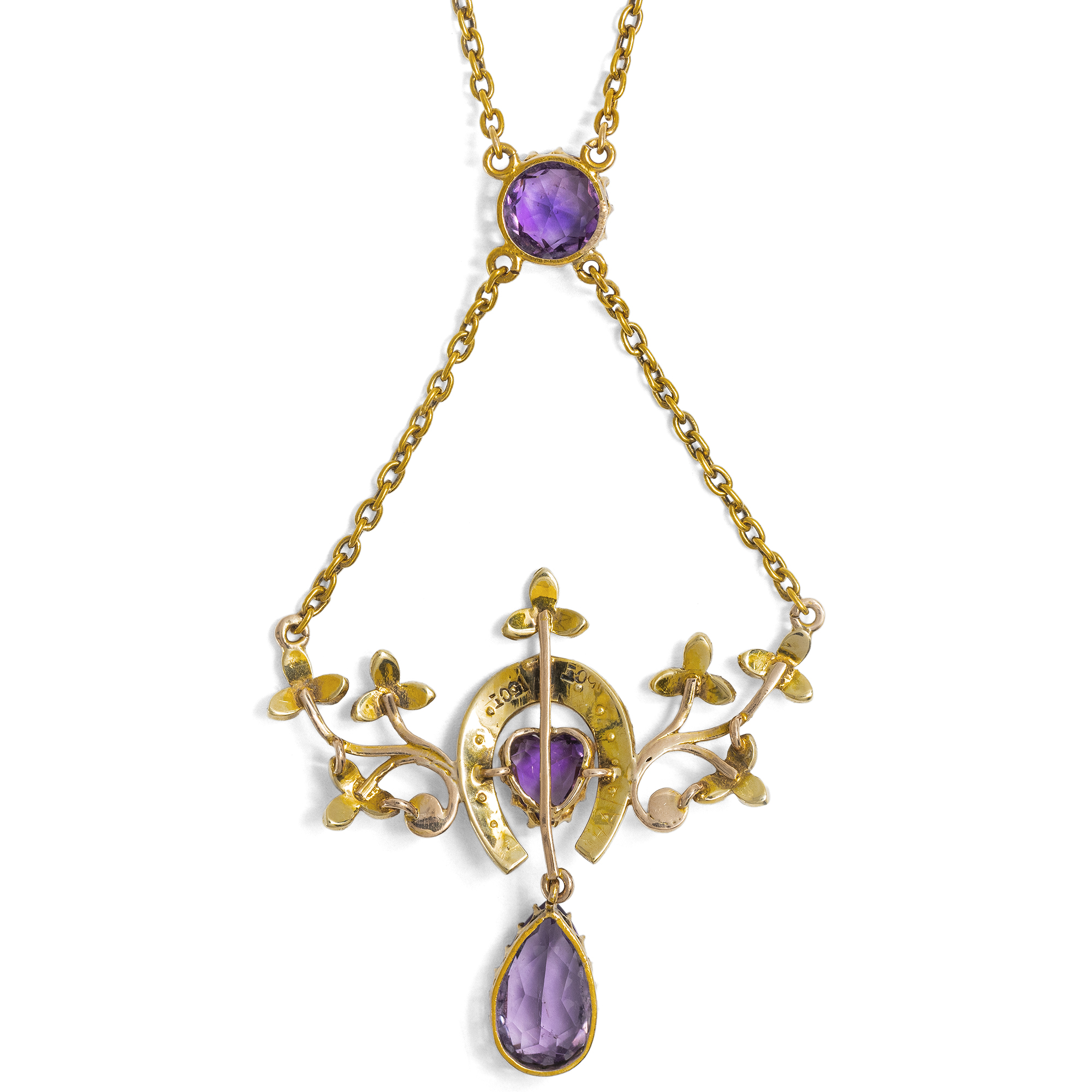 "Believe in happiness, otherwise it will flee!" - not only Alexandra sang in 1967 in Accordion. The idea of being able to hold on to happiness is much older and finds its most beautiful expression in the field of jewellery in brooches in the shape of horseshoes. It was not quite clear in which direction the horseshoe should point. We find pieces of jewellery in which it is shown pointing downwards and those in which it is open at the top. If you believe that luck is fleeting, you wear the horseshoe with the opening facing downwards so that luck cannot fly away. However, if you believe that luck can be lost, you wear the horseshoe with the opening facing upwards - so that the luck remains safely inside. This necklace from Great Britain holds on to luck: the luck of love. A heart has been cut out of an amethyst and placed in the middle of a horseshoe made of gold and pearls. Further amethysts and pearls surround the arrangement in the form of small flowers and a moving drop. The necklace is a typical British piece of jewellery. Necklaces of this type, always made of warm, shiny yellow gold and set with pearls, were created in Great Britain in the late 19th and early 20th centuries in many different designs. The rich, playful and romantic design of this example allows us to date it to the c. 1900s. We discovered the necklace in London. It is in very good condition.