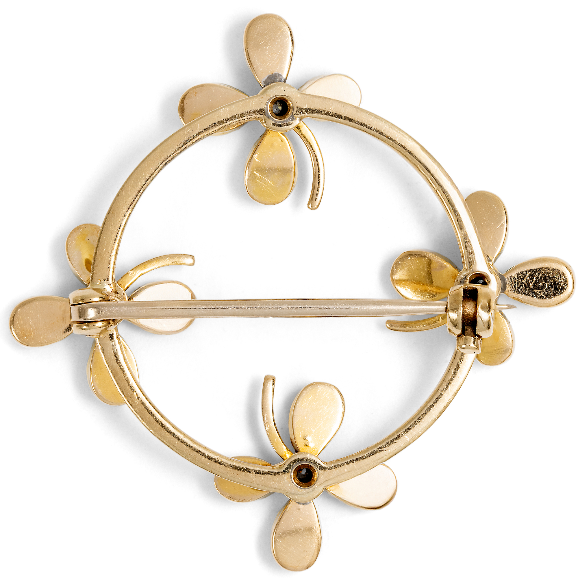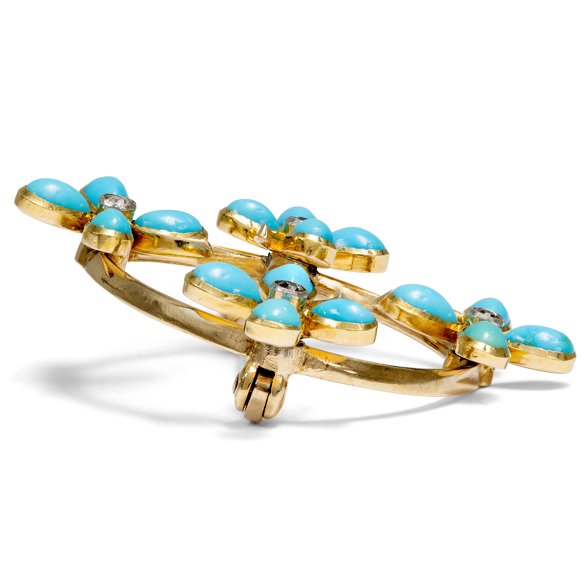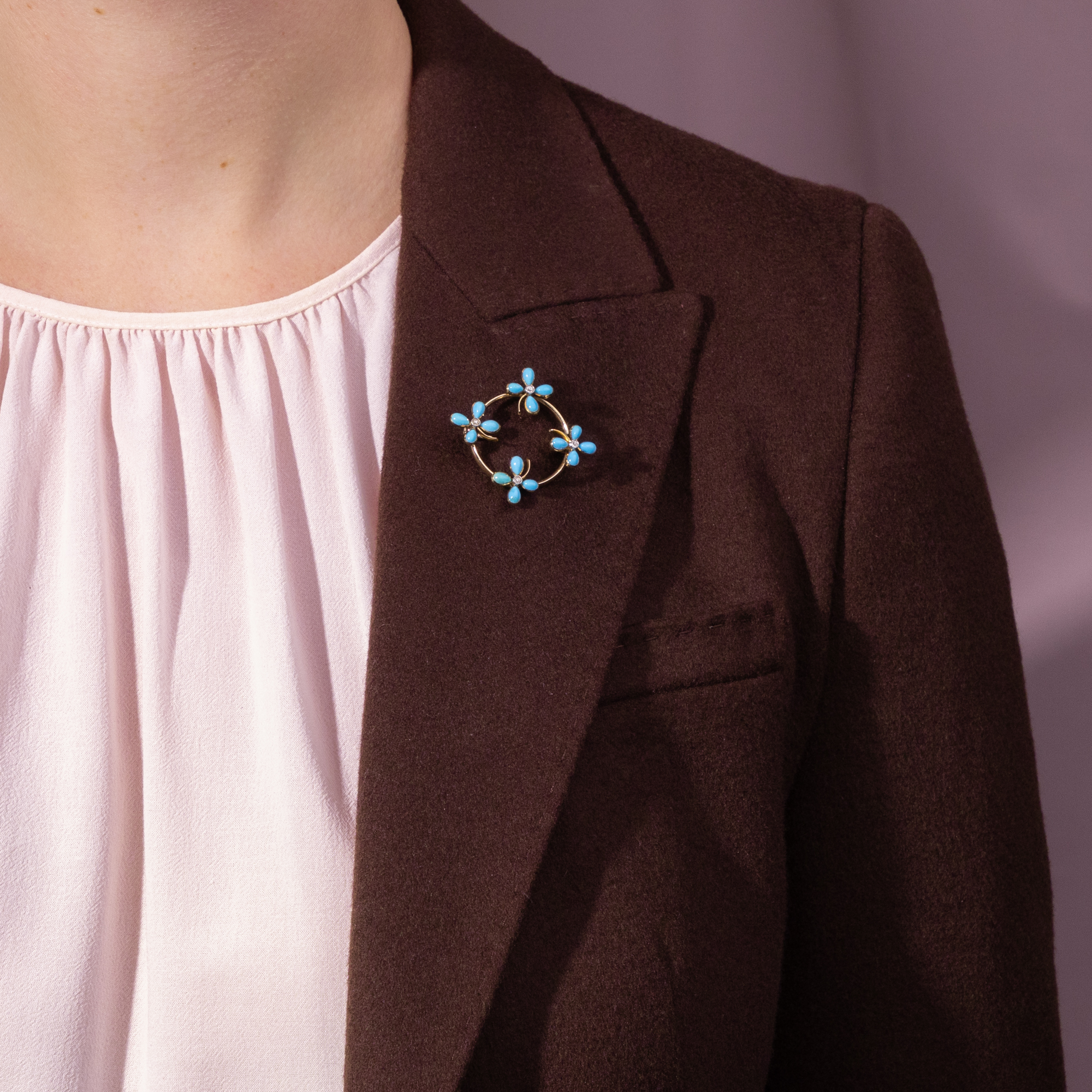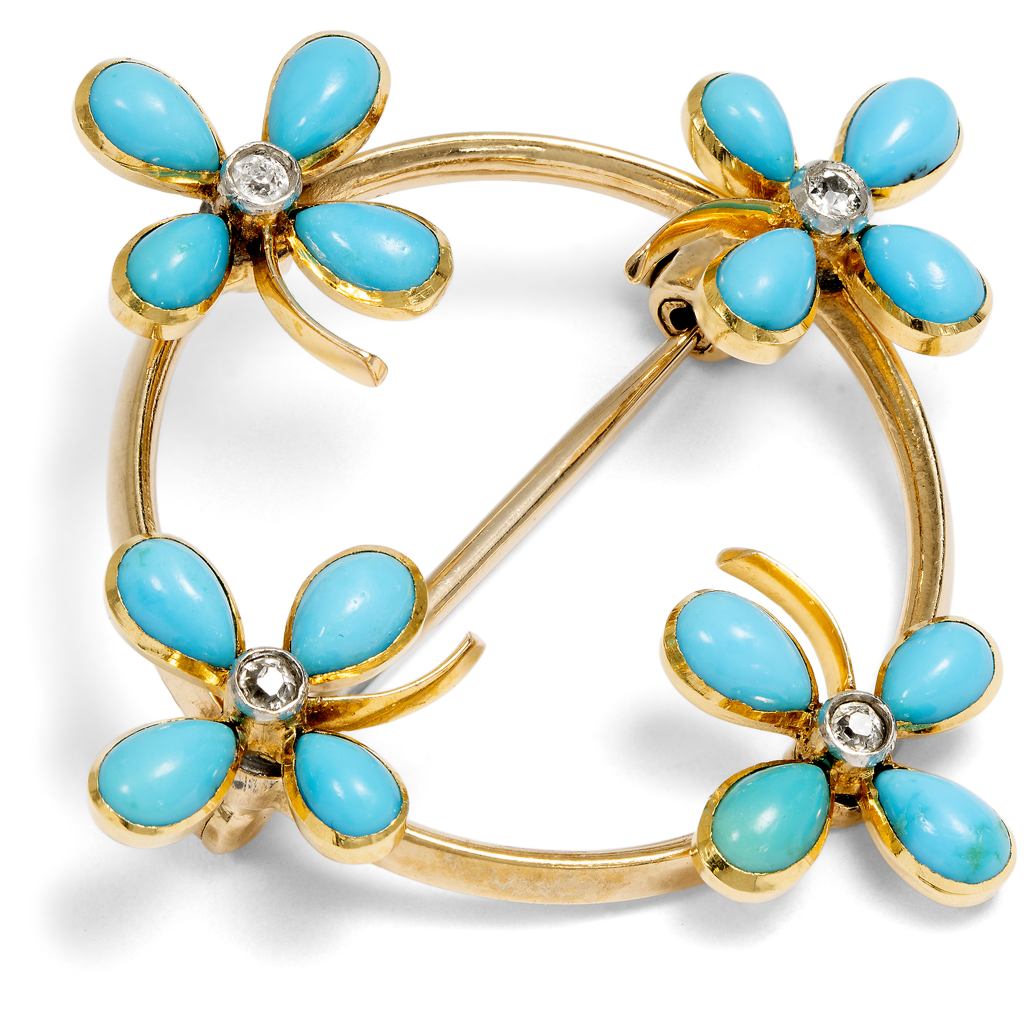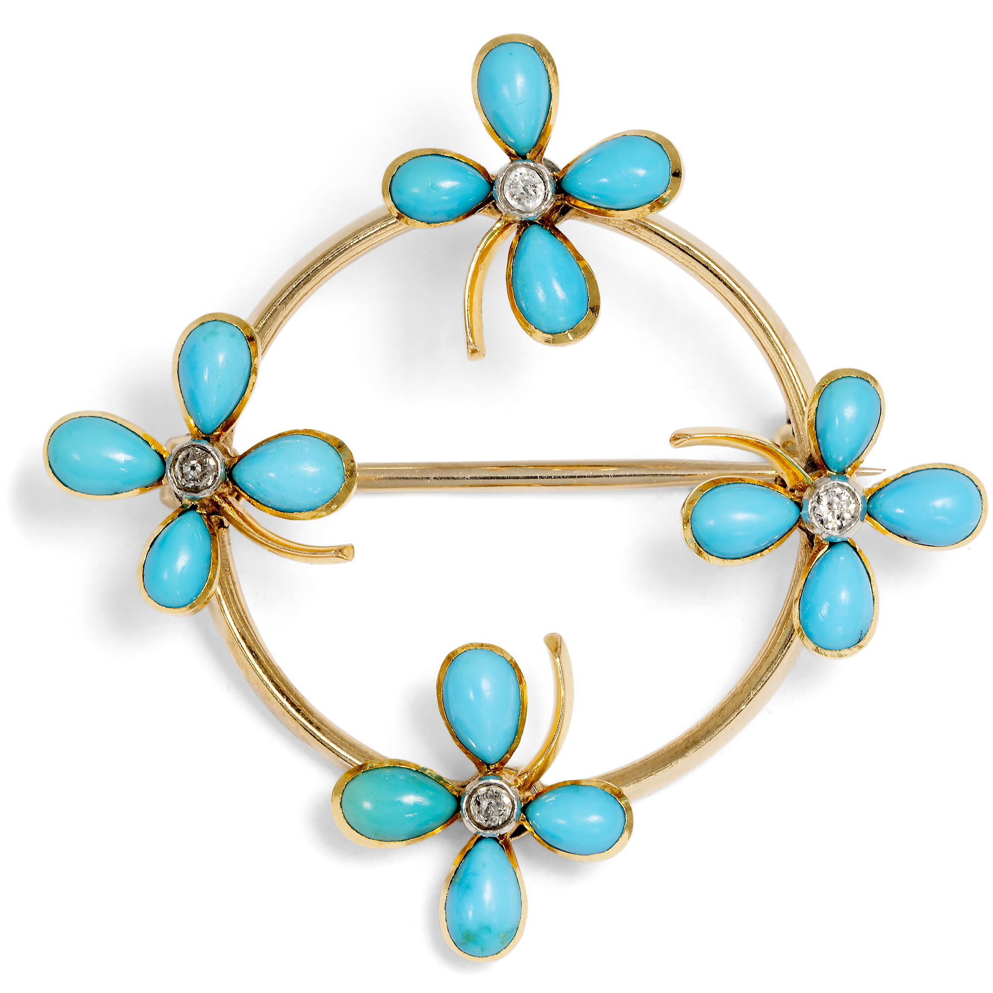 The shamrock is one of the most popular motifs in Belle Époque jewellery. Today, we are most familiar with it in its four-leafed form as a symbol of good luck. However, around c. 1900, the delicate little plant could also convey a romantic message, which explains why it can be found on so many pieces of jewellery of the time. Probably the most important work on the language of flowers, Anna Burke's Illustrated Language of Flowers from 1856, lists the four-leaf clover with the meaning "Be mine". This brooch from the early years of the 20th century takes up this symbol and interprets it in a particularly luxurious way. It is made of gold and takes the form of a round wreath. Four shamrocks are set on the round, each made up of four sky-blue turquoises grouped around a small diamond. The turquoises enliven the design with their beautiful color and at the same time deepen its message. In the language of gemstones, the turquoise with its forget-me-not tone also stands for the plea not to be forgotten. Turquoise was also regarded as a symbol of love. We discovered this very well-preserved brooch in London. It is highly likely that it was also made in Great Britain.