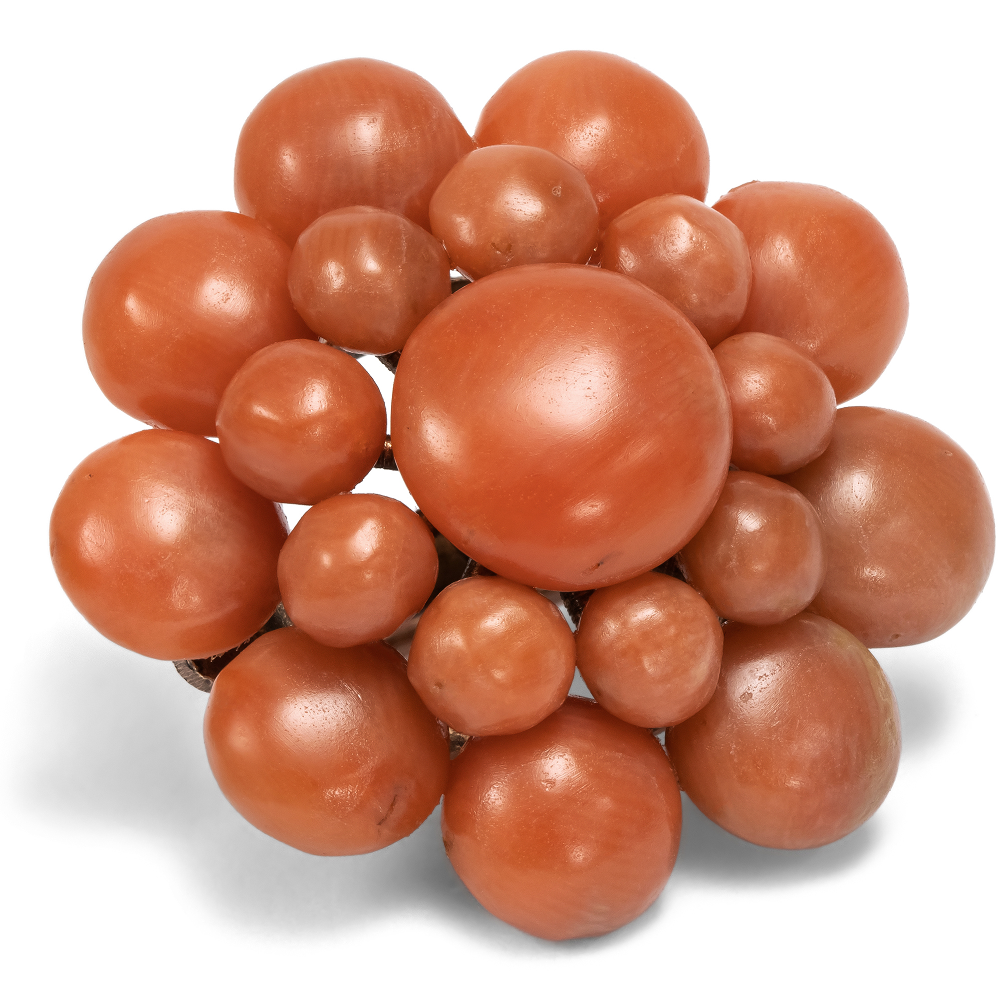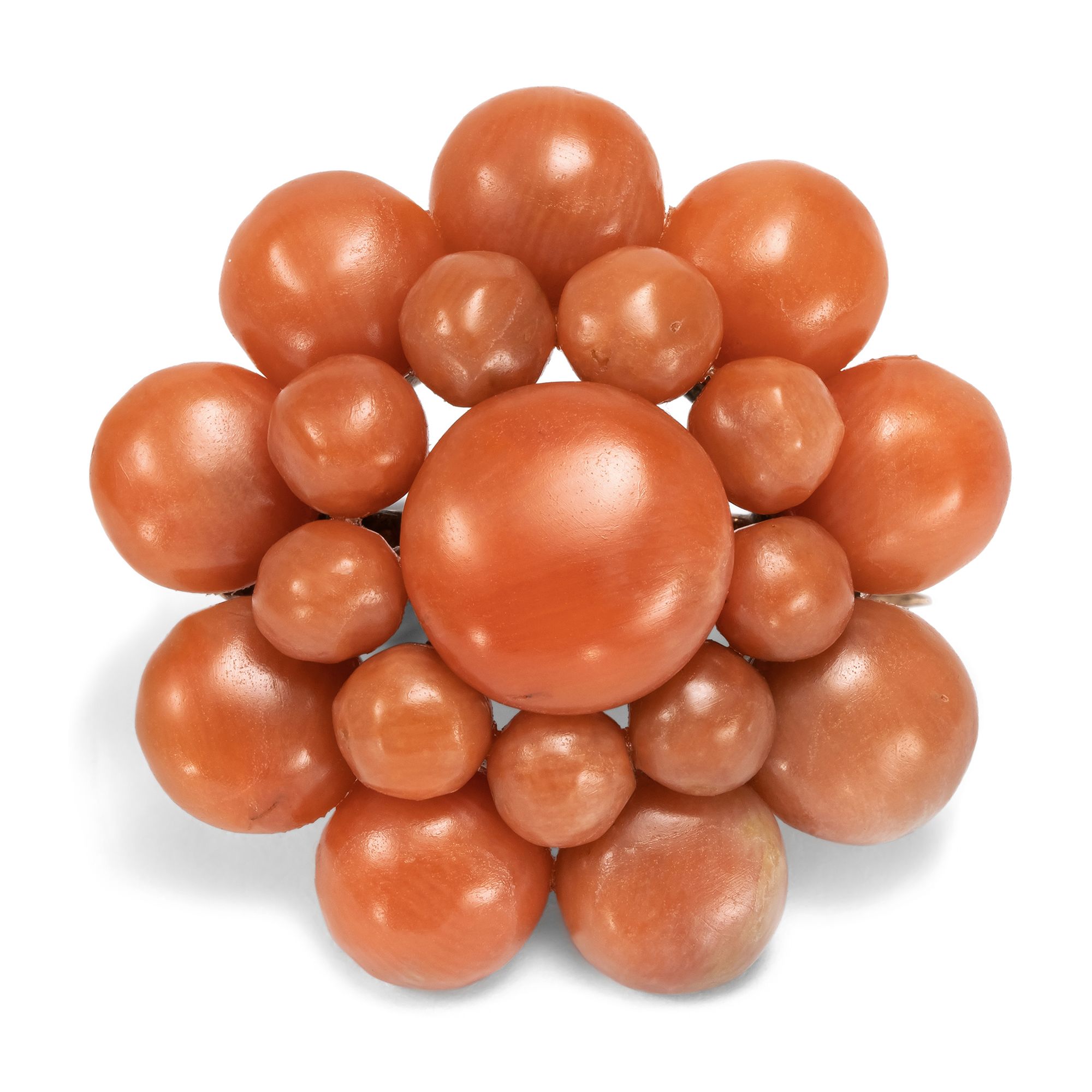 Corals were classic summer jewelry in the 19th century and jewellery that younger ladies and girls also wore. In Eduard von Keyserling's last novel Fürstinnen from 1917, for example, the two young princesses of Neustatt-Birkenstein wear "blue summer dresses [and] coral cords around their necks" for picnics in the countryside as a matter of course. Contemporary photographs also often show young girls wearing coral jewellery. The photo at the bottom of our category page Chains & Necklaces shows the young Ellen Terry at the age of 16 wearing a coral necklace, and a photograph from Vienna from the end of the 19th century also shows a girl wearing coral. The shapes of coral jewelry remained unchanged for a long time. Necklaces with graduated beads and brooches that used coral beads to create flower motifs were typical. This brooch from the late 19th century is a typical representative of this type of jewelry. A large coral in a round cabochon cut forms the centerpiece of the brooch. It is surrounded by 18 further coral cabochons. All the corals are mounted in silver. The small brooch came to us here in Berlin. Quote from Eduard von Keyserling: Fürstinnen. Novel. Afterword by Jens Malte Fischer, Zurich: Manesse 2017, pp. 62-63.