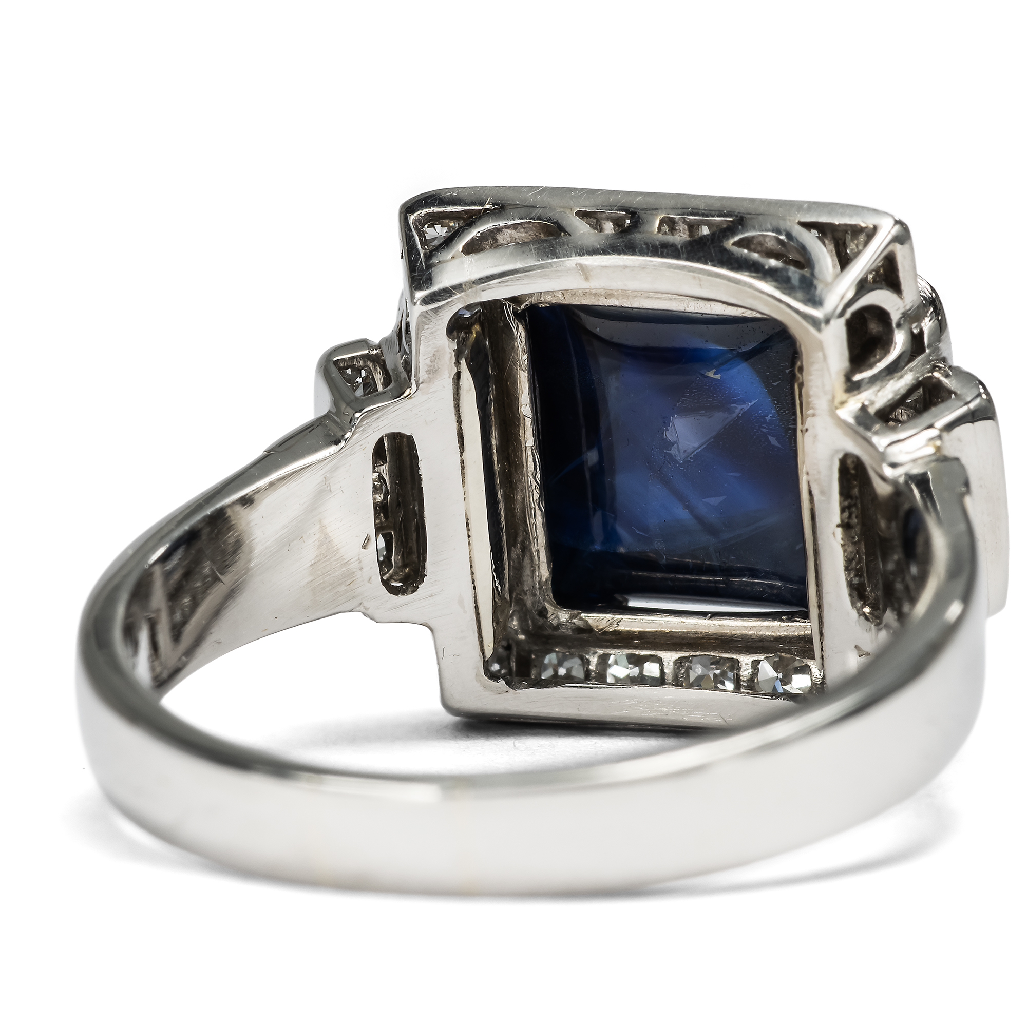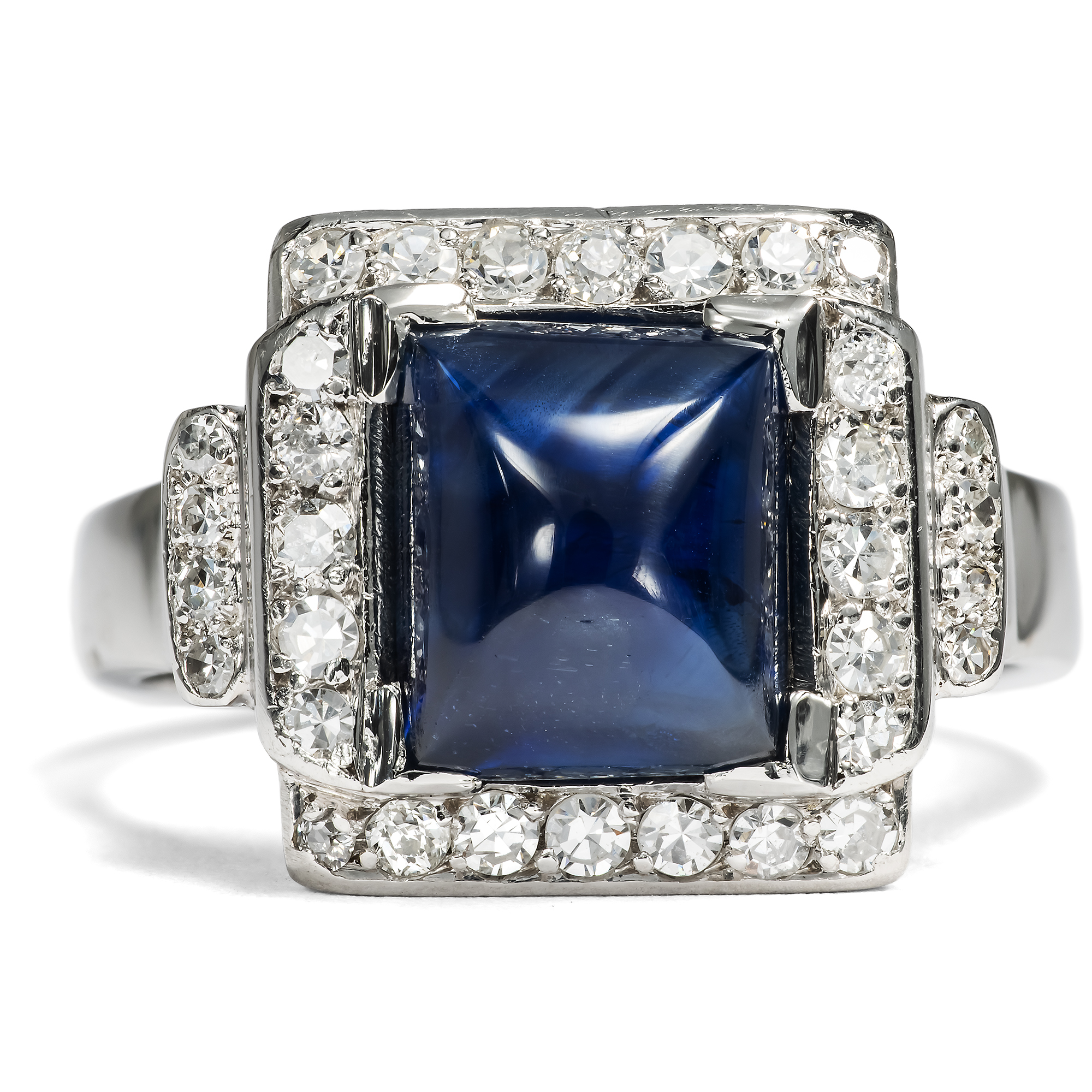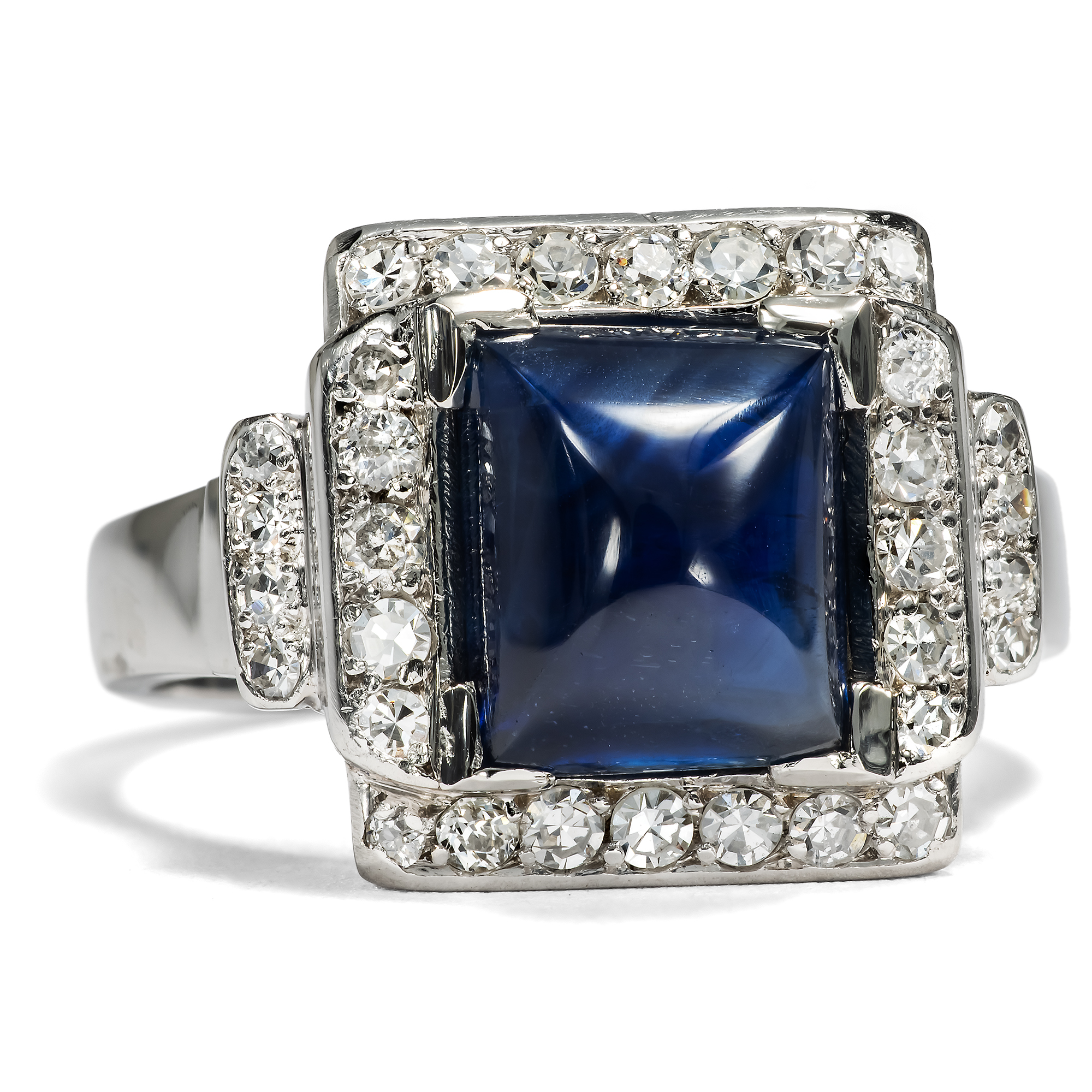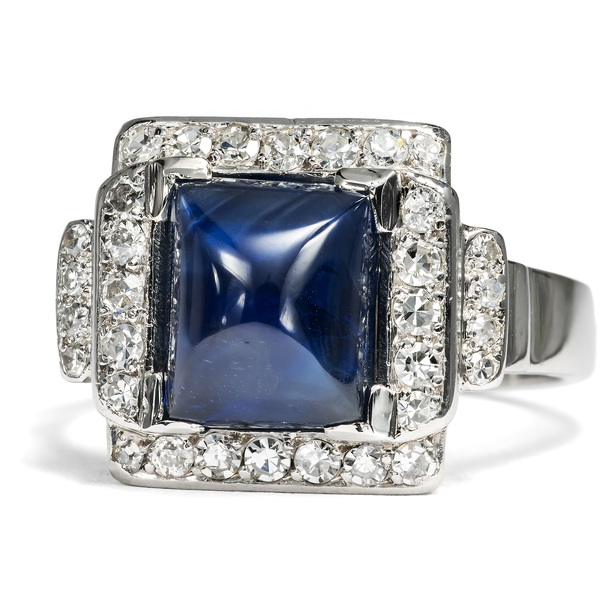 At the center of this elegant ring from around 1925 is a deep blue sapphire in the so-called sugarloaf cut. Its rectangular shape and gently rising tip are indeed reminiscent of a small sugar loaf. The light gathers on its smooth surface and seems to rest in its interior, where it glows in a mysterious dark blue. The stone is set in fine platinum chatons, which give it a secure hold and at the same time underline its cool colour effect. Diamonds in various historical cuts are arranged around the sapphire. The interplay of blue and white, of depth and radiance, lends the ring a calm yet precious aura. With its stepped shoulders and basic rectangular shape, the design shows the characteristic features of Art Deco. We discovered the ring here in Berlin. It is in very good condition and impresses with its precious decoration and the unusual cut of the sapphire.