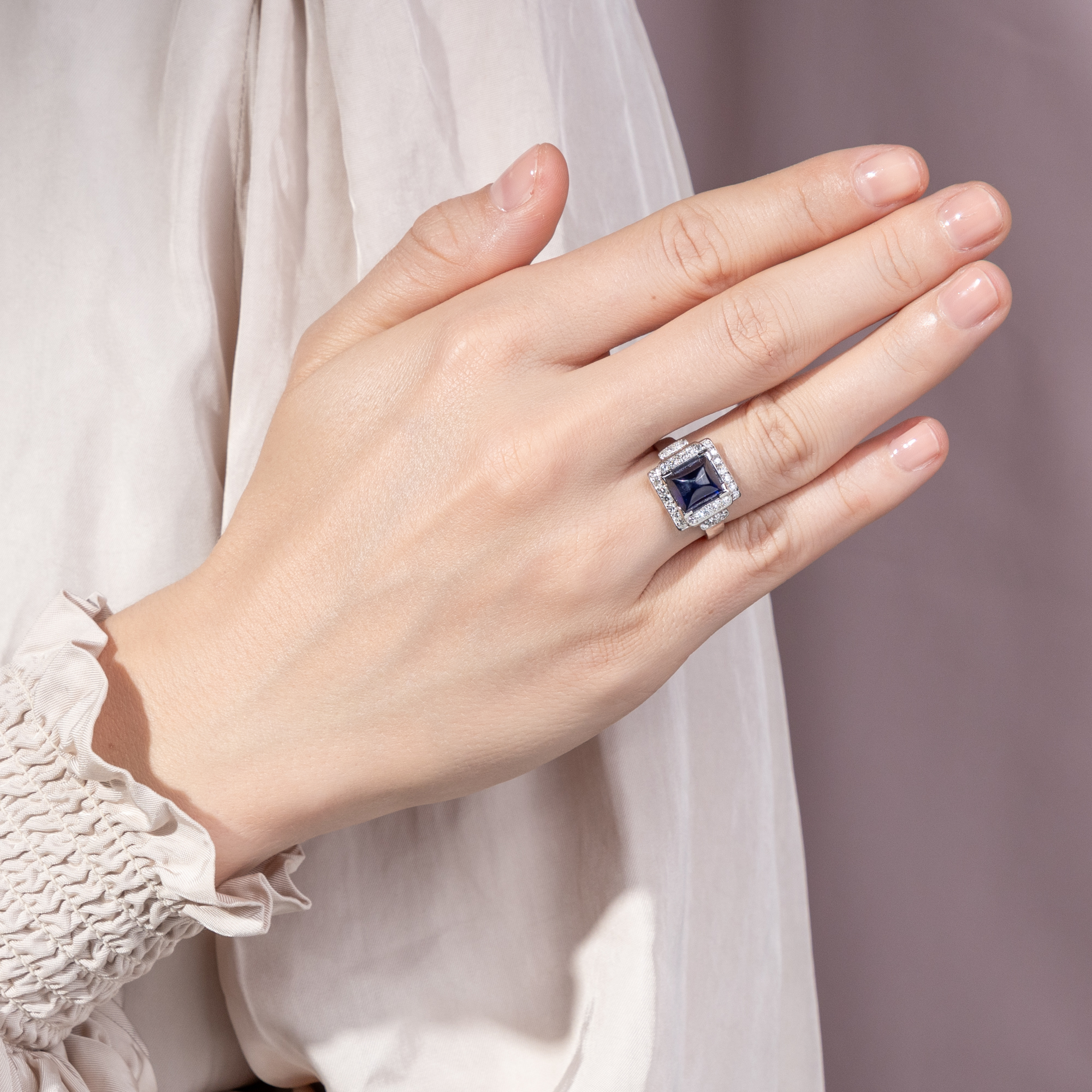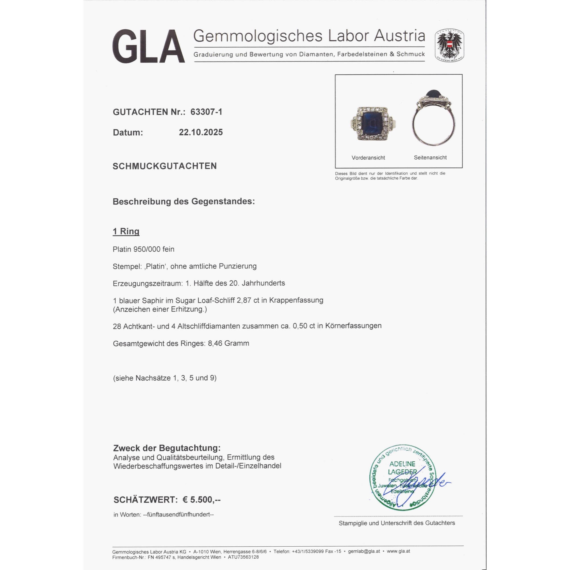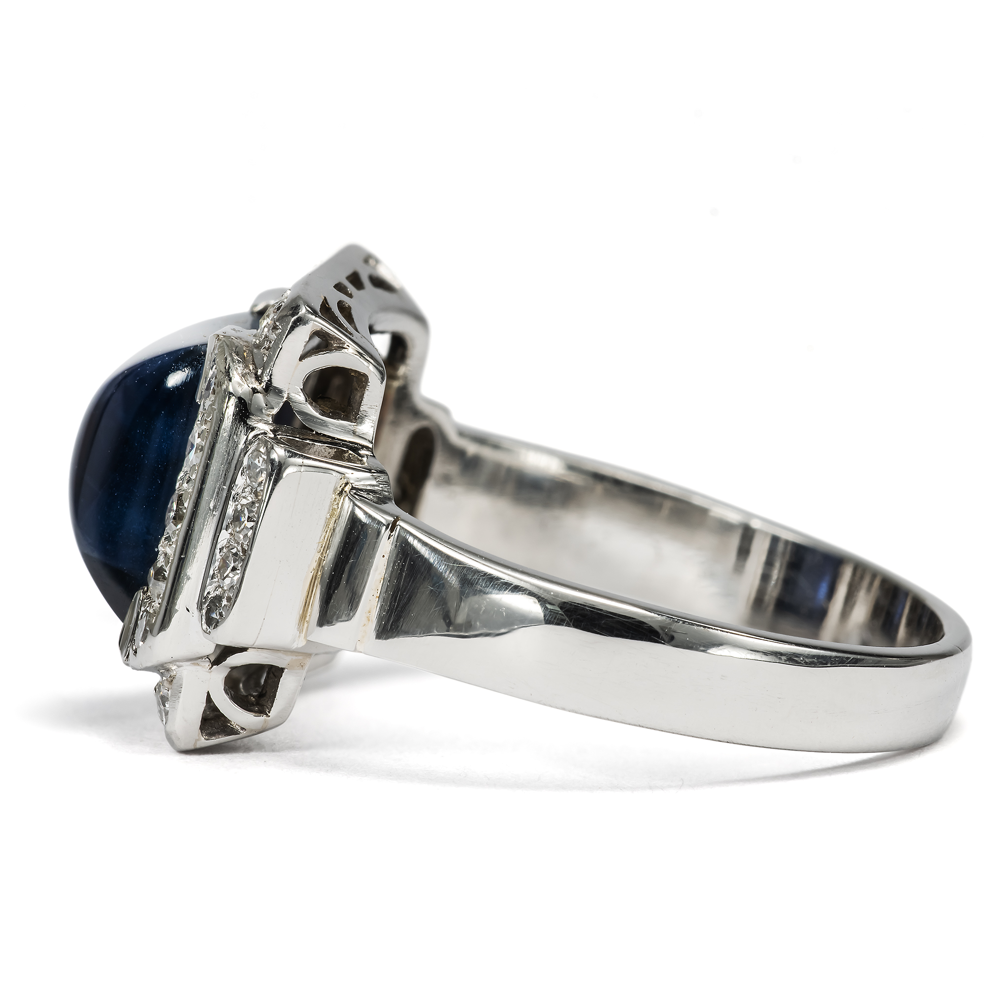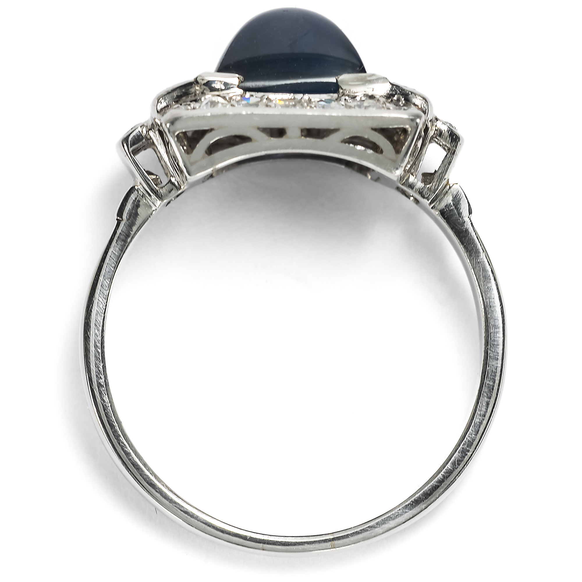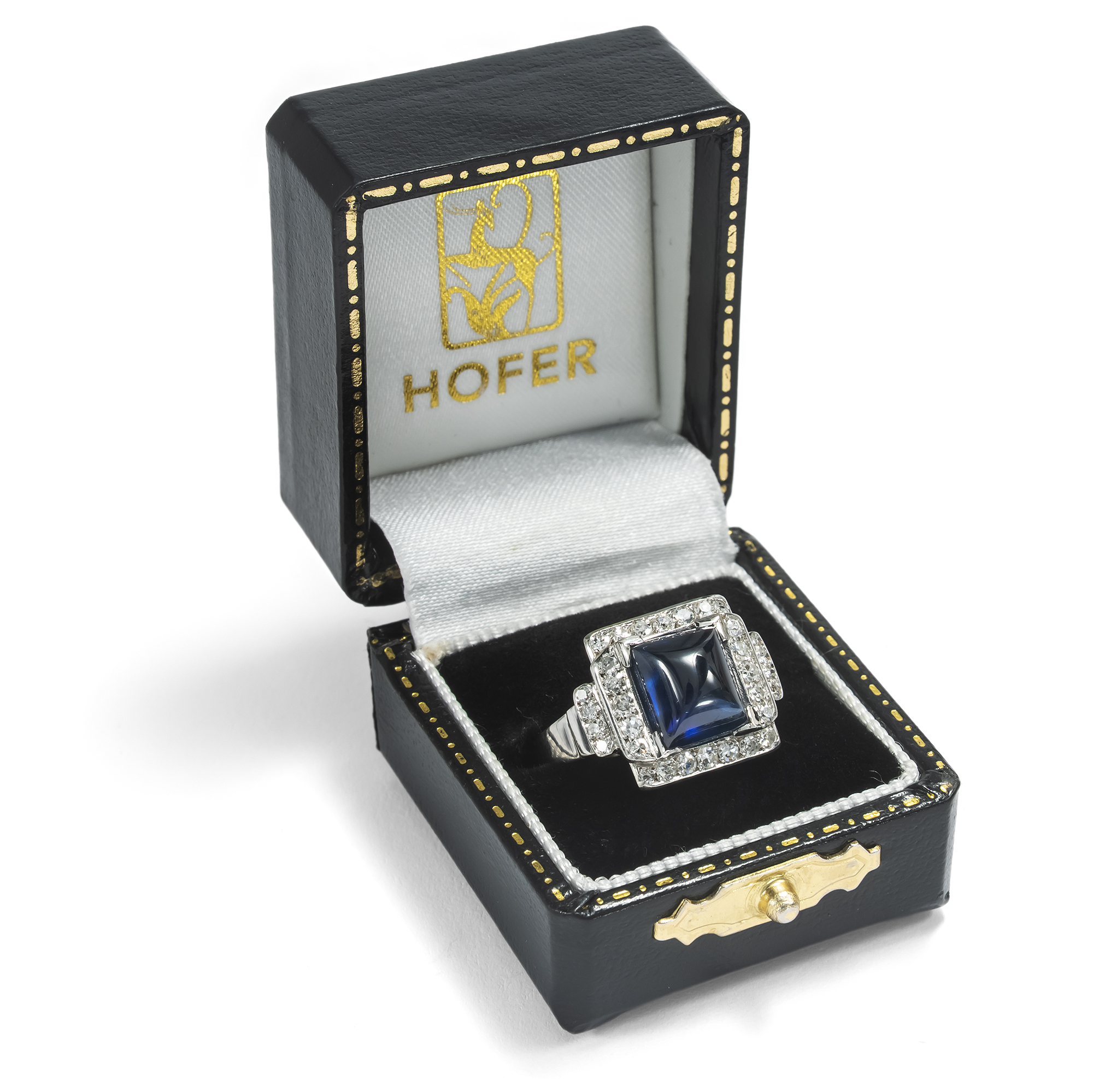 At the center of this elegant ring from around 1925 is a deep blue sapphire in the so-called sugarloaf cut. Its rectangular shape and gently rising tip are indeed reminiscent of a small sugar loaf. The light gathers on its smooth surface and seems to rest in its interior, where it glows in a mysterious dark blue. The stone is set in fine platinum chatons, which give it a secure hold and at the same time underline its cool colour effect. Diamonds in various historical cuts are arranged around the sapphire. The interplay of blue and white, of depth and radiance, lends the ring a calm yet precious aura. With its stepped shoulders and basic rectangular shape, the design shows the characteristic features of Art Deco. We discovered the ring here in Berlin. It is in very good condition and impresses with its precious decoration and the unusual cut of the sapphire.