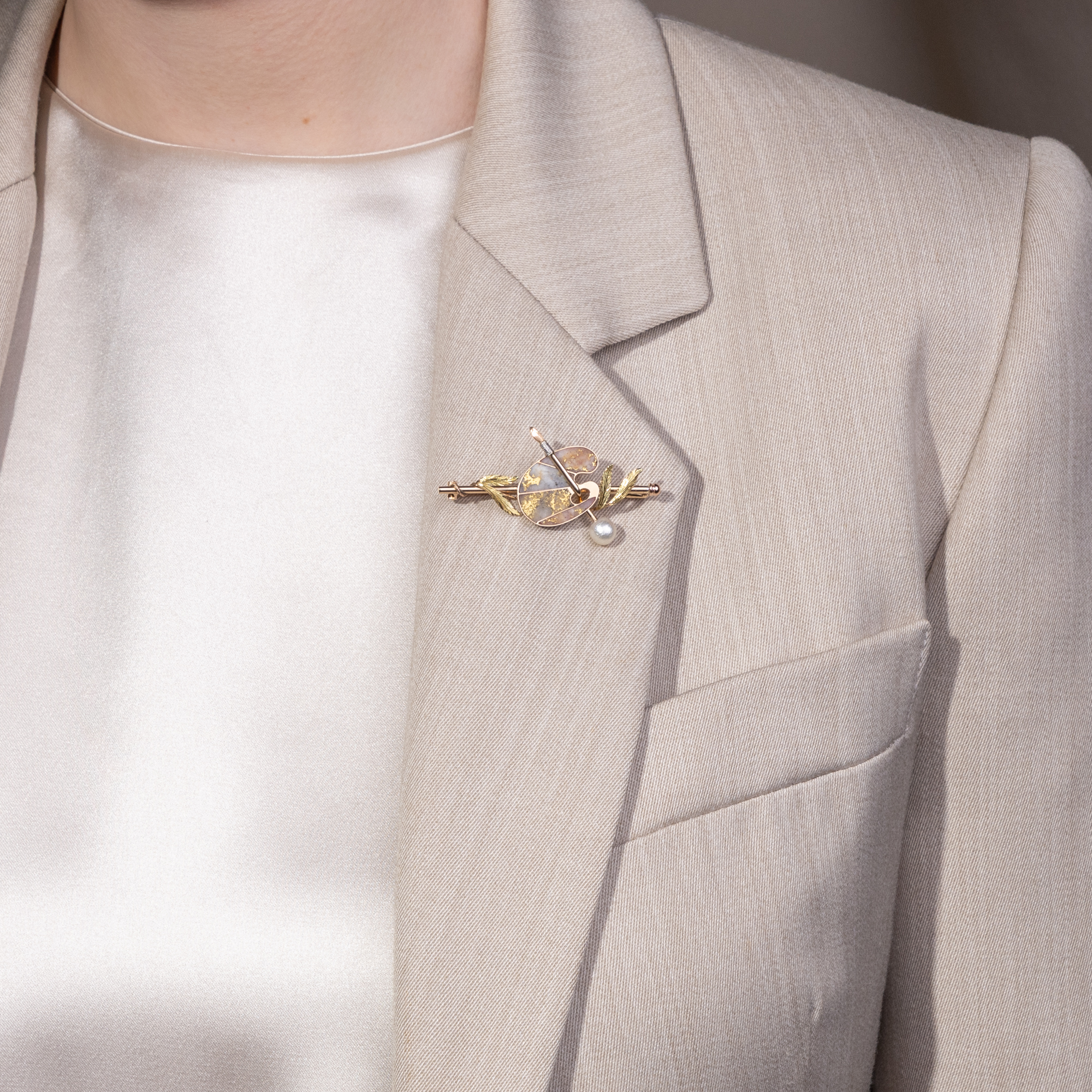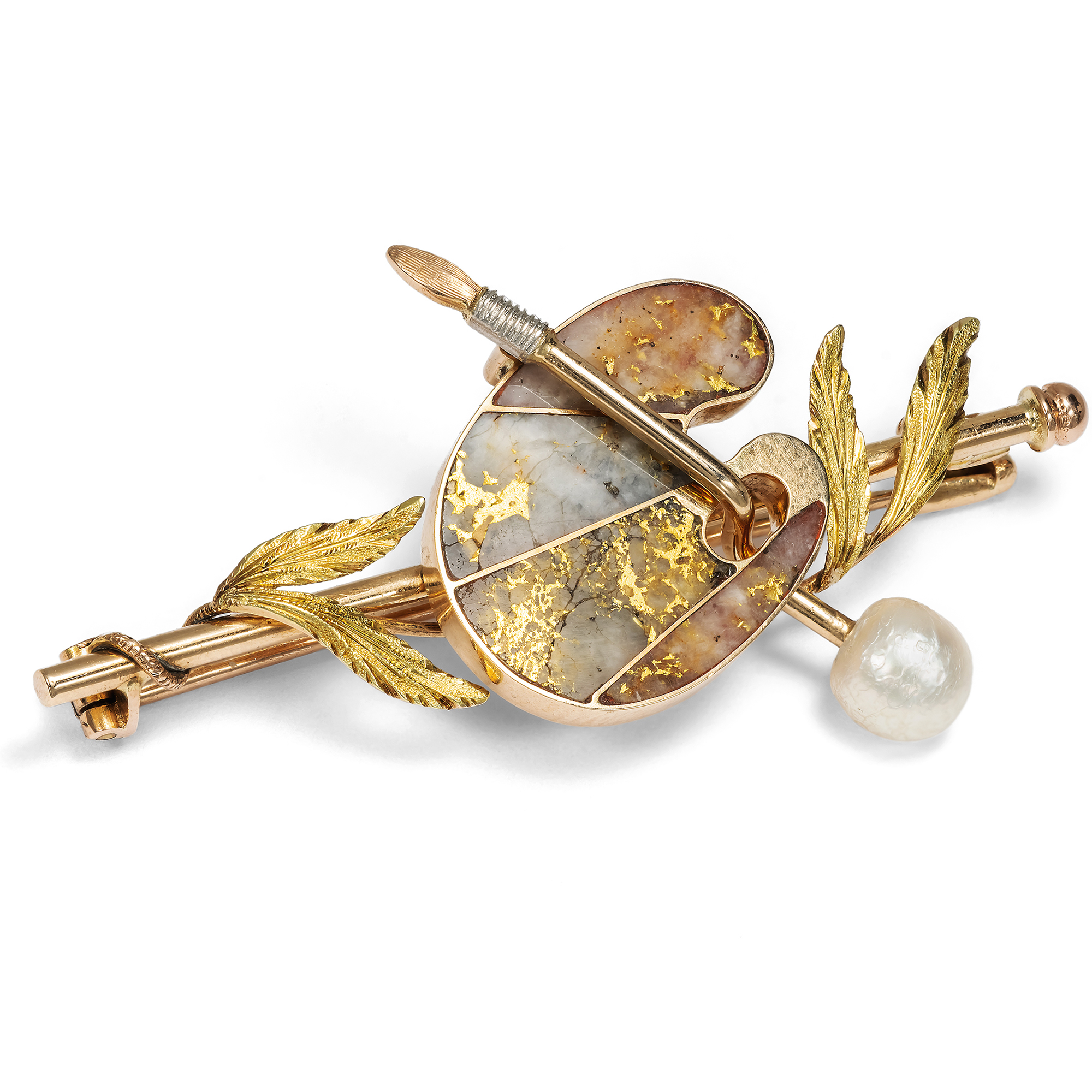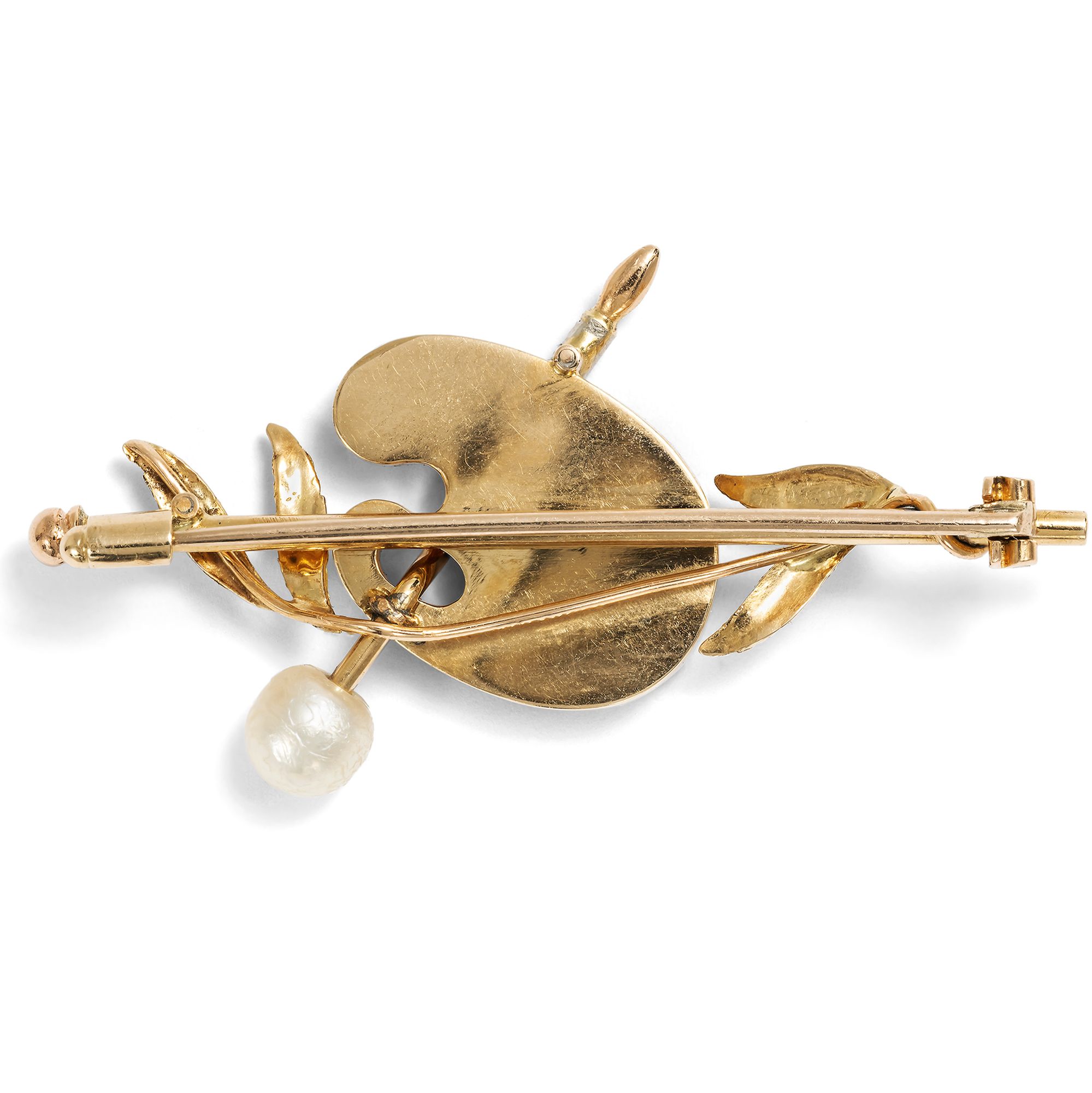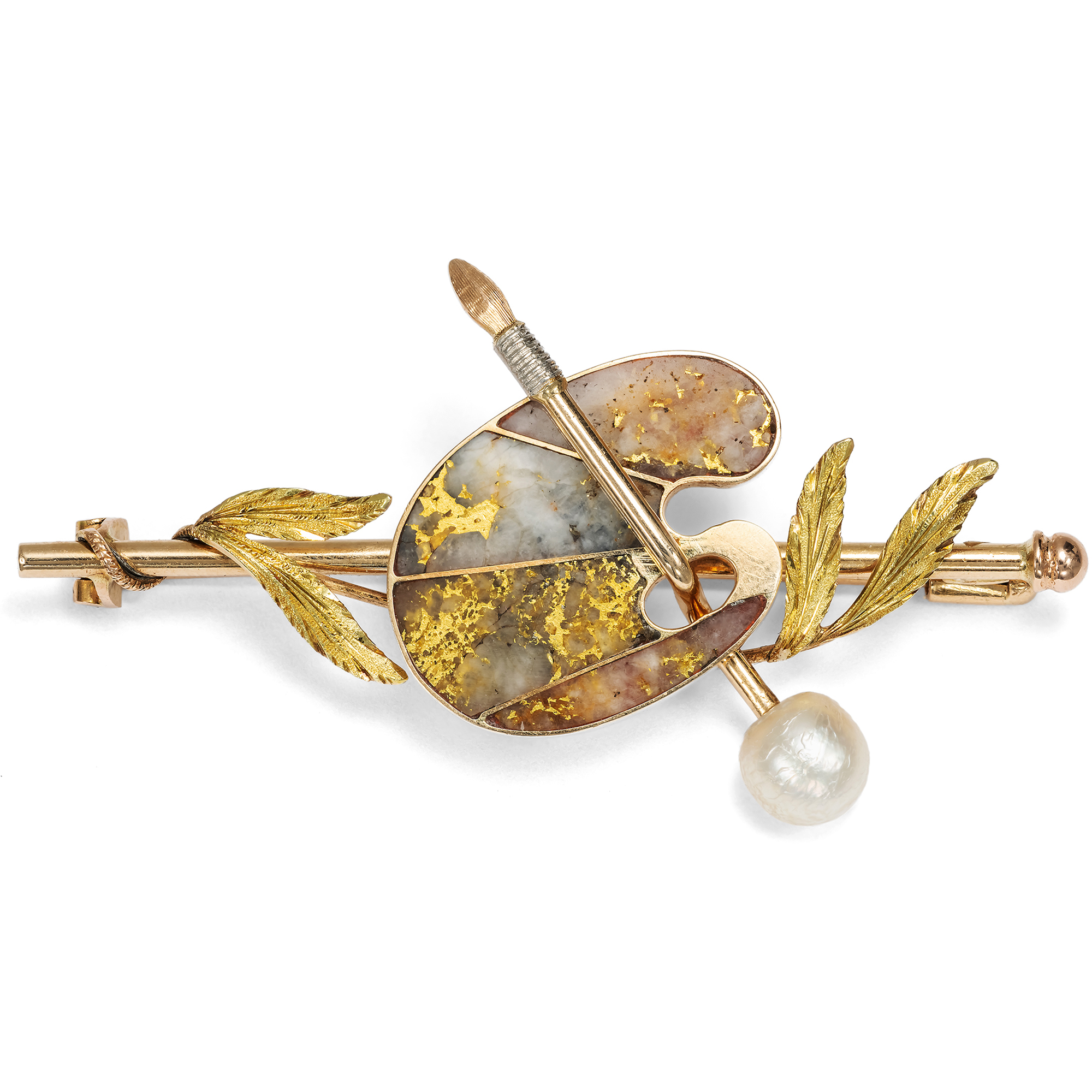The jewellery of the 1880s showed a wide range in its designs. On the one hand, historicism still reared its head, and revived motifs of the Renaissance and antiquity found favourable wearers. On the other hand, very contemporary jewellery creations were created in the spirit of naturalism, in the meticulous depiction of flowers and insects, but also of realism: everyday objects, now depicted in gold and silver, were elevated to the status of jewellery. This brooch belongs to the latter movement and takes the form of painting utensils. A painter's palette lies on a painting stick, with a brush passed through the thumb hole. Golden foliage, presumably laurel leaves, completes the composition, while a large natural pearl adorns the end of the brush. The real surprise lies in the palette itself. What at first glance appears to be impasto applied color, streaky and shiny, turns out on closer inspection to be gold in its most original form. Four inlays of gold quartz show natural veins of gold as they grow in the rock. With the theme of nature as artist, the brooch fits in wonderfully with the themes that not only moved the jewellery makers of the 1880s: realism and naturalism were also present in literature, and photography with its supposedly objective-scientific depictions and its idea of painting by light continued to spread. We discovered the brooch here in Berlin. In its execution and design, it is a typical piece of jewellery from the 1880s, when utilitarian objects often became the adornment of gold bar brooches.