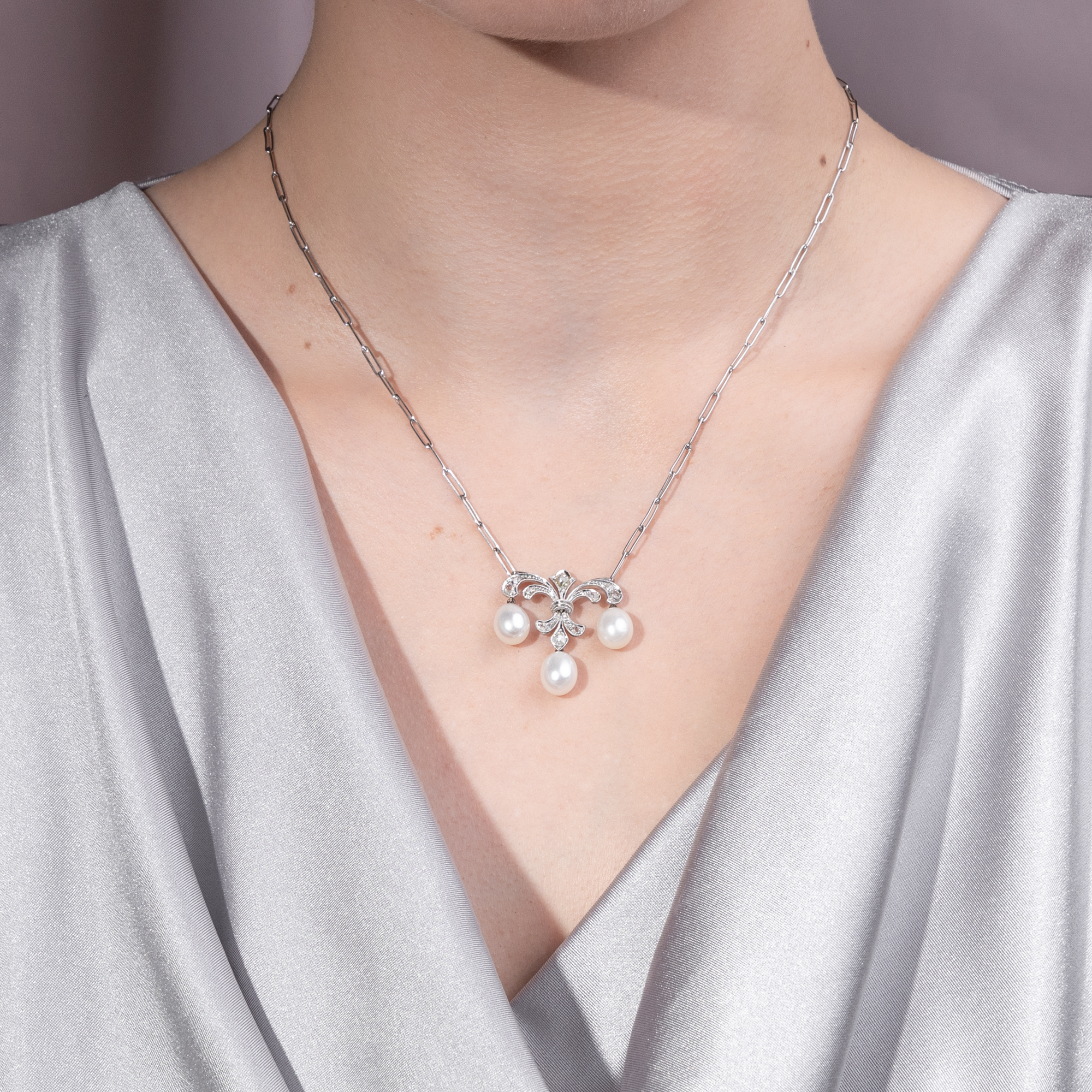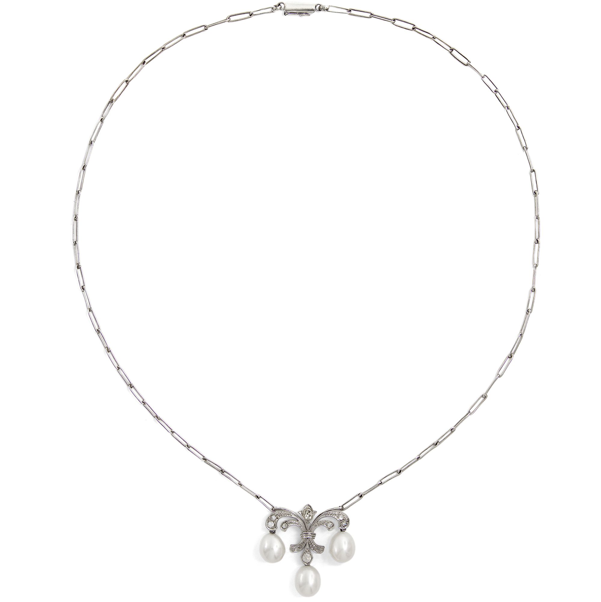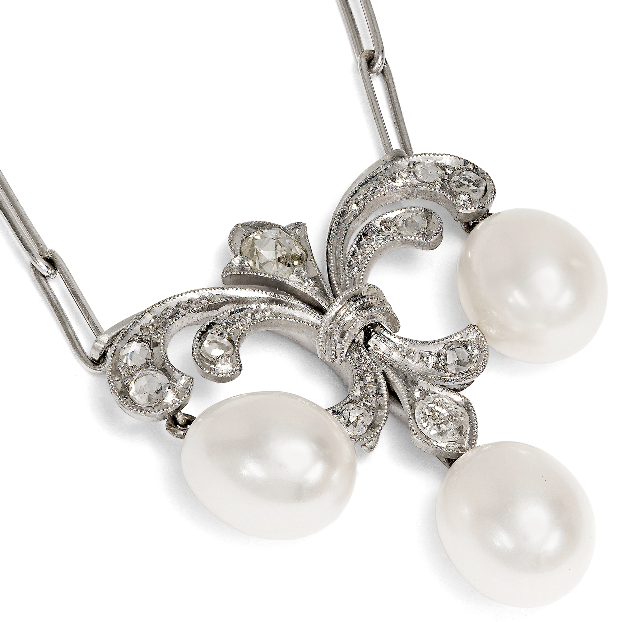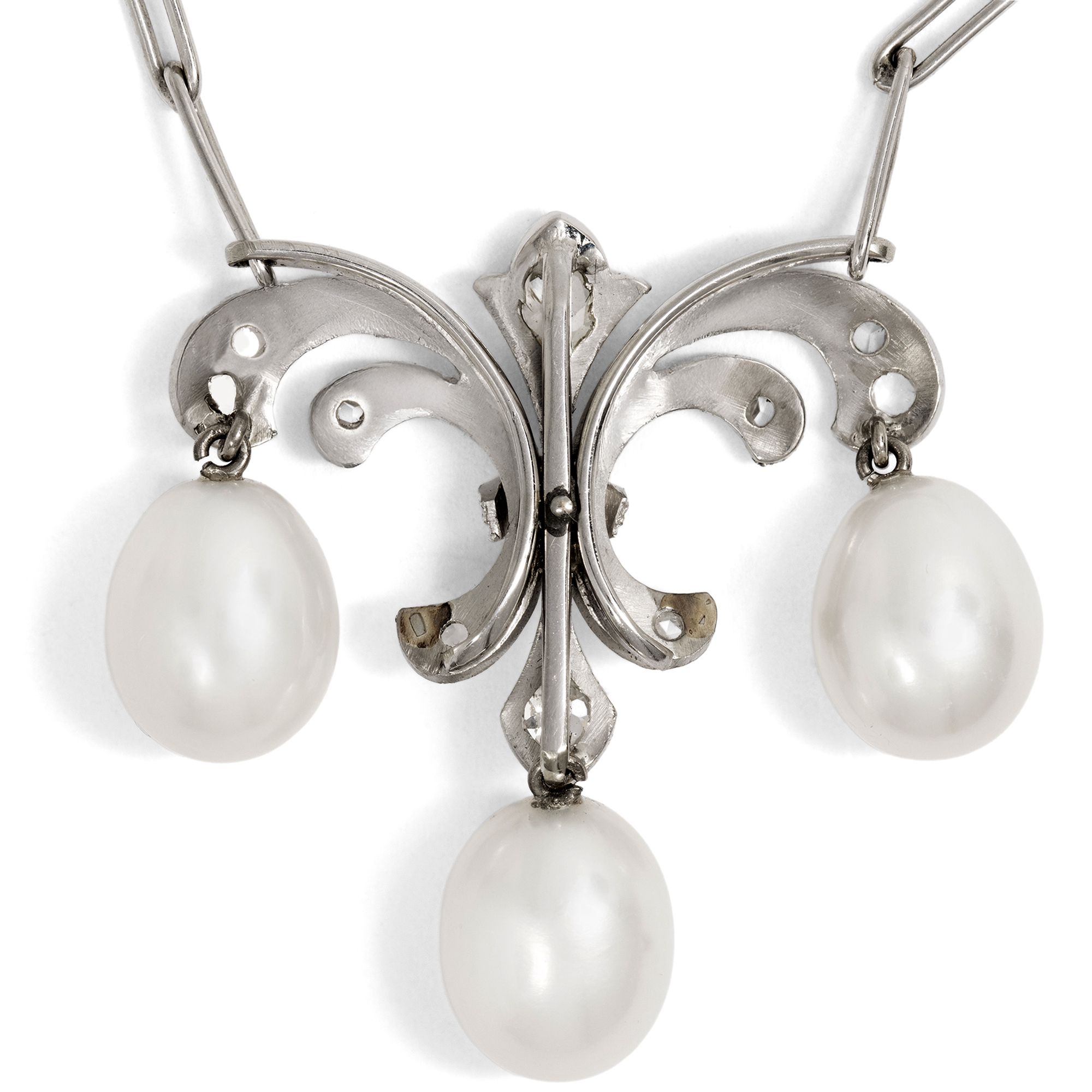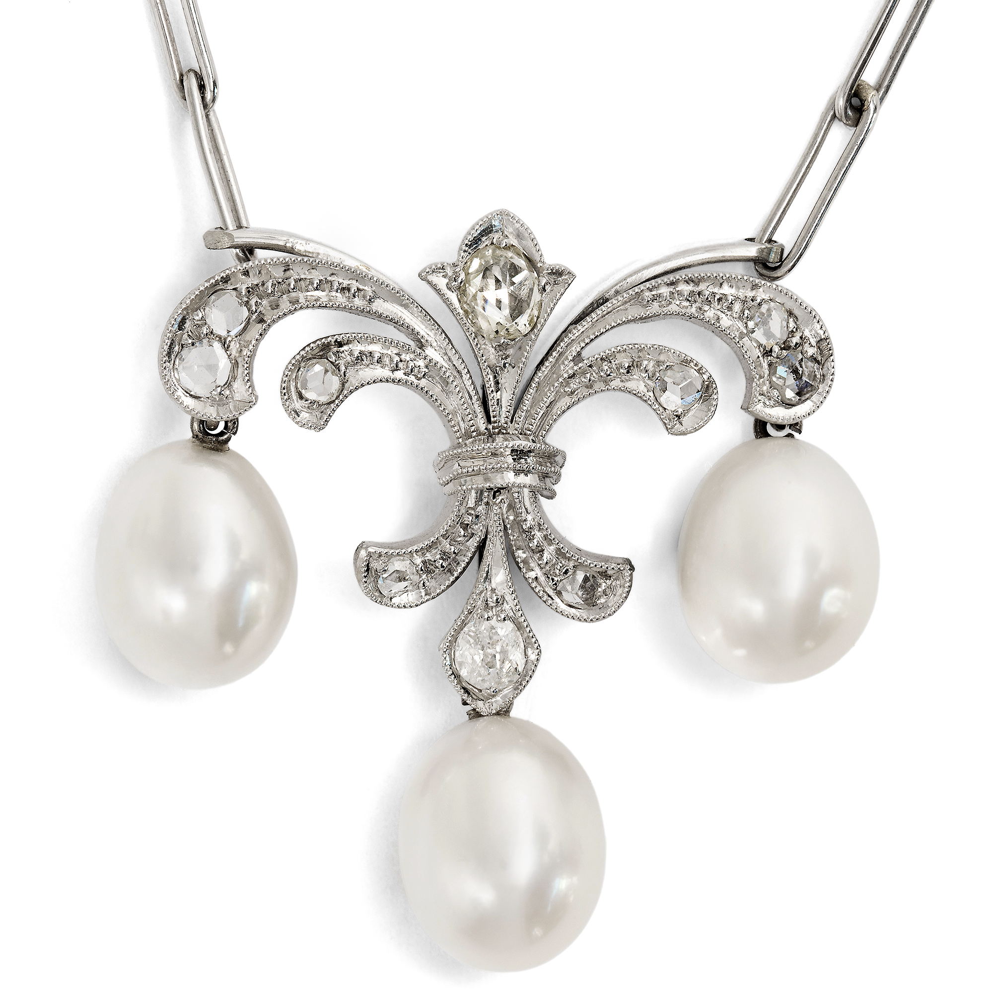A magnificent lily shape is attached to the center of a handcrafted white gold chain. Large diamond roses form the setting on the surface adorned with milgrains. Each of these diamonds is individually faceted, some of the stones are round, some are oval, and an old-cut diamond is added as the largest stone. Three teardrop-shaped pearls are added as shimmering additions. Diamonds are cut into numerous shapes, the best known today being the brilliant. However, in earlier centuries, cuts other than the perfectly round brilliant cut were the method of choice. In the 16th century, for example, rose cut diamonds were usually faceted. Numerous famous gemstones such as the "Orloff" or the "Grand Mogul" were cut in this style. The rose cut is characterized by the fact that the top of the diamond is faceted in a star shape, while the underside remains flat. This creates a very specific, soft shimmer that differs significantly from the sparkle of modern diamonds. The centerpiece of the necklace is a fragment of a larger piece of jewellery and was created in the early years of the 20th century. It was later transformed into a necklace. The white gold chain was certainly created later and the pearls were only added more recently, as they are freshwater cultured pearls, which have only been available for a few decades. The necklace came to us from Amsterdam, where it was probably made; the hallmarks on the chain allow us to locate it in the Netherlands with certainty.