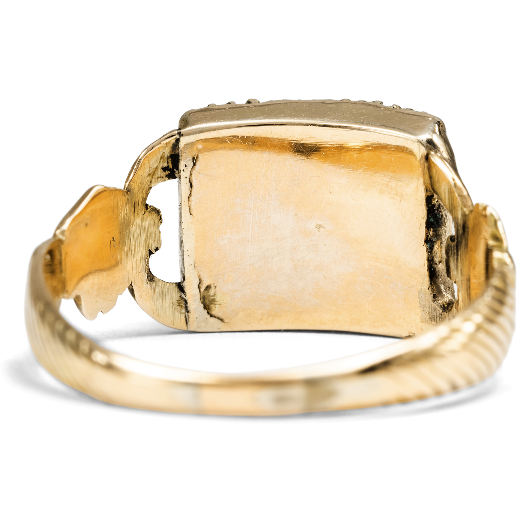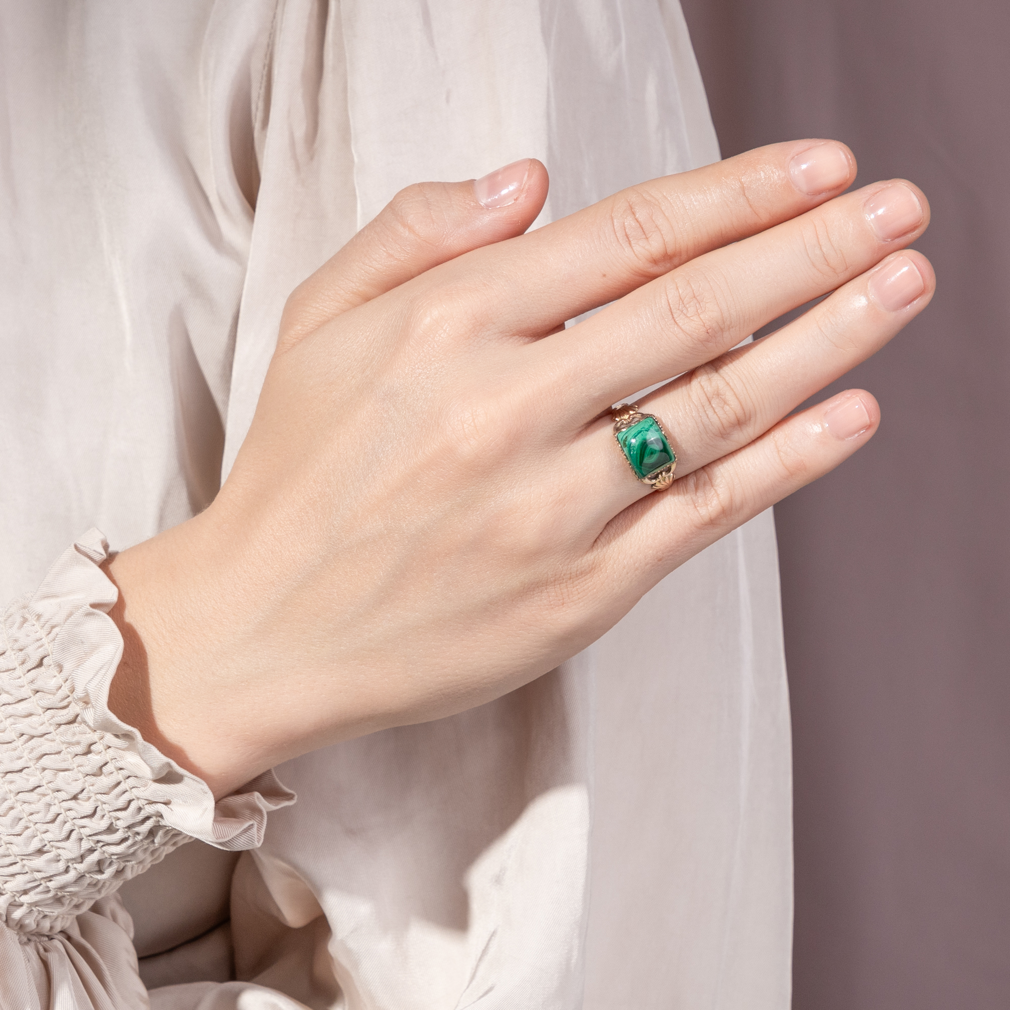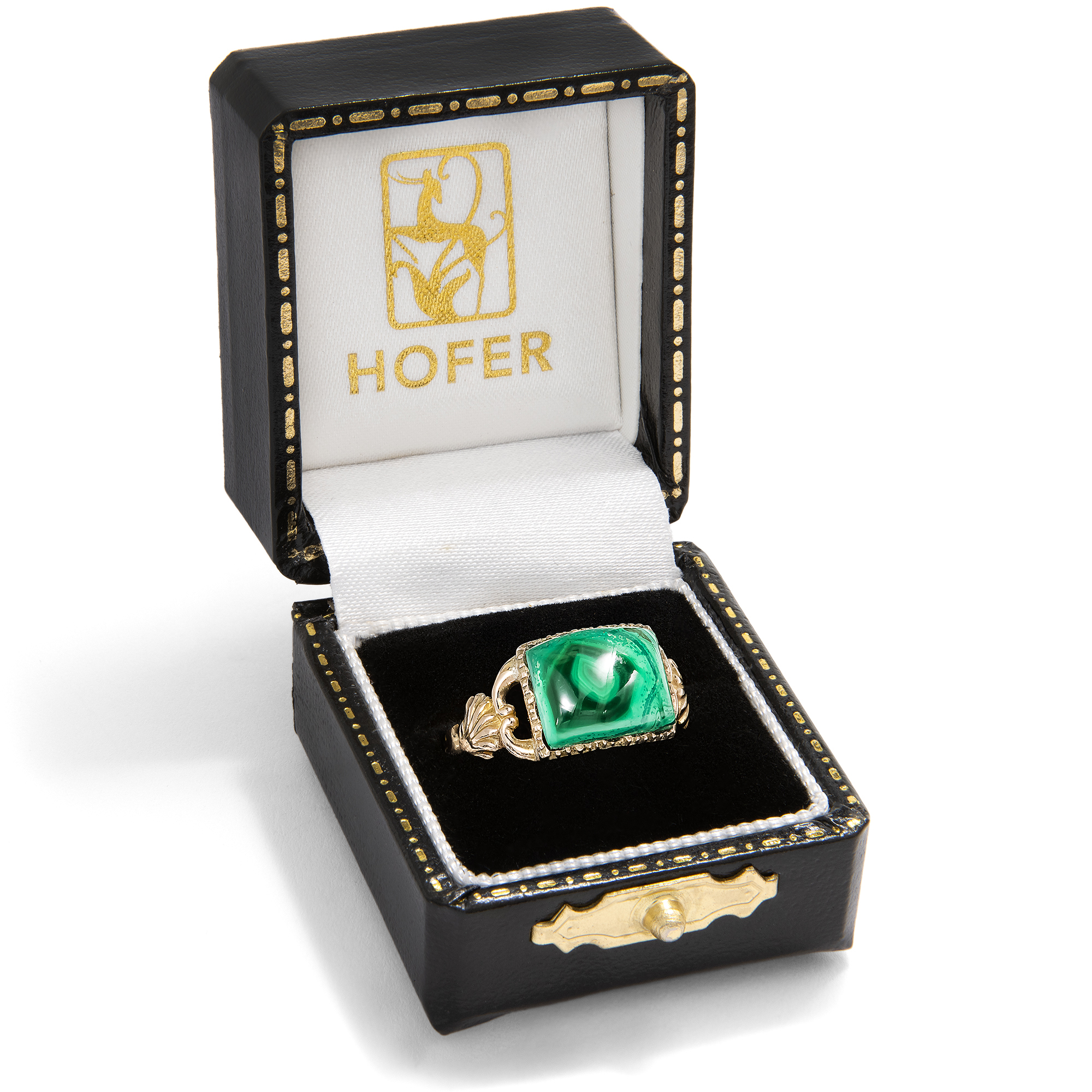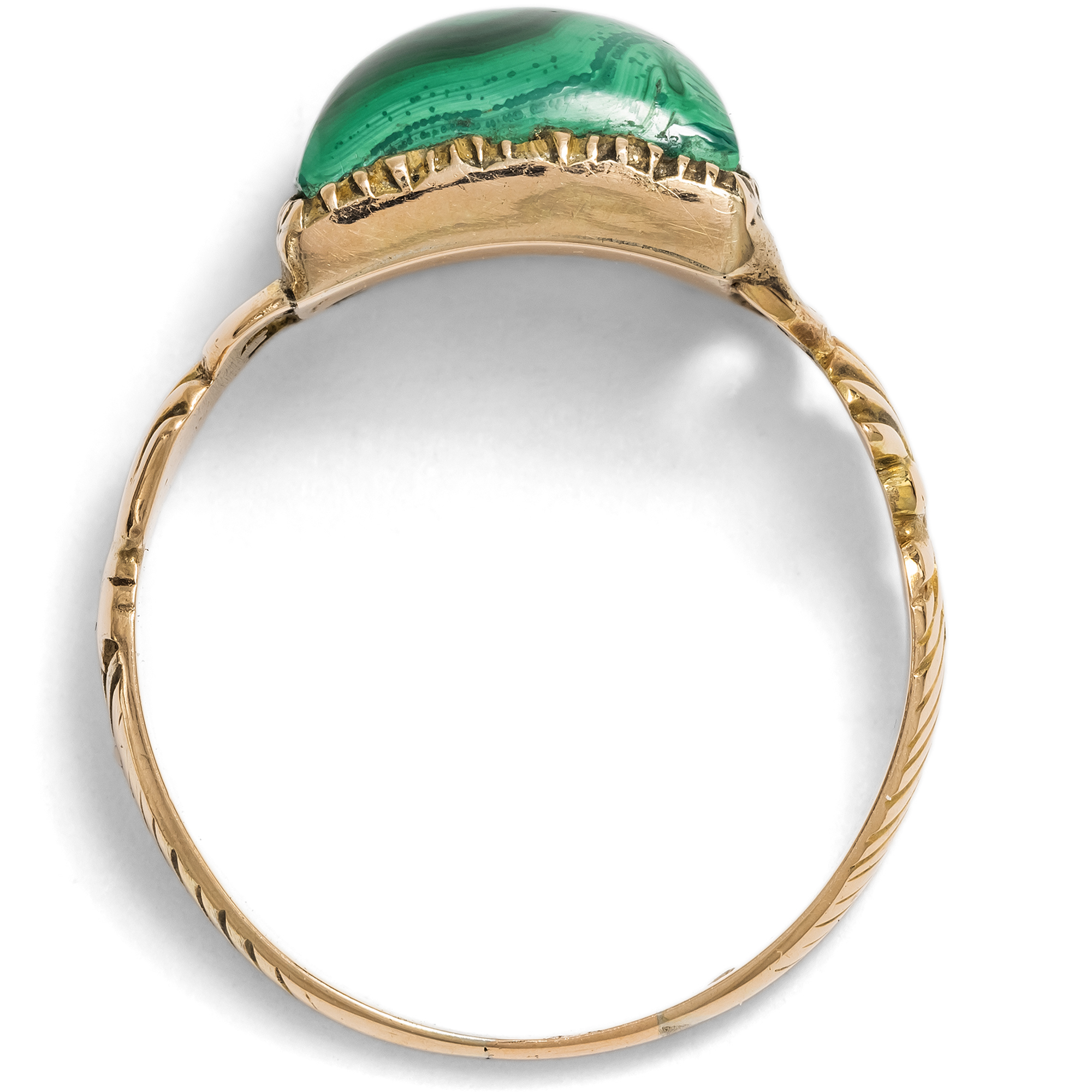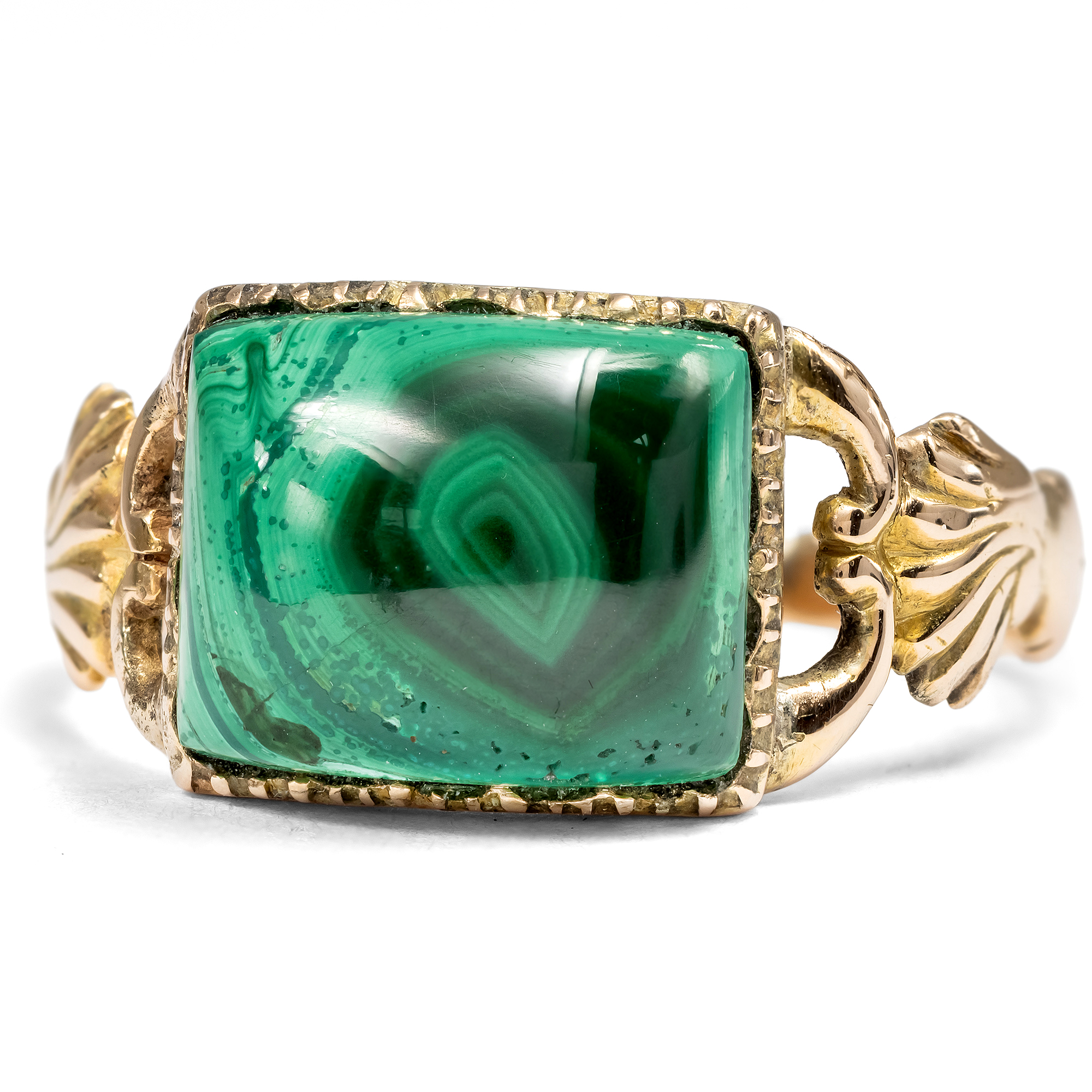 The name malachite is derived from the Greek word "malache" for mallow, as its color is reminiscent of the lush green of mallow leaves. It has fascinated people in all cultures since ancient times: the Greeks and Romans, the Egyptians, the Maya and the ancient Chinese. The Egyptians used malachite to make coveted amulets and scarabs, and in ground form it was used as a precious eye shadow and as a pigment in painting. According to tradition, it was also known as the "midwife's stone", as it was said to have the power to ease labor pains. In this delicate gold ring from around 1850, we encounter malachite in the form of a gently curved cabochon set in a rectangular box frame. Its natural veining with lighter and darker sections gives it a lively depth that captivates the eye time and time again. The ring band is artistically designed: Shell ornaments on the shoulders and small C-sweeps in the second rococo style adorn it with playful elegance. In this way, the mysterious stone is combined with the fine goldsmithing of its time. We found this unusual piece of jewellery from the late Biedermeier period in Vienna.