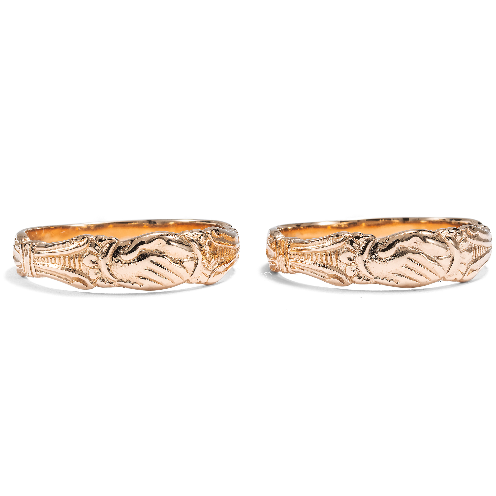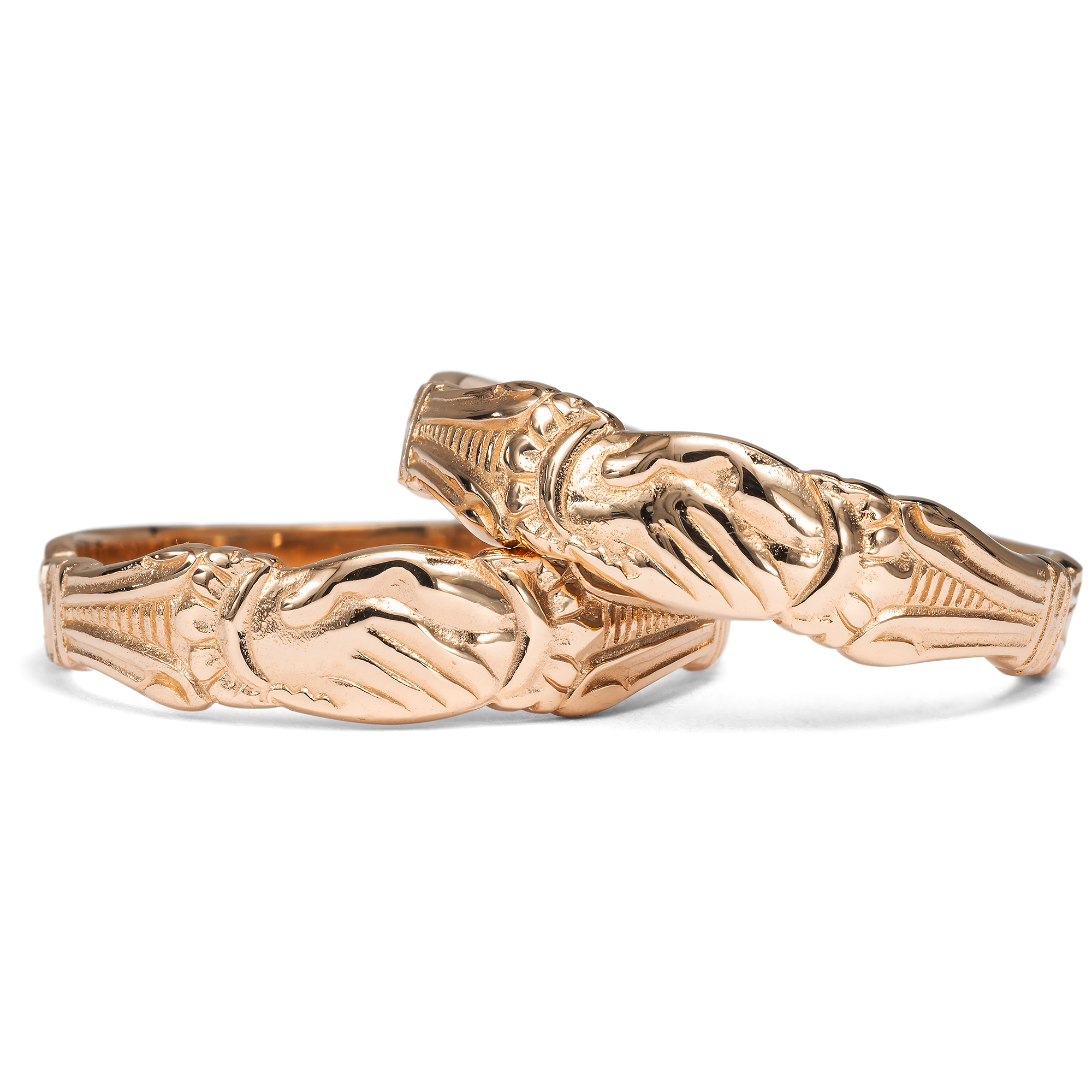 In earlier times, jewellery always had a meaning and conveyed a message. Even in ancient times, rings with two right hands lying inside each other were symbols of love and friendship. They are still known today in the goldsmith's art under the term "fede" rings, from the Italian "mani in fede" (roughly: "hands in faith"). These rings were gifts between lovers and were intended to express their togetherness. This motif was revived in the Renaissance. Some early examples have been preserved in the museums of decorative arts; the Victoria & Albert Museum in London, for example, has a small selection that you should definitely take a look at. A beautiful example is the ring with the inventory number M204-1975 from the 15th century. In our search for beautiful inspiration for our goldsmiths, we liked the idea of rings with two hands, not least because they are so catchy and expressive. So our goldsmith, inspired by historical feather rings, designed and produced a ring that we offer in yellow gold, rose gold and platinum. Here is a pair of rings in high-carat rose gold. You can find all other variants under this link.